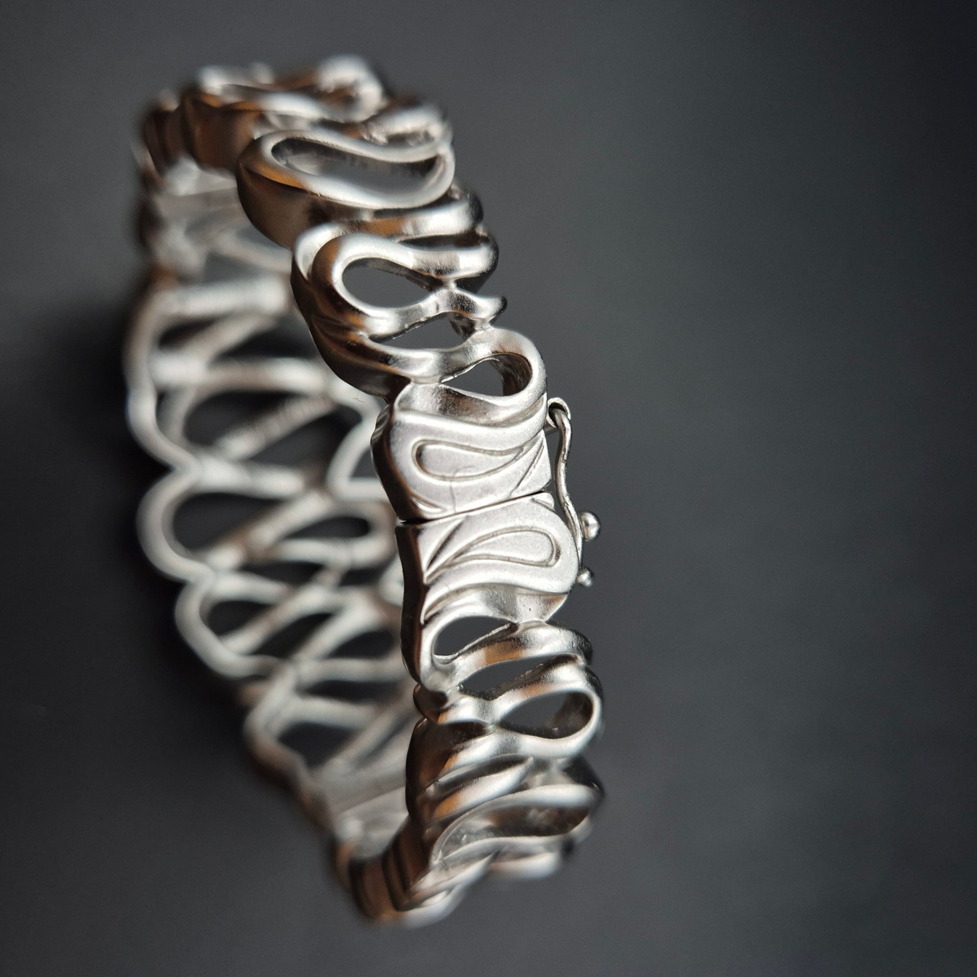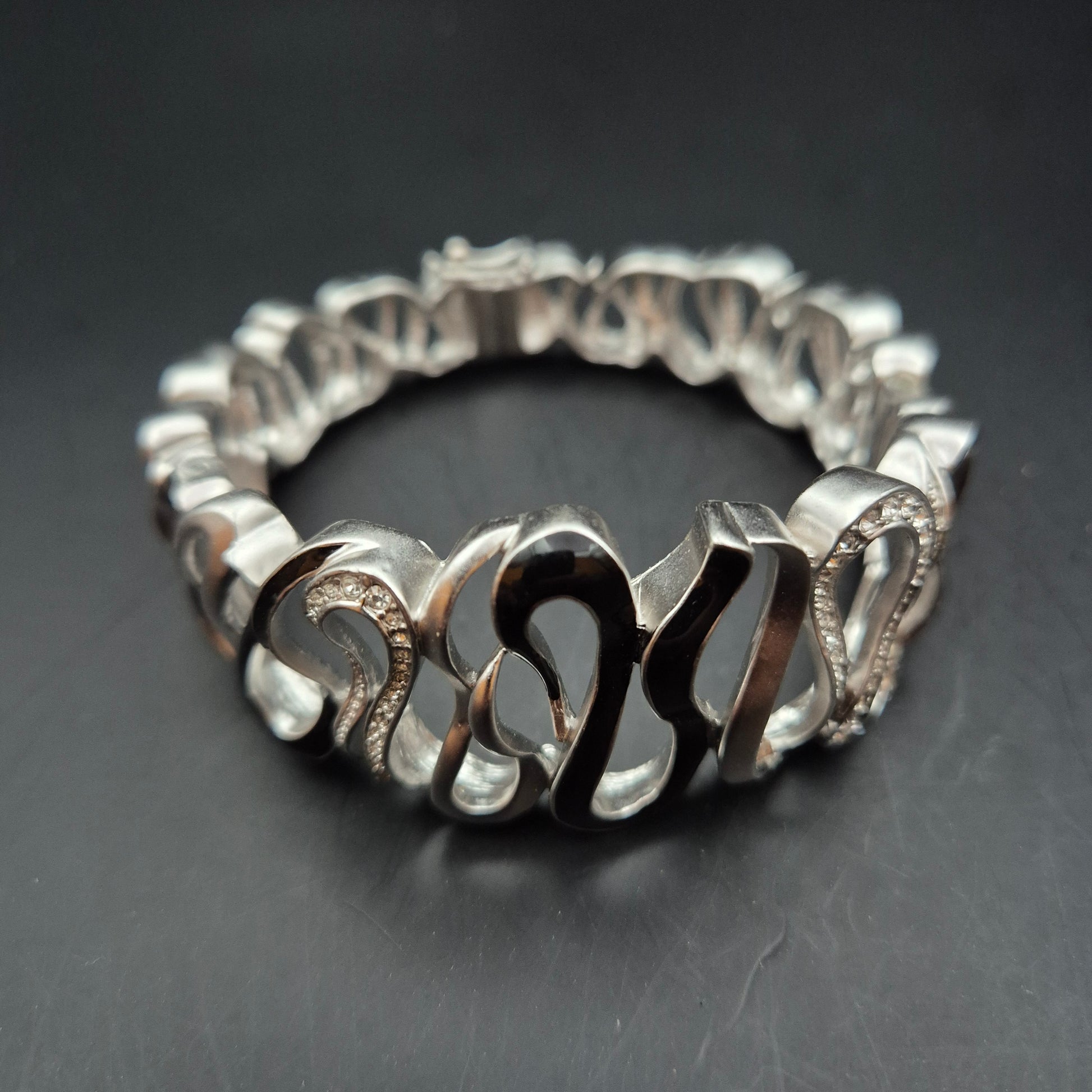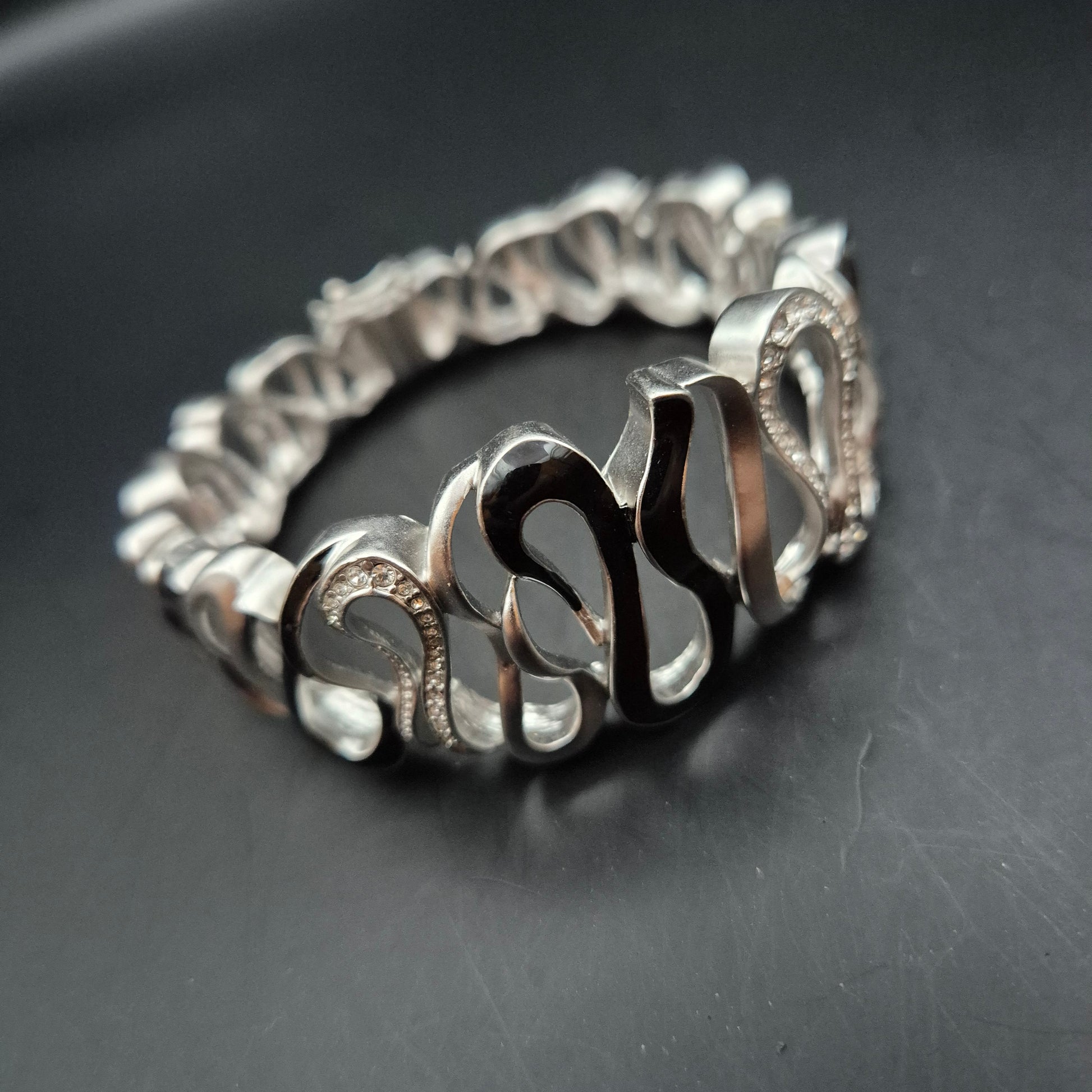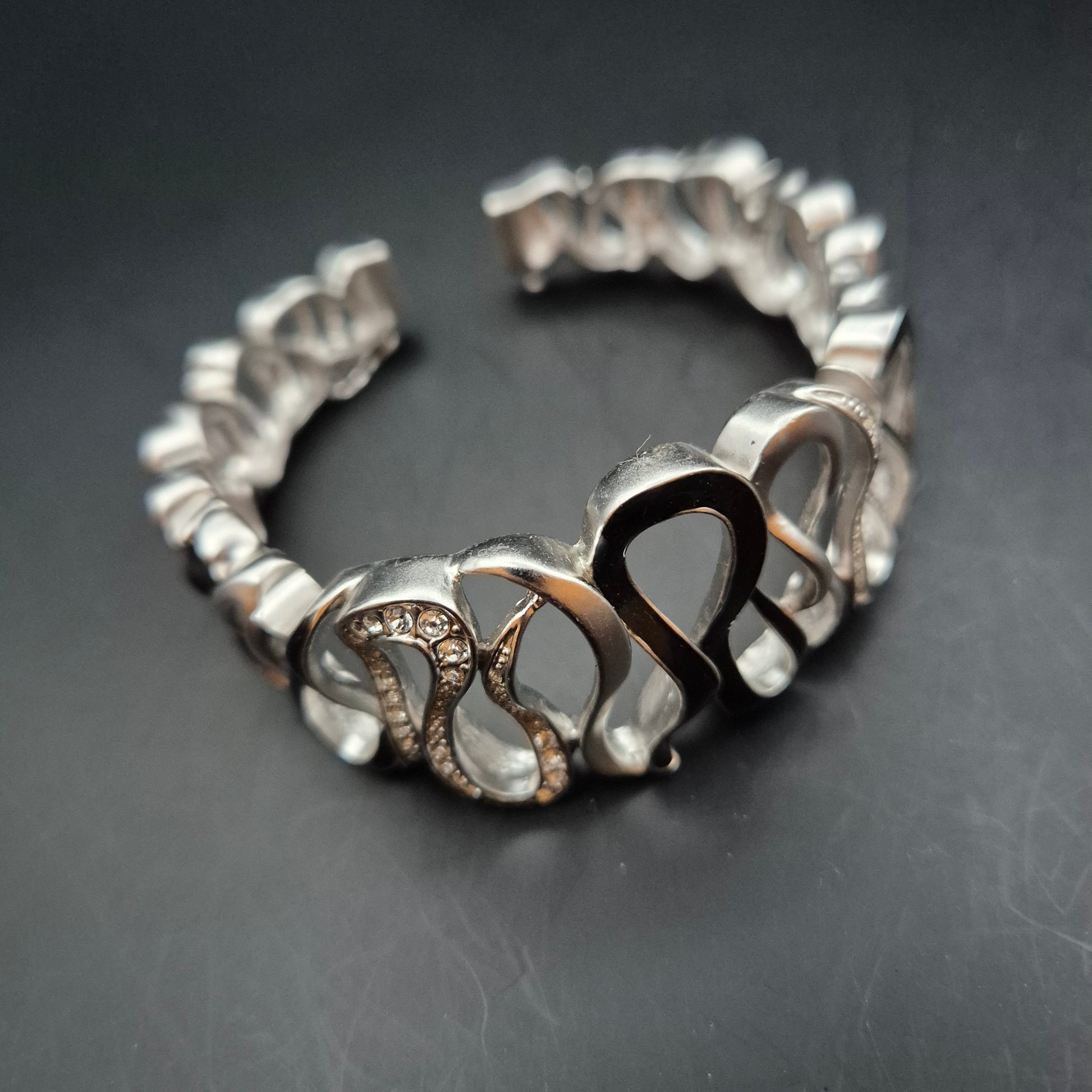 Dieses elegante Damenarmband besticht durch sein kunstvolles Wellen-Design und die stilvolle Kombination aus poliertem Metall und funkelnden Strass-Details. Das Armband wirkt modern und edel zugleich und ist ein echter Blickfang zu festlichen Anlässen oder im Alltag.