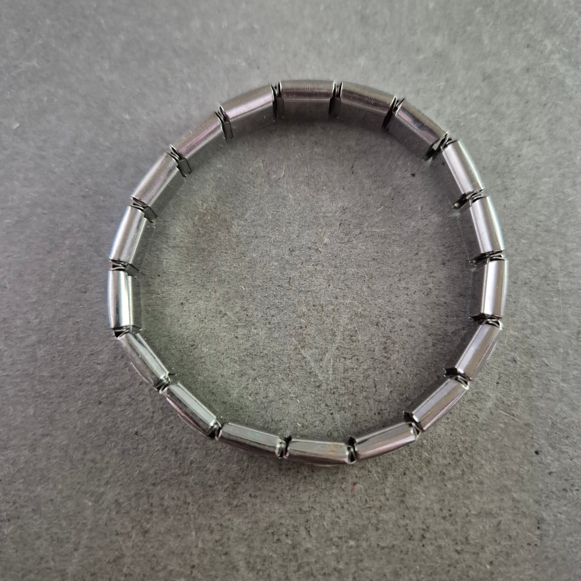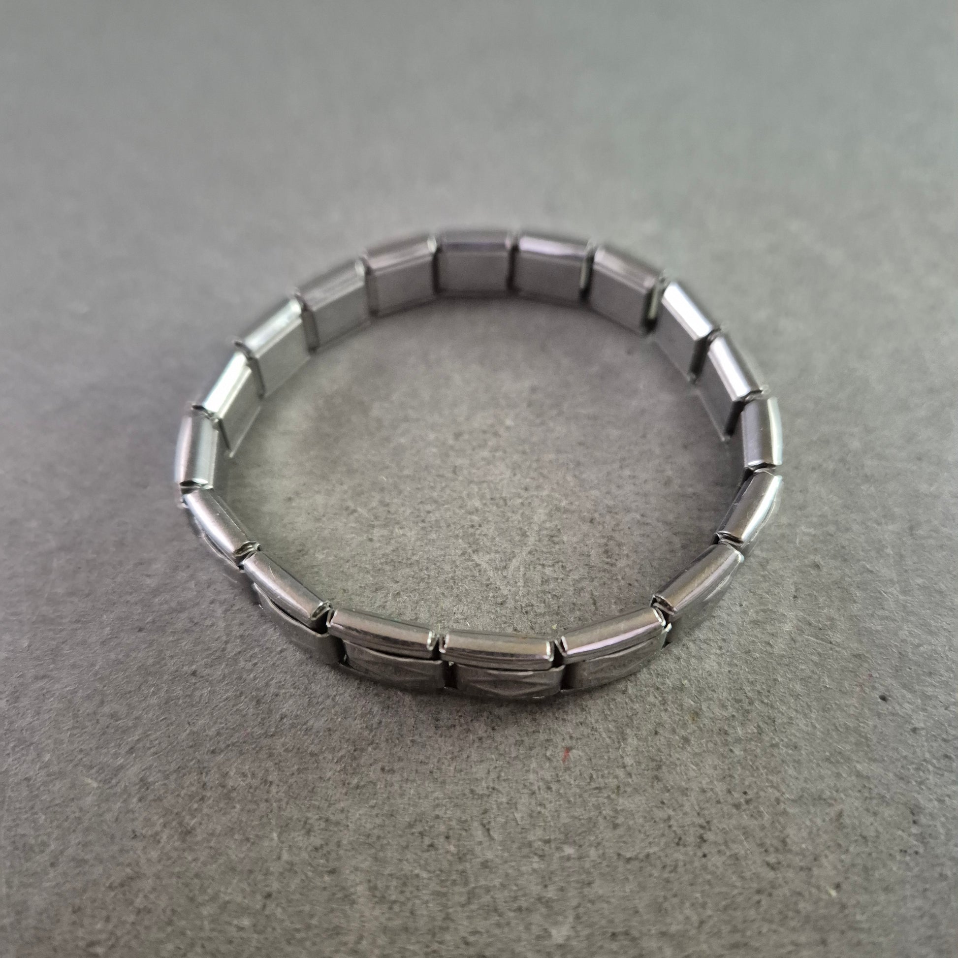 Dieses elegante O-Ring Armband besticht durch sein zeitloses Design aus glänzenden, silberfarbenen Metallelementen. Die einzelnen Glieder sind kunstvoll mit einem rautenförmigen Relief verziert, das dem Armband eine subtile Textur und einen raffinierten Glanz verleiht. Als flexibles Stretch-Armband passt es sich bequem jedem Handgelenk an und ist ein stilvolles Accessoire, das sowohl einzeln als auch in Kombination mit anderen Schmuckstücken getragen werden kann.