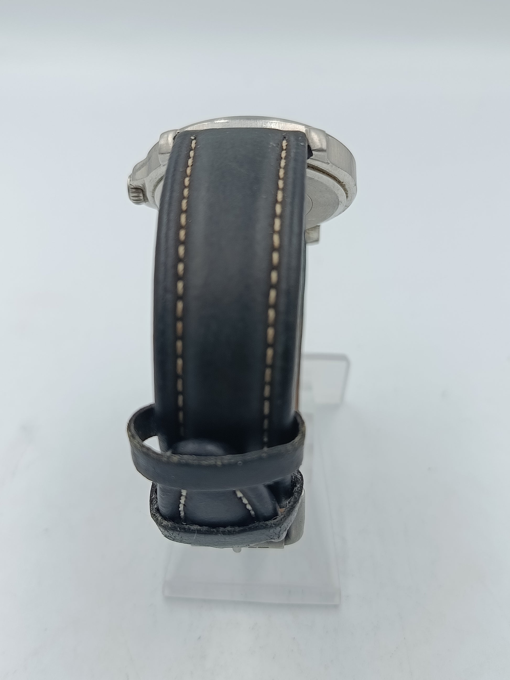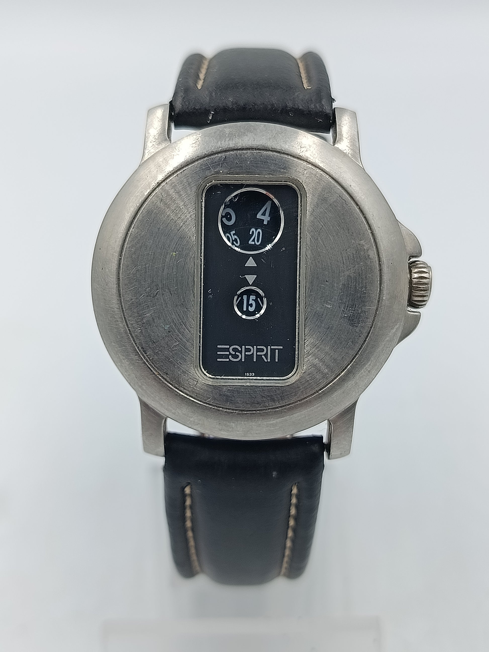 Stylische Esprit Herrenuhr mit seltenem Jump-Hour / Scheibenuhren-Design. Das rechteckige Sichtfenster zeigt Stunde und Minute über rotierende Scheiben – ein echter Blickfang für Sammler und Liebhaber außergewöhnlicher Uhren. Massives Edelstahlgehäuse mit charaktervoller Patina und schwarzem Lederarmband.