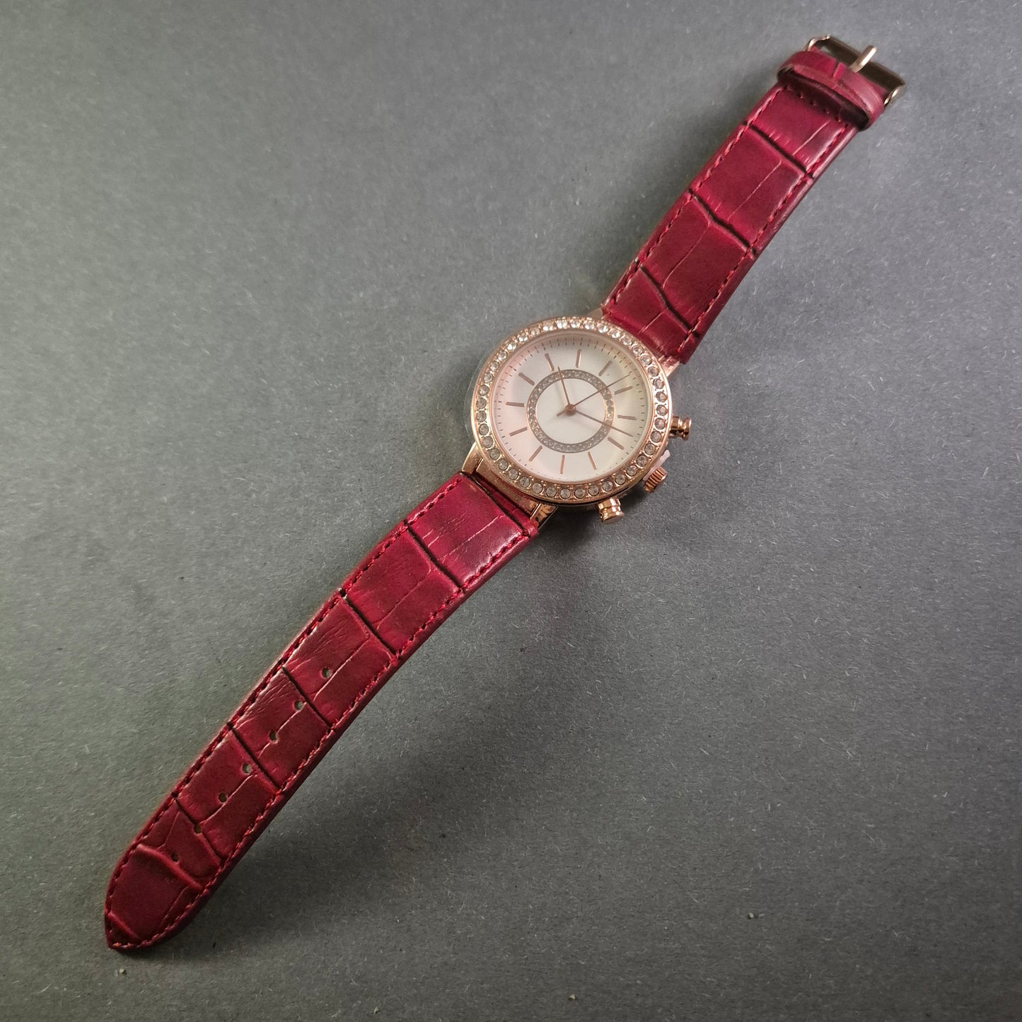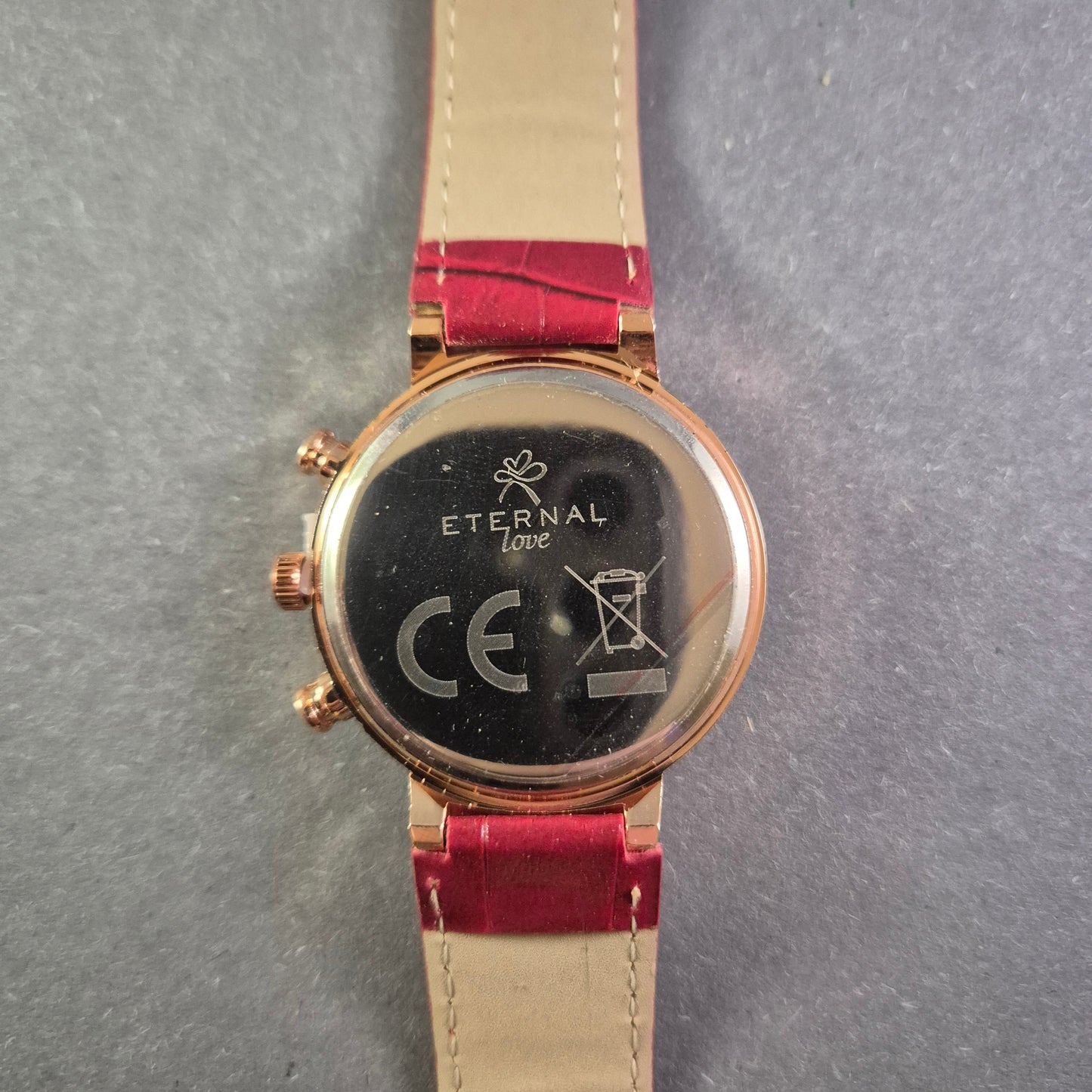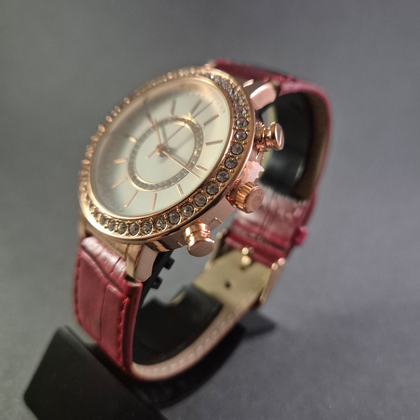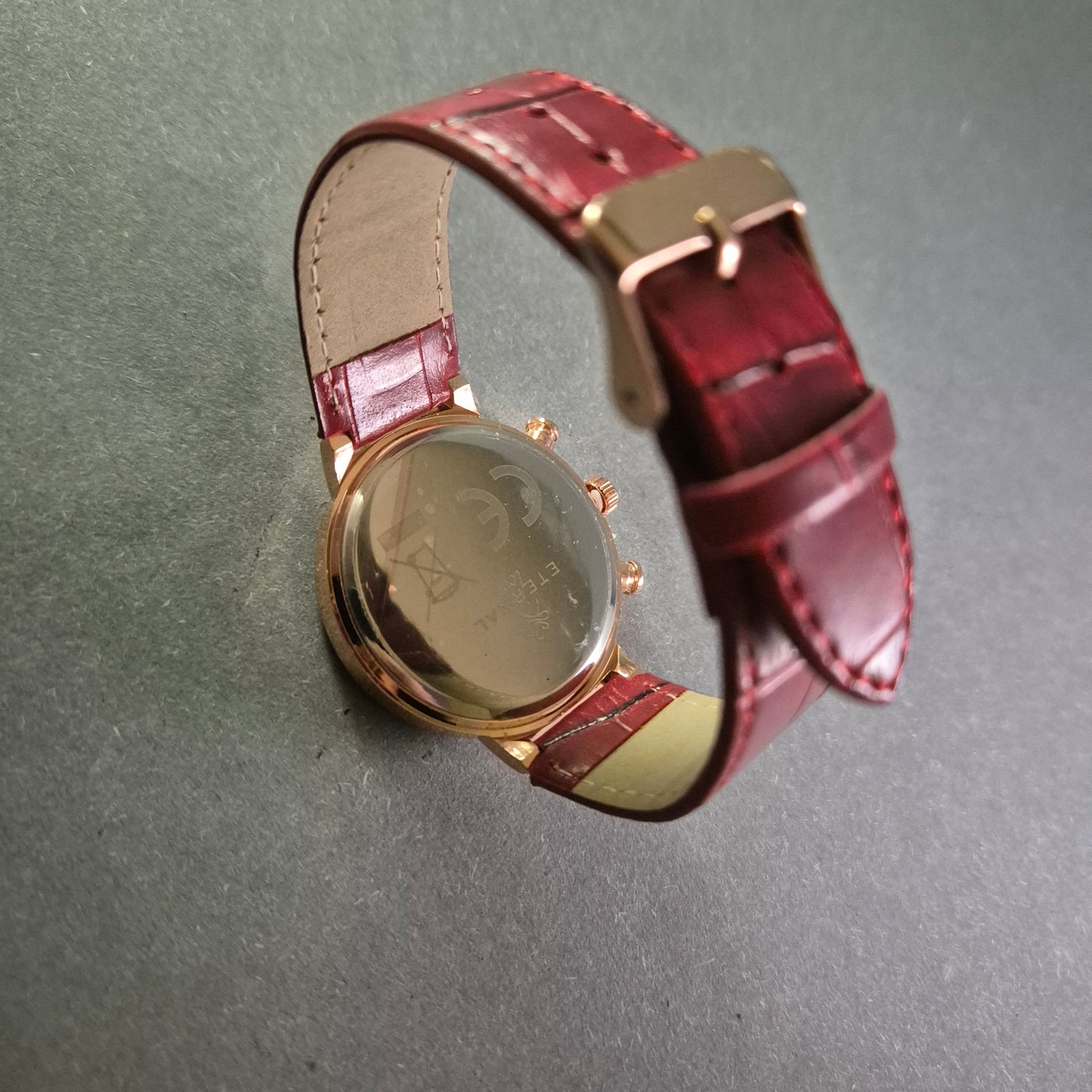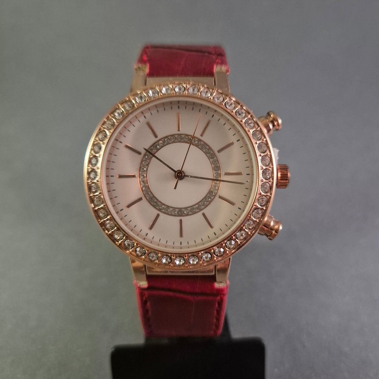 Die Eternal Love Damenarmbanduhr besticht durch ihr glamouröses Design und funkelnde Details. Das goldfarbene Gehäuse mit einer Strassstein-Lünette und das weiße Zifferblatt mit eleganten Akzenten machen diese Uhr zu einem echten Hingucker. Das rote Kunstlederarmband mit Krokodilprägung rundet den luxuriösen Look ab. Perfekt für besondere Anlässe oder um Ihrem Alltagsoutfit Glanz zu verleihen.