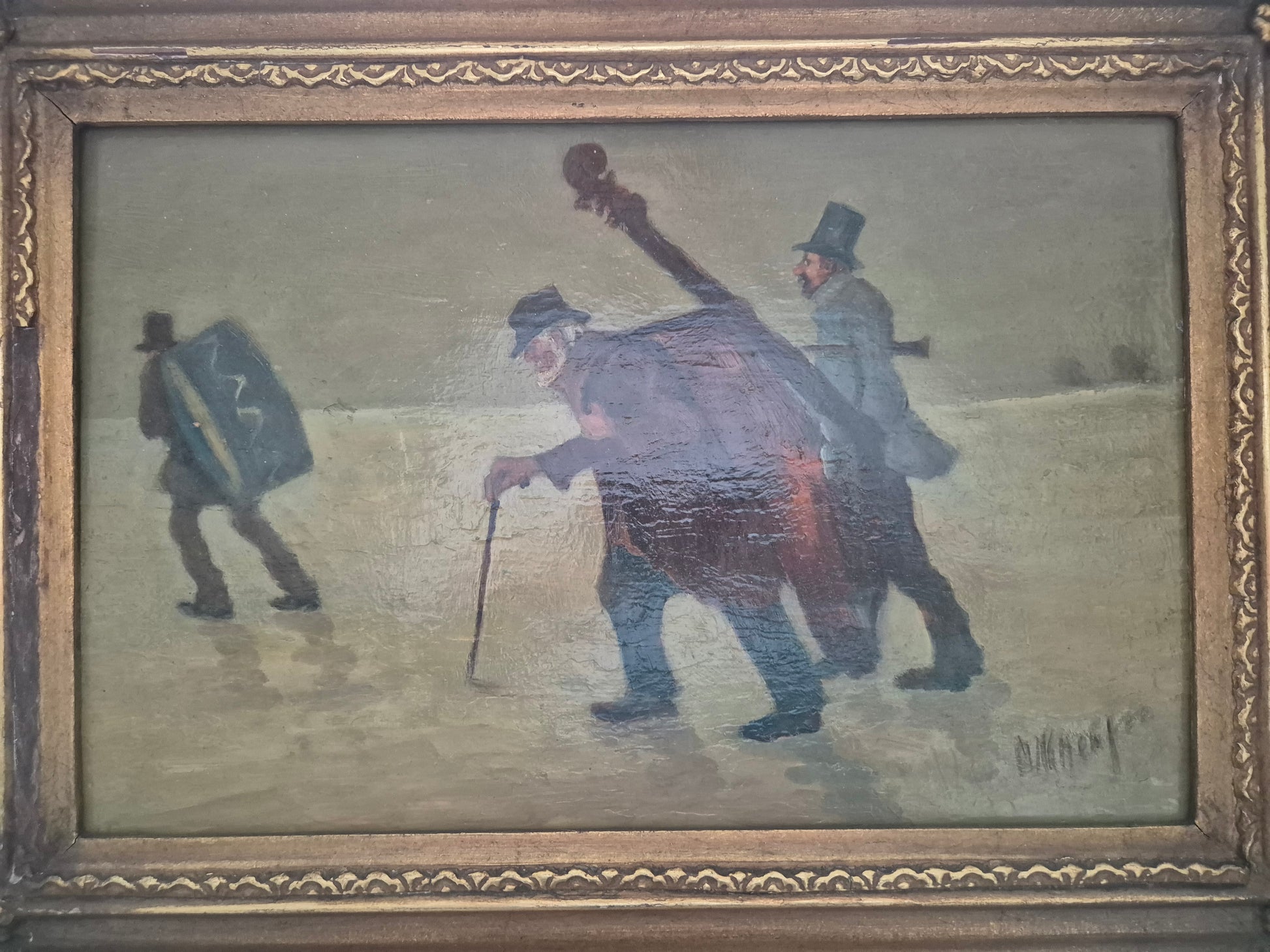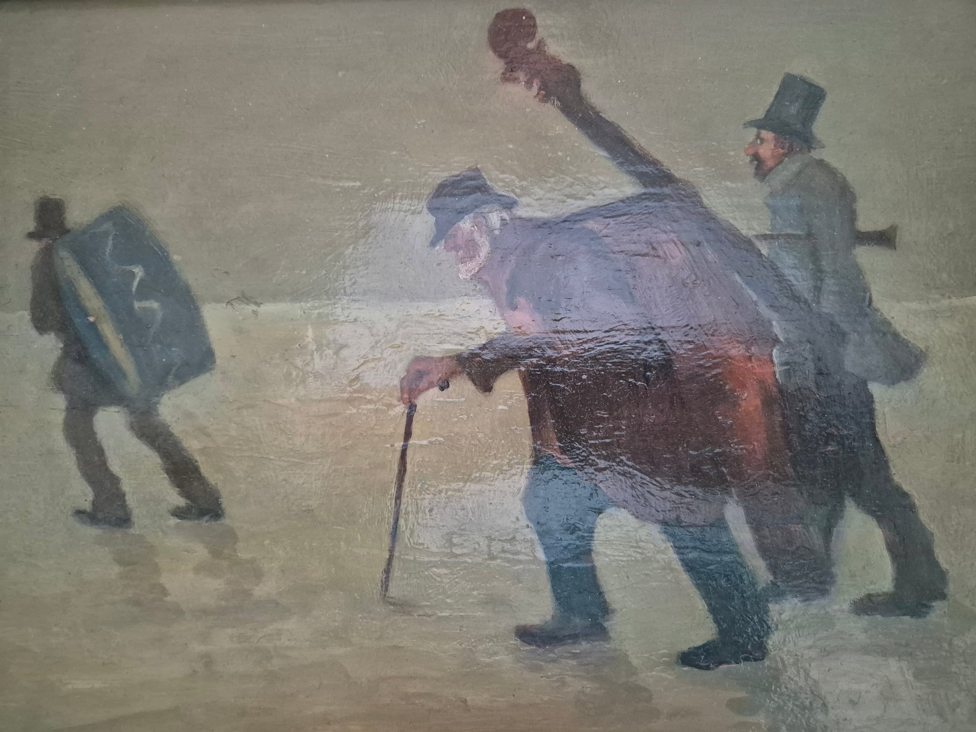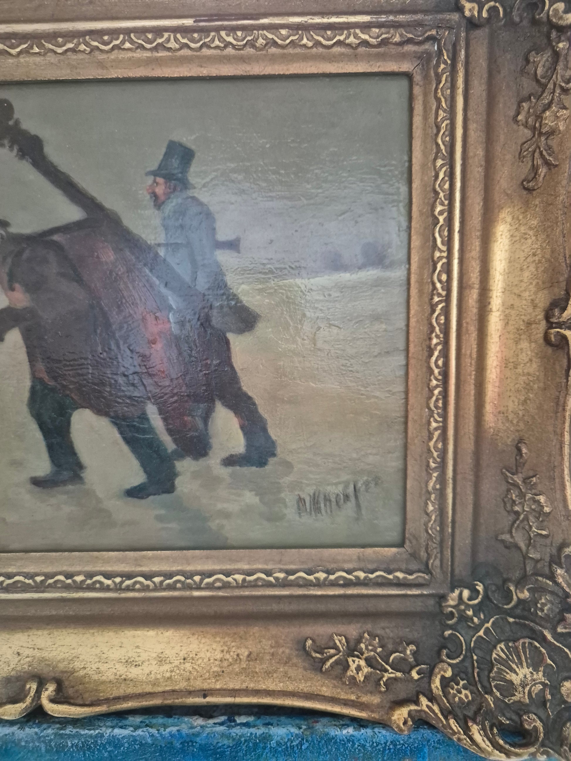 Herzlich willkommen, angeboten wird ein stimmungsvolles Ölgemälde aus der europäischen Schule des 19. bis 20. Jahrhunderts. Die Szene zeigt eine idyllische Winterlandschaft, in der drei Musiker wandernd eine scheinbar gefrorene Fläche überqueren. Die detailreiche Malweise und die subtilen Lichtreflexe auf dem Schnee verleihen dem Werk eine besondere Tiefe und Atmosphäre.