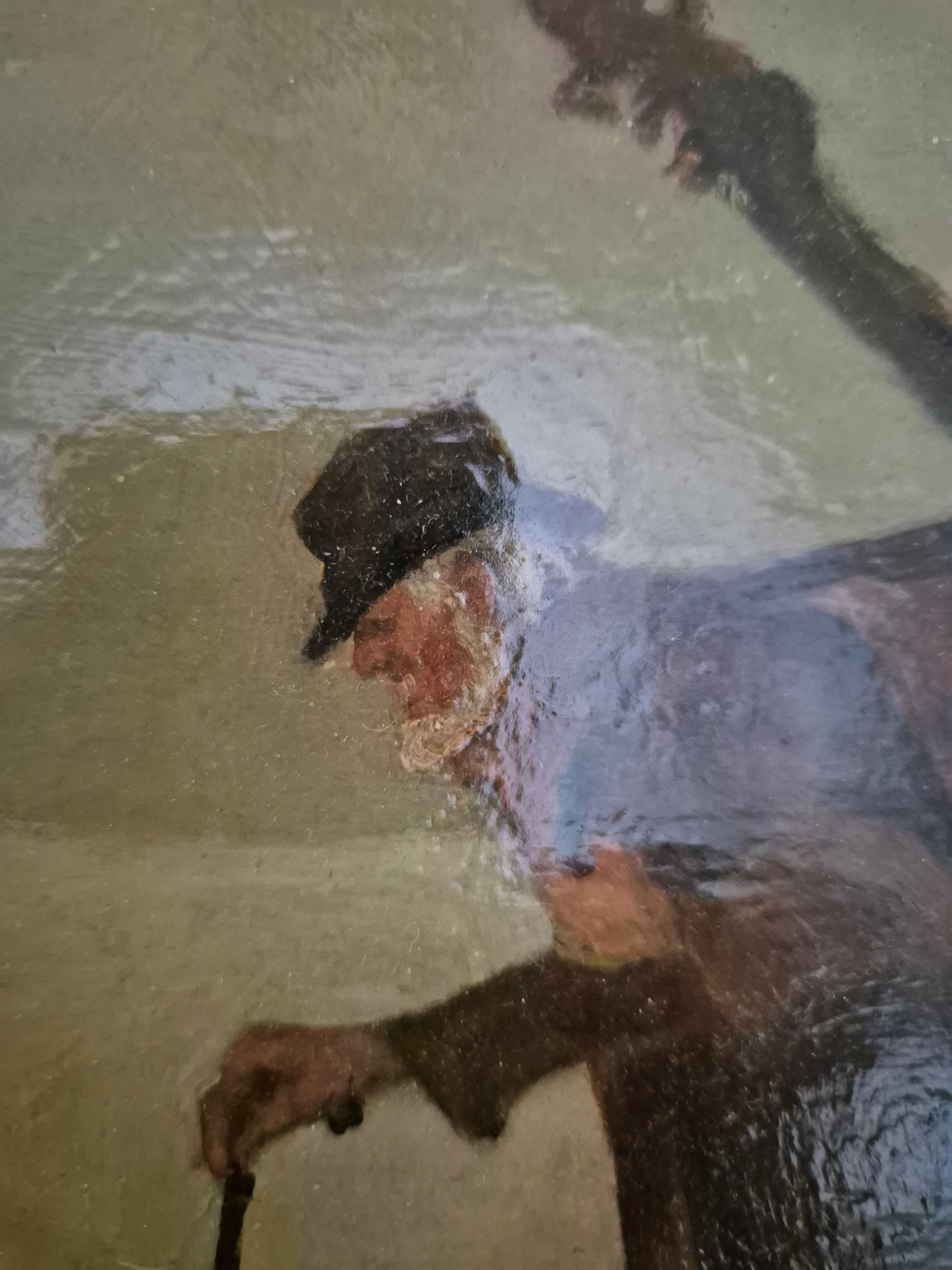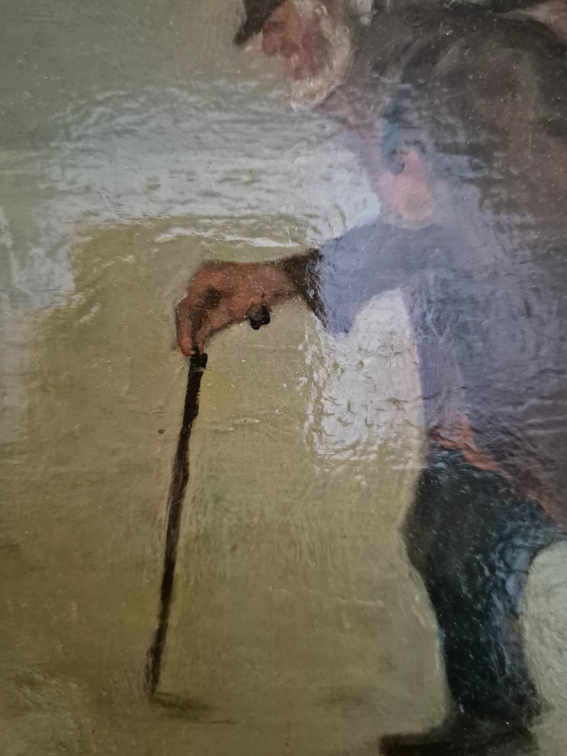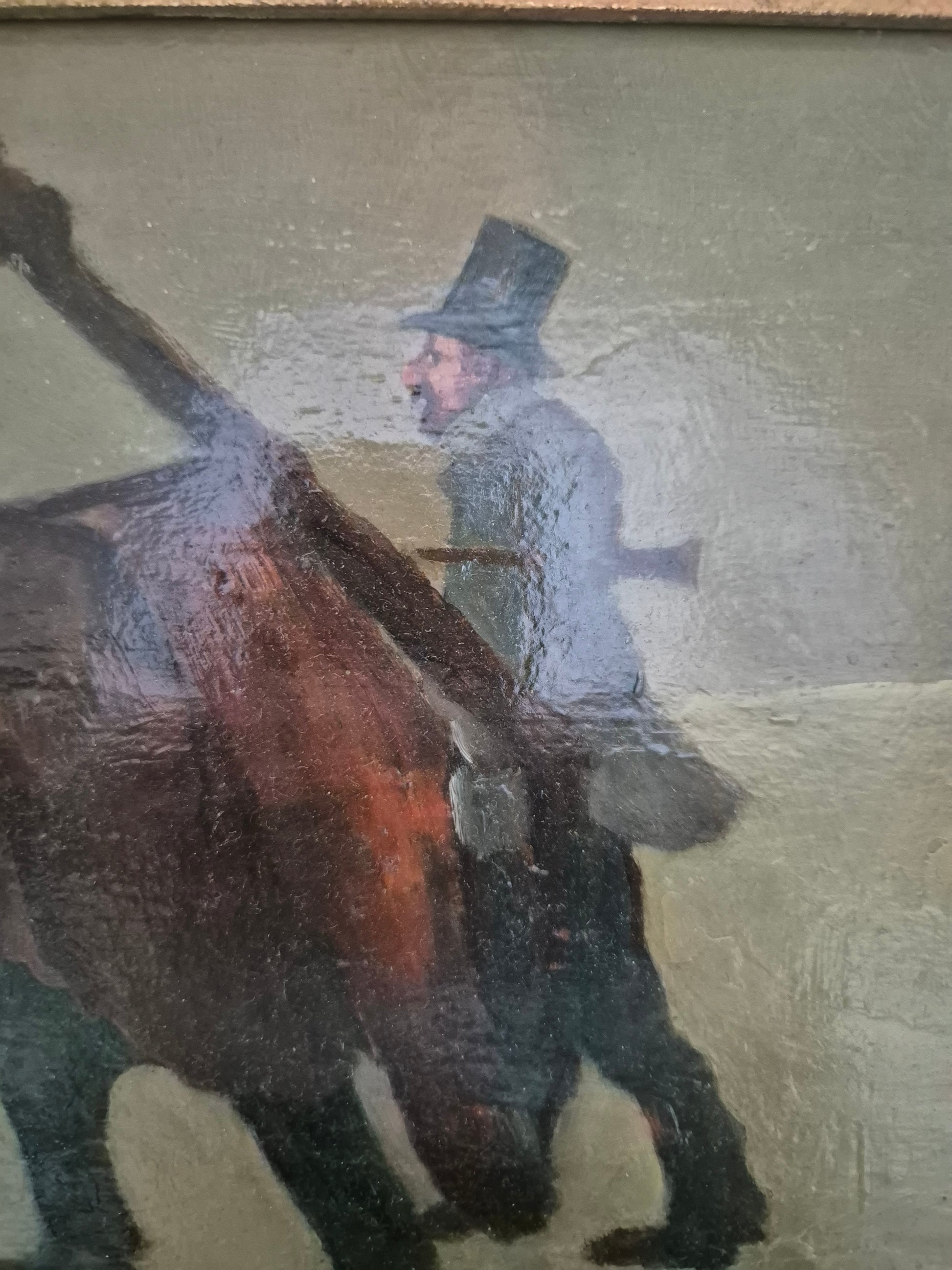 Herzlich willkommen, angeboten wird ein stimmungsvolles Ölgemälde aus der europäischen Schule des 19. bis 20. Jahrhunderts. Die Szene zeigt eine idyllische Winterlandschaft, in der drei Musiker wandernd eine scheinbar gefrorene Fläche überqueren. Die detailreiche Malweise und die subtilen Lichtreflexe auf dem Schnee verleihen dem Werk eine besondere Tiefe und Atmosphäre.