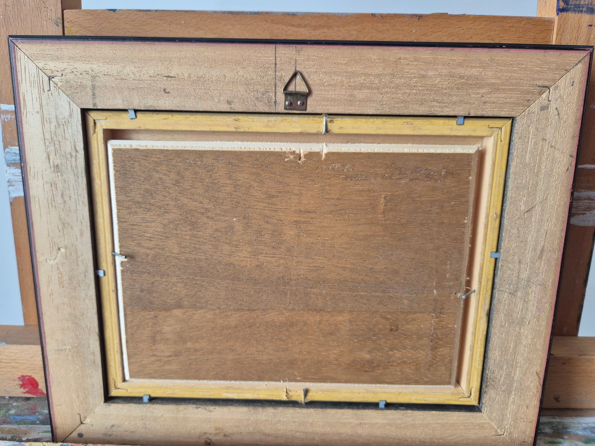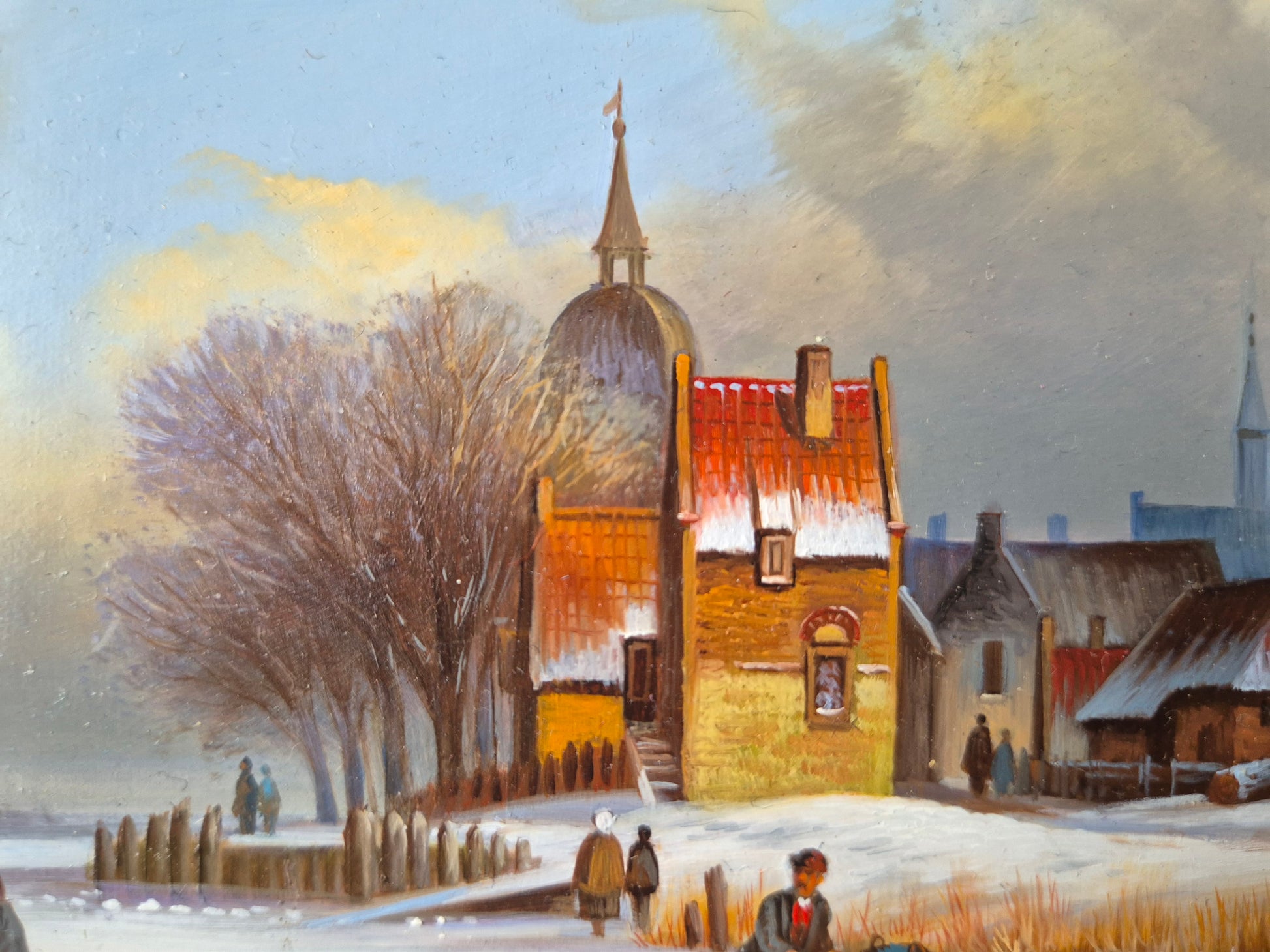 Dieses stimmungsvolle Ölgemälde von J.v. Heyden (XX) Handsigniert zeigt eine verschneite Dorfszene an einem klaren Wintertag. Die Komposition umfasst traditionelle Häuser mit schneebedeckten Dächern, kahle Bäume und Figuren, die sich durch die winterliche Landschaft bewegen. Die feine Pinselführung und die harmonische Farbgebung verleihen dem Werk eine ruhige und nostalgische Atmosphäre. Das Gemälde ist handsigniert, auf Holz gemalt und befindet sich in einem sehr guten Zustand. Der schlichte Rahmen ergänzt das Bild dezent und macht es zu einem charmanten Stück klassischer Winterlandschaftsmalerei.