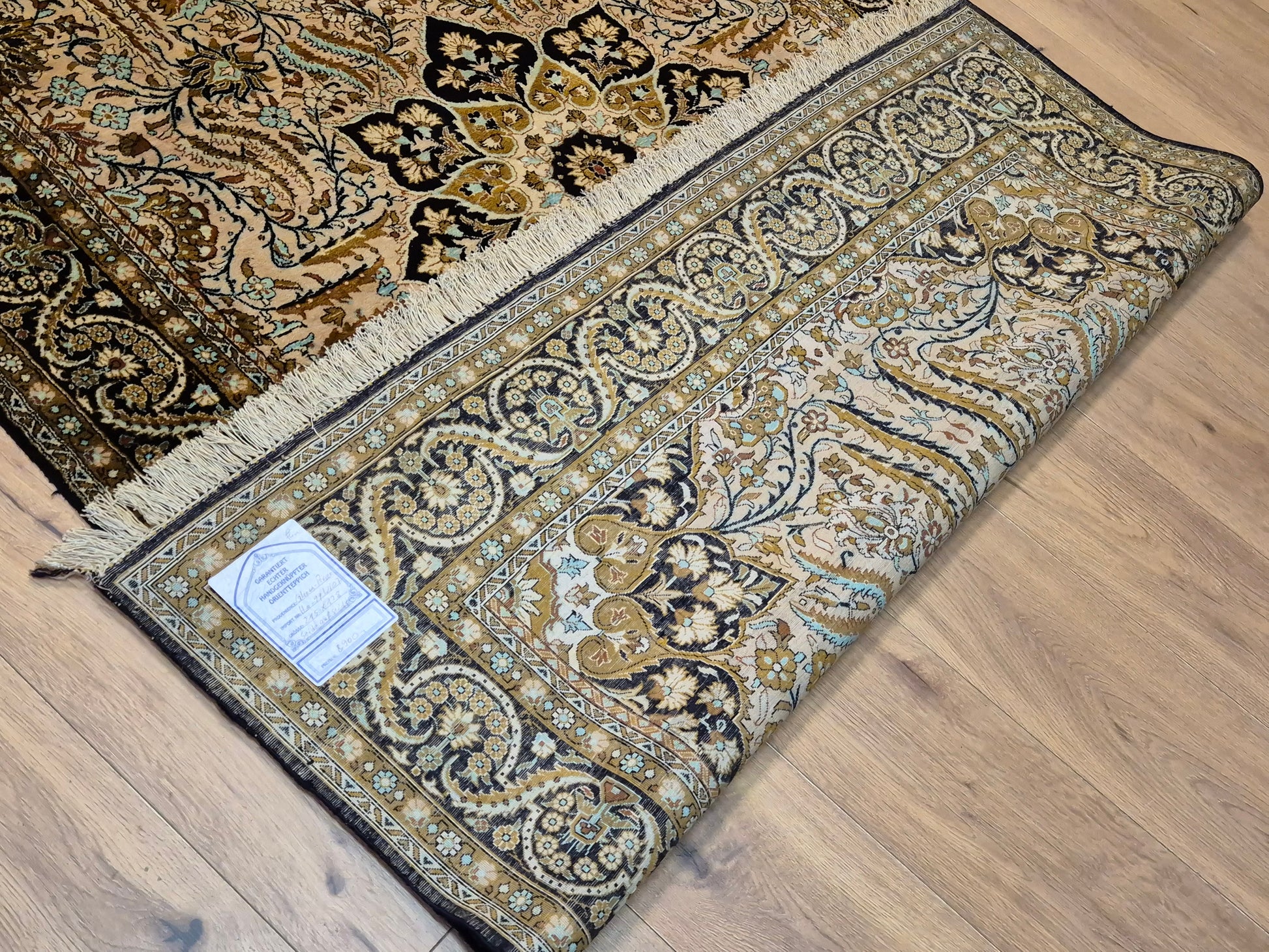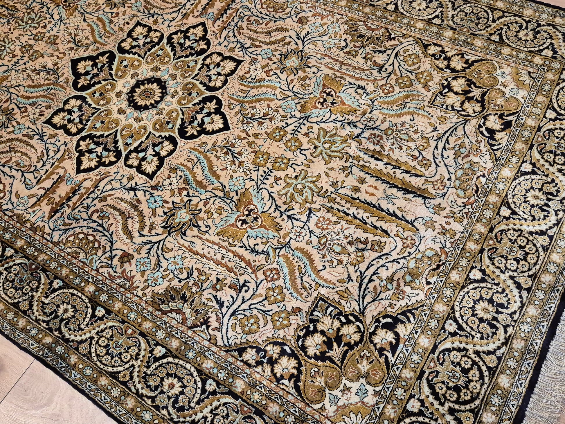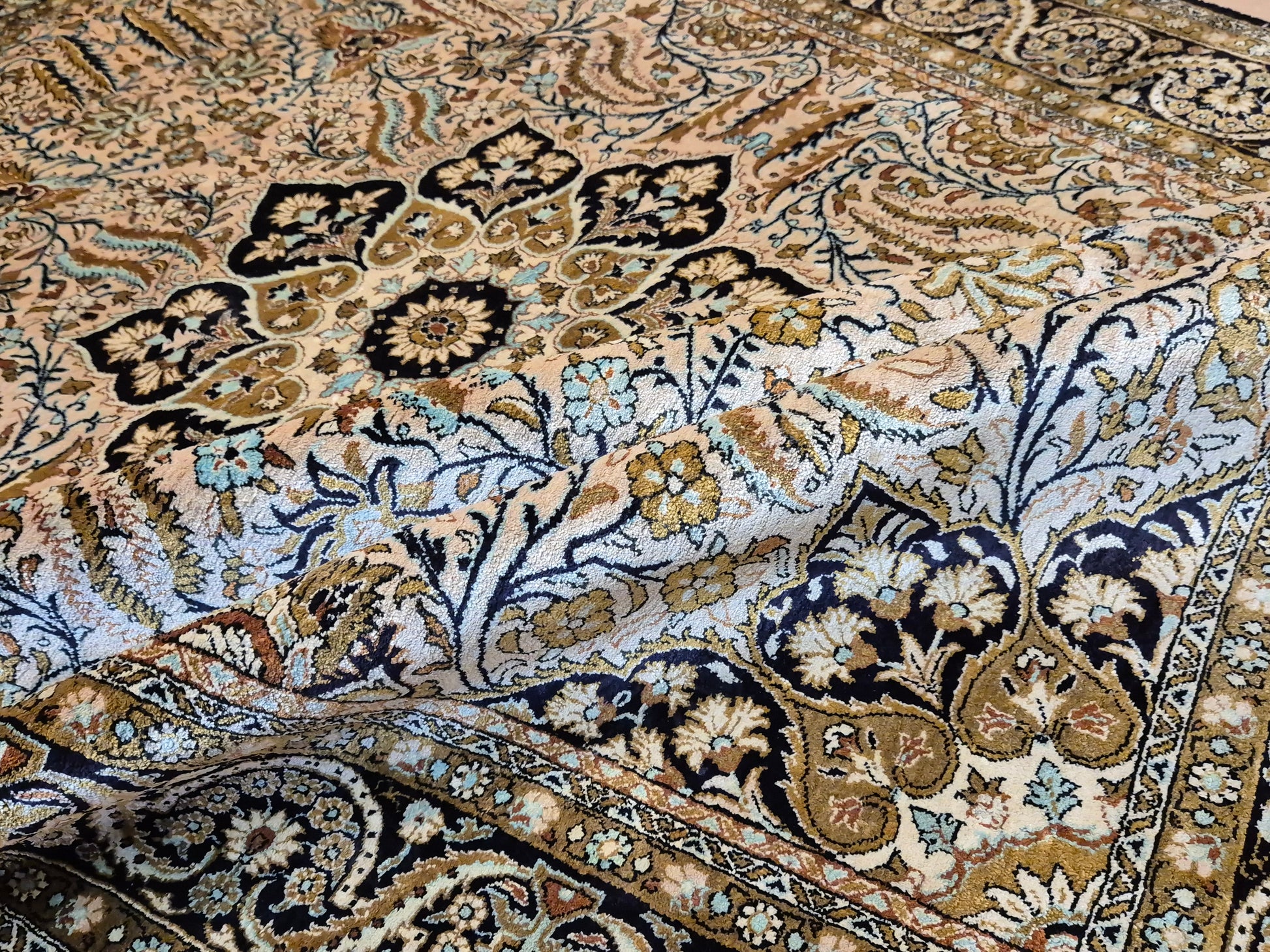 • Harmonische Balance zwischen dunklen Kontrasten (Schwarzgrund im Medaillon und in den Eckkartuschen) und hellen Seidenflächen, die dem Teppich Tiefe und Eleganz verleihen