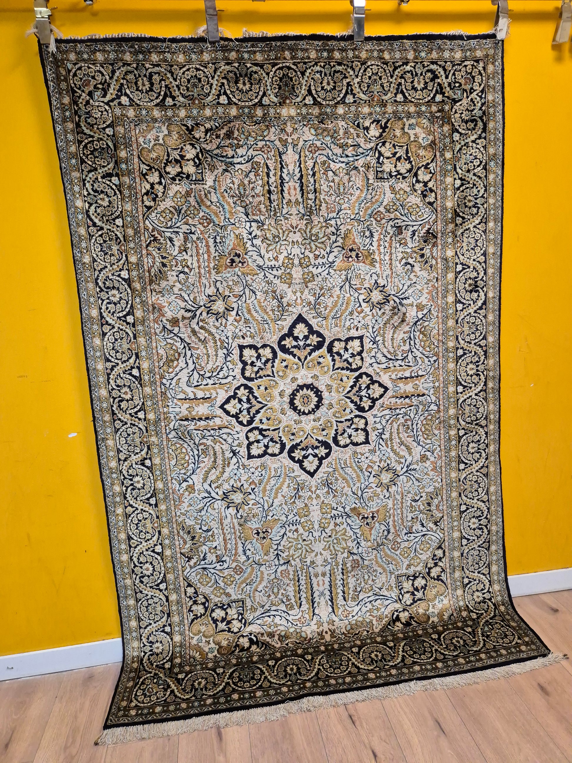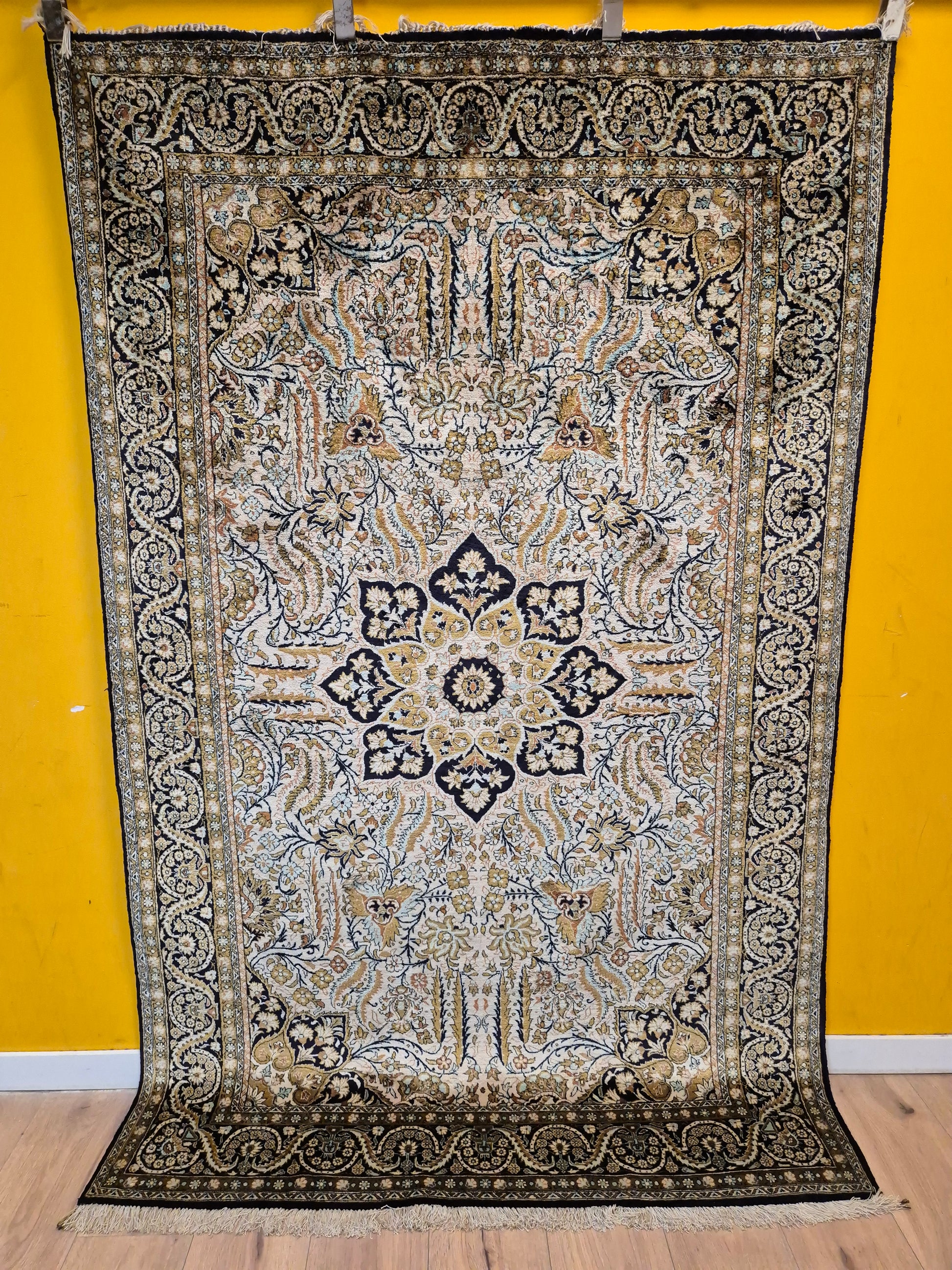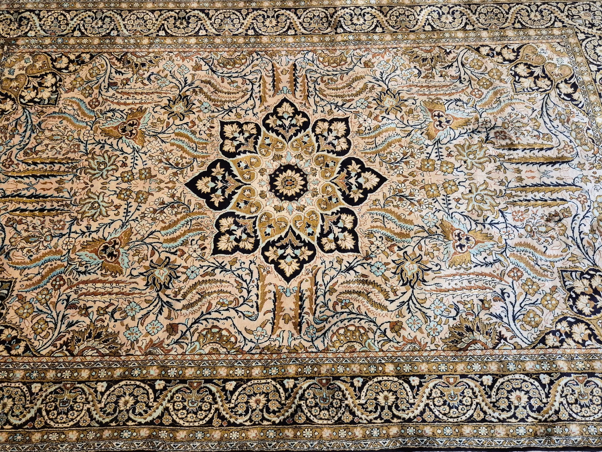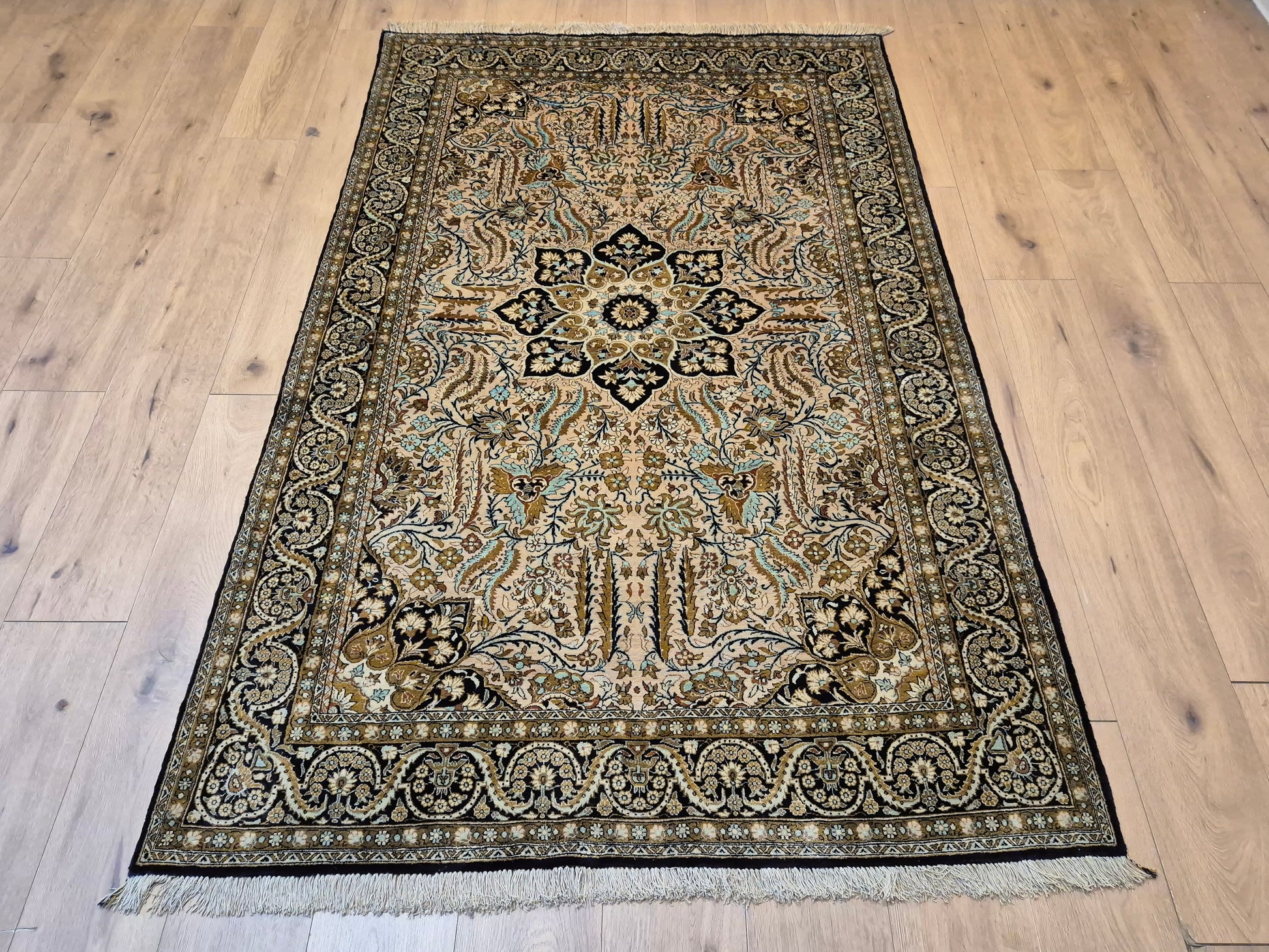 • Harmonische Balance zwischen dunklen Kontrasten (Schwarzgrund im Medaillon und in den Eckkartuschen) und hellen Seidenflächen, die dem Teppich Tiefe und Eleganz verleihen