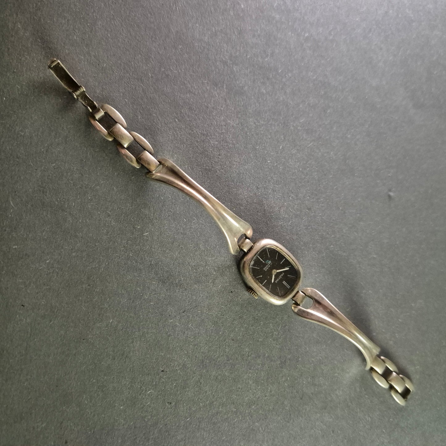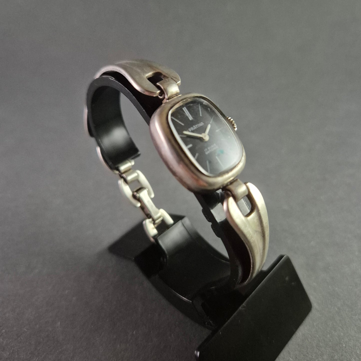 Diese Prätina Damenarmbanduhr zeichnet sich durch ihre klassische Schönheit und ihr minimalistisches Design aus. Das rechteckige Gehäuse und das tiefschwarze Zifferblatt verleihen ihr eine schlichte Eleganz. Gefertigt aus 835er Silber, kombiniert diese Uhr hochwertige Materialien mit einem präzisen 17-Jewel-Antichoc-Werk. Sie ist das perfekte Accessoire für stilbewusste Frauen, die Wert auf zeitlosen Stil legen.