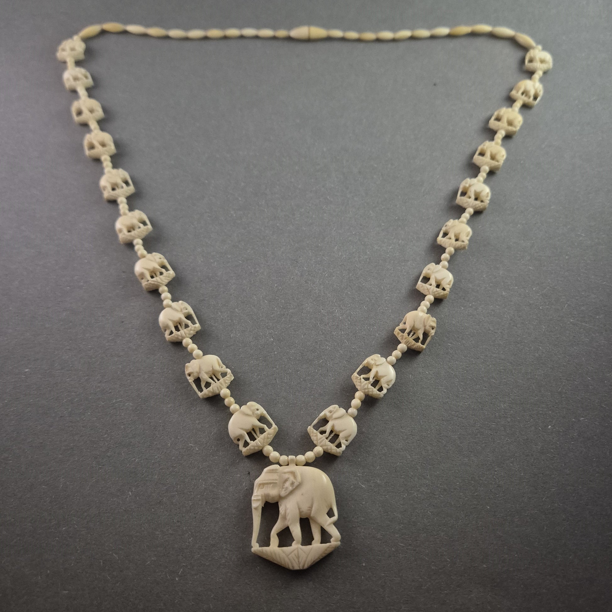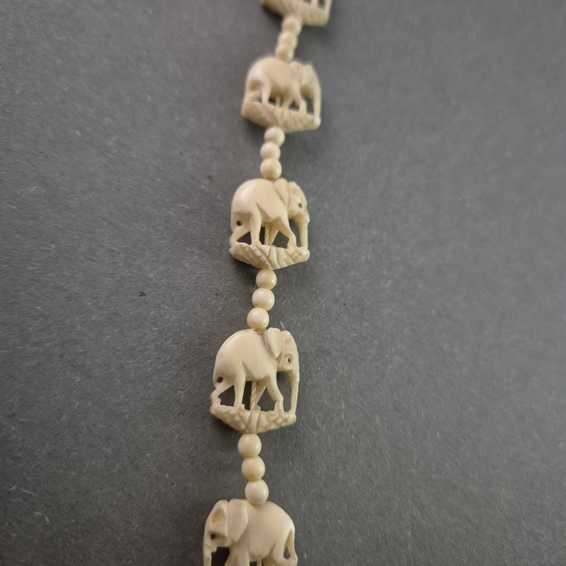 Diese außergewöhnliche Vintage-Kette besticht durch ihre kunstvollen Elefantenmotive, die harmonisch in das Design integriert sind. Die filigran gearbeiteten Elemente und der große Elefanten-Anhänger verleihen der Kette einen exotischen und stilvollen Charakter. Gefertigt aus hochwertigem Kunstmaterial in edler Elfenbeinoptik, bietet dieses Schmuckstück eine besondere Ästhetik und zeitlose Eleganz.