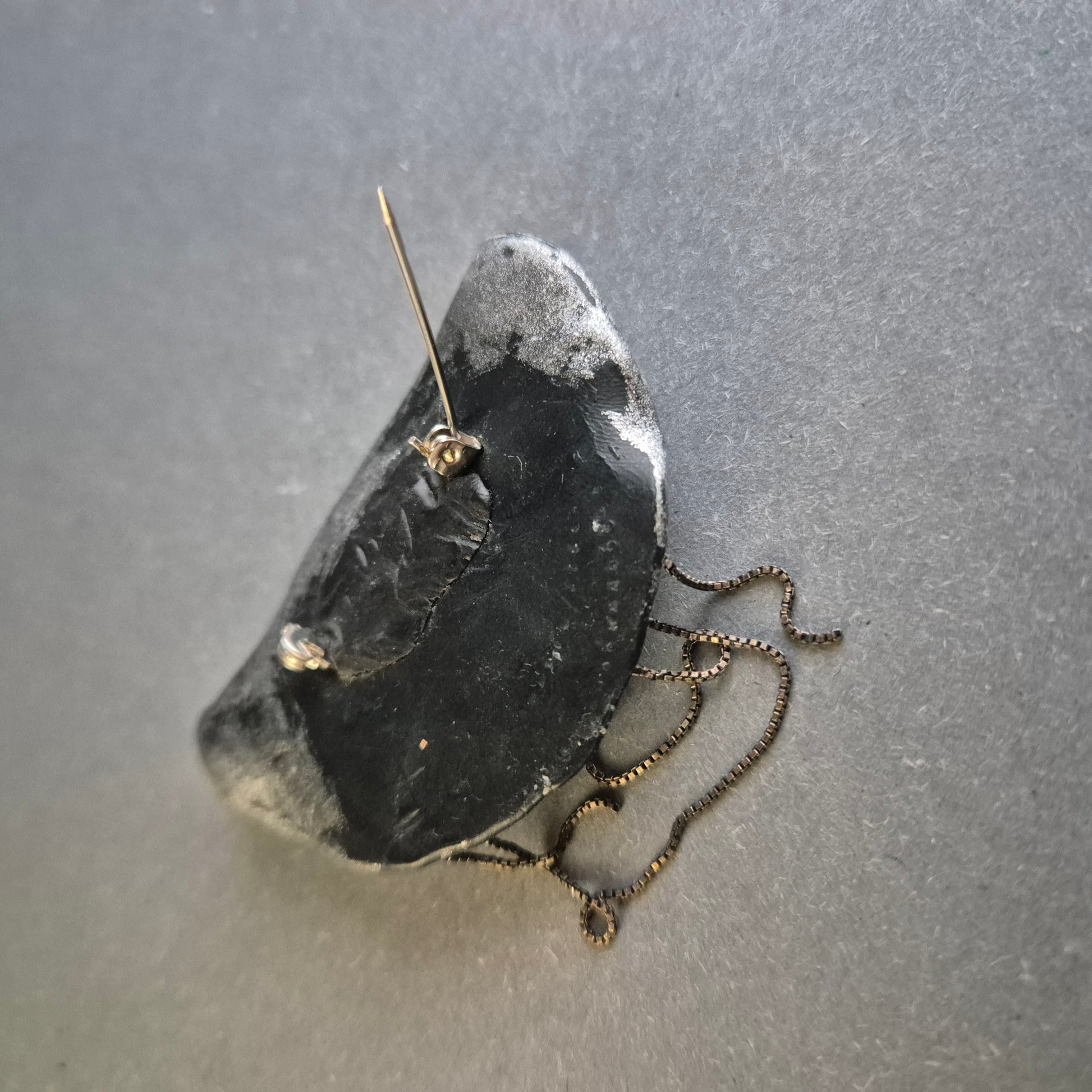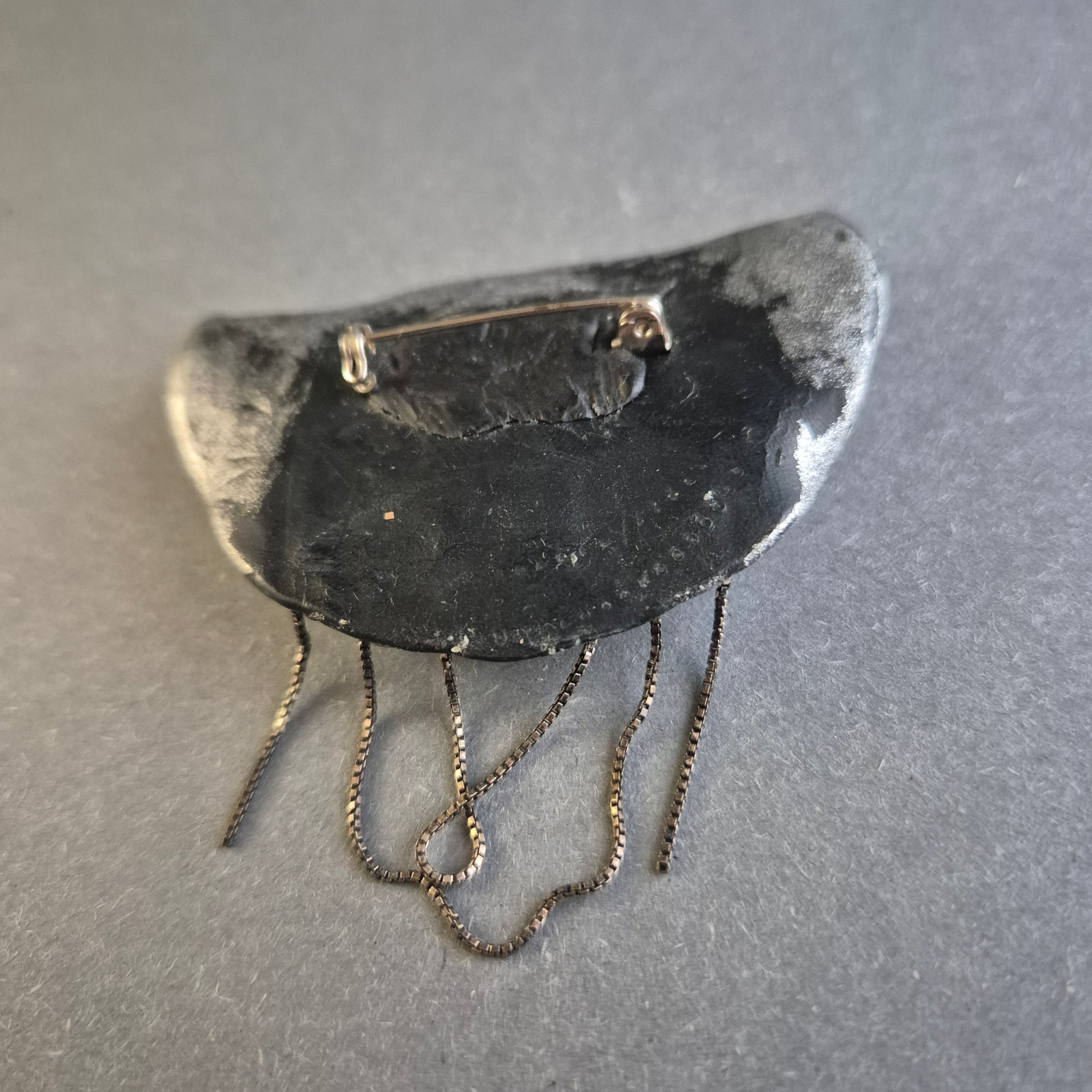 Diese auffällige Vintage-Brosche besticht durch ihr markantes, dunkles Design mit einem zentralen weißen Stein als Kontrast. Die kunstvollen metallischen Strukturen erinnern an eine abstrakte, organische Form und verleihen dem Schmuckstück einen mystischen Look. Ergänzt wird das Design durch feine, herabhängende Kettendetails, die Bewegung und Eleganz hinzufügen. Rückseitig ist die Brosche mit einem stabilen Nadelverschluss ausgestattet. Ein einzigartiges Accessoire für Liebhaber von außergewöhnlichem Schmuck.