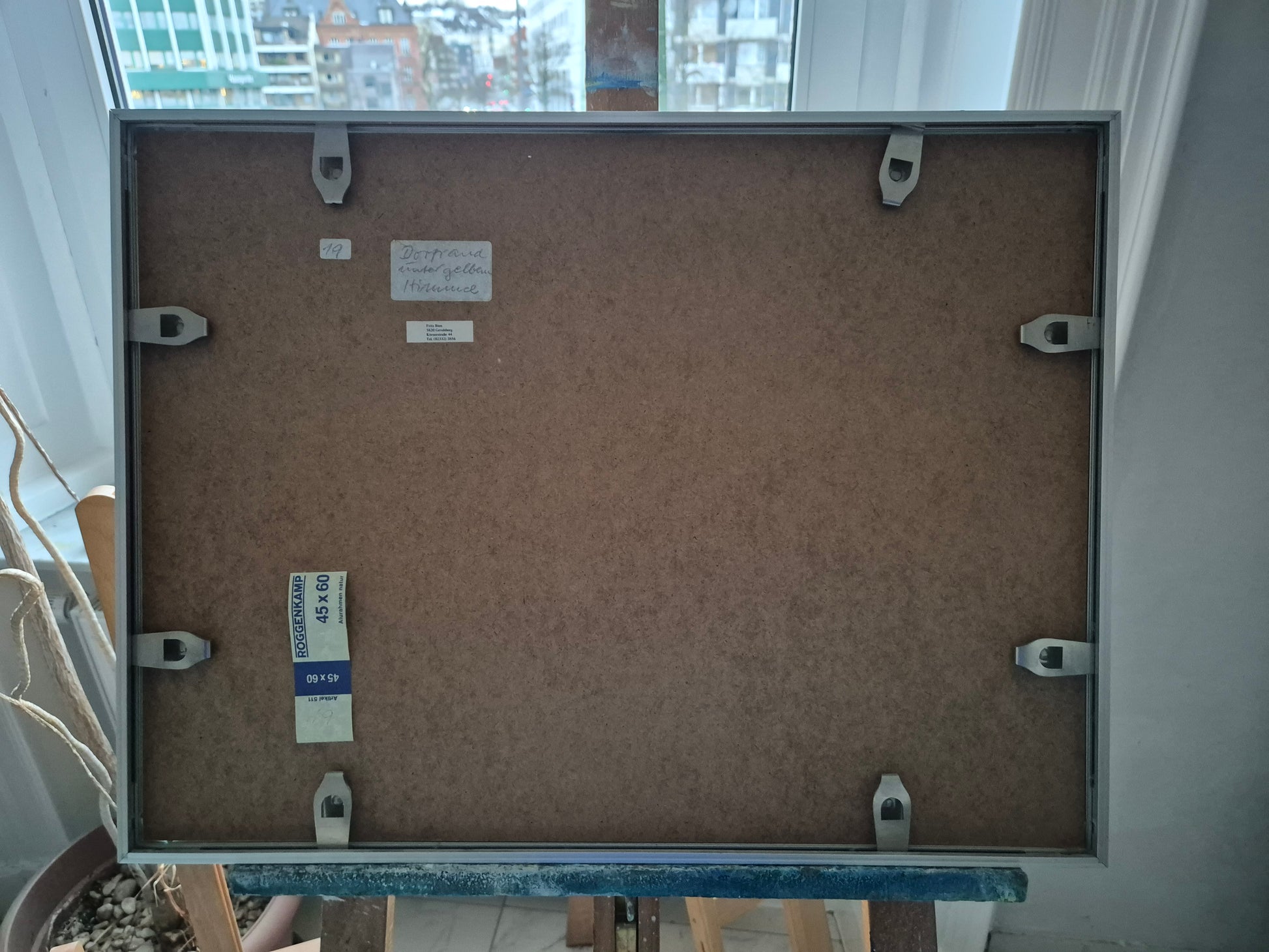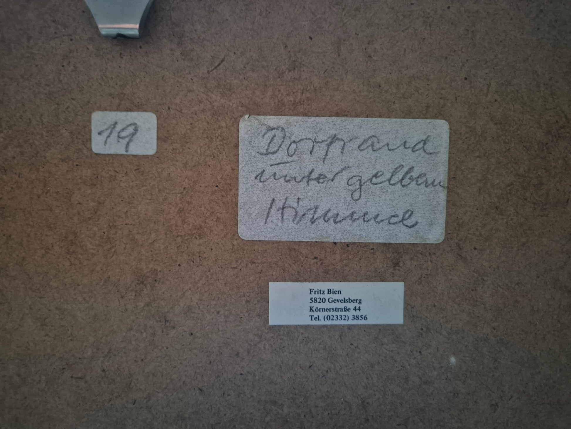 Ausdrucksstarke, handsignierte Malerei auf Papier von Fritz Bien. Die Komposition zeigt eine ruhige Landschaft am Dorfrand unter einem charakteristischen gelb getönten Himmel. Farbgebung und Komposition verleihen dem Werk eine atmosphärische Tiefe und besondere Lichtstimmung.