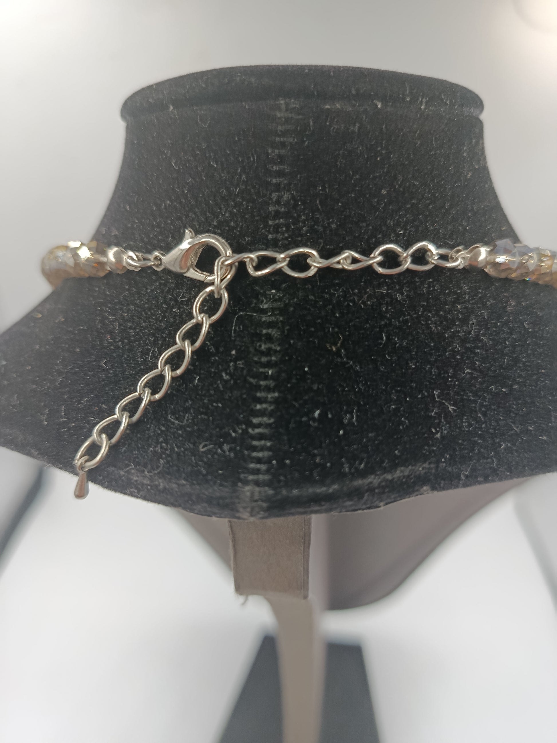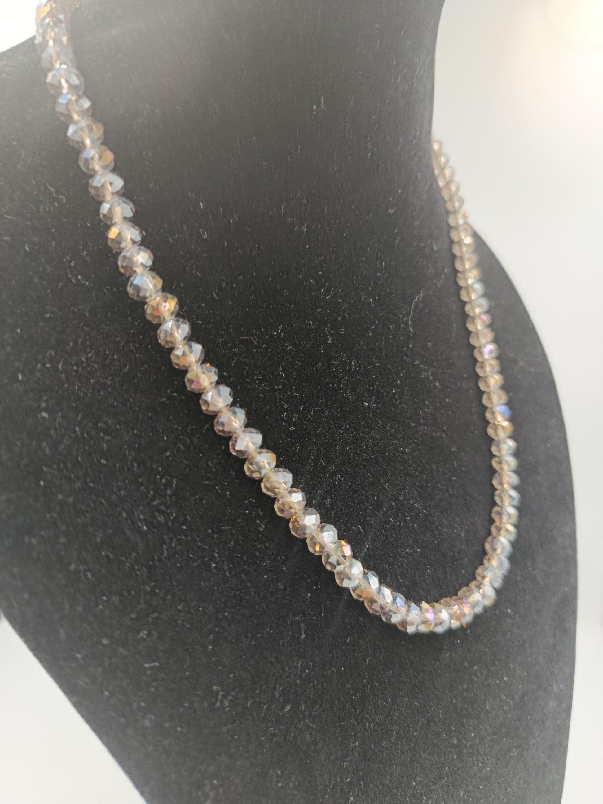 Dieses zarte Collier verzaubert mit seiner strahlenden Eleganz. Zahlreiche facettierte Glasperlen reihen sich harmonisch aneinander und reflektieren das Licht bei jeder Bewegung mit einem regenbogenartigen Schimmer. Das dezente Funkeln macht die Kette zu einem vielseitigen Accessoire, das sowohl im Alltag als auch zu festlichen Anlässen getragen werden kann.
