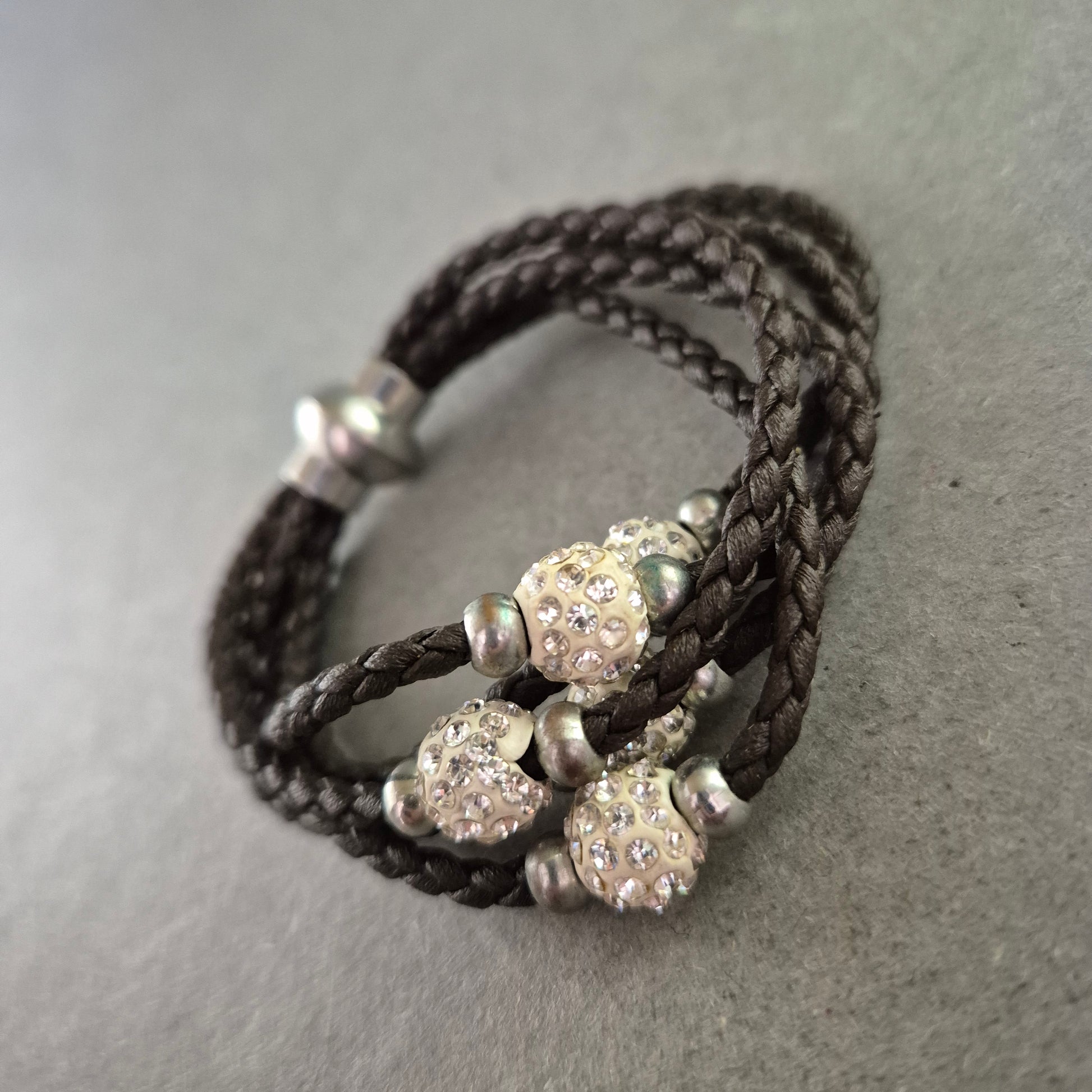Dieses modische Armband kombiniert dunkles, geflochtenes Bandmaterial mit funkelnden Kugeln, die mit kleinen Strasssteinen besetzt sind. Die schlichte Magnetverschlusslösung sorgt für einfaches Anlegen und sicheren Halt. Das Design vereint sportliche Lässigkeit mit einem Hauch Glamour – perfekt für den Alltag oder als stilvolles Detail bei einem Casual-Outfit.