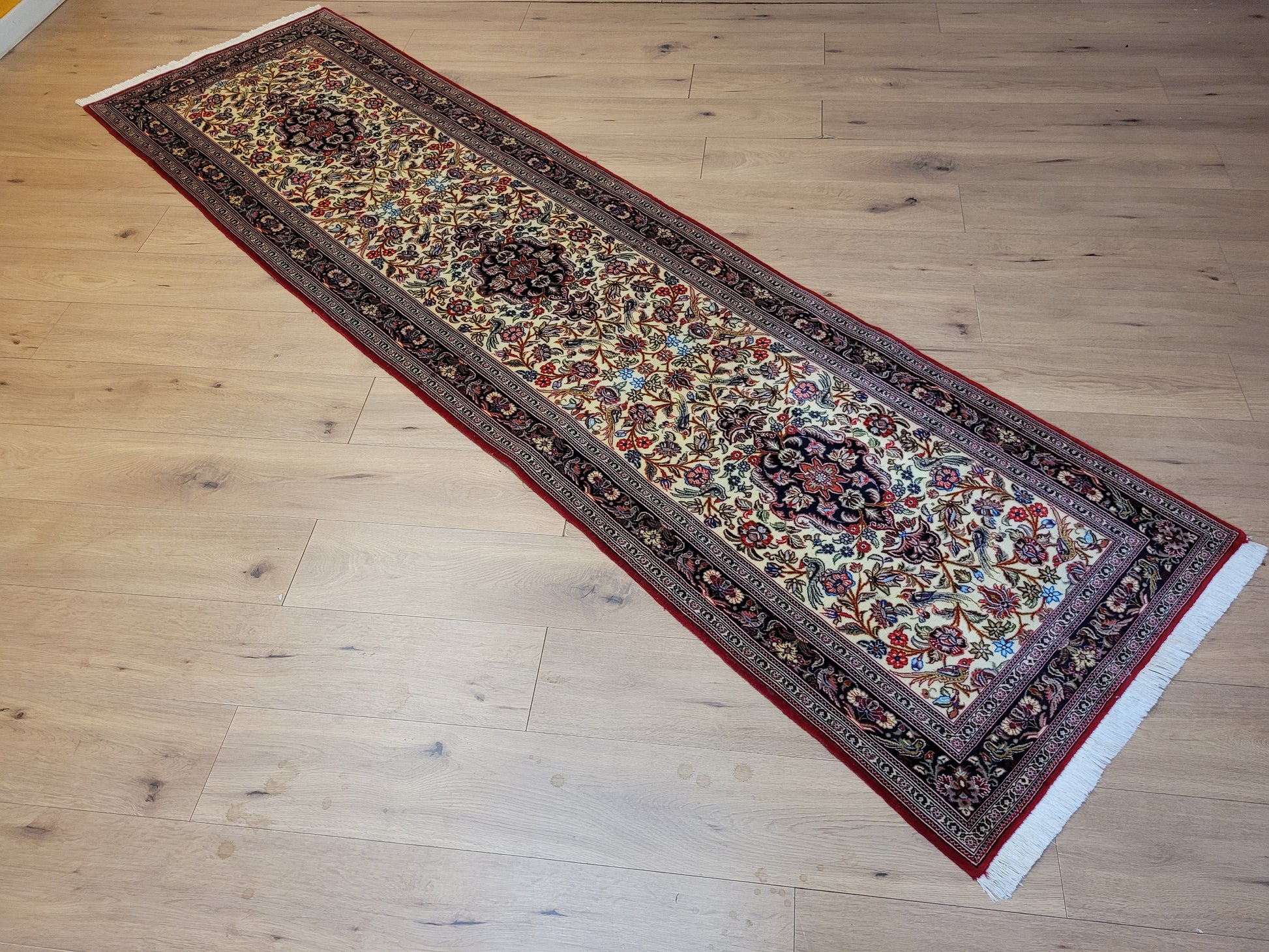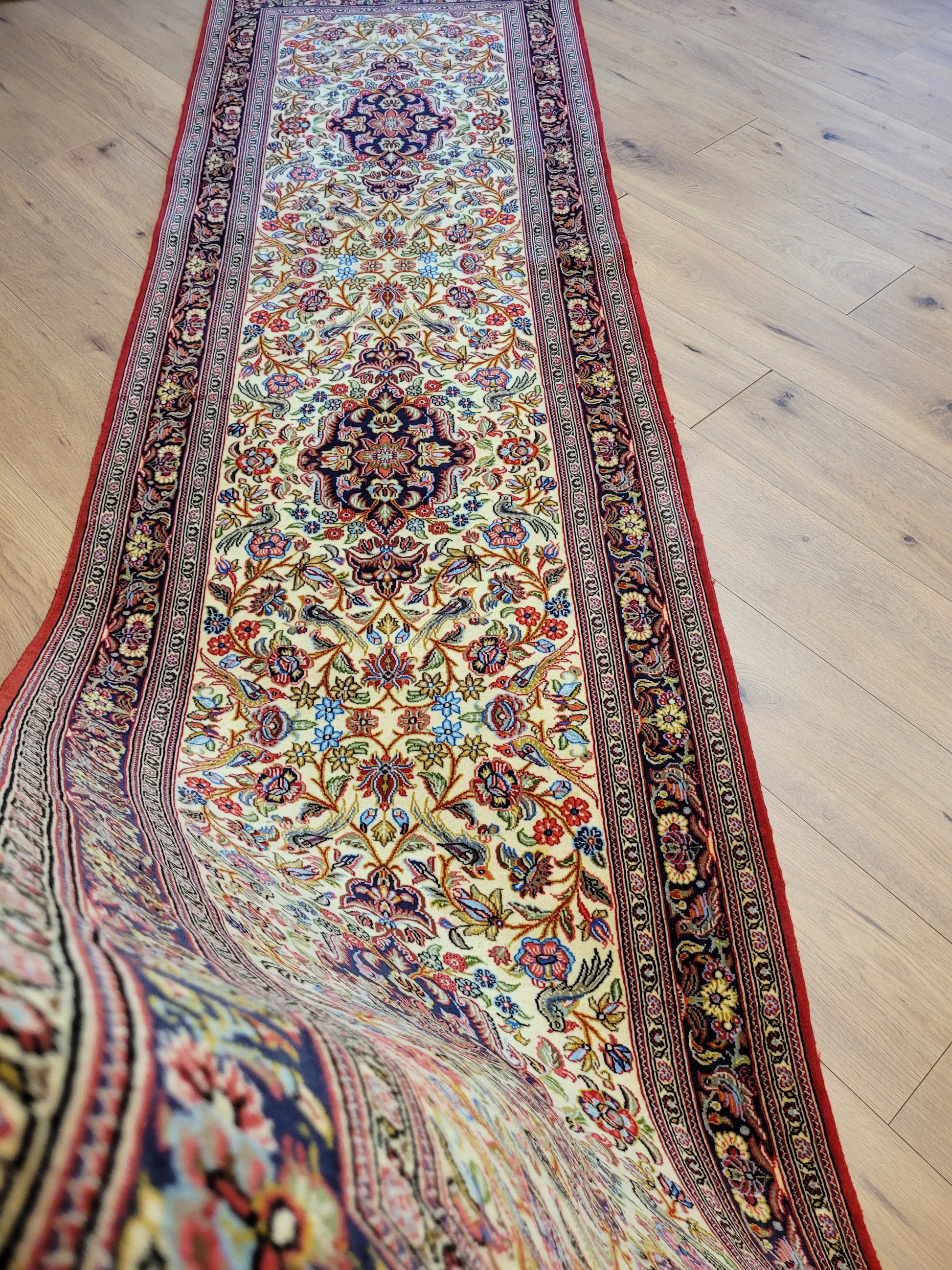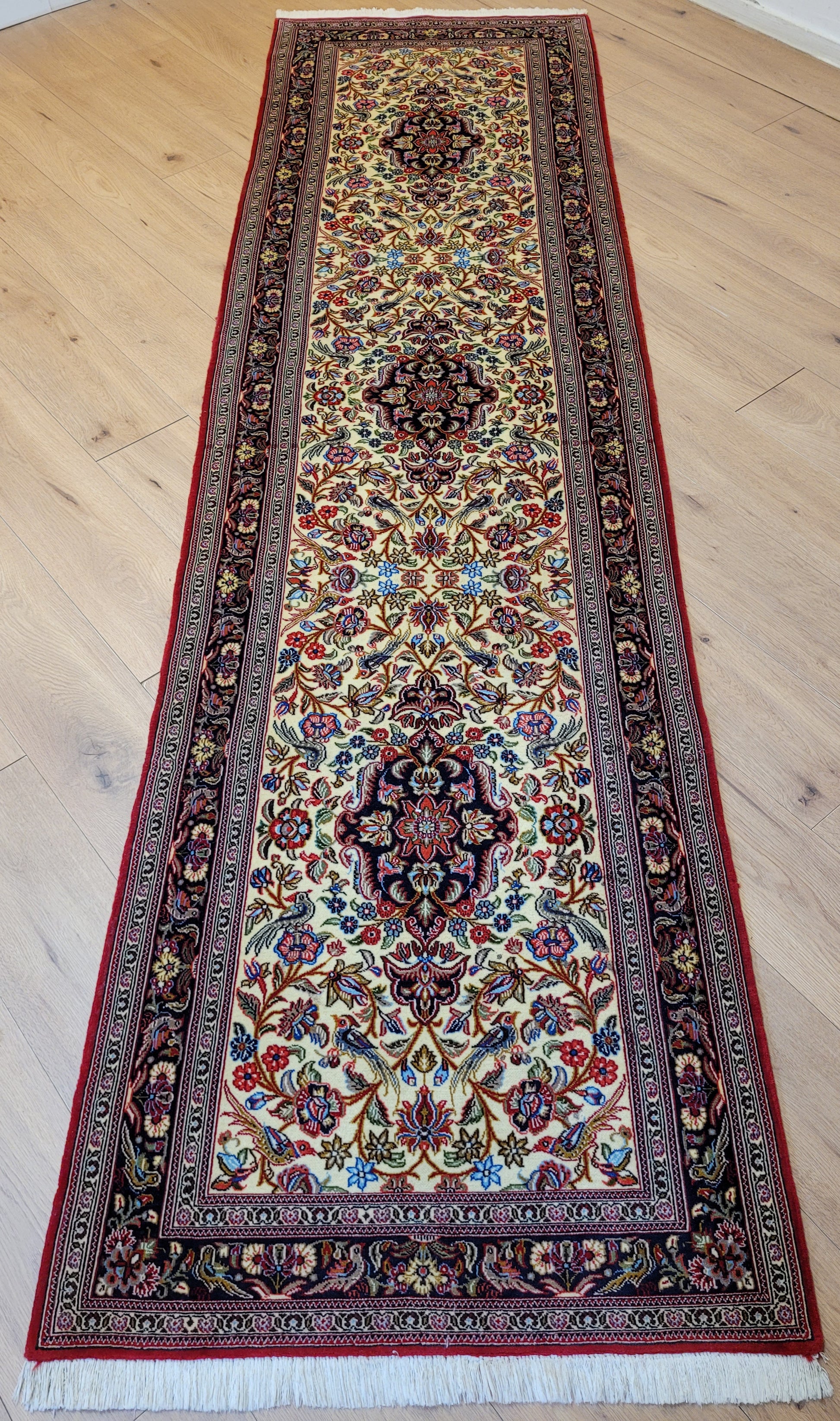 angeboten wird ein edler Ghom Läufer aus feiner Korkwolle, handgeknüpft in detailreicher Ausführung. Das Design zeigt eine elegante Komposition mit floralen Ornamenten und Vogelmotiven auf hellem Fond. Mehrere Zentralmedaillons in kräftigen Farben gliedern den Läufer harmonisch und verleihen ihm eine repräsentative Ausstrahlung. Die umlaufende Bordüre mit Blütenranken rundet das Gesamtbild stilvoll ab.