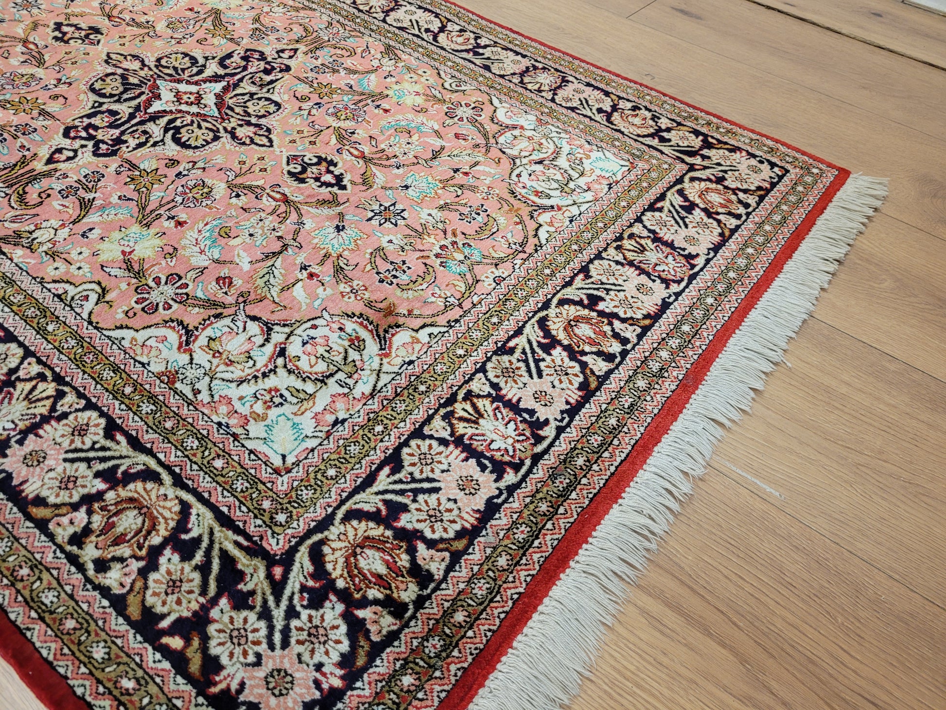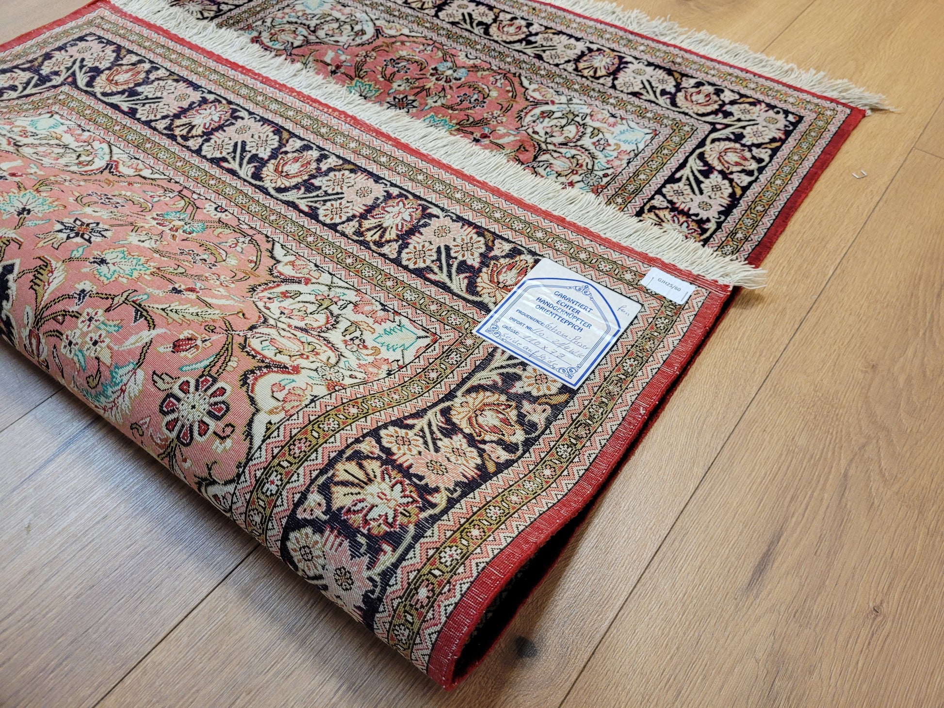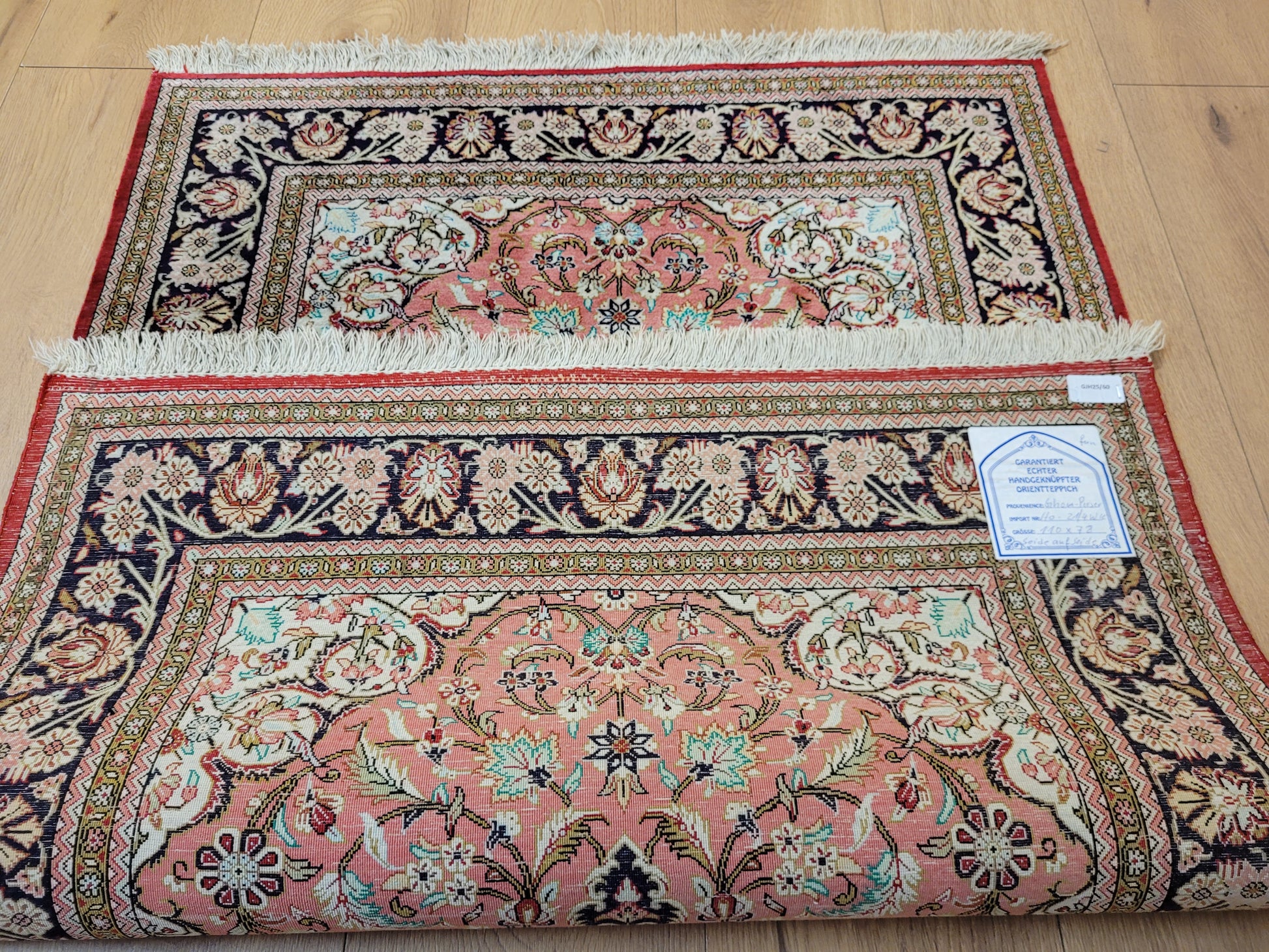 angeboten wird ein edler Ghom Teppich aus reiner Seide auf Seide, handgeknüpft in feiner Ausführung. Das elegante Design zeigt ein zentral platziertes Medaillon mit symmetrisch angeordneten floralen Ranken, umgeben von detailreichen Blütenornamenten. Eine kontrastreiche Bordüre mit kunstvollen Blütenmotiven rahmt das Feld harmonisch ein.