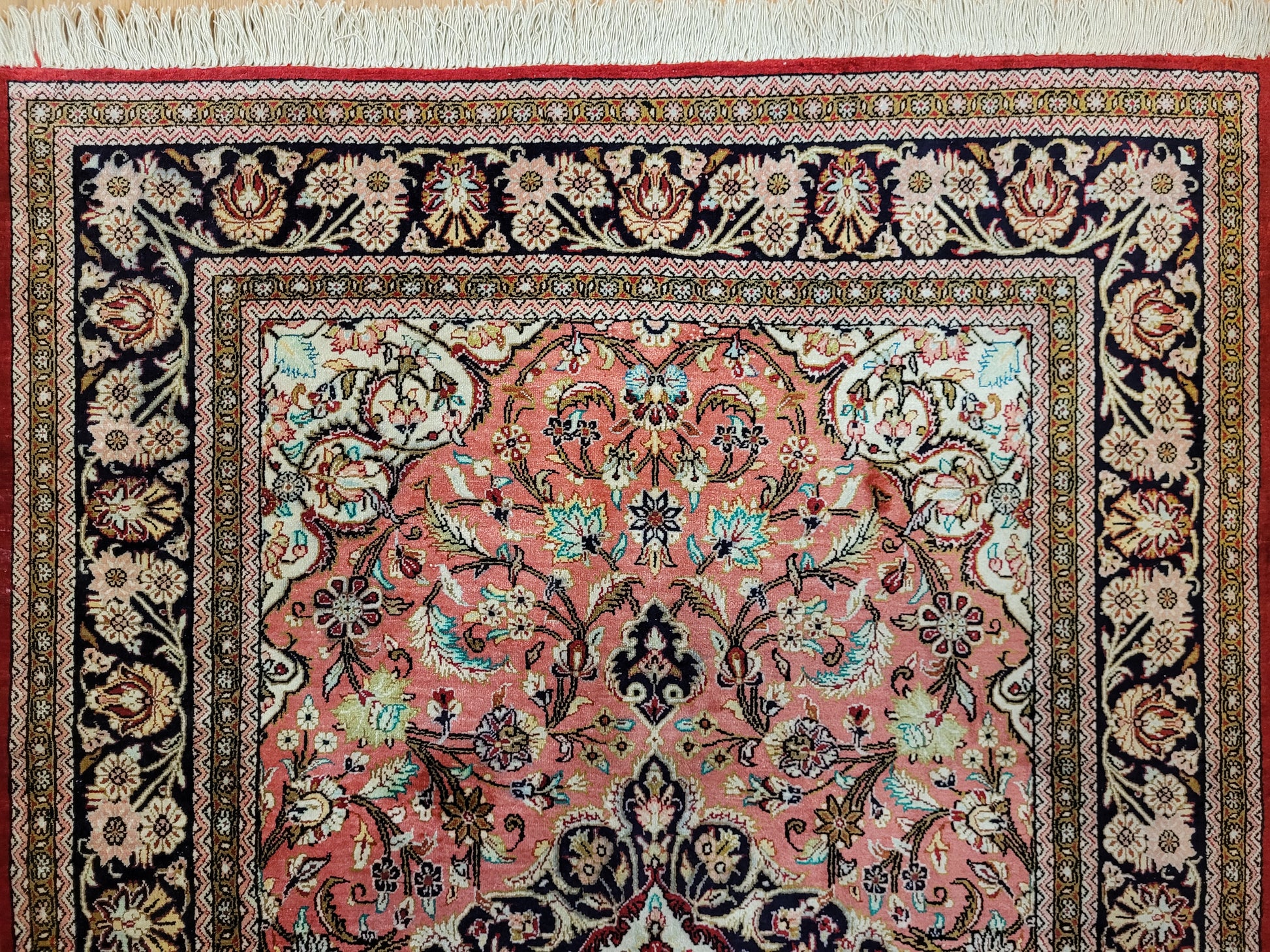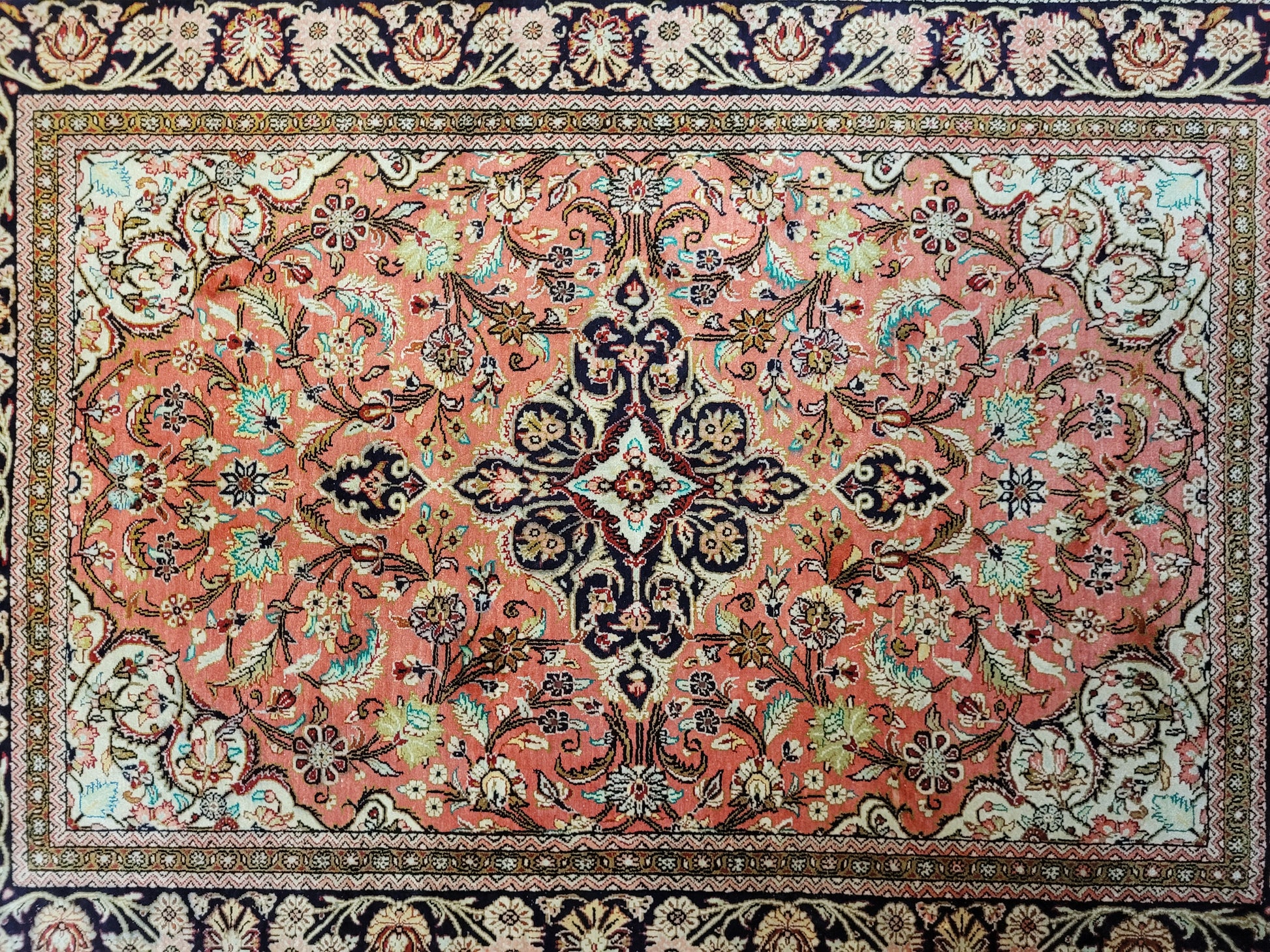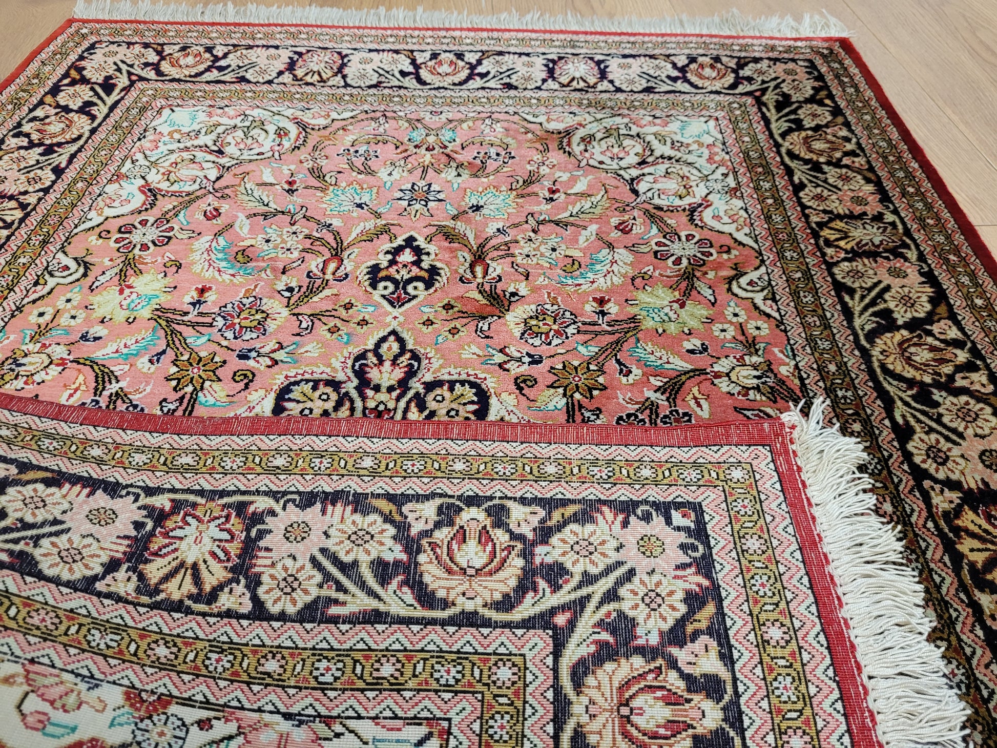 angeboten wird ein edler Ghom Teppich aus reiner Seide auf Seide, handgeknüpft in feiner Ausführung. Das elegante Design zeigt ein zentral platziertes Medaillon mit symmetrisch angeordneten floralen Ranken, umgeben von detailreichen Blütenornamenten. Eine kontrastreiche Bordüre mit kunstvollen Blütenmotiven rahmt das Feld harmonisch ein.