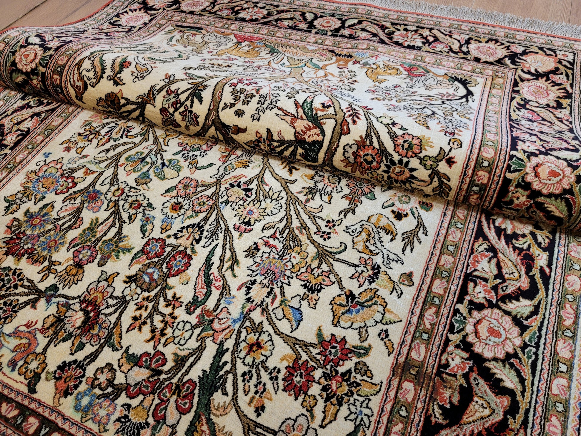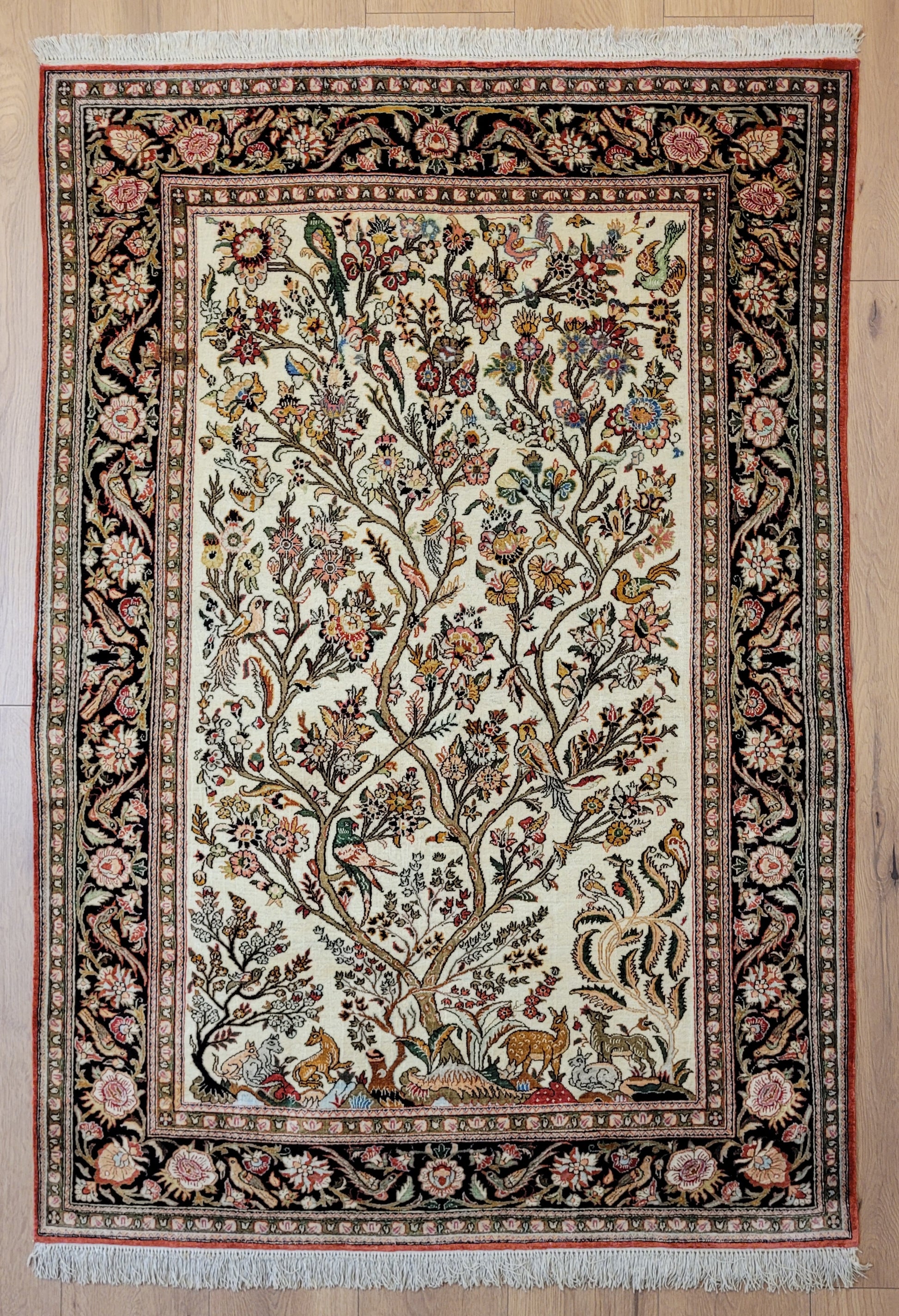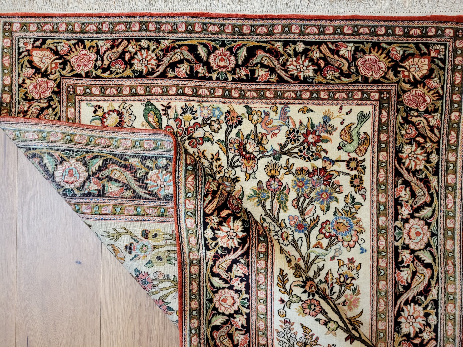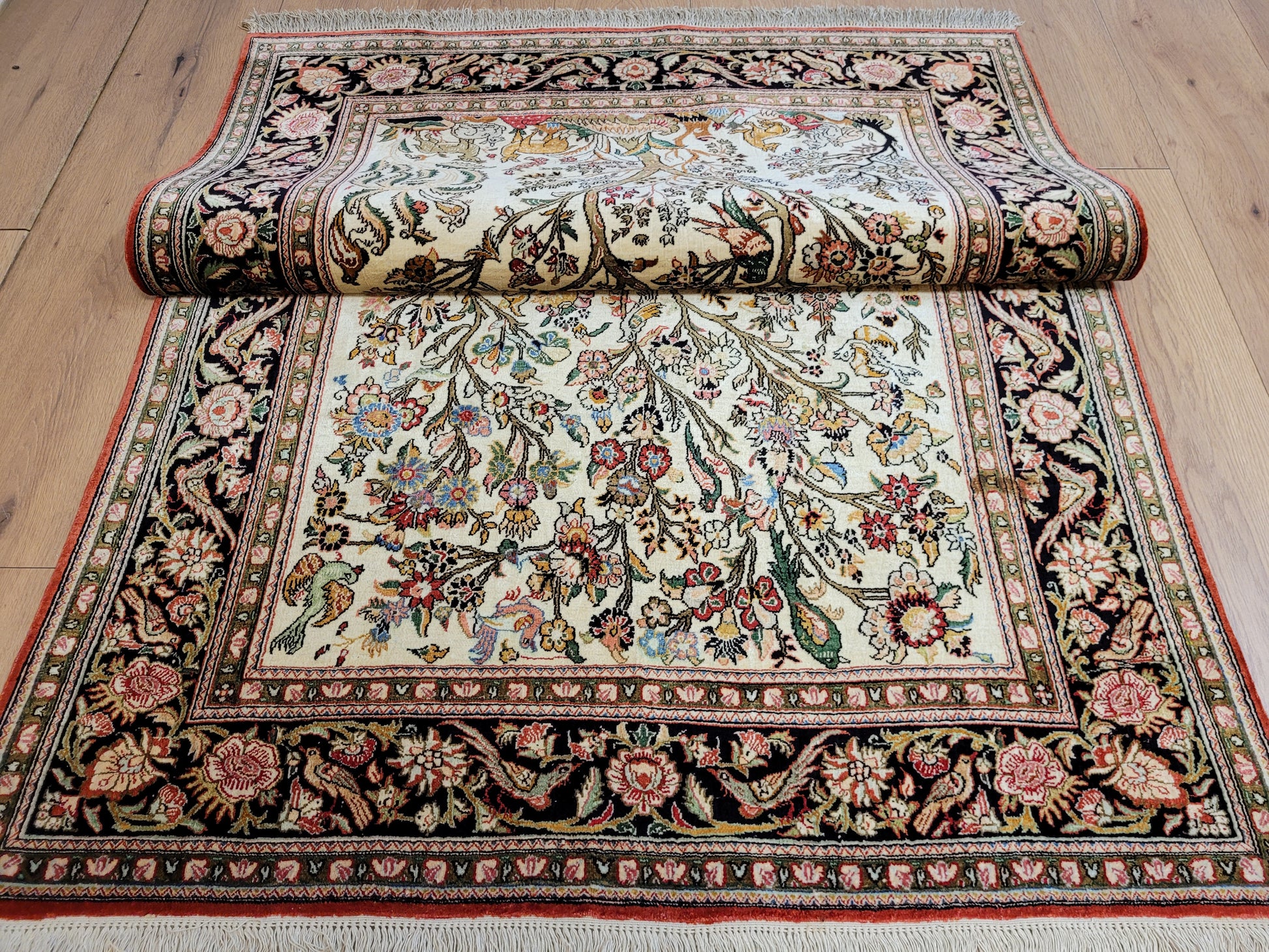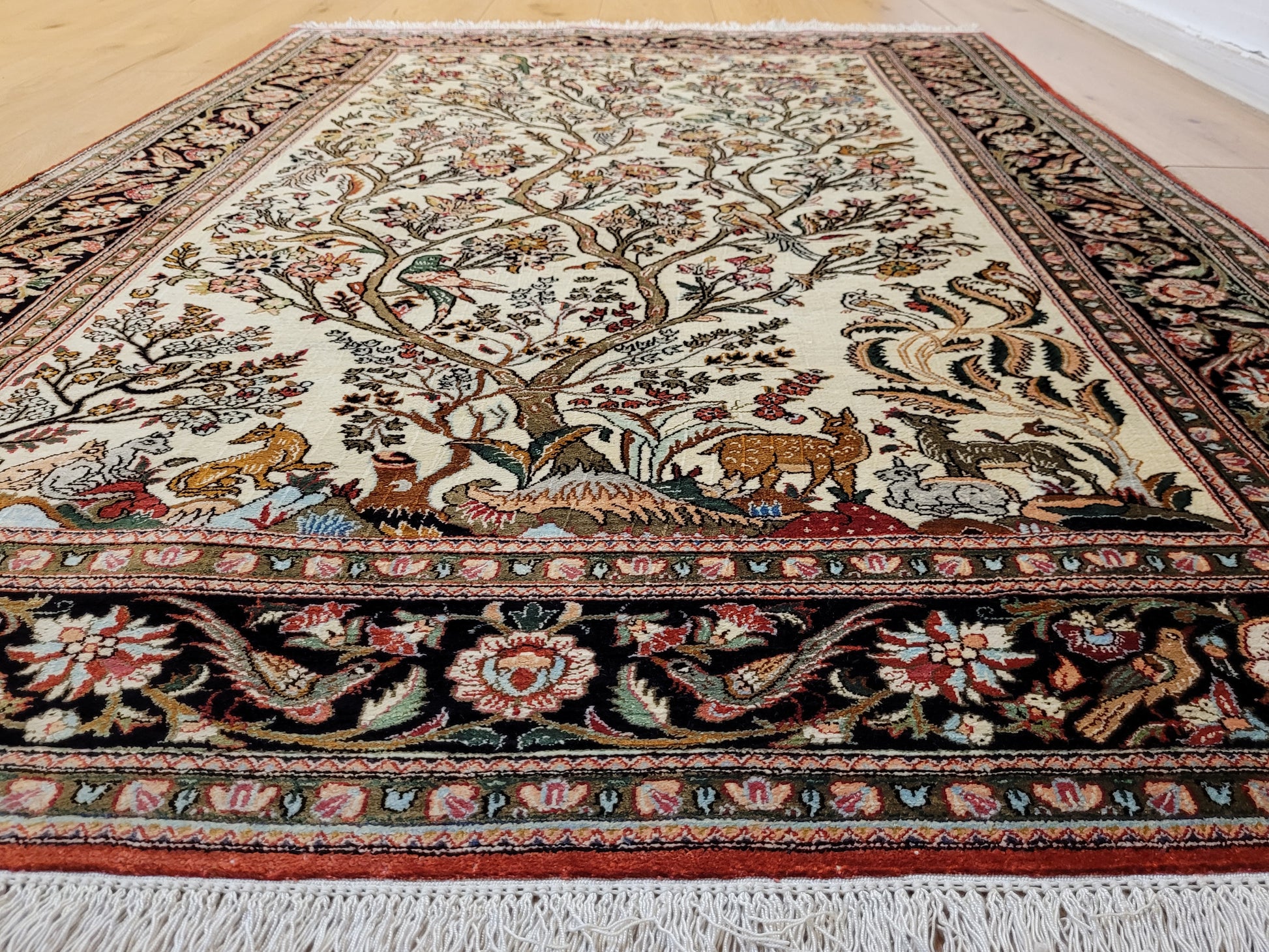 angeboten wird ein edler Ghom Seidenteppich, handgeknüpft auf feiner Seidenkette in meisterhafter Qualität. Das zentrale Motiv zeigt den berühmten „Baum des Lebens“, der sich mit reich verzweigten Ästen über das gesamte Feld erstreckt. Zwischen den Blütenzweigen sind zahlreiche Vögel kunstvoll eingearbeitet, während am unteren Feldbereich Tiere in natürlicher Umgebung dargestellt sind. Die kontrastreiche Bordüre ist reich verziert mit floralen Ornamenten und Vogelmotiven auf dunklem Fond, wodurch die Komposition perfekt eingerahmt wird.