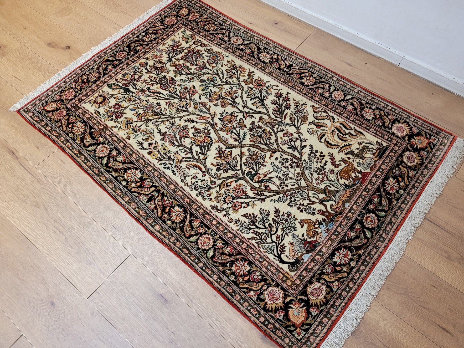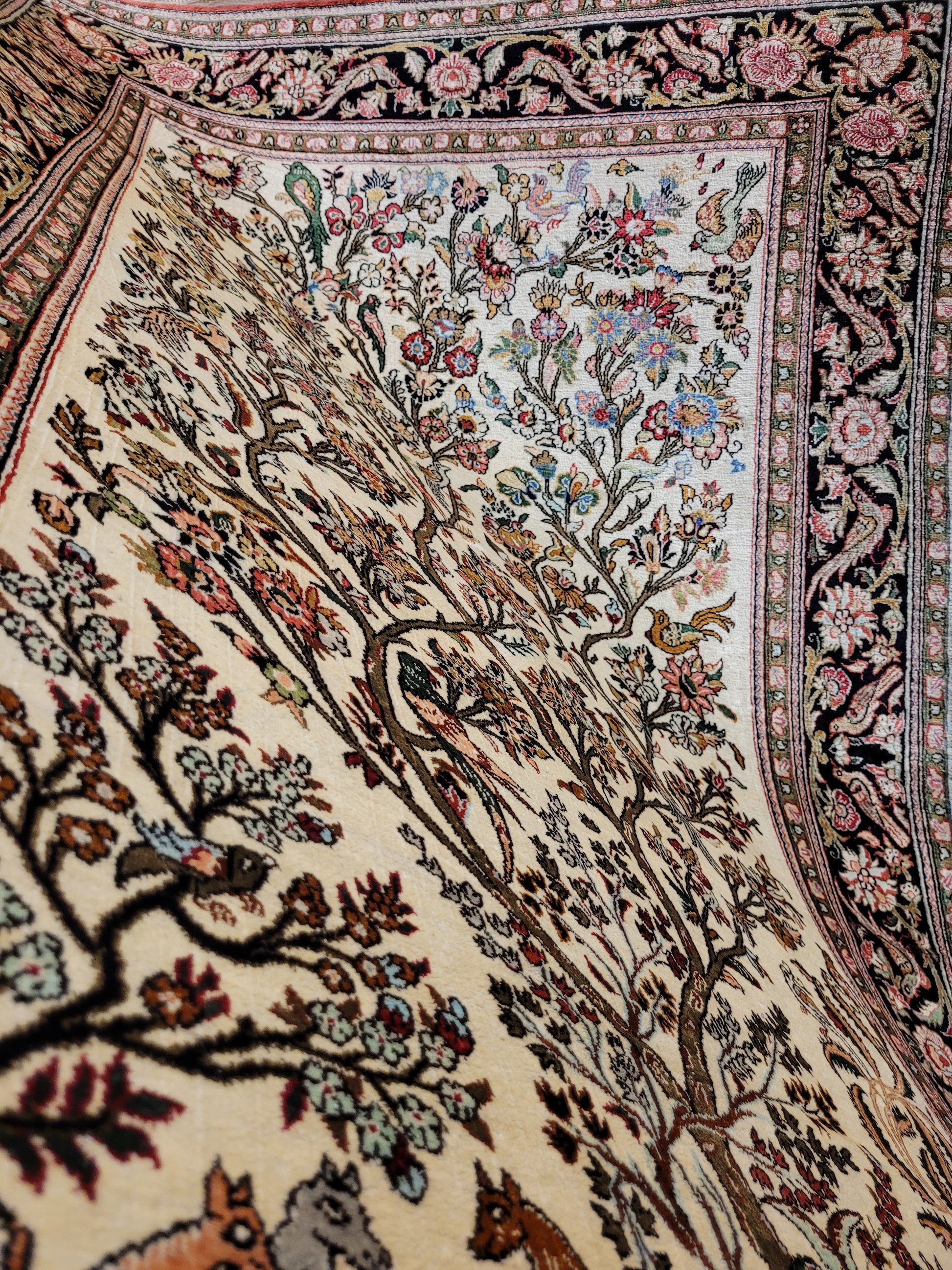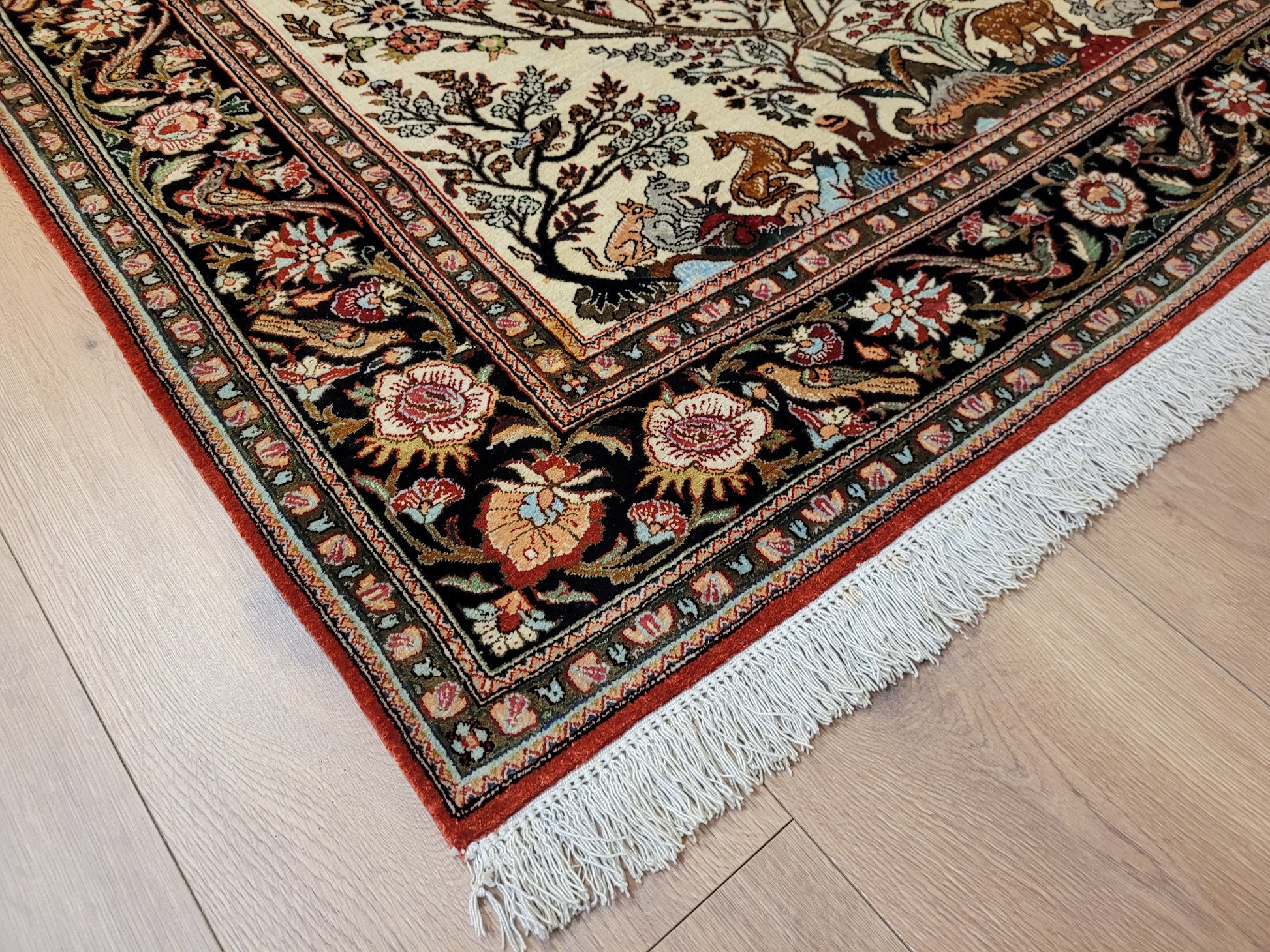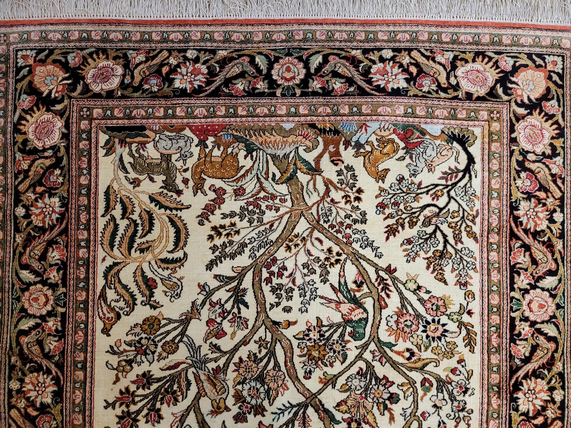angeboten wird ein edler Ghom Seidenteppich, handgeknüpft auf feiner Seidenkette in meisterhafter Qualität. Das zentrale Motiv zeigt den berühmten „Baum des Lebens“, der sich mit reich verzweigten Ästen über das gesamte Feld erstreckt. Zwischen den Blütenzweigen sind zahlreiche Vögel kunstvoll eingearbeitet, während am unteren Feldbereich Tiere in natürlicher Umgebung dargestellt sind. Die kontrastreiche Bordüre ist reich verziert mit floralen Ornamenten und Vogelmotiven auf dunklem Fond, wodurch die Komposition perfekt eingerahmt wird.