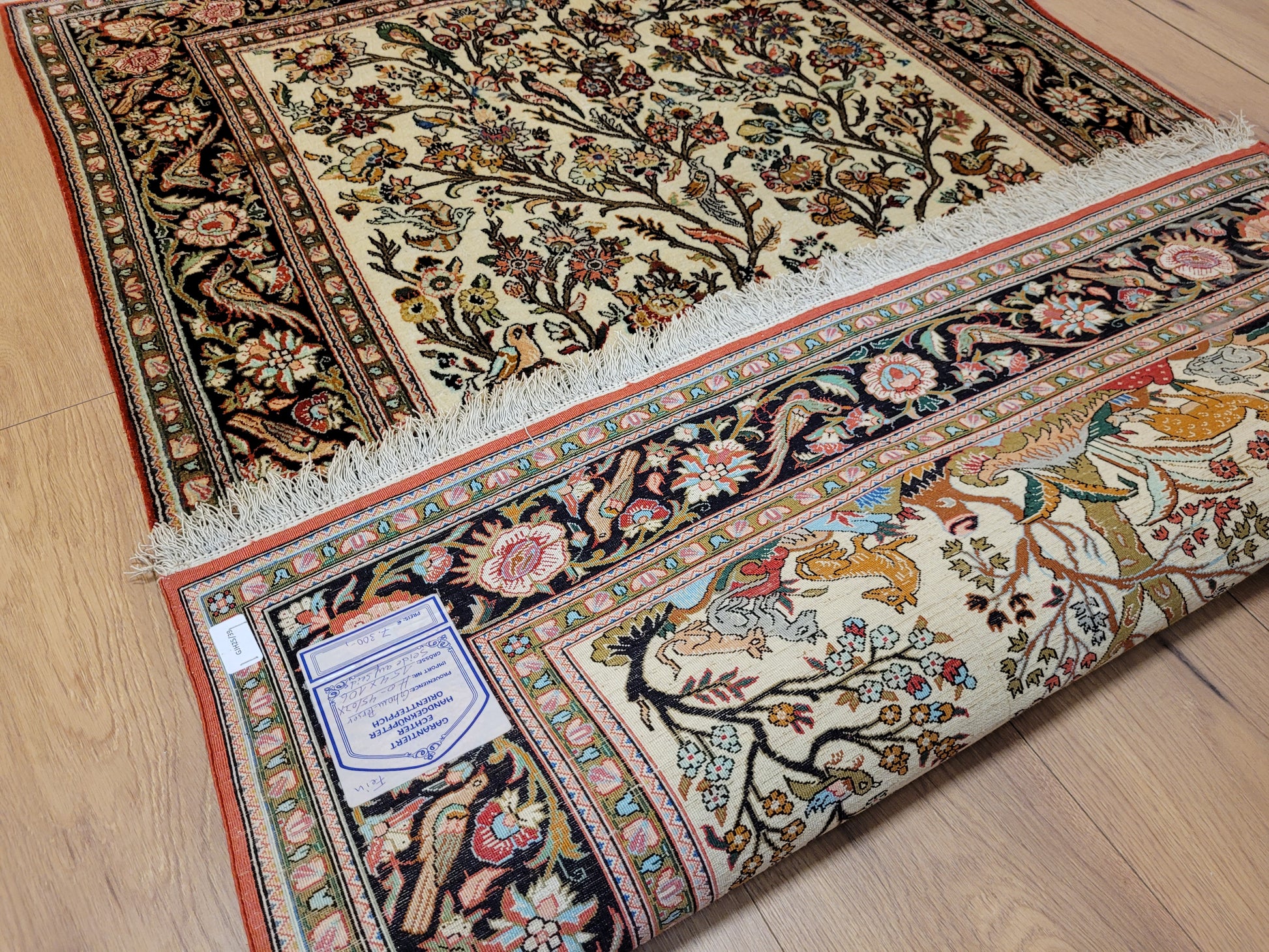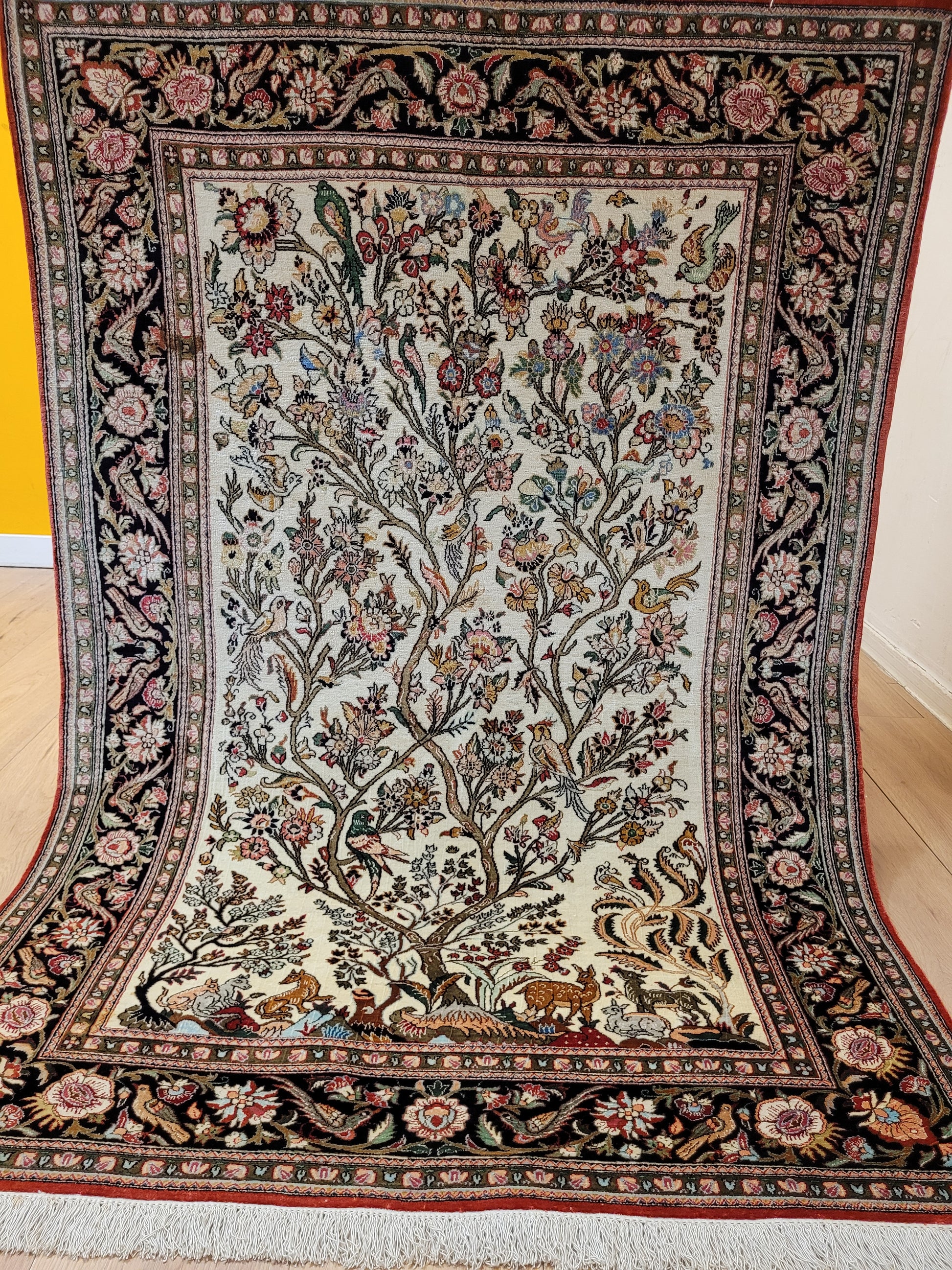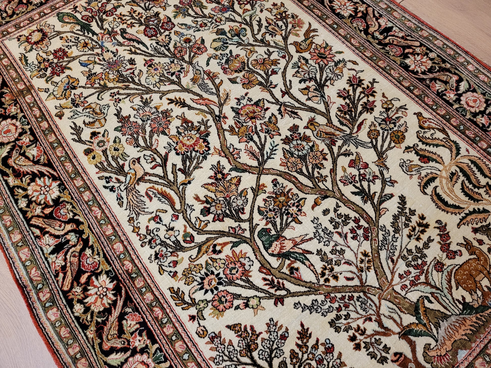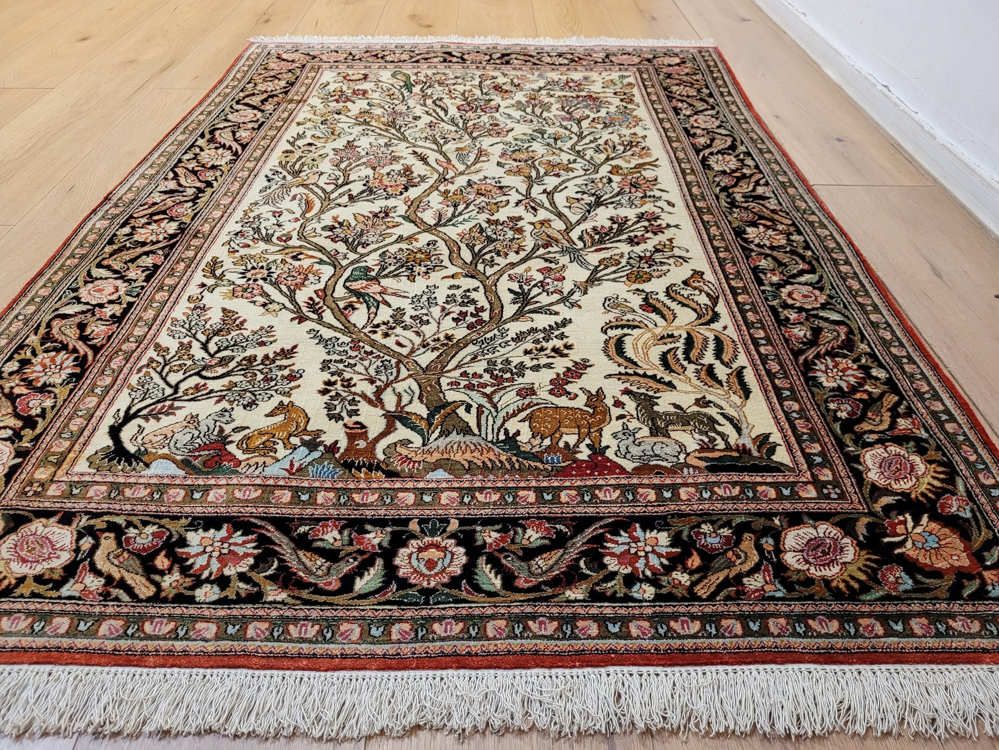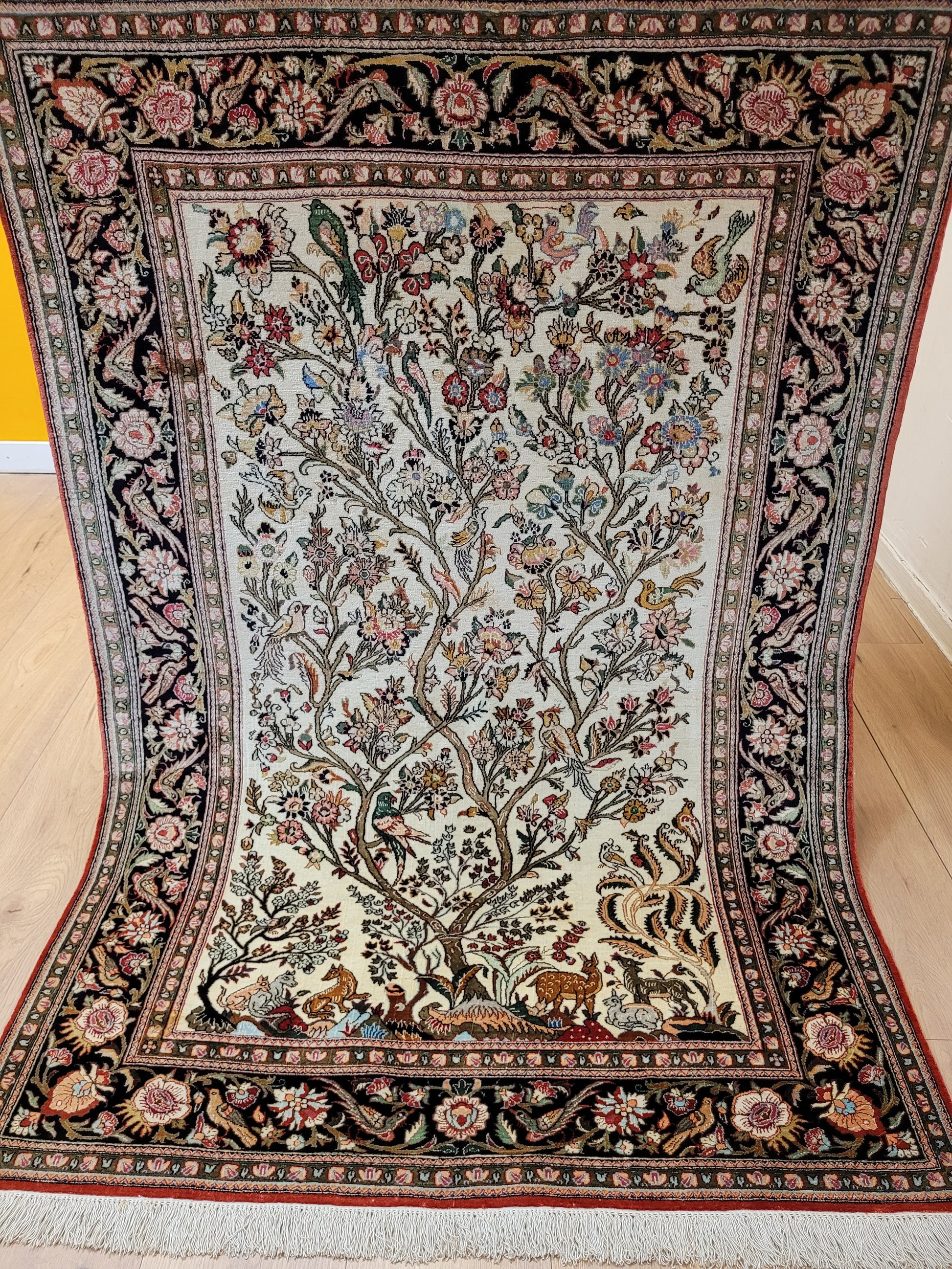 angeboten wird ein edler Ghom Seidenteppich, handgeknüpft auf feiner Seidenkette in meisterhafter Qualität. Das zentrale Motiv zeigt den berühmten „Baum des Lebens“, der sich mit reich verzweigten Ästen über das gesamte Feld erstreckt. Zwischen den Blütenzweigen sind zahlreiche Vögel kunstvoll eingearbeitet, während am unteren Feldbereich Tiere in natürlicher Umgebung dargestellt sind. Die kontrastreiche Bordüre ist reich verziert mit floralen Ornamenten und Vogelmotiven auf dunklem Fond, wodurch die Komposition perfekt eingerahmt wird.