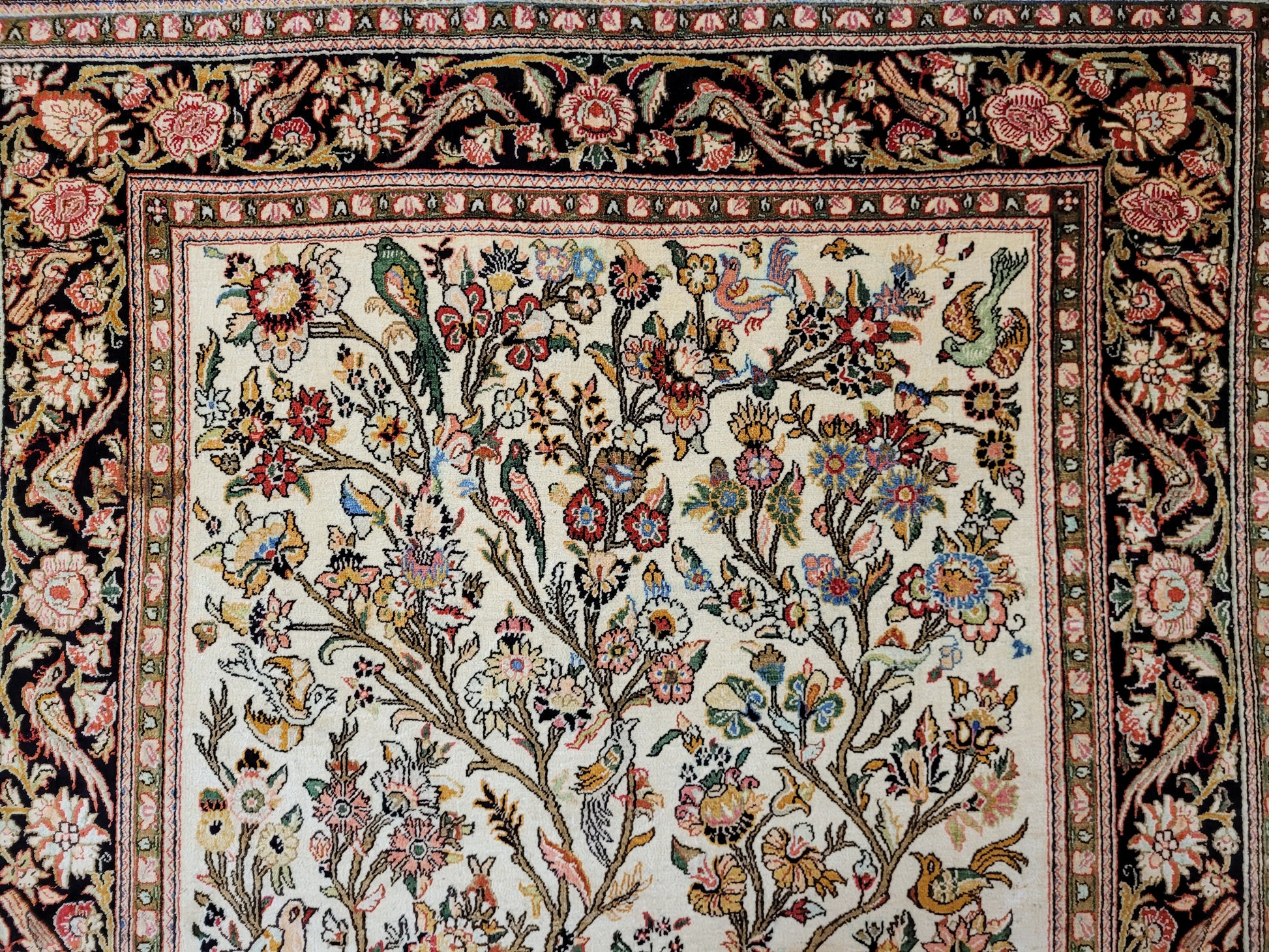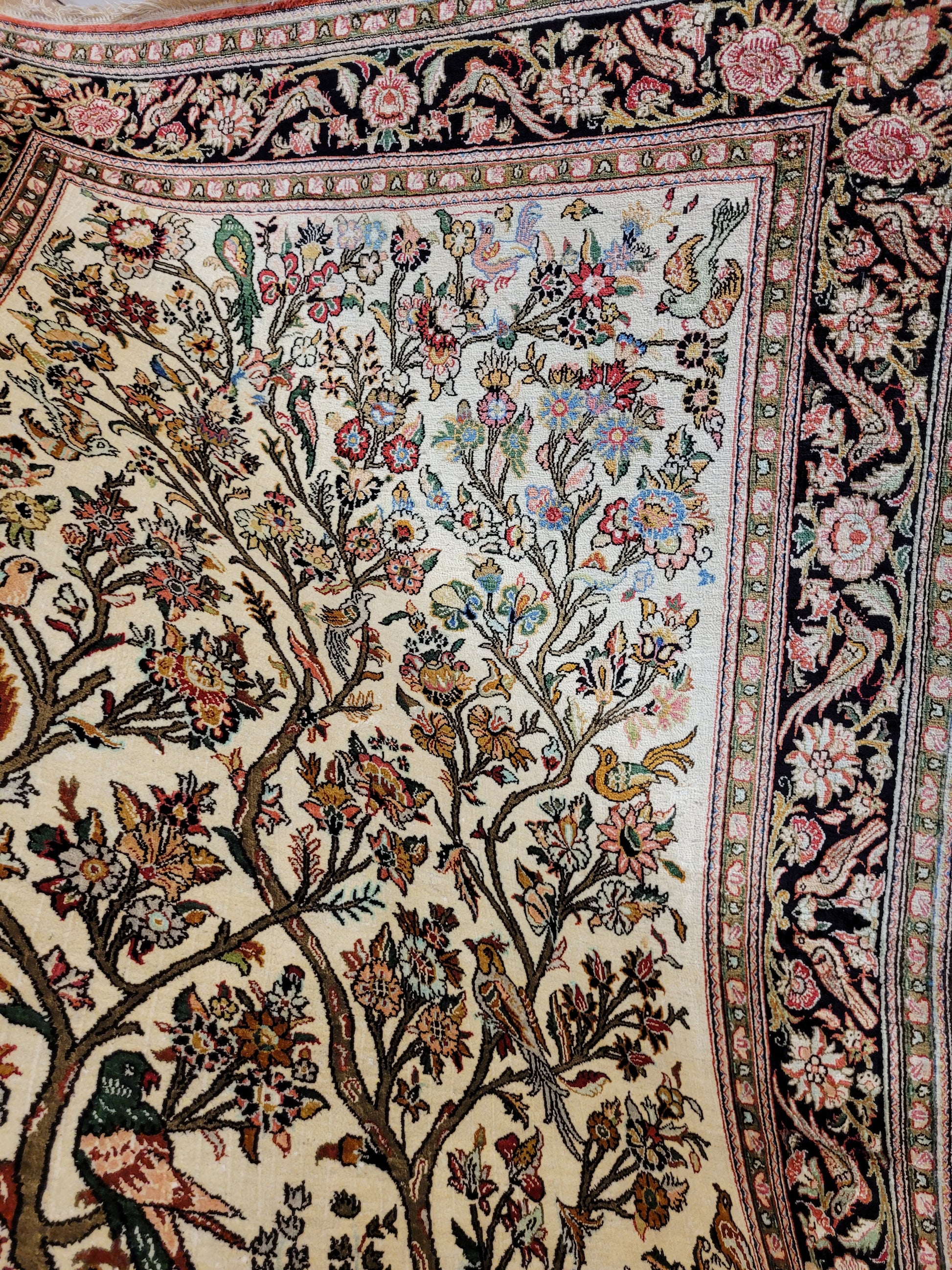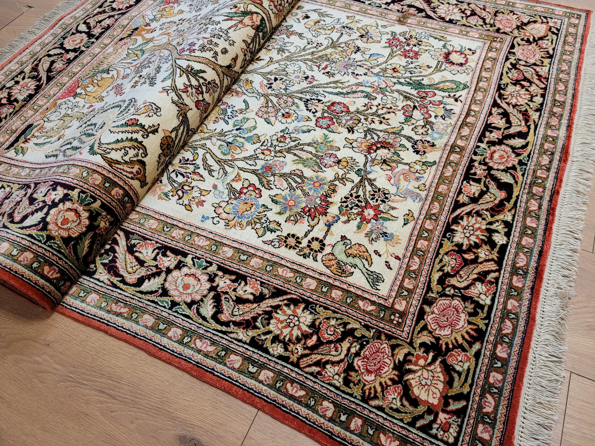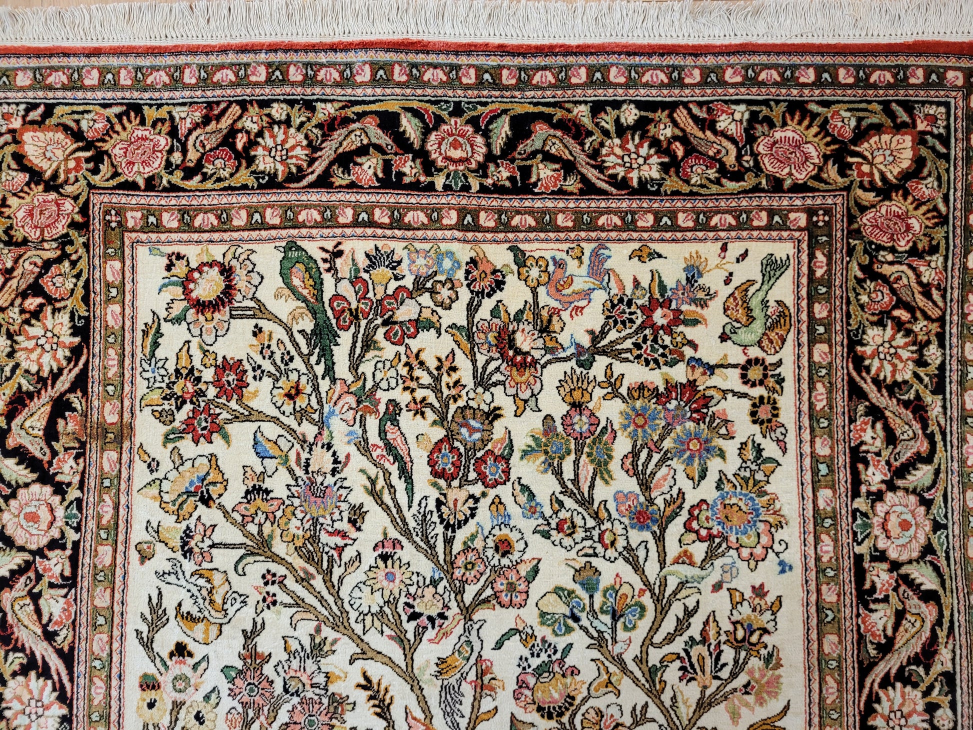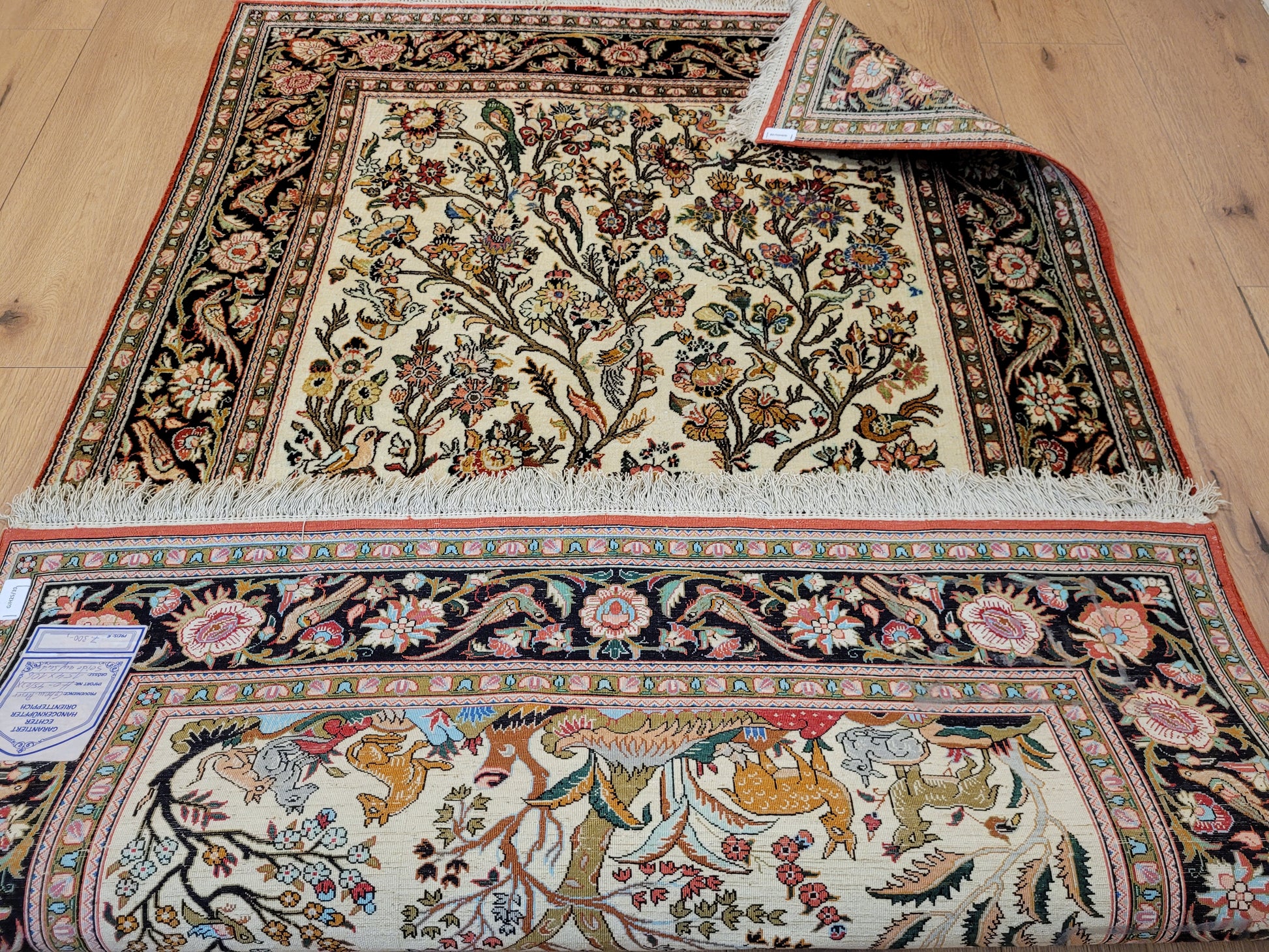angeboten wird ein edler Ghom Seidenteppich, handgeknüpft auf feiner Seidenkette in meisterhafter Qualität. Das zentrale Motiv zeigt den berühmten „Baum des Lebens“, der sich mit reich verzweigten Ästen über das gesamte Feld erstreckt. Zwischen den Blütenzweigen sind zahlreiche Vögel kunstvoll eingearbeitet, während am unteren Feldbereich Tiere in natürlicher Umgebung dargestellt sind. Die kontrastreiche Bordüre ist reich verziert mit floralen Ornamenten und Vogelmotiven auf dunklem Fond, wodurch die Komposition perfekt eingerahmt wird.