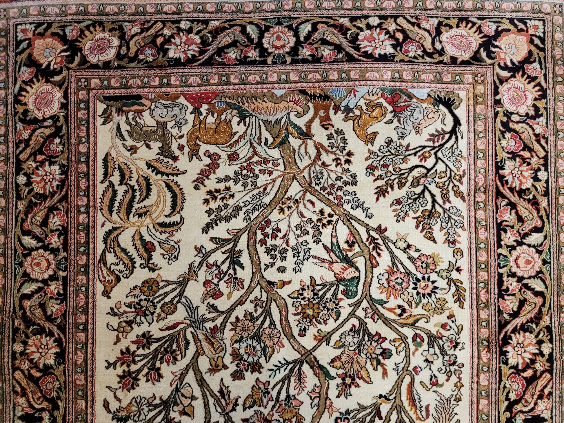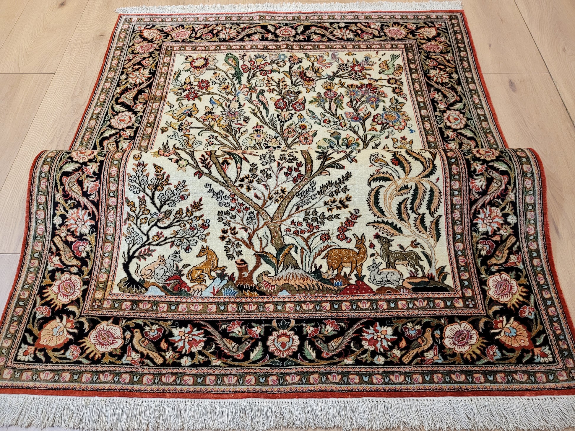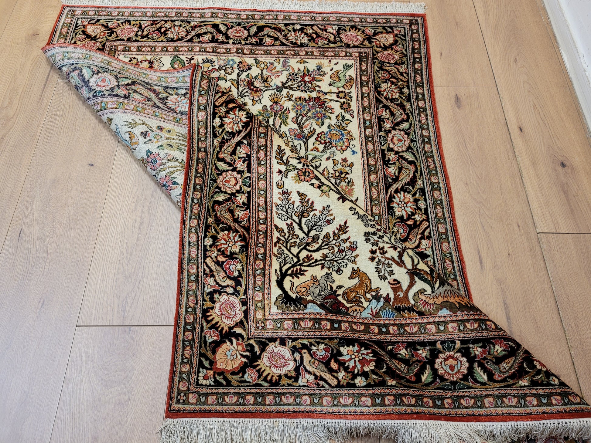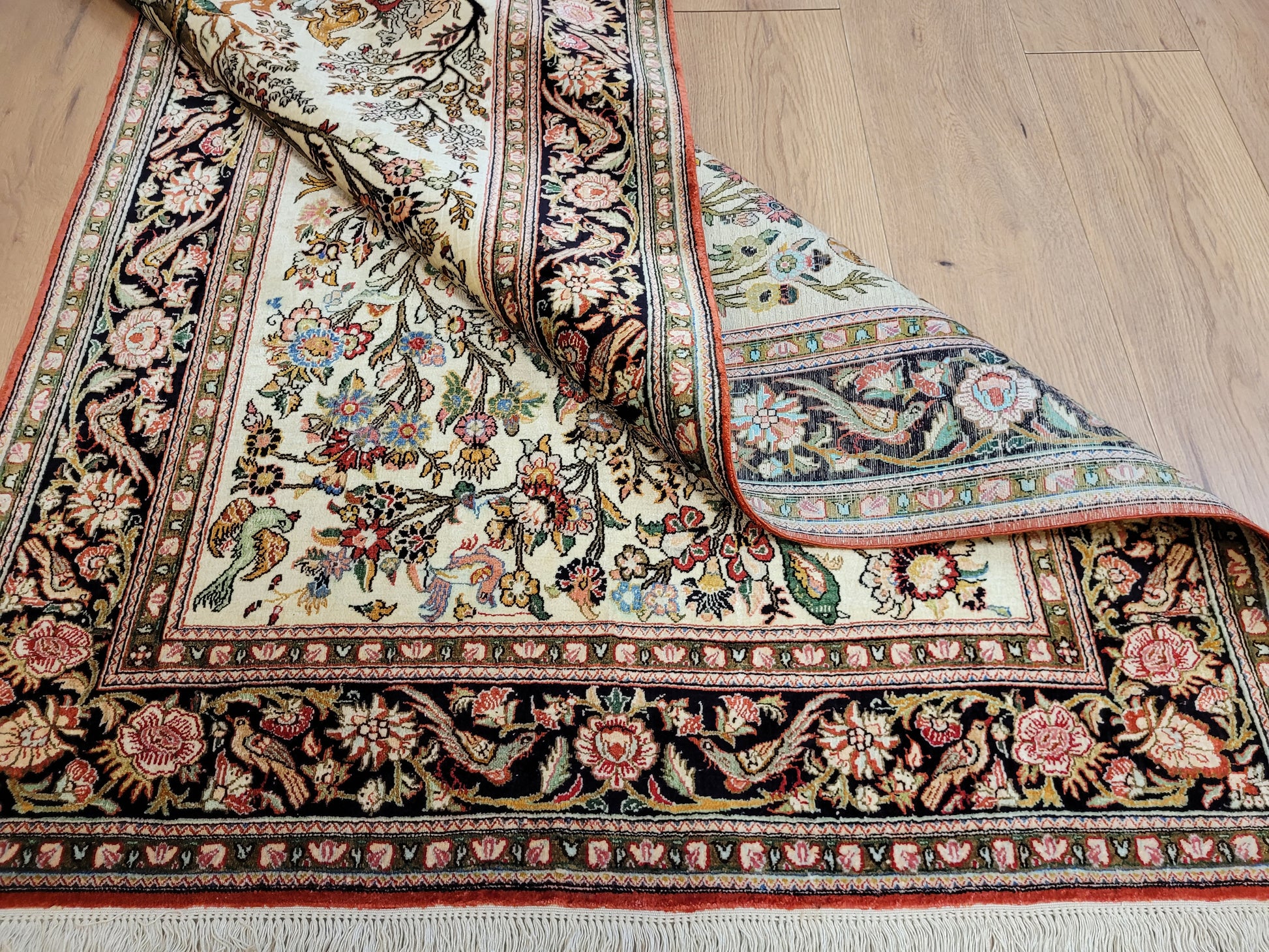 angeboten wird ein edler Ghom Seidenteppich, handgeknüpft auf feiner Seidenkette in meisterhafter Qualität. Das zentrale Motiv zeigt den berühmten „Baum des Lebens“, der sich mit reich verzweigten Ästen über das gesamte Feld erstreckt. Zwischen den Blütenzweigen sind zahlreiche Vögel kunstvoll eingearbeitet, während am unteren Feldbereich Tiere in natürlicher Umgebung dargestellt sind. Die kontrastreiche Bordüre ist reich verziert mit floralen Ornamenten und Vogelmotiven auf dunklem Fond, wodurch die Komposition perfekt eingerahmt wird.