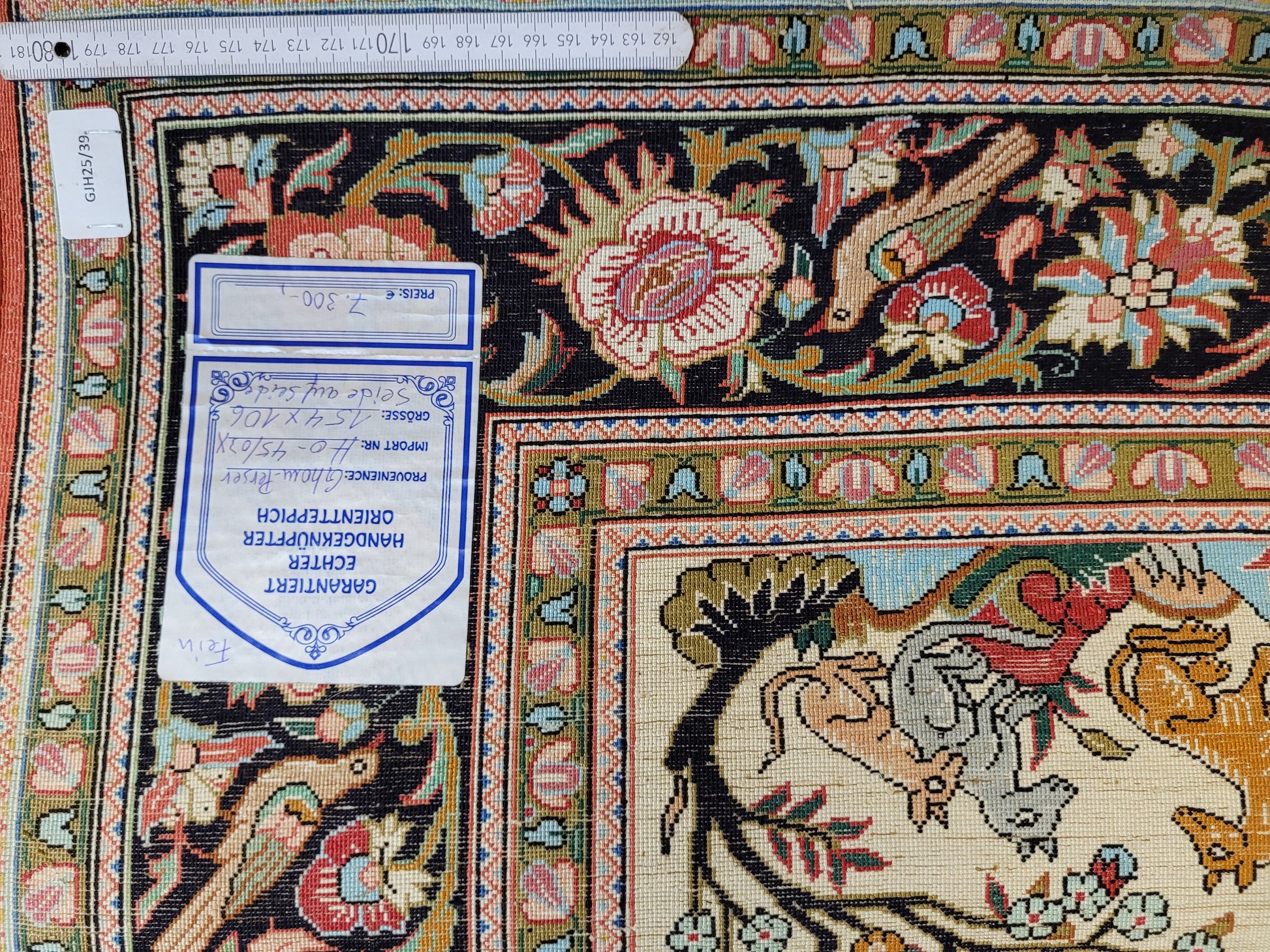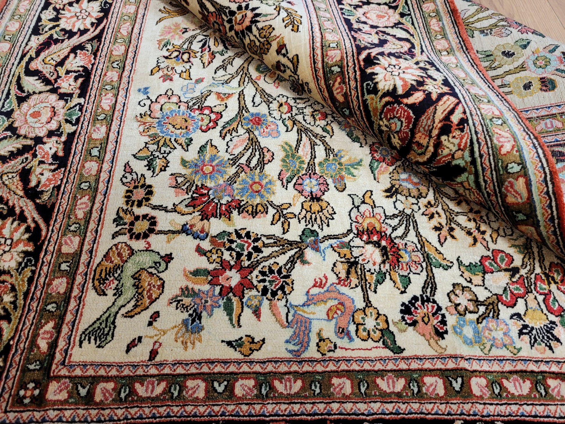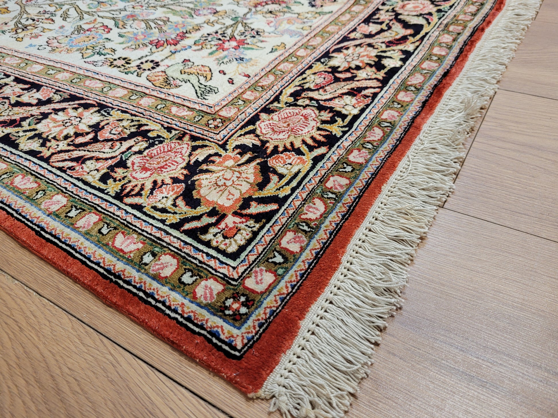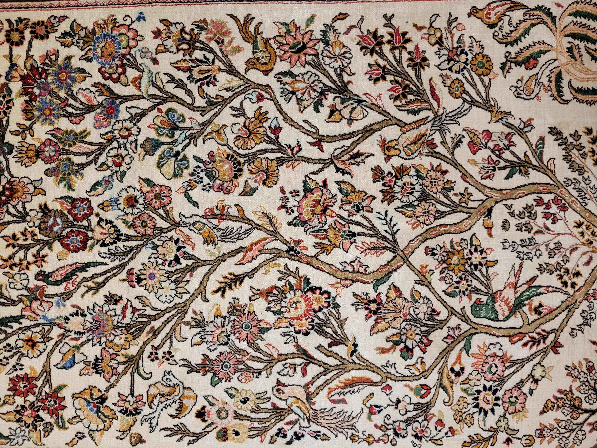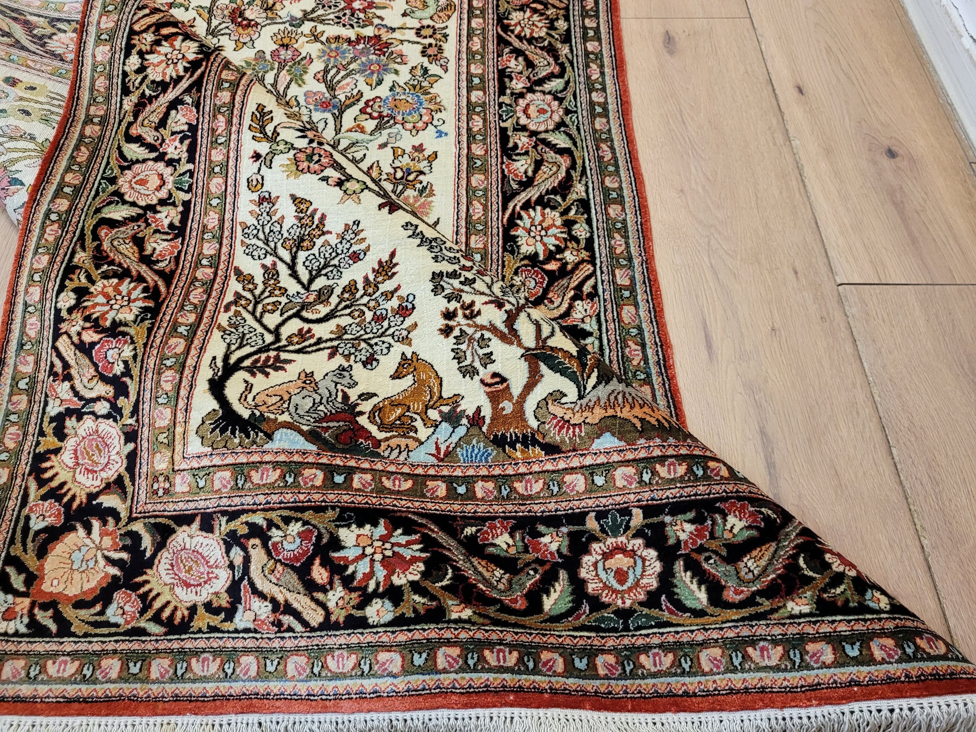 angeboten wird ein edler Ghom Seidenteppich, handgeknüpft auf feiner Seidenkette in meisterhafter Qualität. Das zentrale Motiv zeigt den berühmten „Baum des Lebens“, der sich mit reich verzweigten Ästen über das gesamte Feld erstreckt. Zwischen den Blütenzweigen sind zahlreiche Vögel kunstvoll eingearbeitet, während am unteren Feldbereich Tiere in natürlicher Umgebung dargestellt sind. Die kontrastreiche Bordüre ist reich verziert mit floralen Ornamenten und Vogelmotiven auf dunklem Fond, wodurch die Komposition perfekt eingerahmt wird.