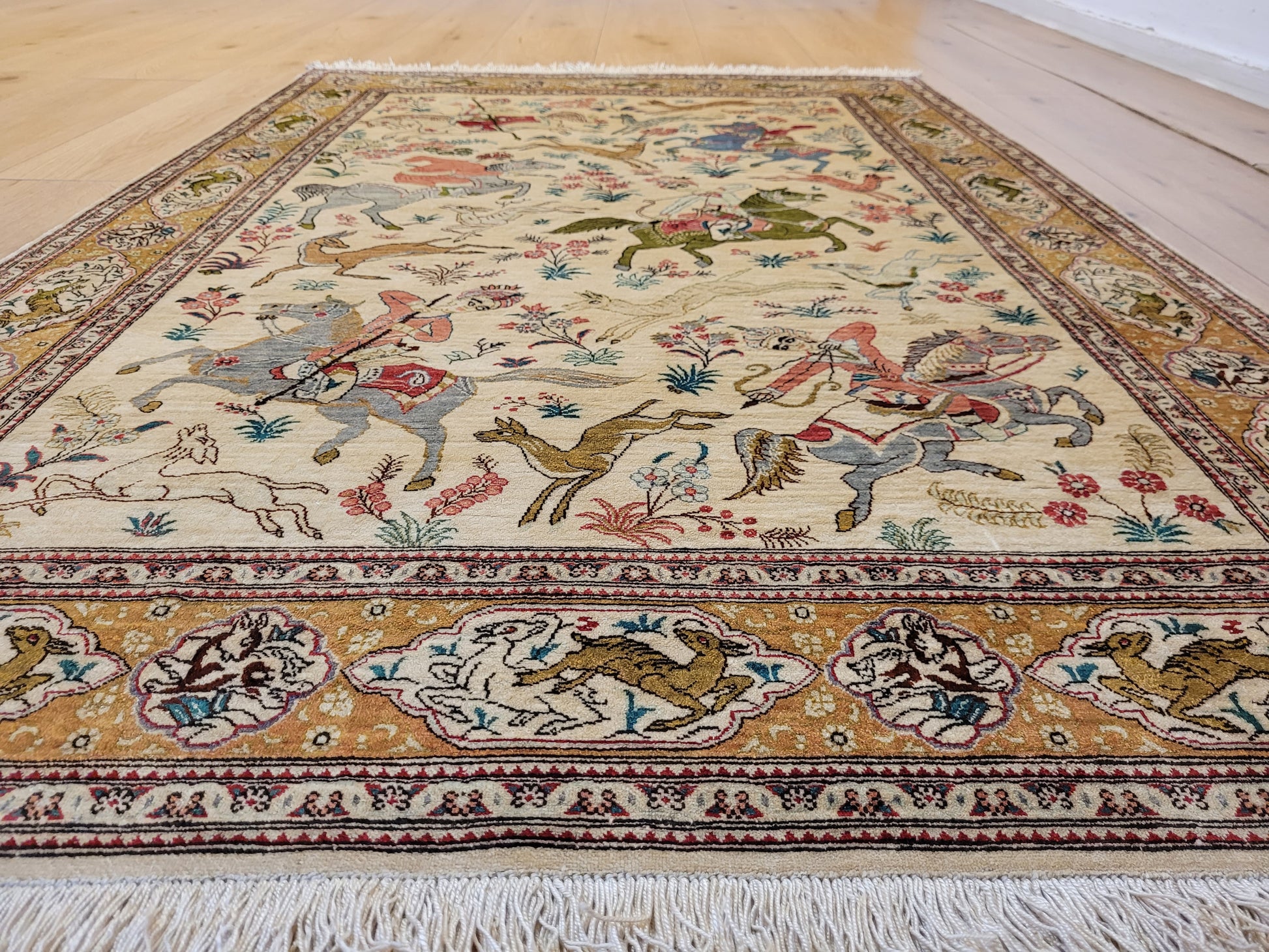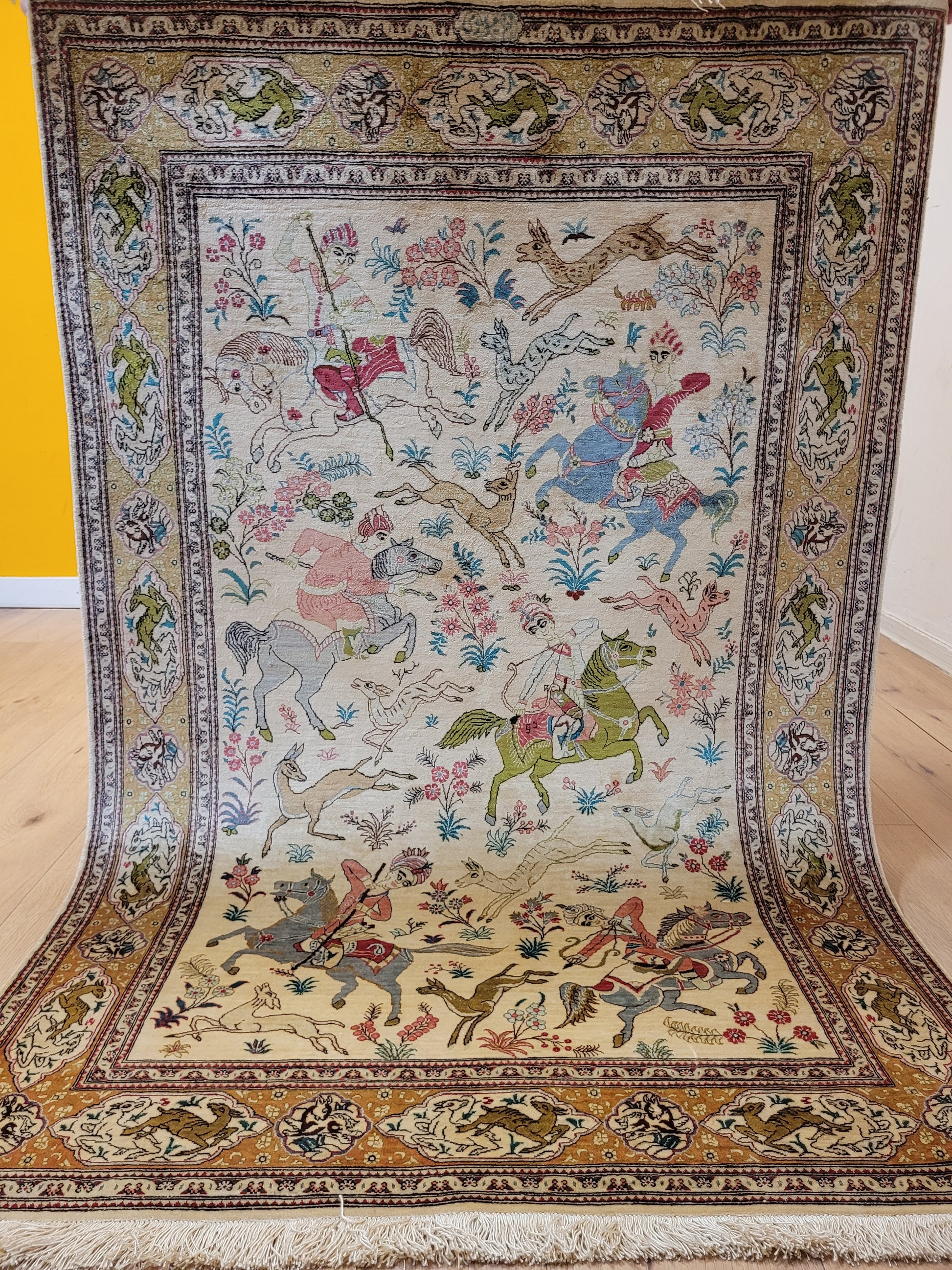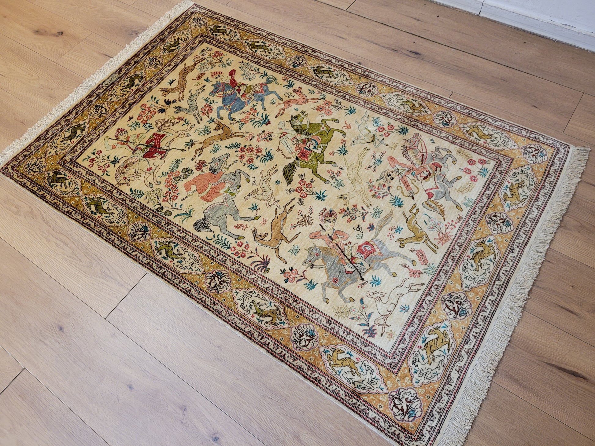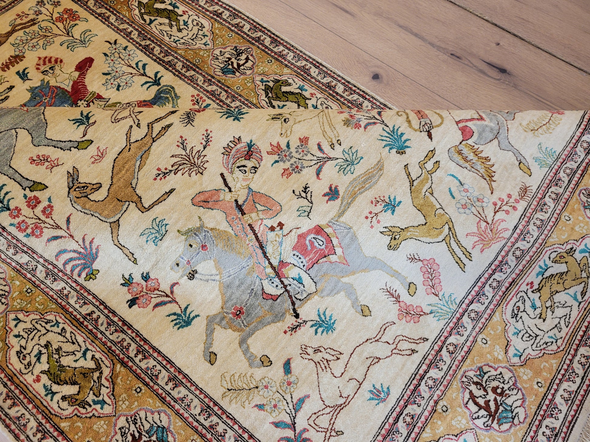 Ghom Seide auf Seide Teppich Jagdszene figürlich fein signiert