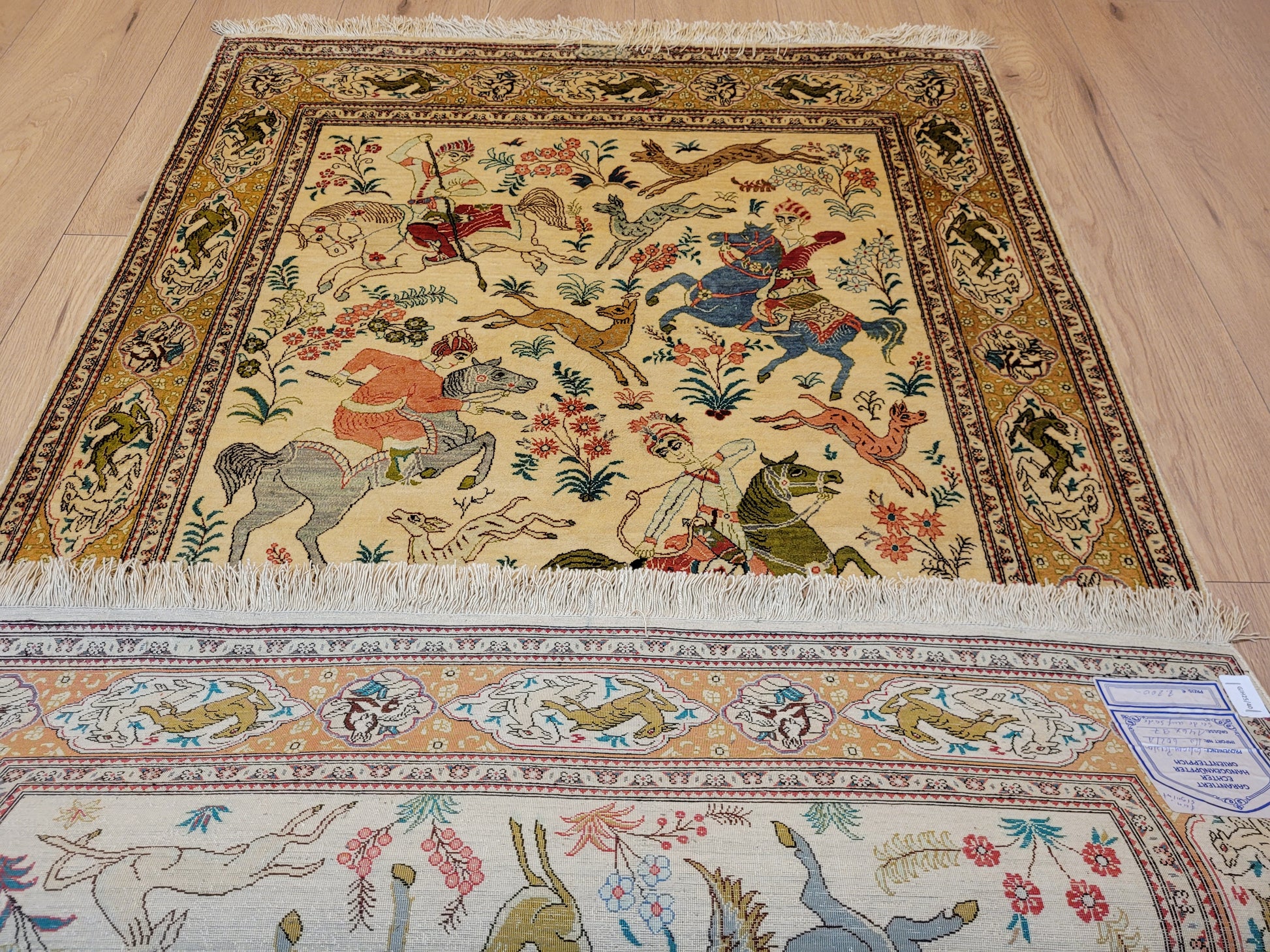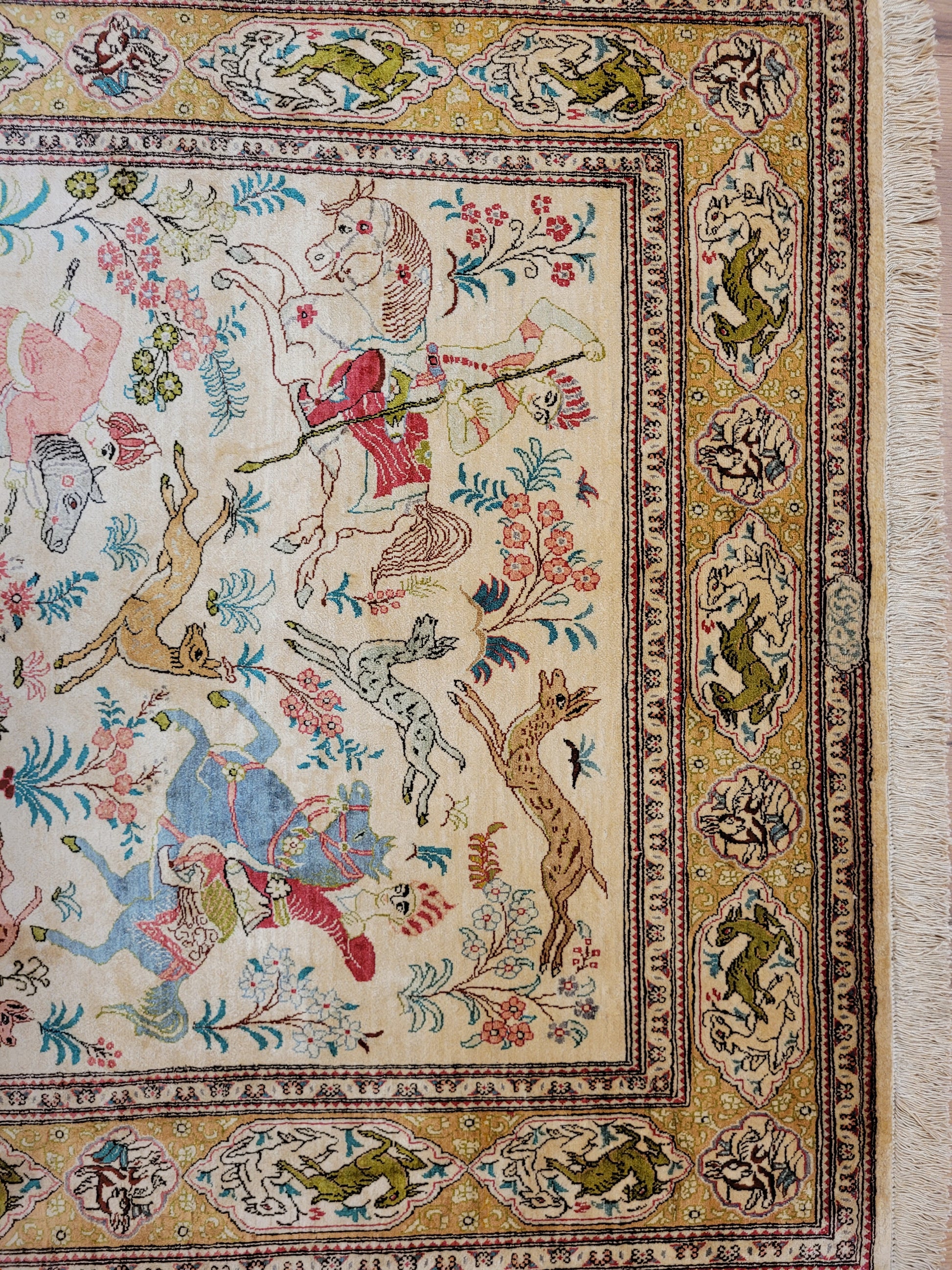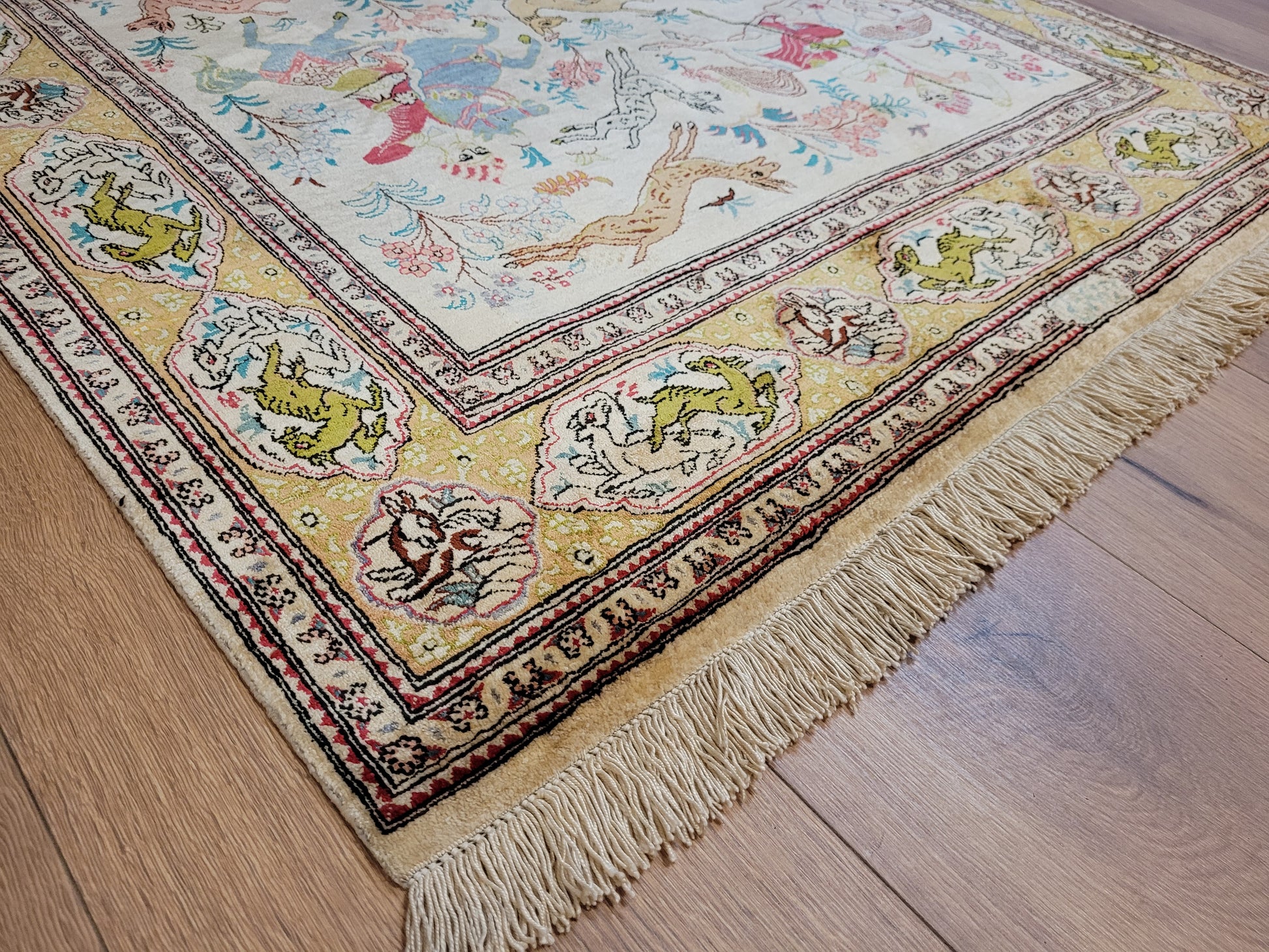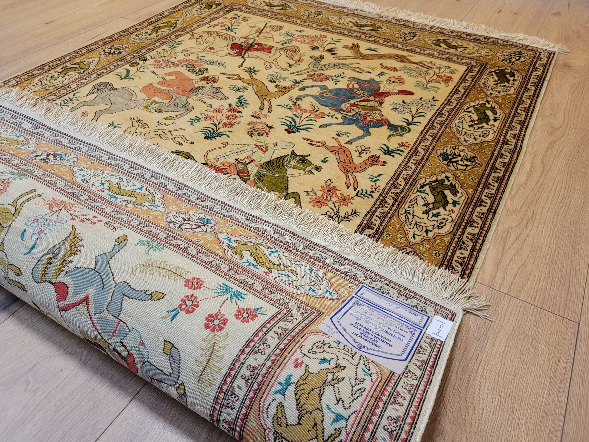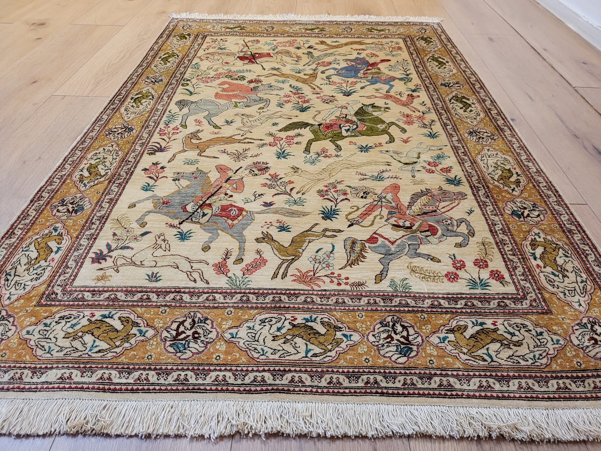 Ghom Seide auf Seide Teppich Jagdszene figürlich fein signiert