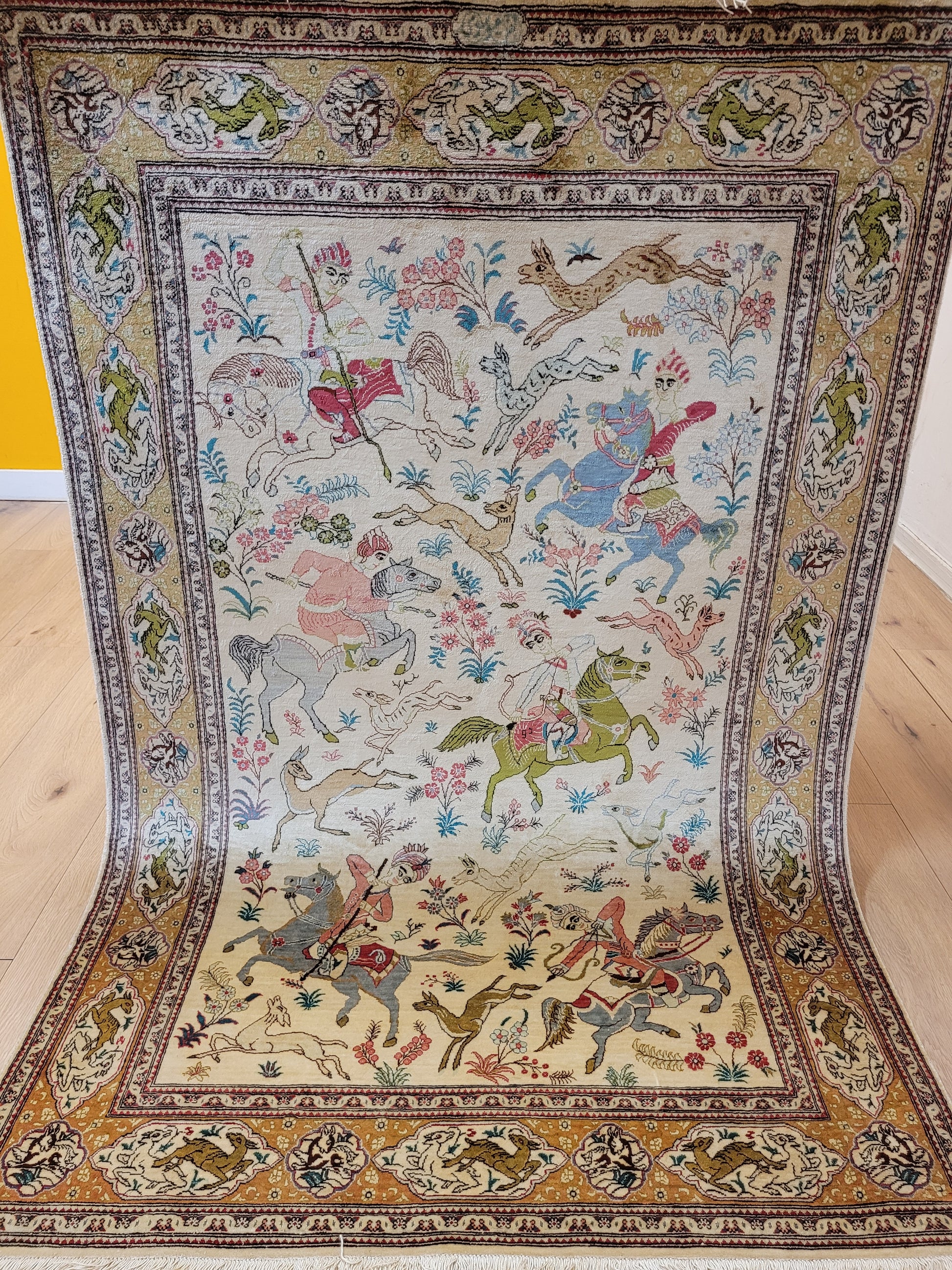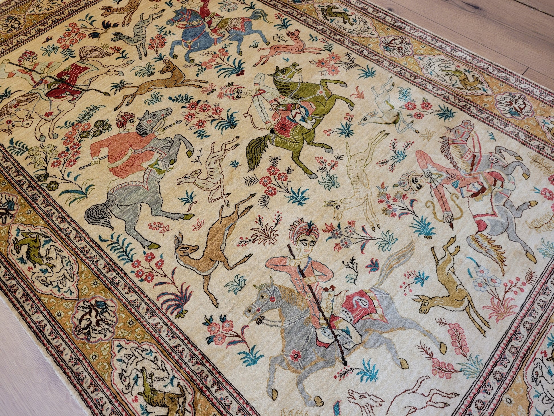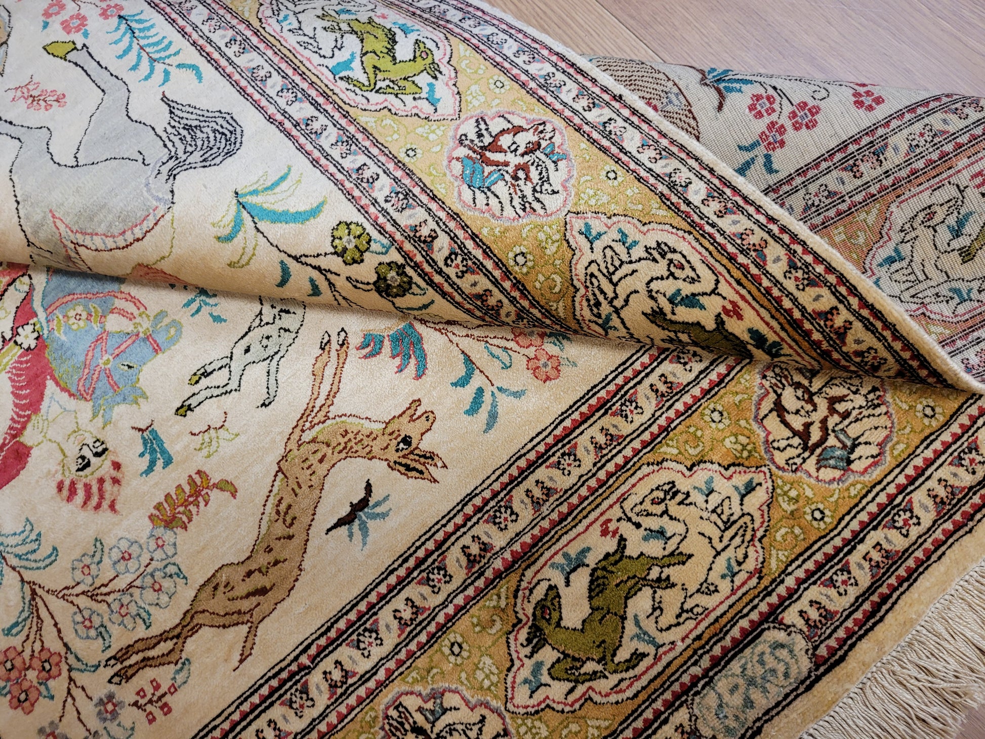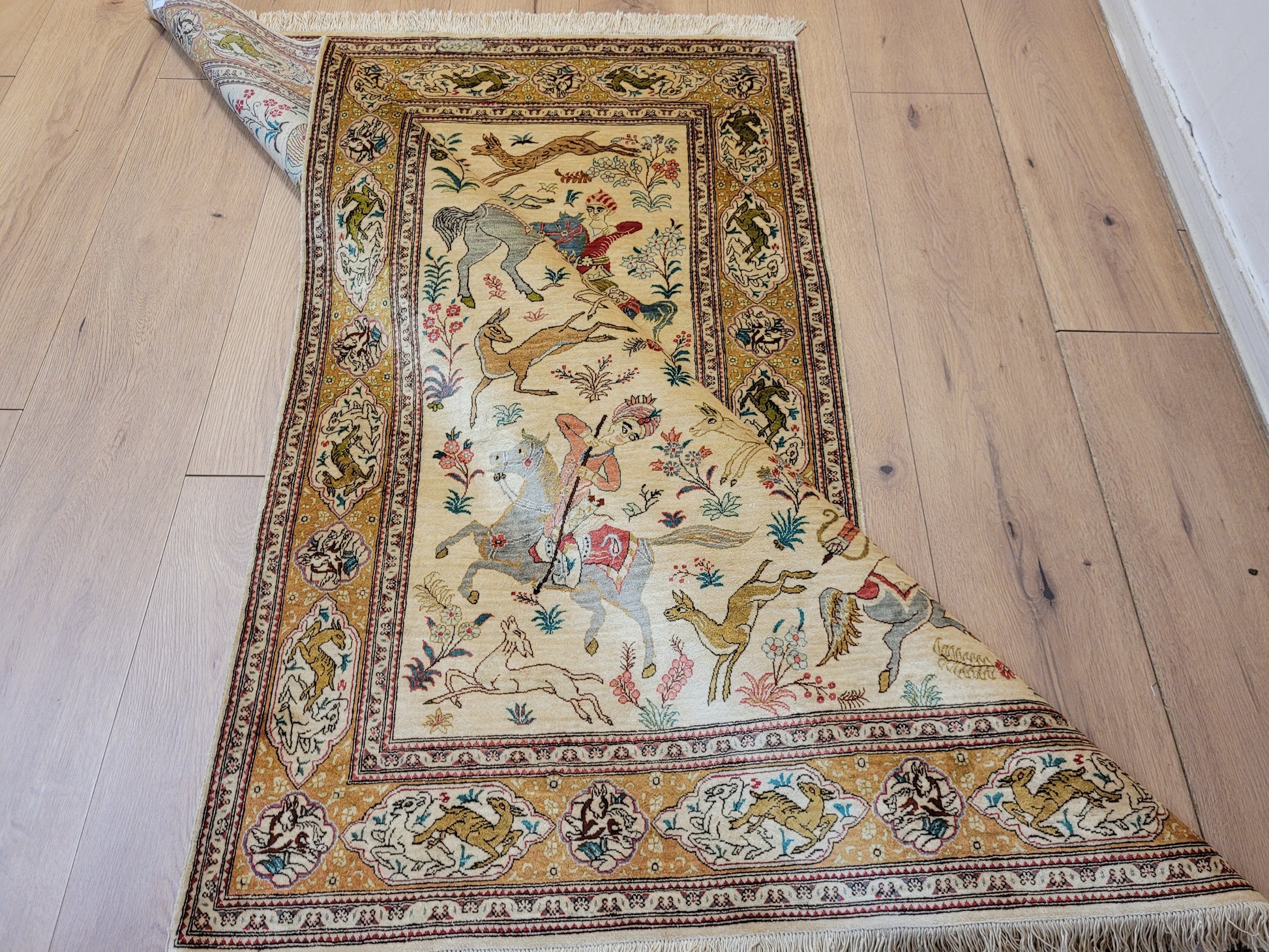 Ghom Seide auf Seide Teppich Jagdszene figürlich fein signiert