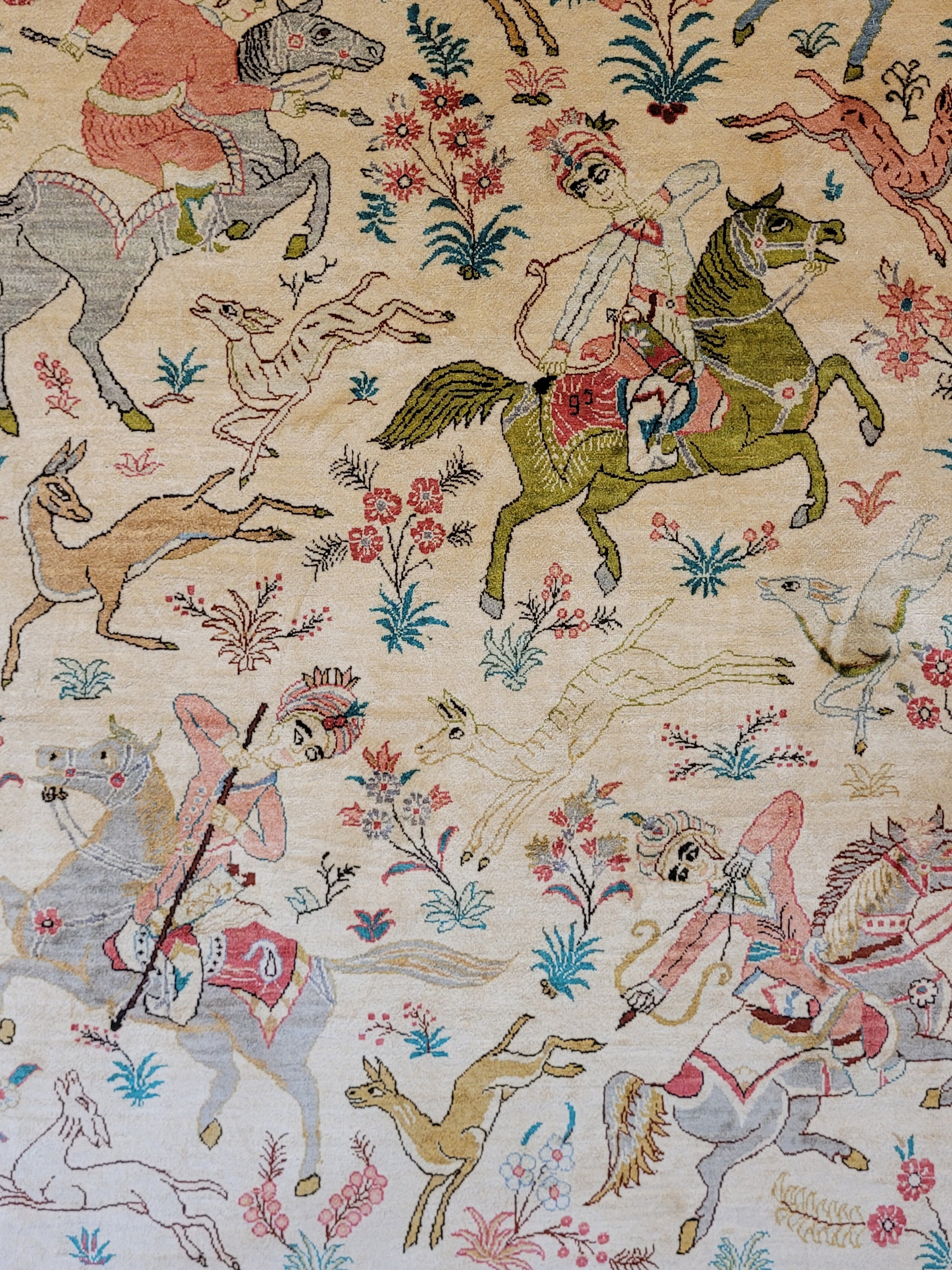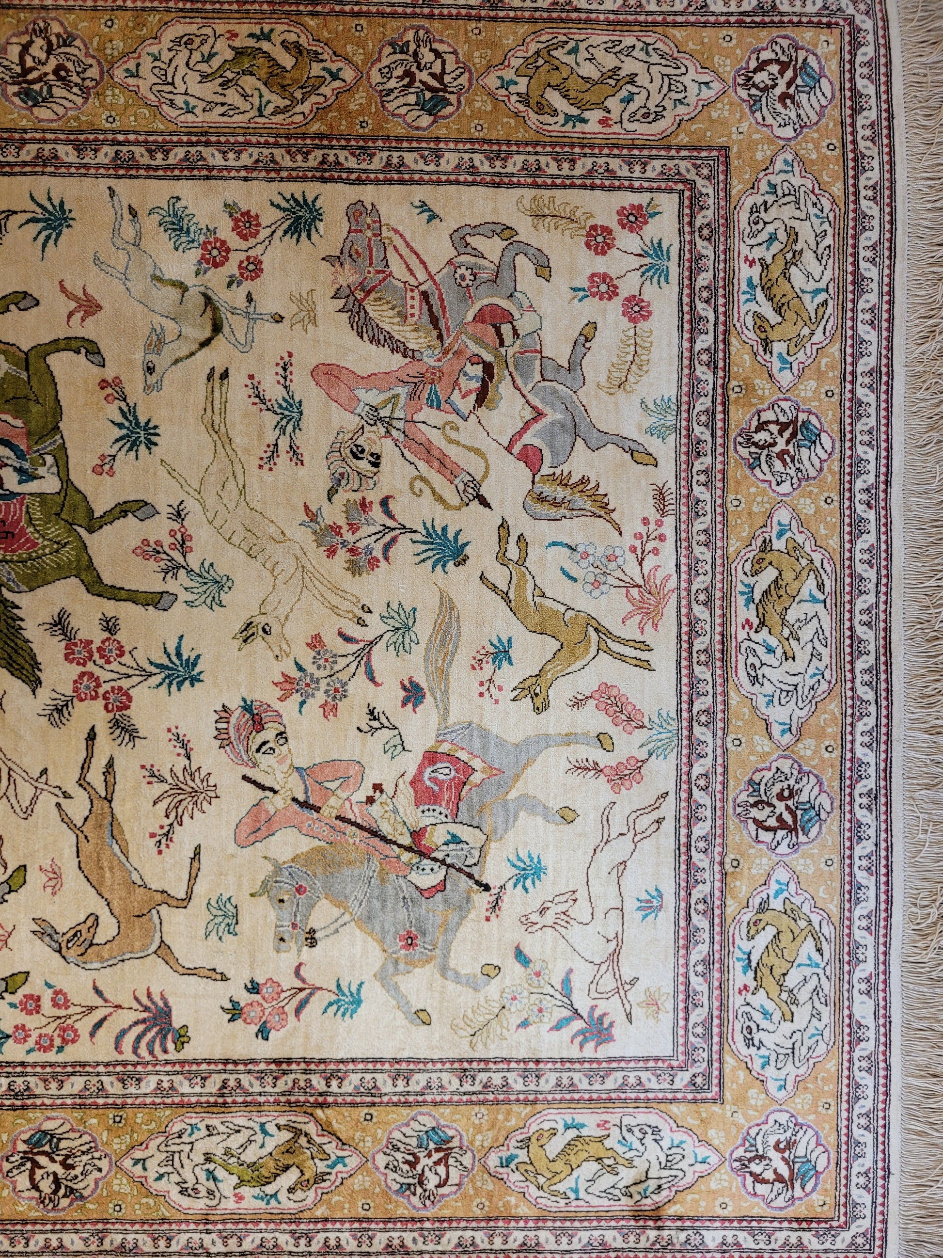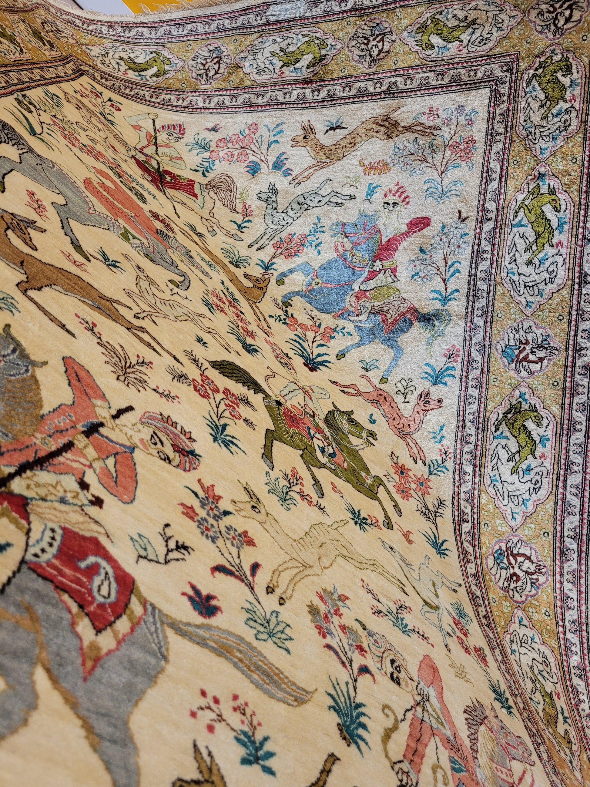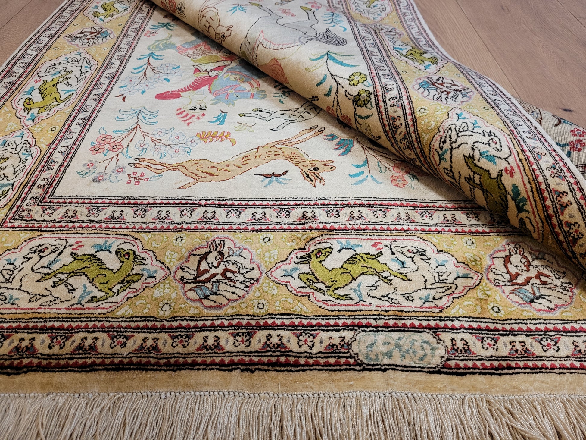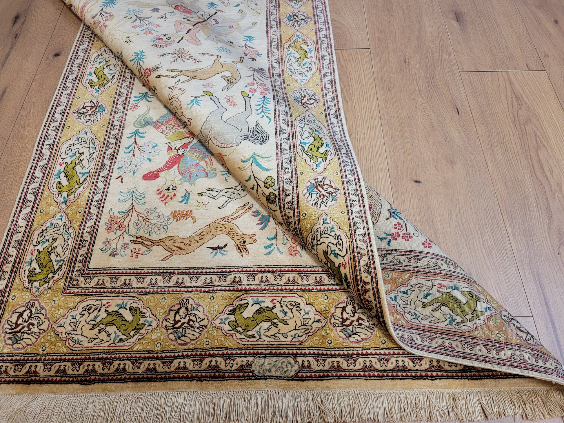 Ghom Seide auf Seide Teppich Jagdszene figürlich fein signiert