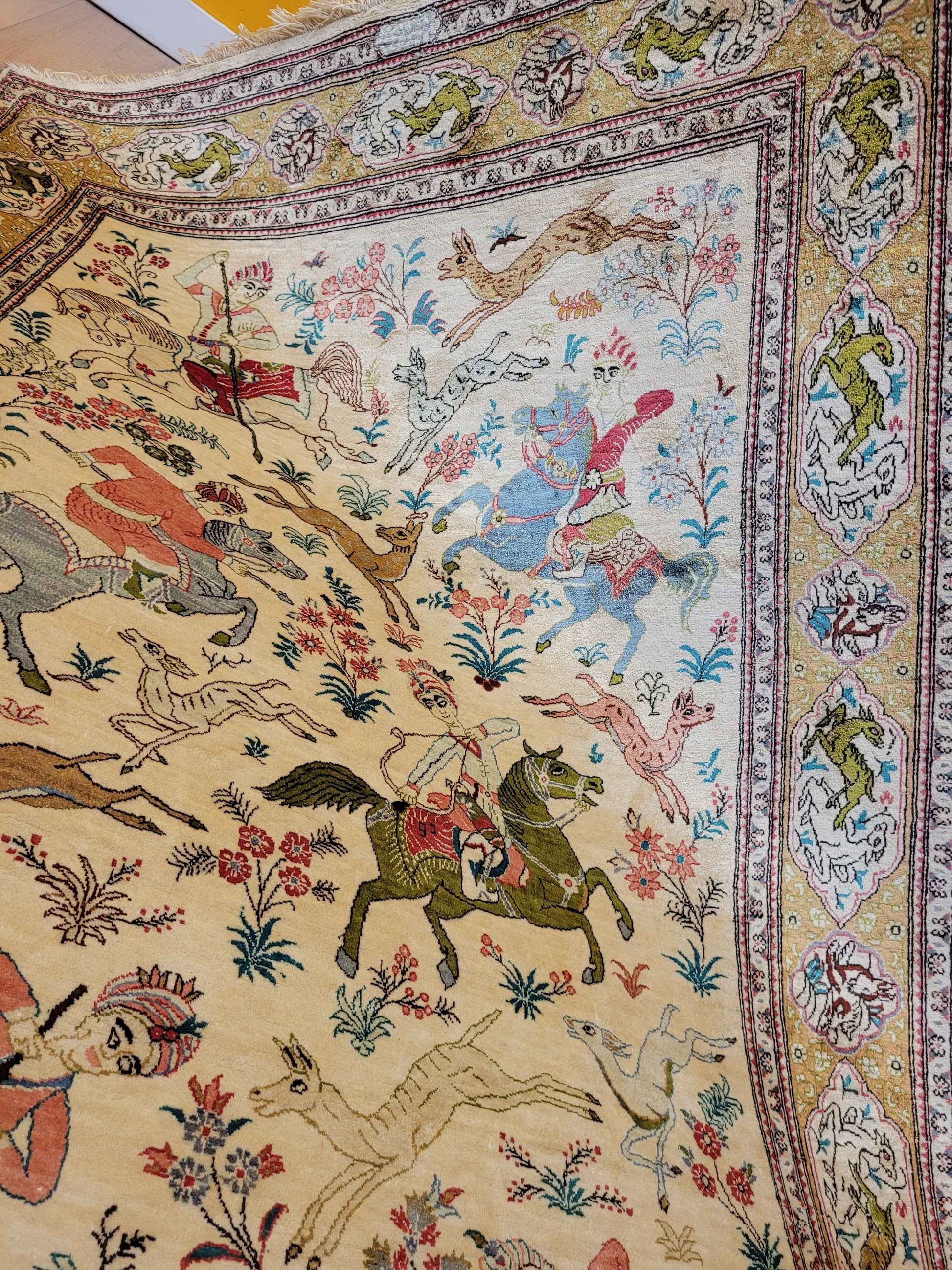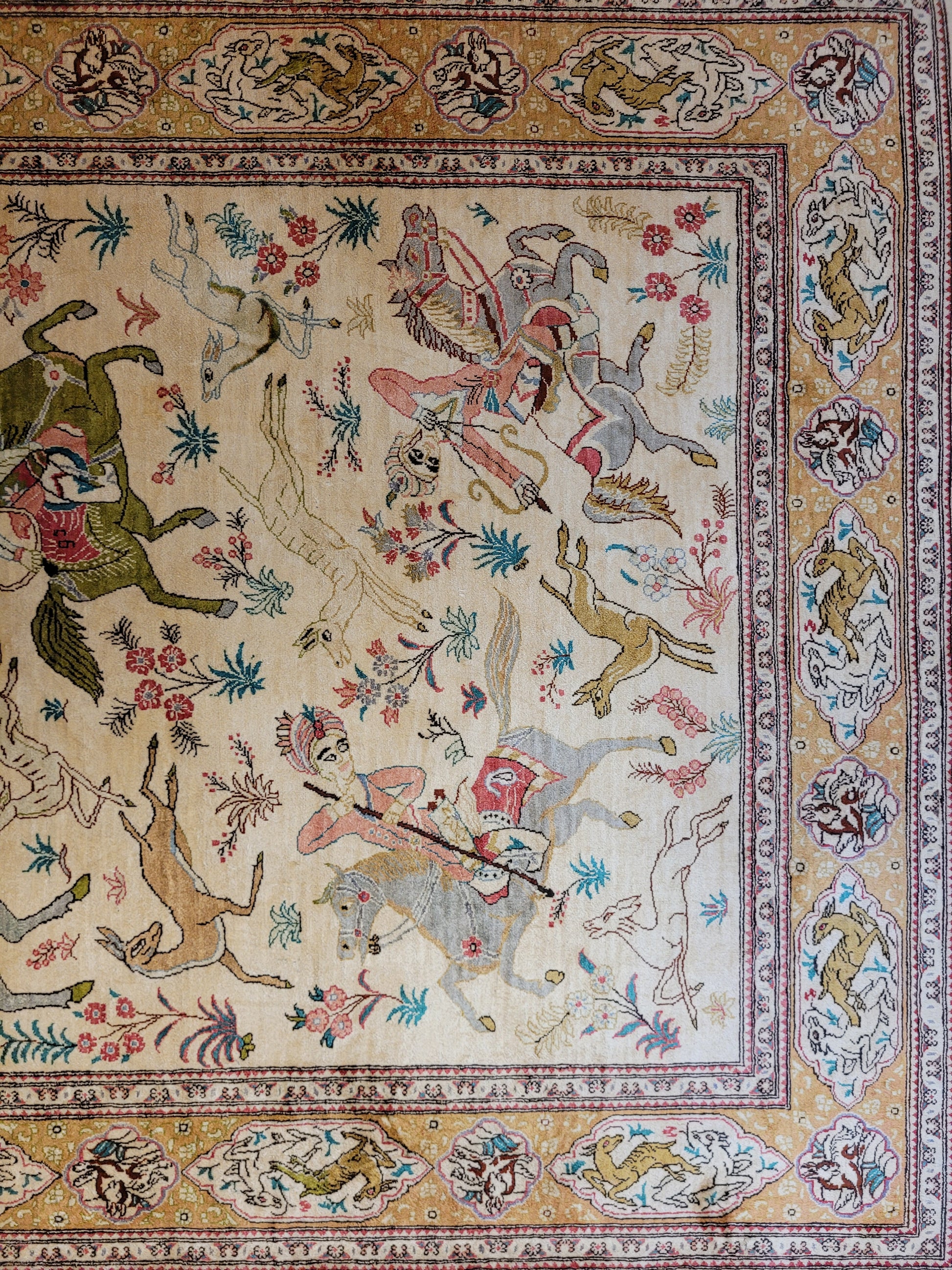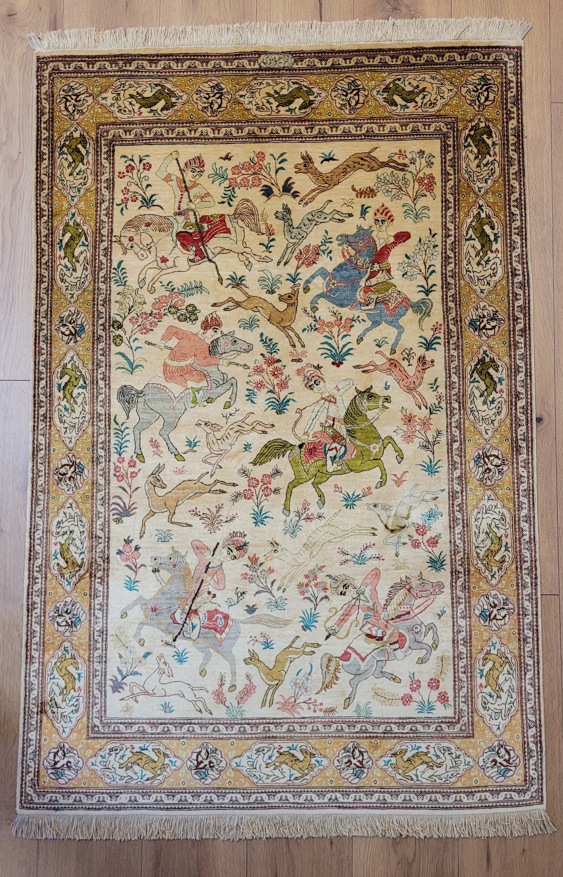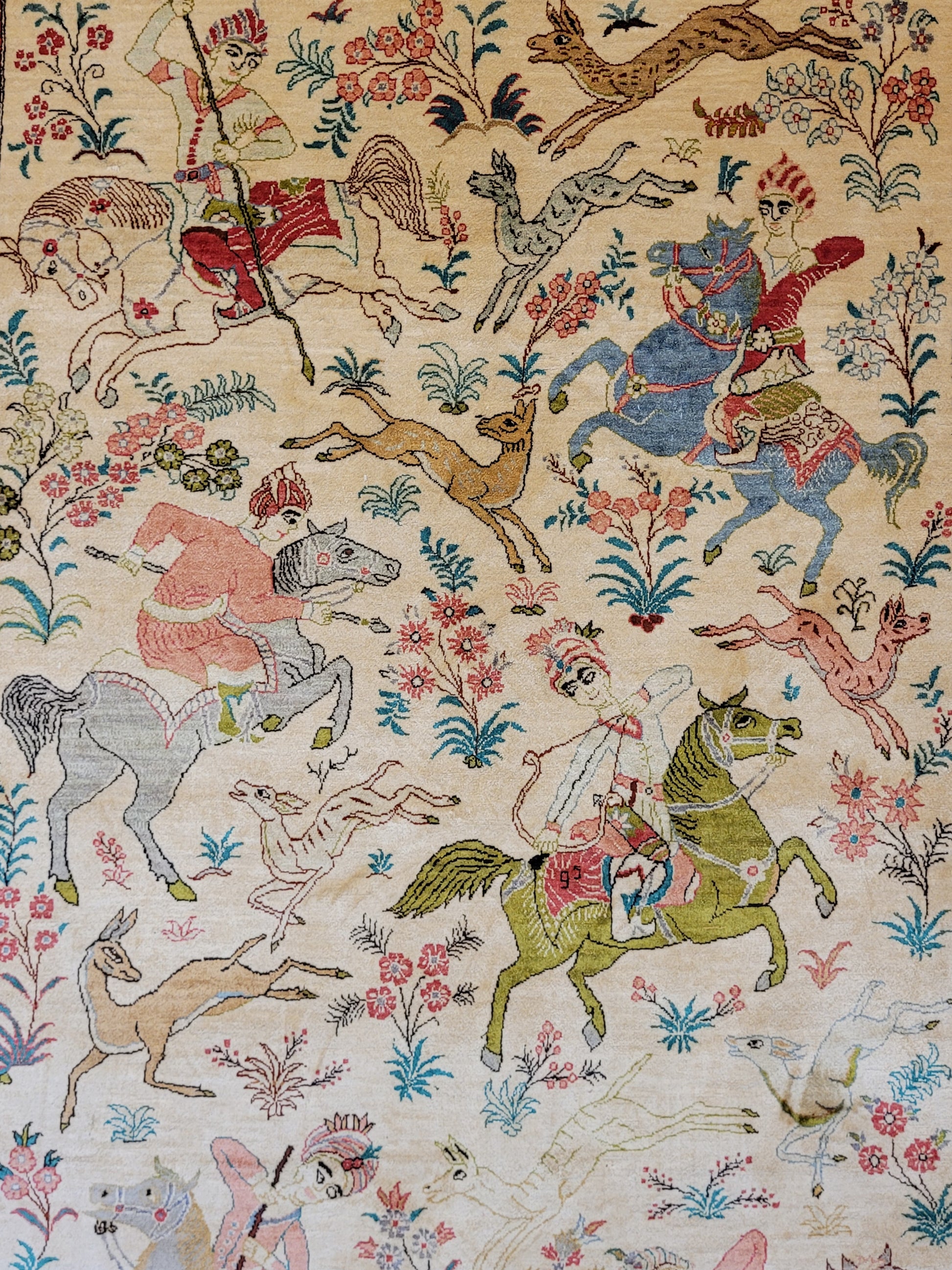 Ghom Seide auf Seide Teppich Jagdszene figürlich fein signiert