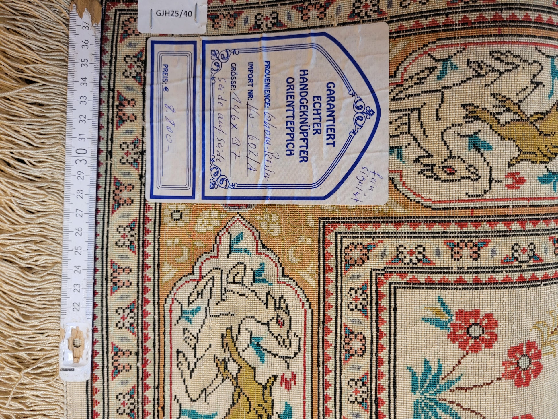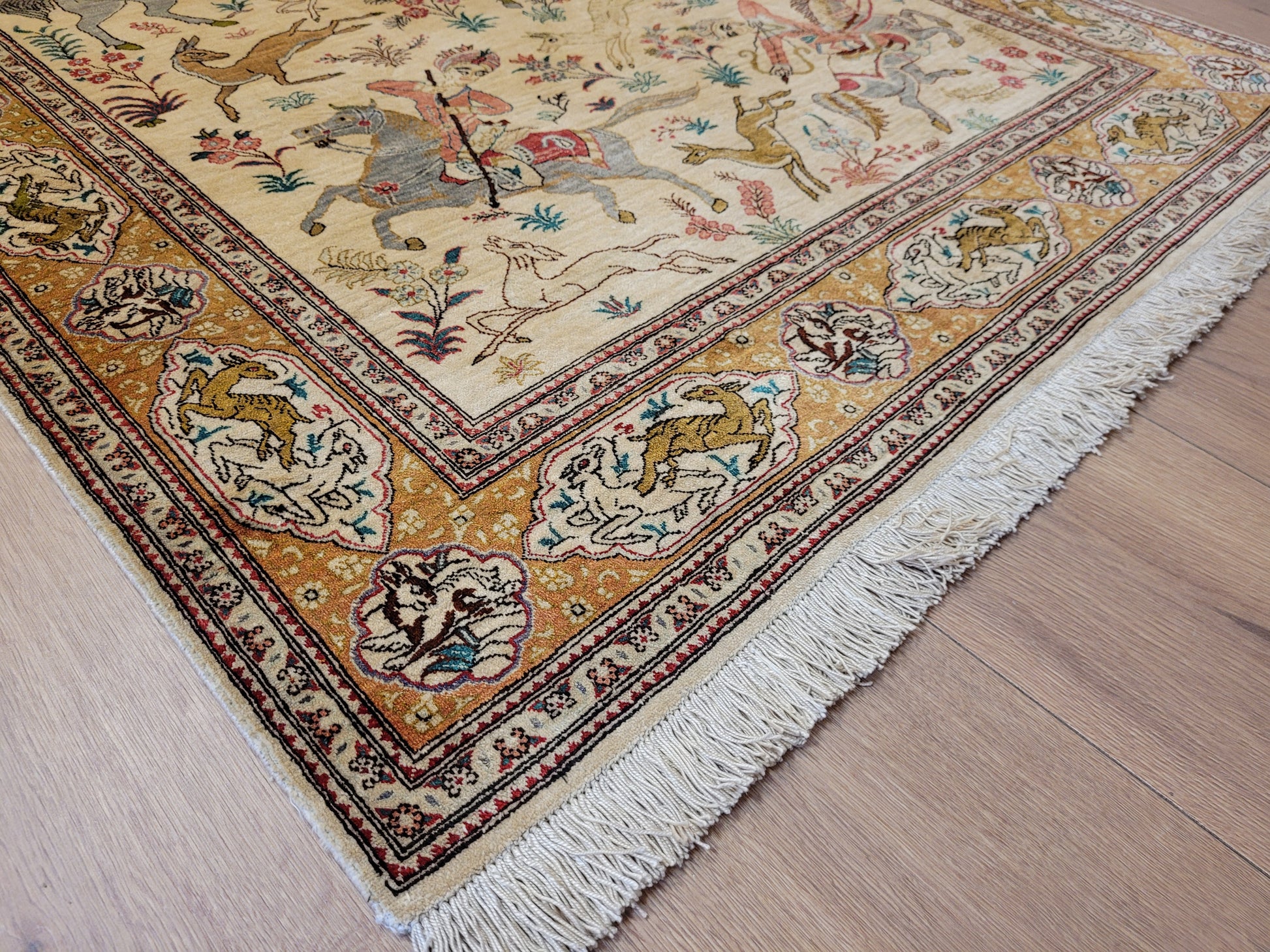 angeboten wird ein edler Ghom Seidenteppich, handgeknüpft auf feiner Seidenkette in detailreicher Ausführung. Das Hauptmotiv zeigt eine dynamische Jagdszene mit Reitern auf kunstvoll geschmückten Pferden, Jagdhunden und Gazellen in Bewegung, eingebettet in eine blühende Landschaft mit Blumen und Sträuchern. Die Bordüre ist reich verziert mit figürlichen Kartuschen und Tierdarstellungen, die den Teppich zu einem besonders ausdrucksstarken Kunstwerk machen. Eine feine Signatur des Knüpfmeisters unterstreicht die hohe Qualität und Sammlerwürdigkeit dieses Stücks.