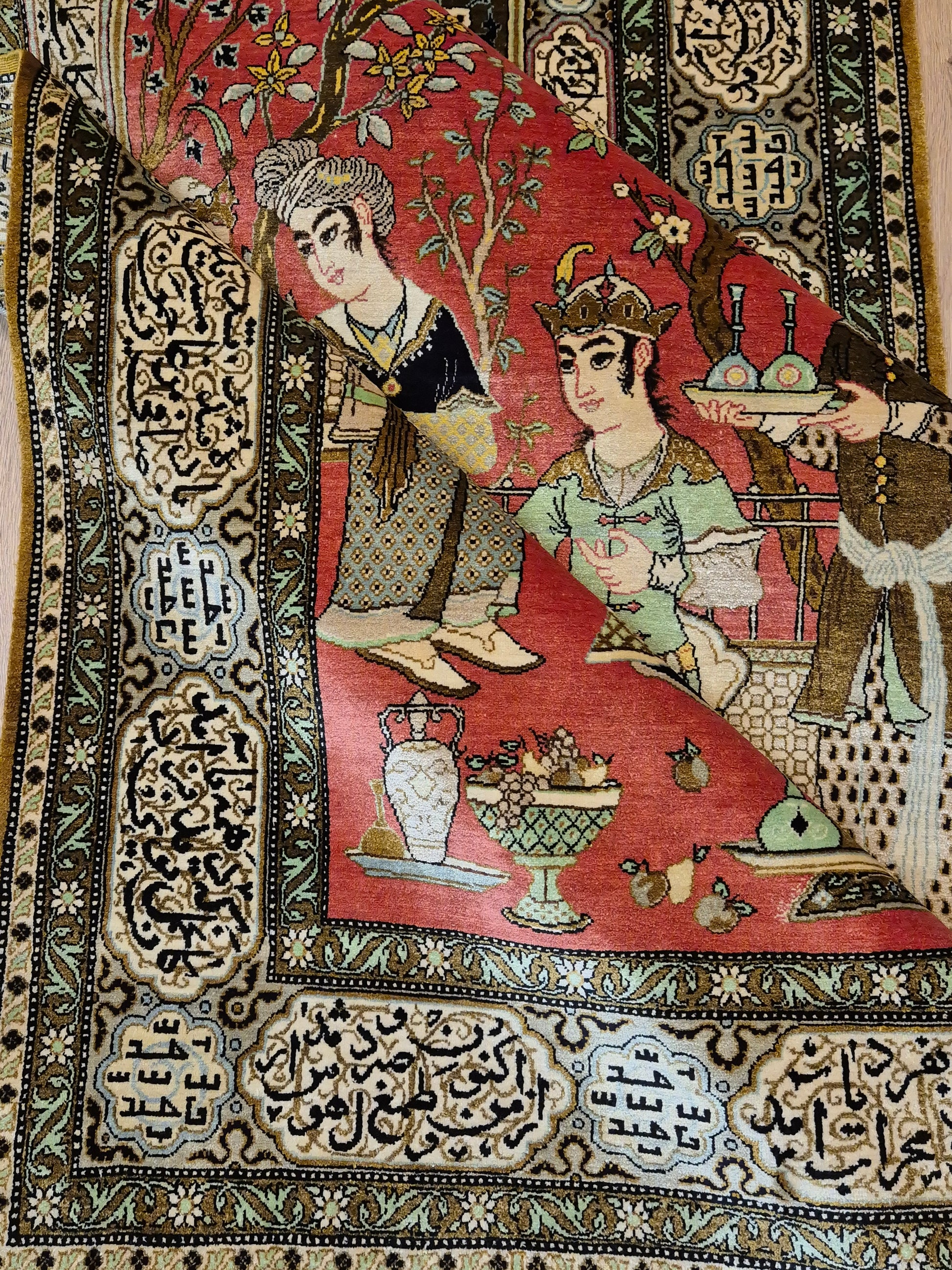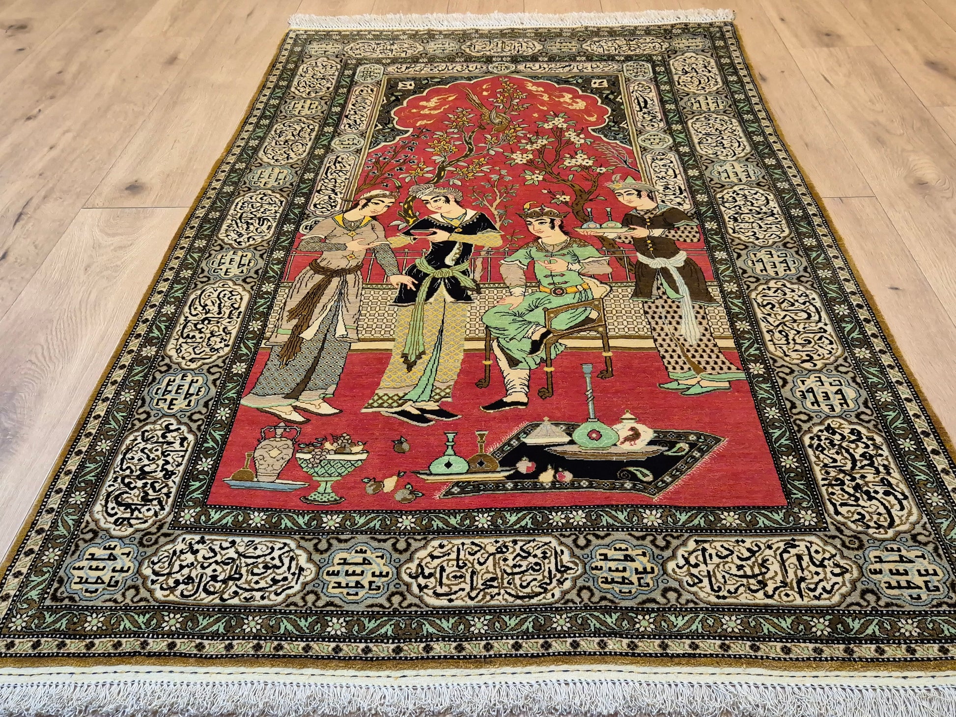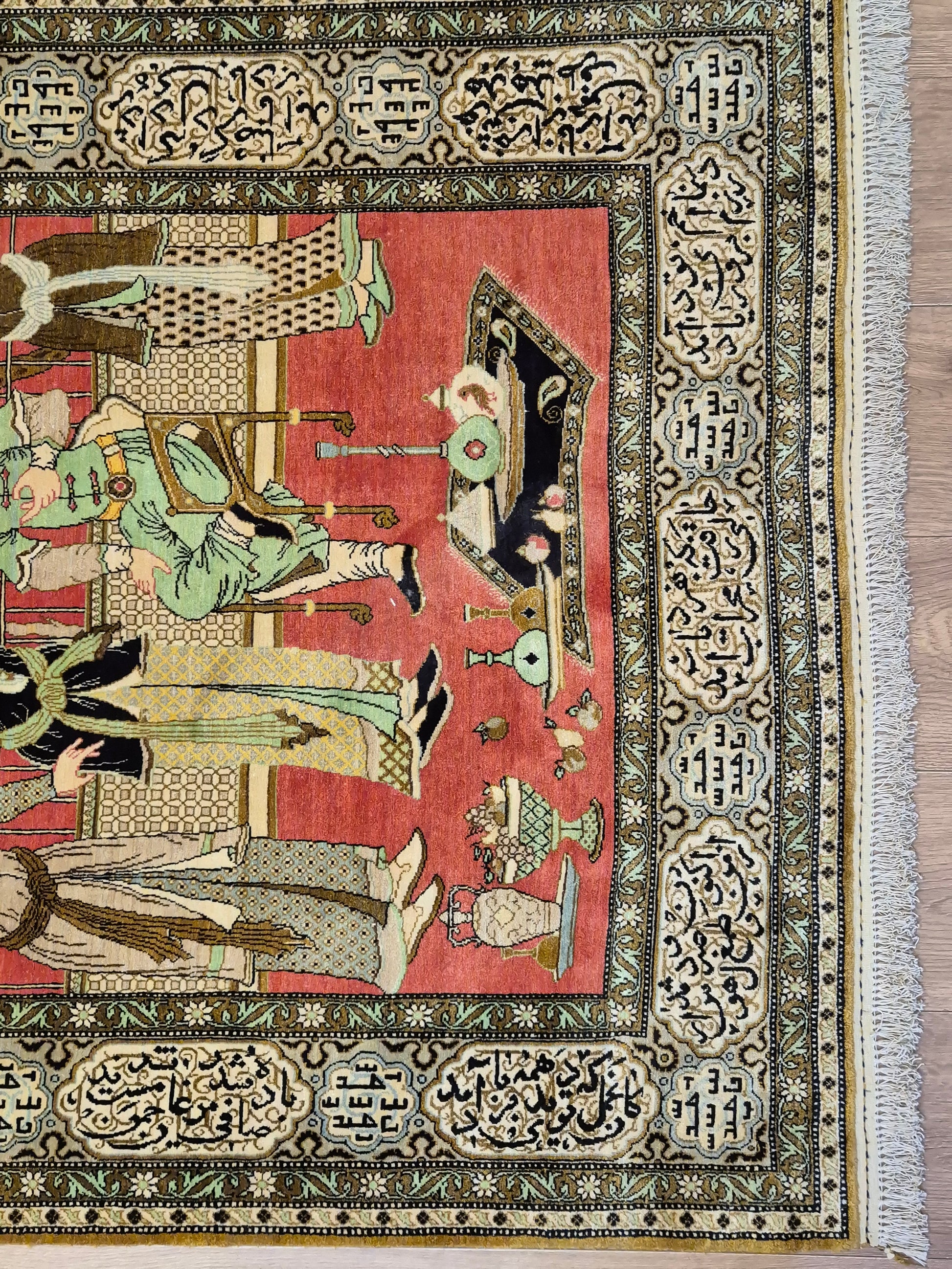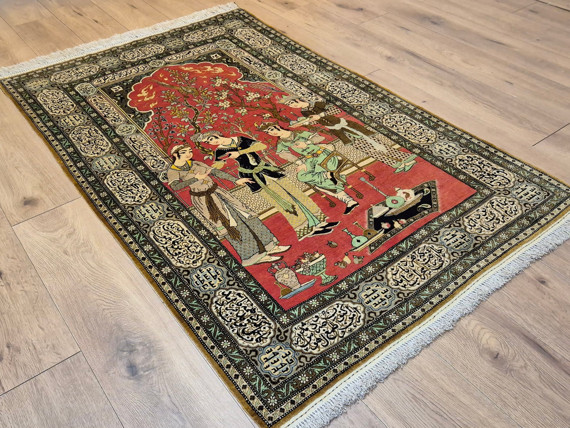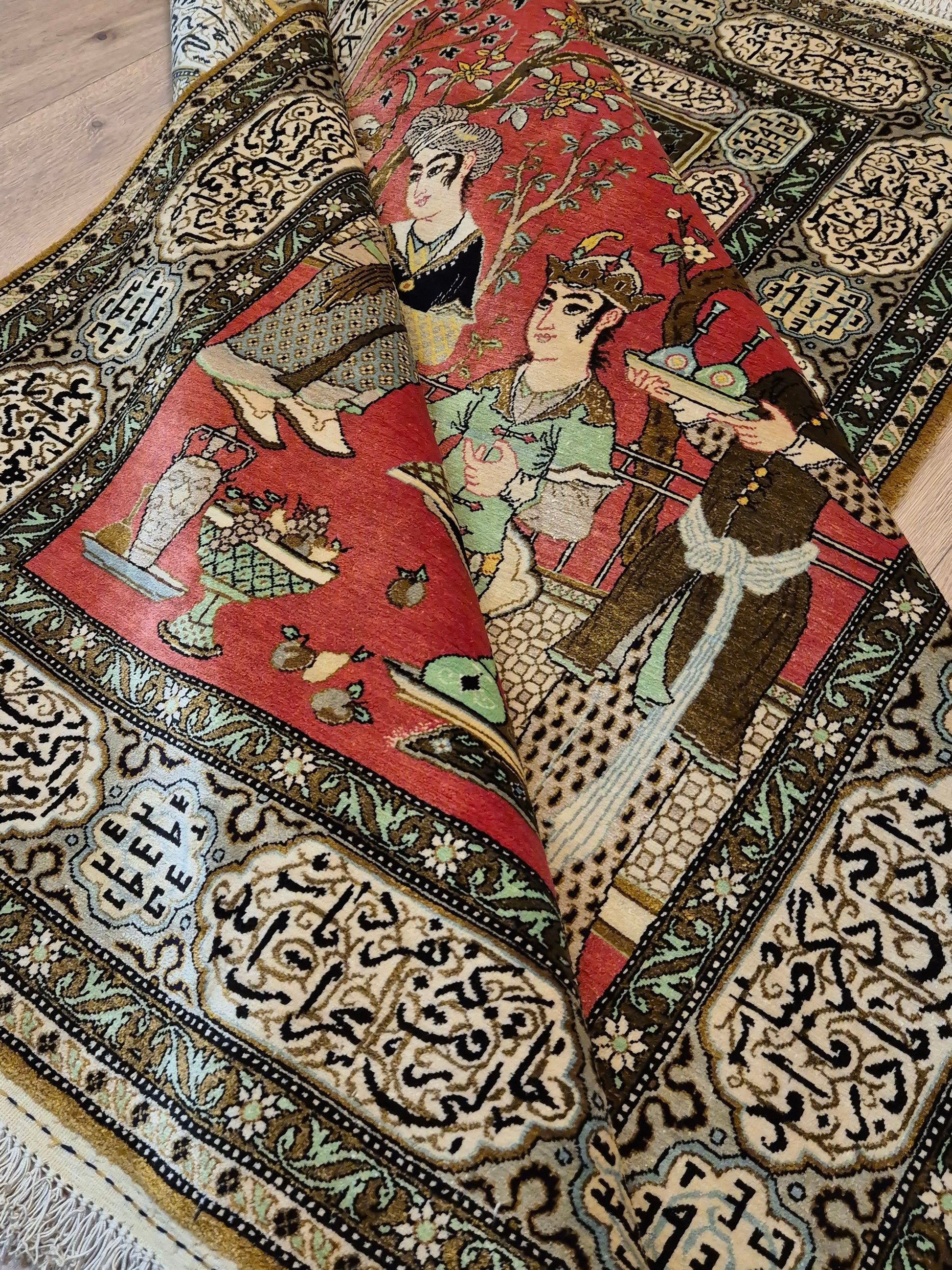 angeboten wird ein edler Ghom Teppich aus 100 % Seide auf Seide, handgeknüpft in feiner Ausführung. Das Motiv zeigt eine figürliche Szene mit vier Personen in kunstvoll gestalteter Hofdarstellung, ergänzt durch florale Details, Gefäße und einen roten Hintergrund mit blühenden Bäumen. Die aufwendig gearbeitete Bordüre ist mit kalligrafischen Schriftzügen und Ornamenten versehen, die diesem Stück eine besonders repräsentative Wirkung verleihen.