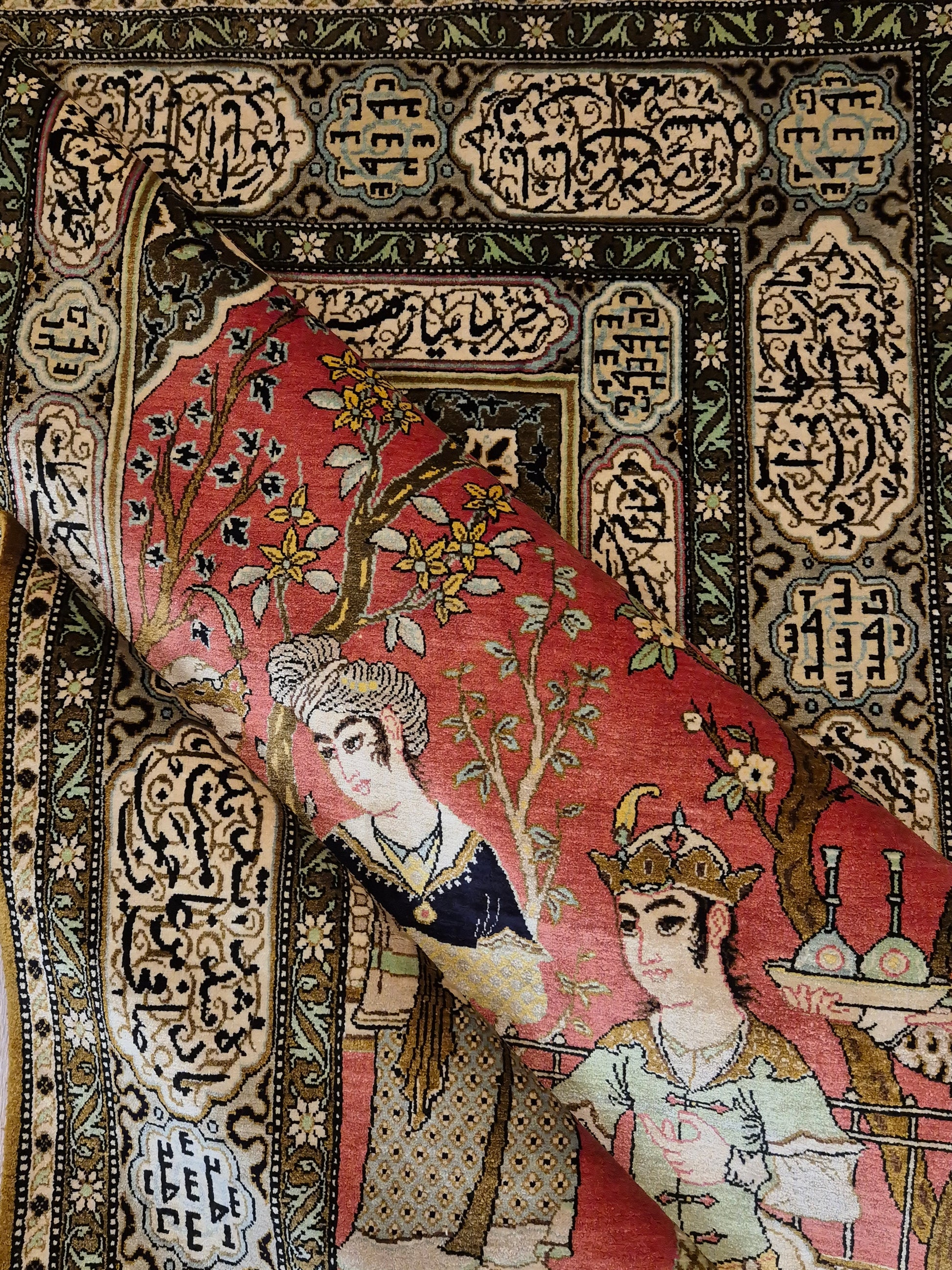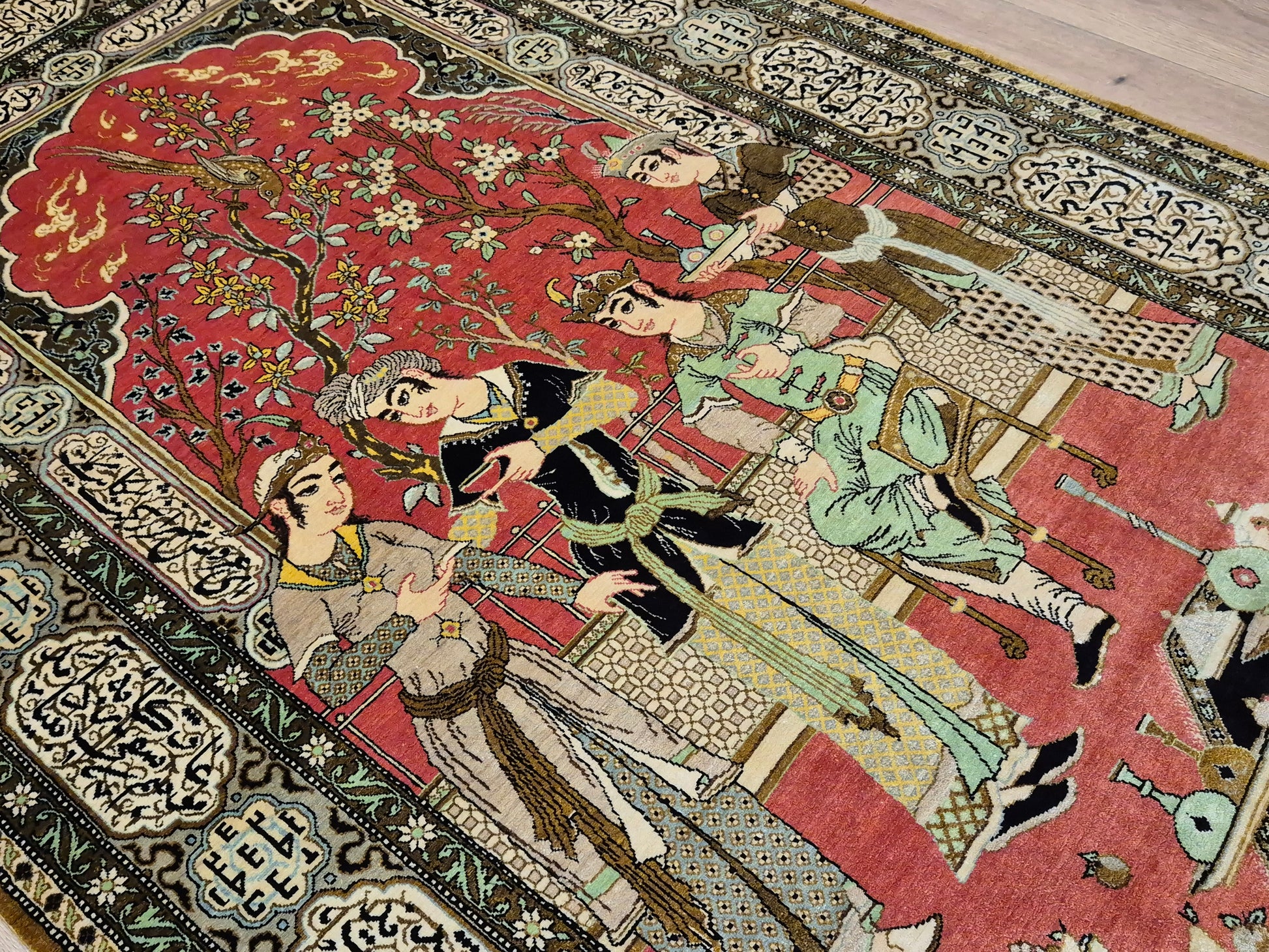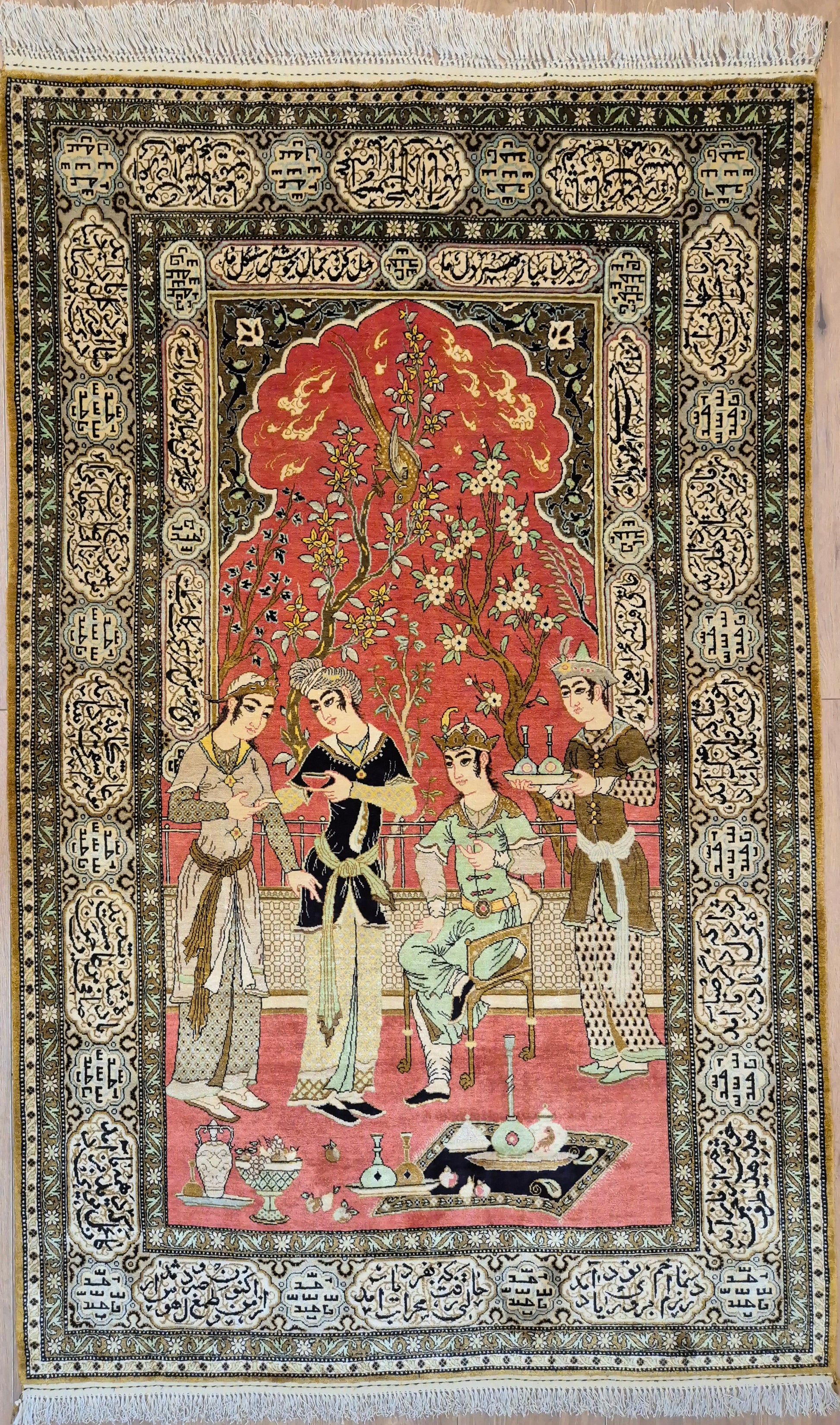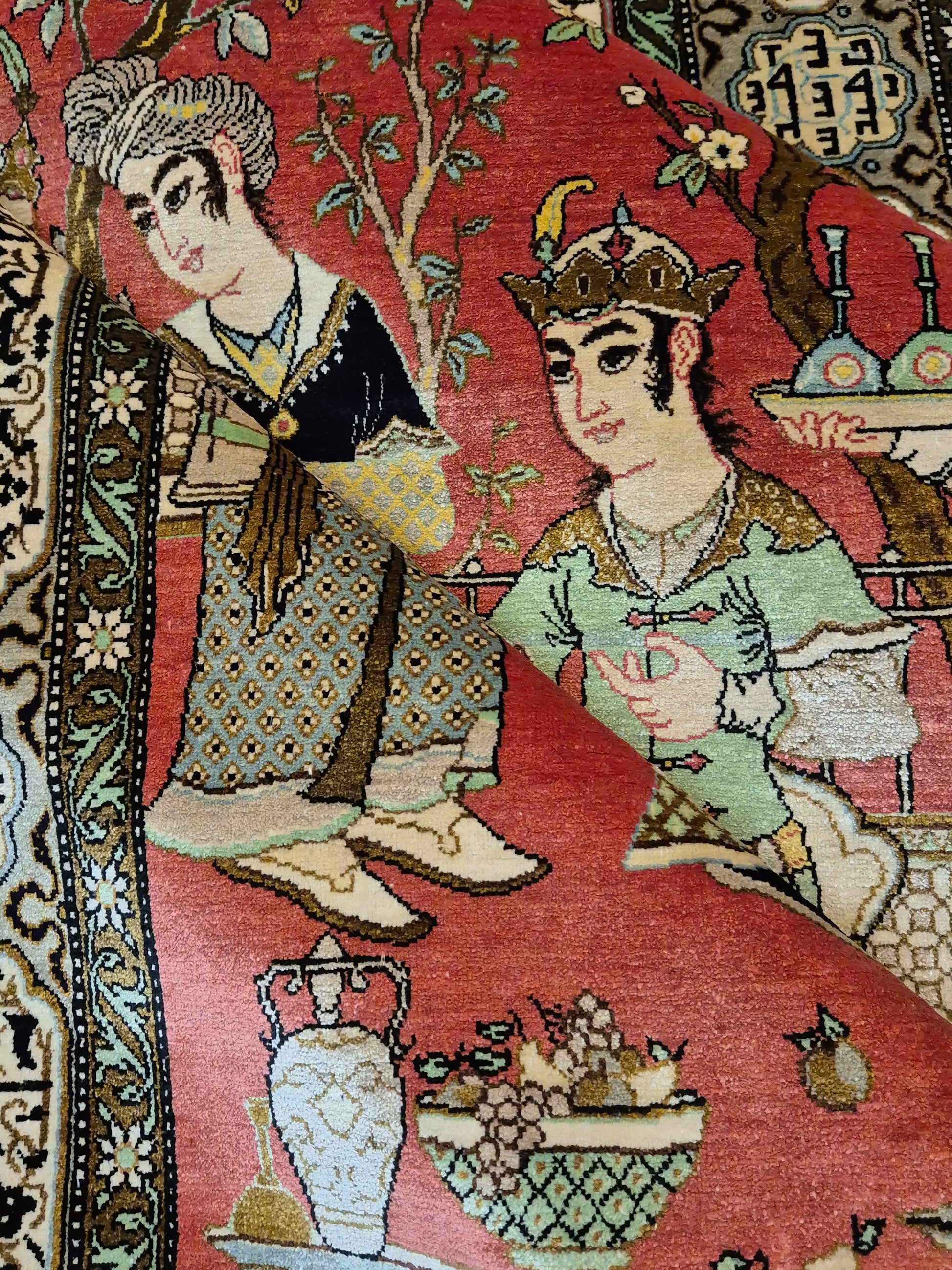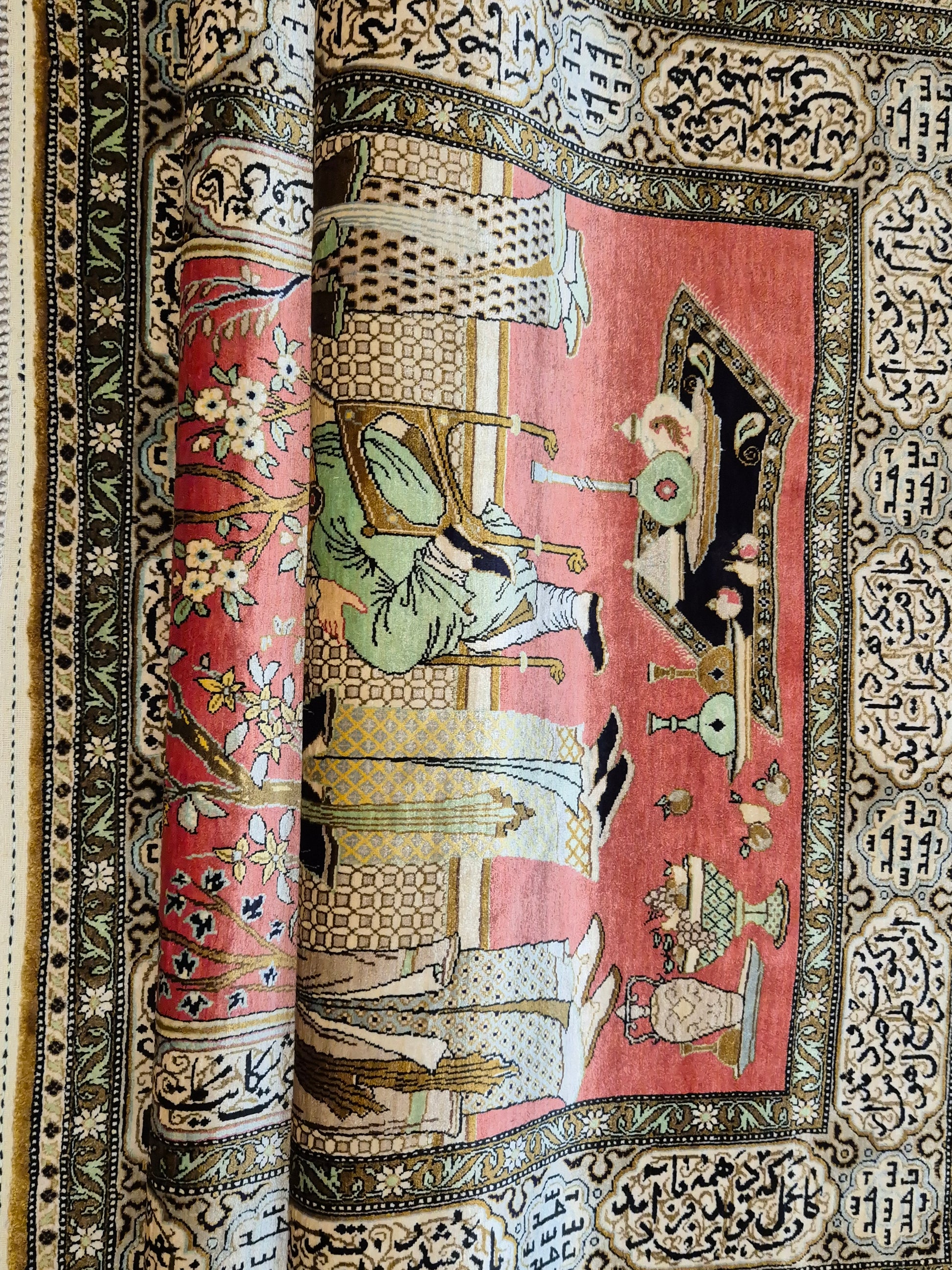 angeboten wird ein edler Ghom Teppich aus 100 % Seide auf Seide, handgeknüpft in feiner Ausführung. Das Motiv zeigt eine figürliche Szene mit vier Personen in kunstvoll gestalteter Hofdarstellung, ergänzt durch florale Details, Gefäße und einen roten Hintergrund mit blühenden Bäumen. Die aufwendig gearbeitete Bordüre ist mit kalligrafischen Schriftzügen und Ornamenten versehen, die diesem Stück eine besonders repräsentative Wirkung verleihen.