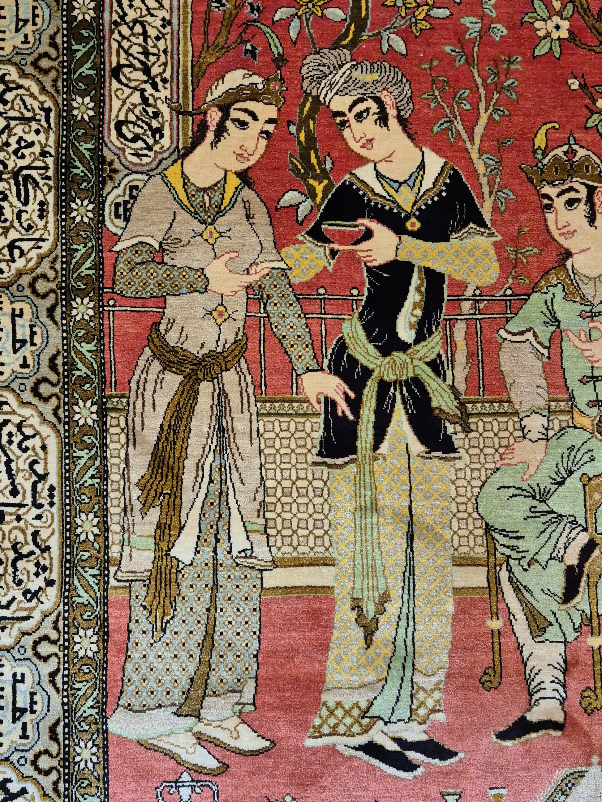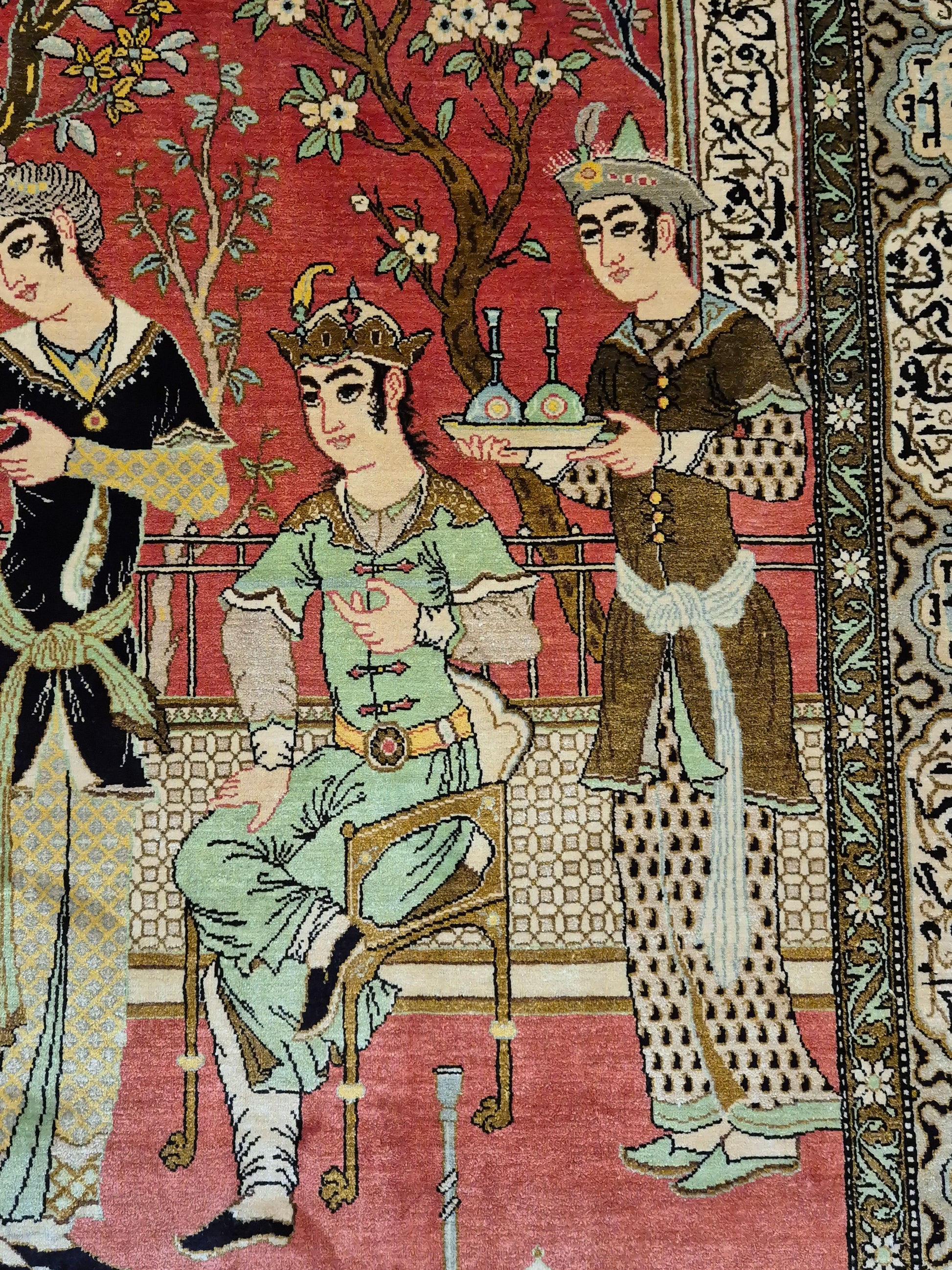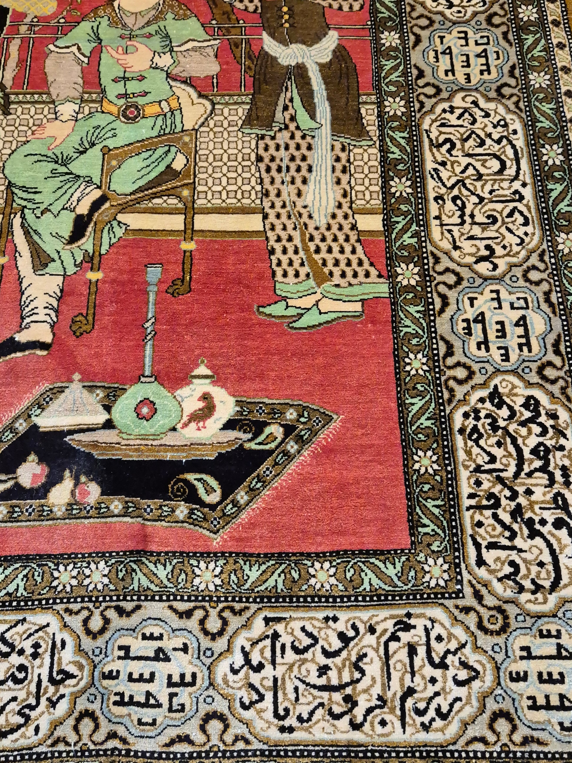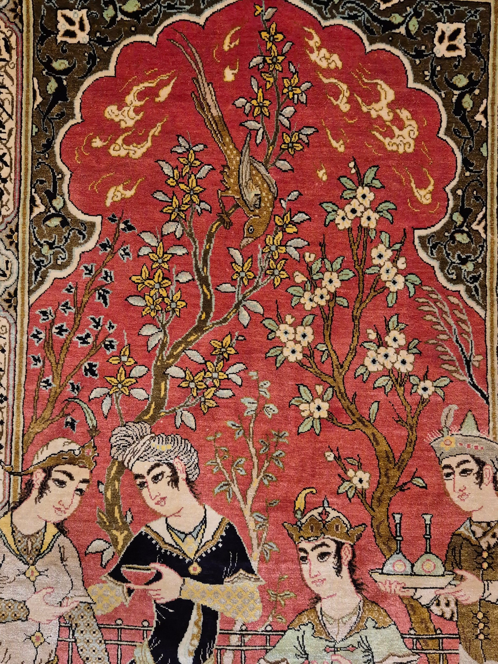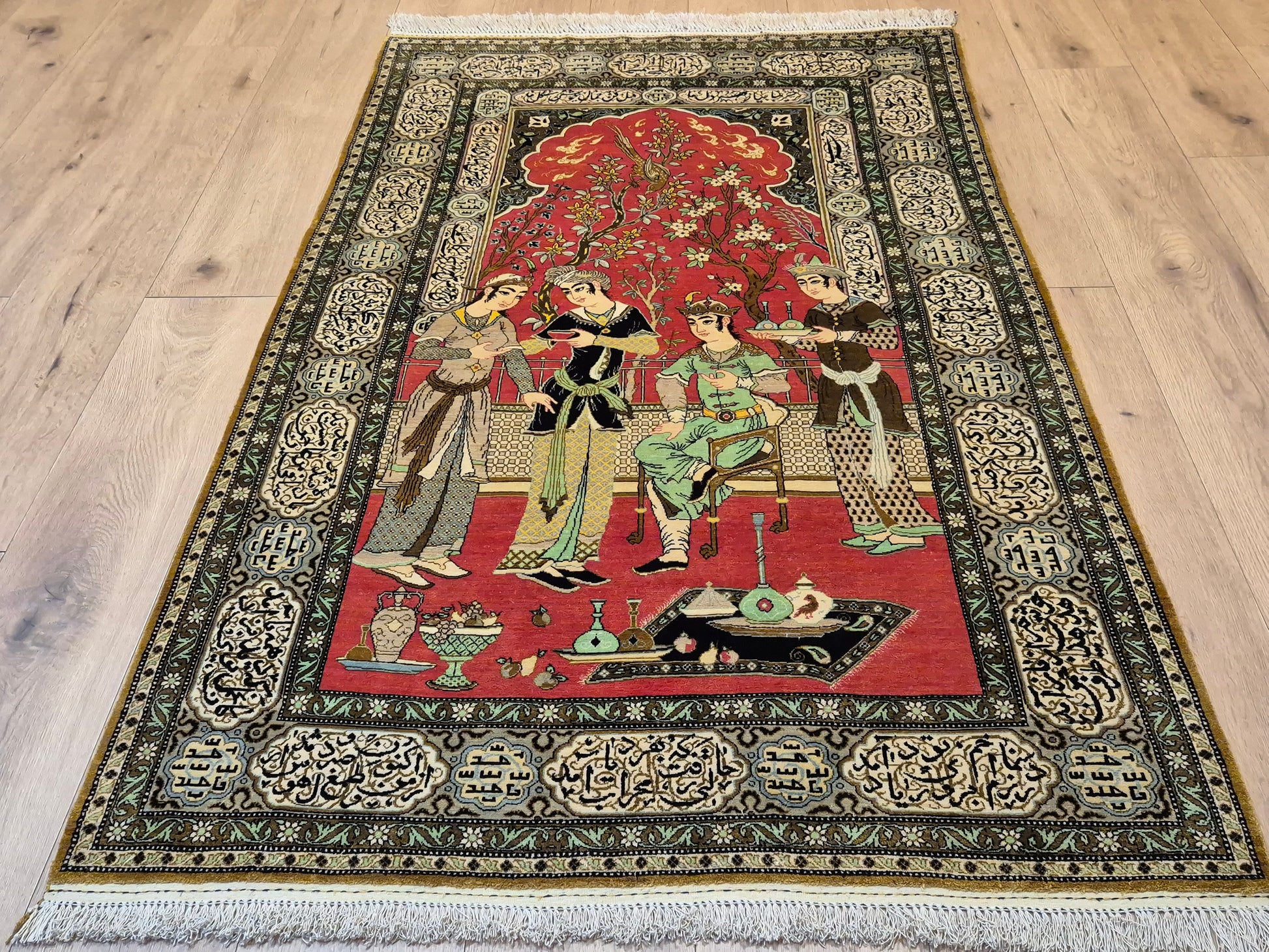angeboten wird ein edler Ghom Teppich aus 100 % Seide auf Seide, handgeknüpft in feiner Ausführung. Das Motiv zeigt eine figürliche Szene mit vier Personen in kunstvoll gestalteter Hofdarstellung, ergänzt durch florale Details, Gefäße und einen roten Hintergrund mit blühenden Bäumen. Die aufwendig gearbeitete Bordüre ist mit kalligrafischen Schriftzügen und Ornamenten versehen, die diesem Stück eine besonders repräsentative Wirkung verleihen.
