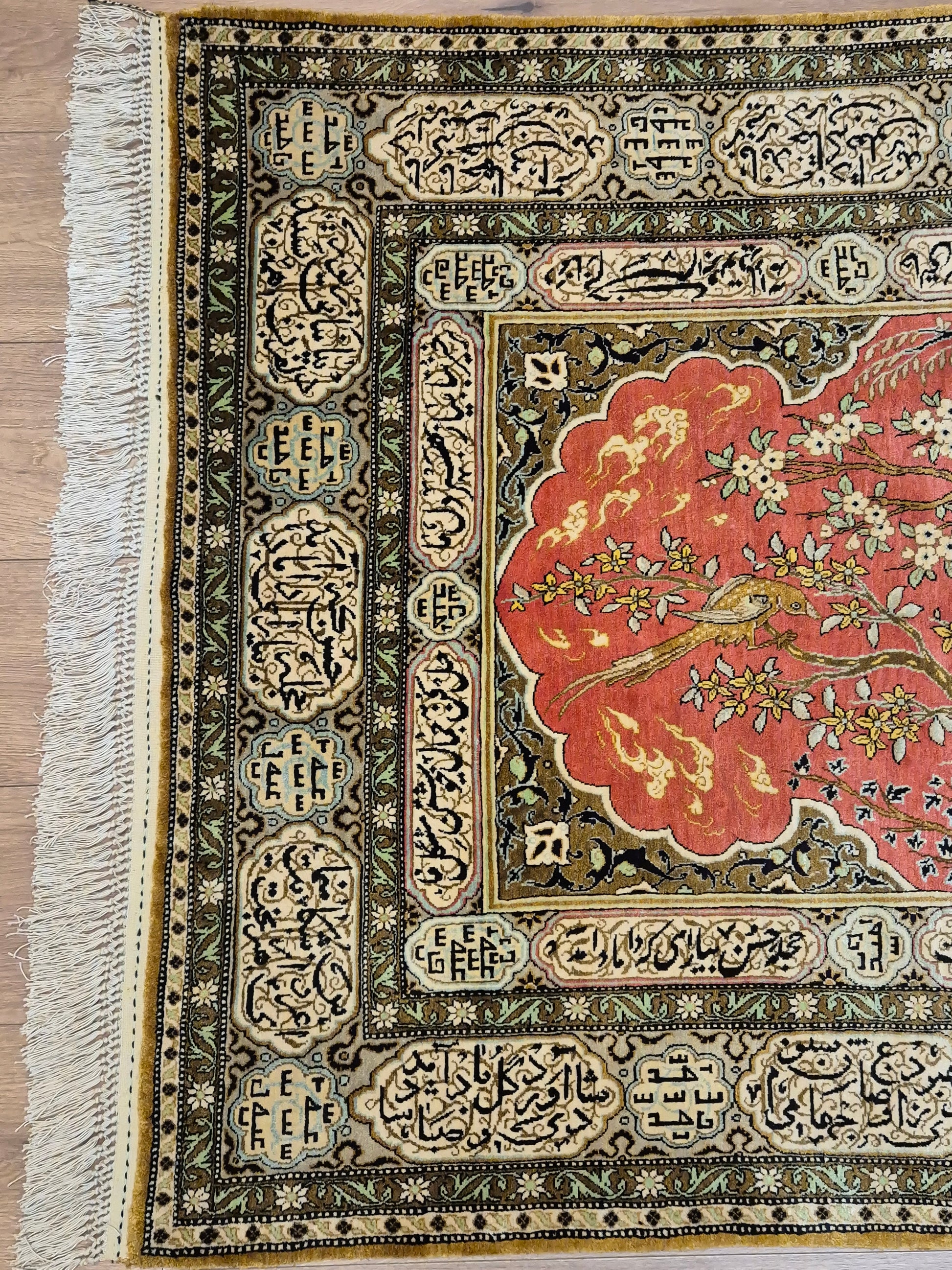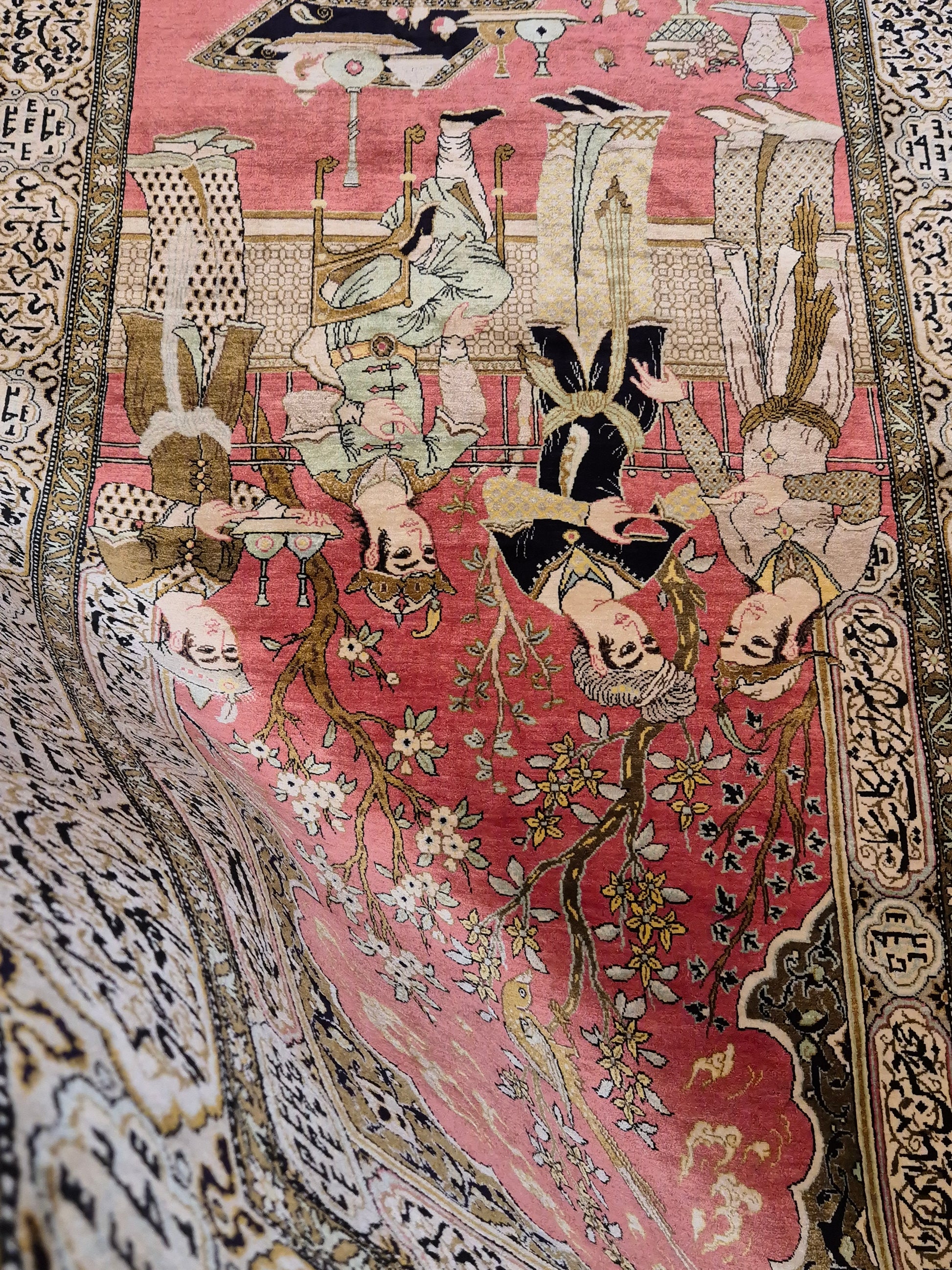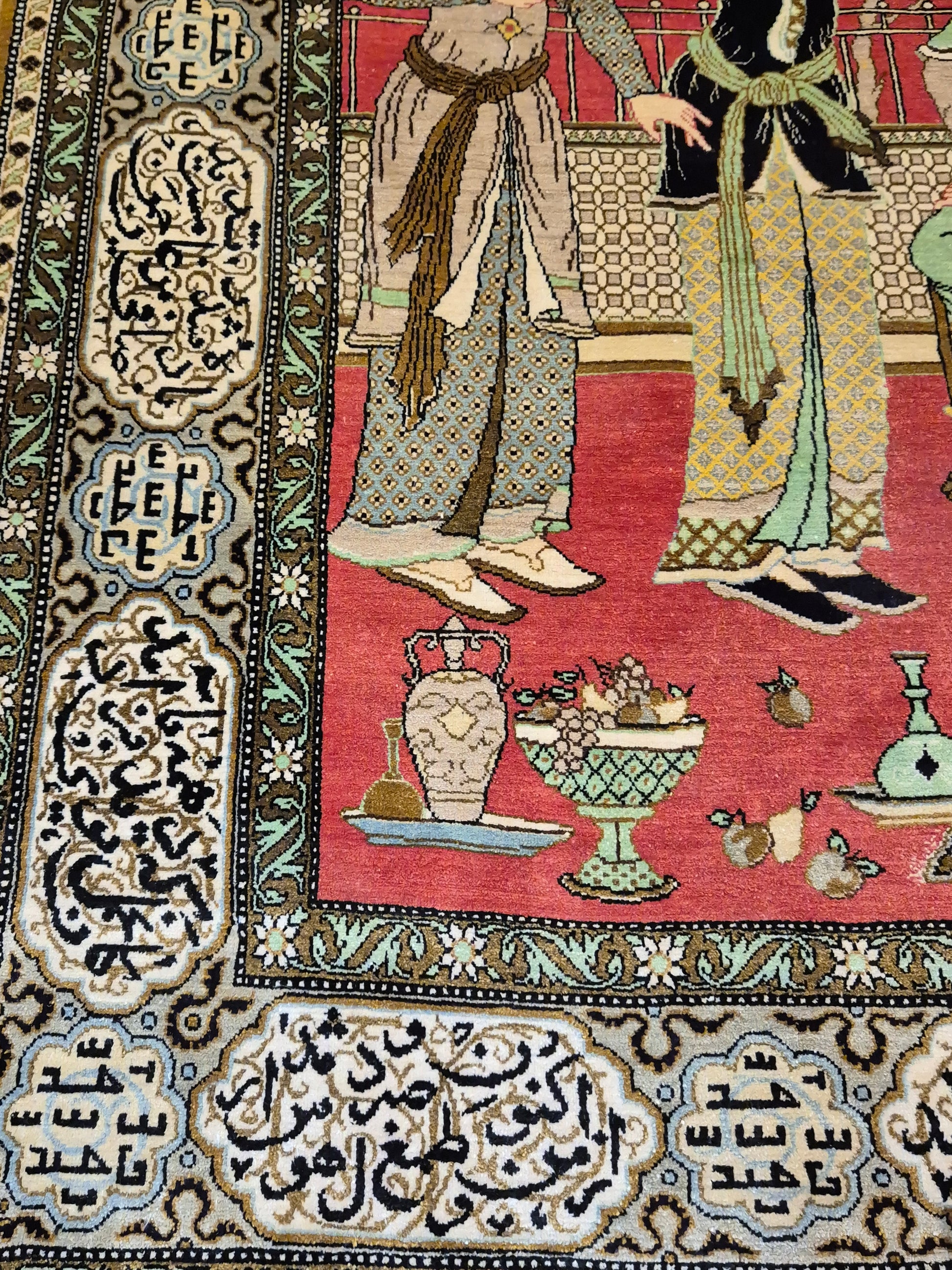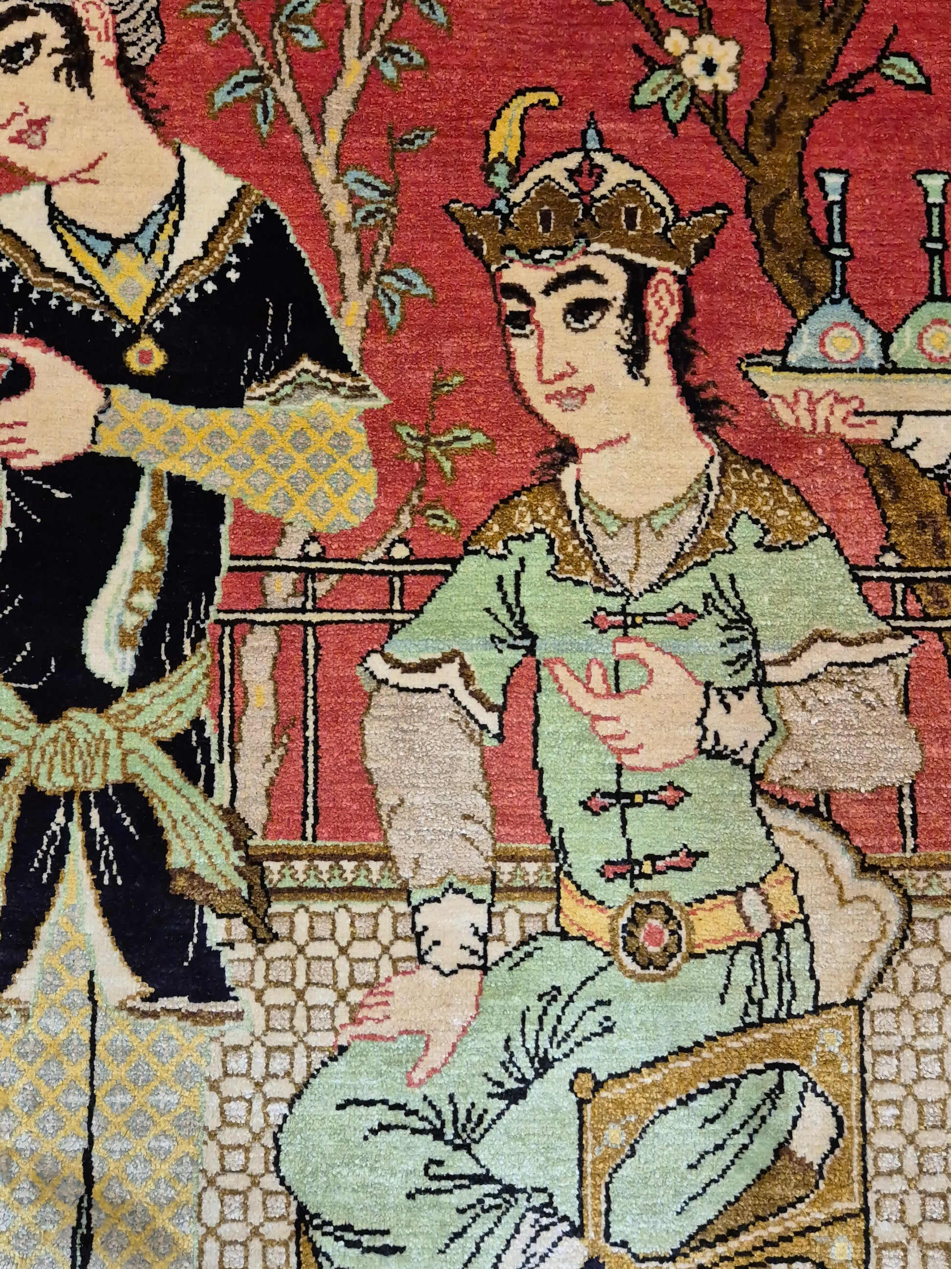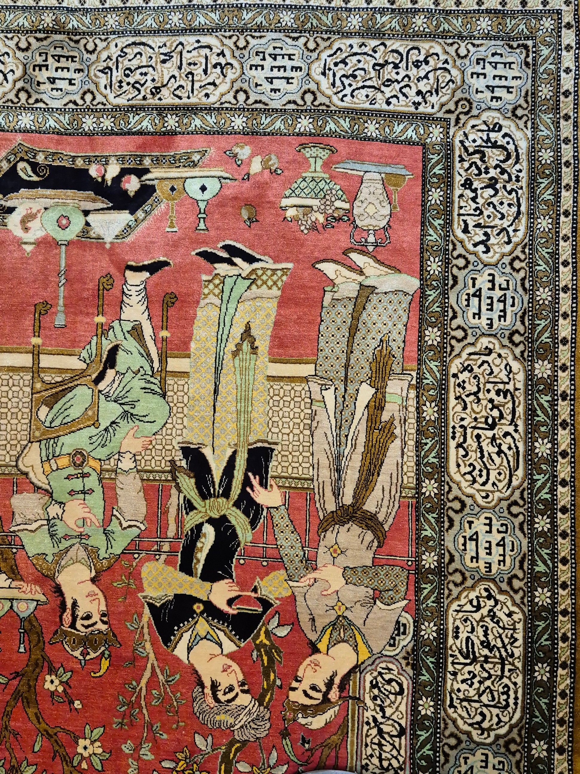 angeboten wird ein edler Ghom Teppich aus 100 % Seide auf Seide, handgeknüpft in feiner Ausführung. Das Motiv zeigt eine figürliche Szene mit vier Personen in kunstvoll gestalteter Hofdarstellung, ergänzt durch florale Details, Gefäße und einen roten Hintergrund mit blühenden Bäumen. Die aufwendig gearbeitete Bordüre ist mit kalligrafischen Schriftzügen und Ornamenten versehen, die diesem Stück eine besonders repräsentative Wirkung verleihen.