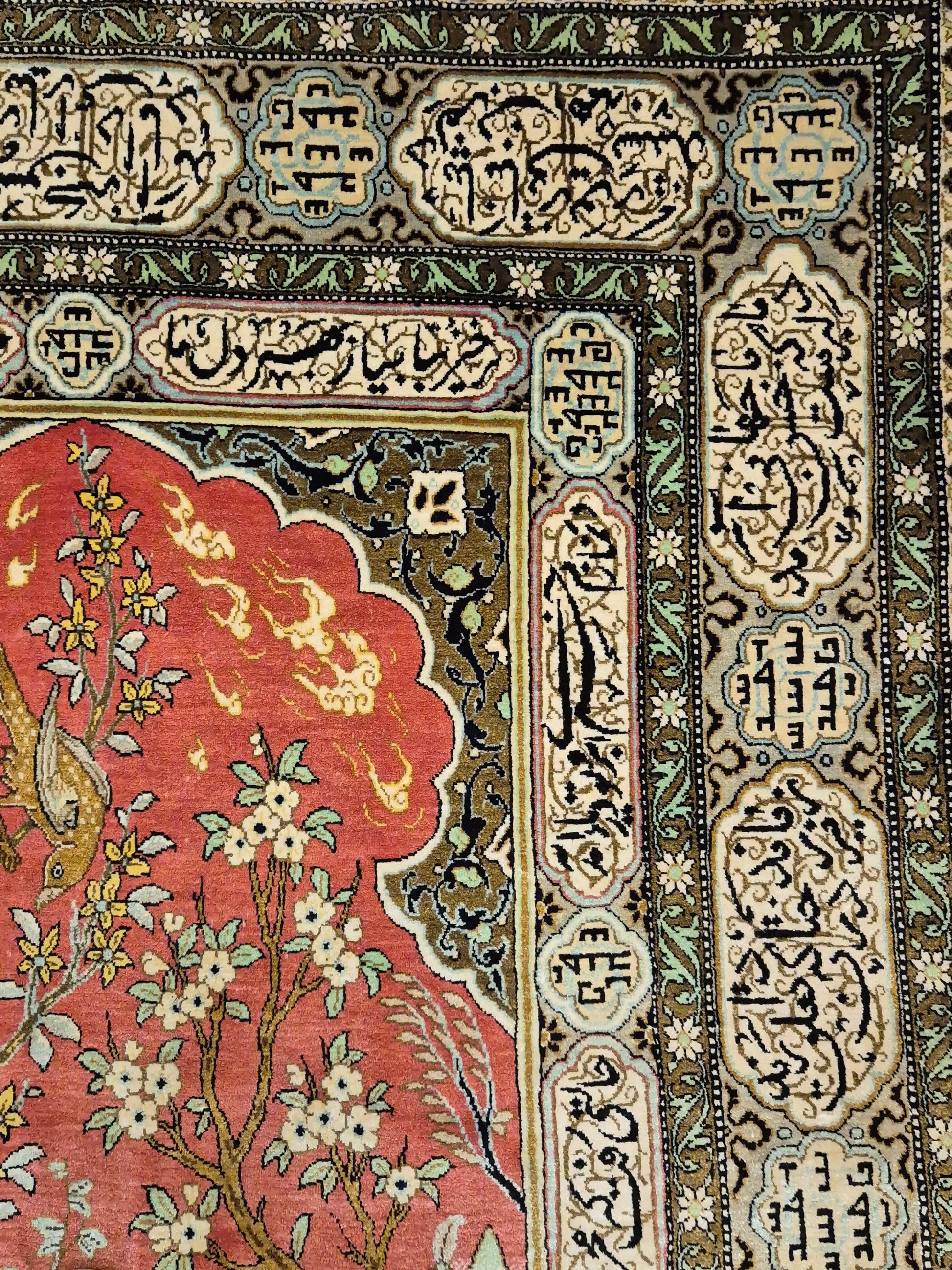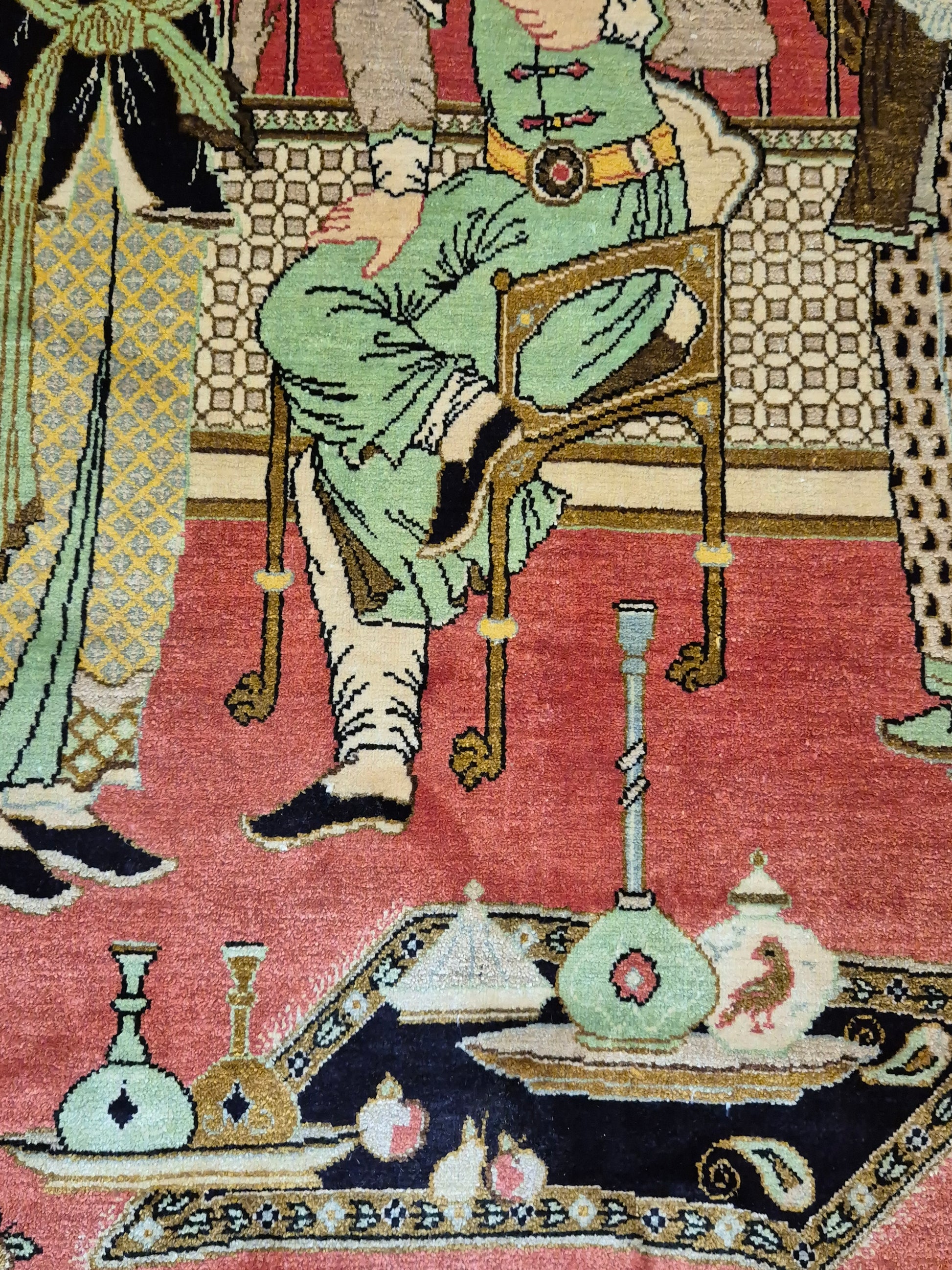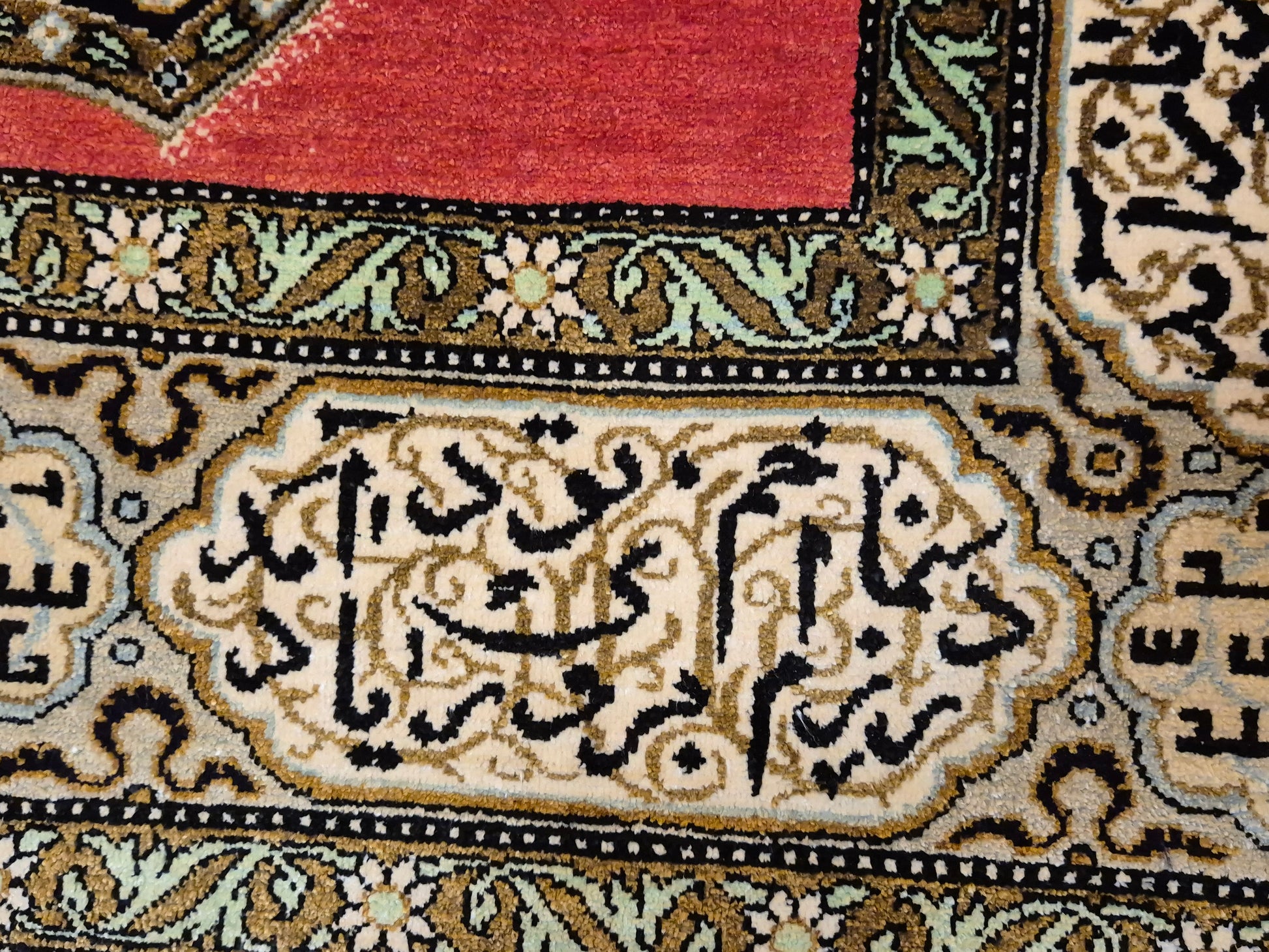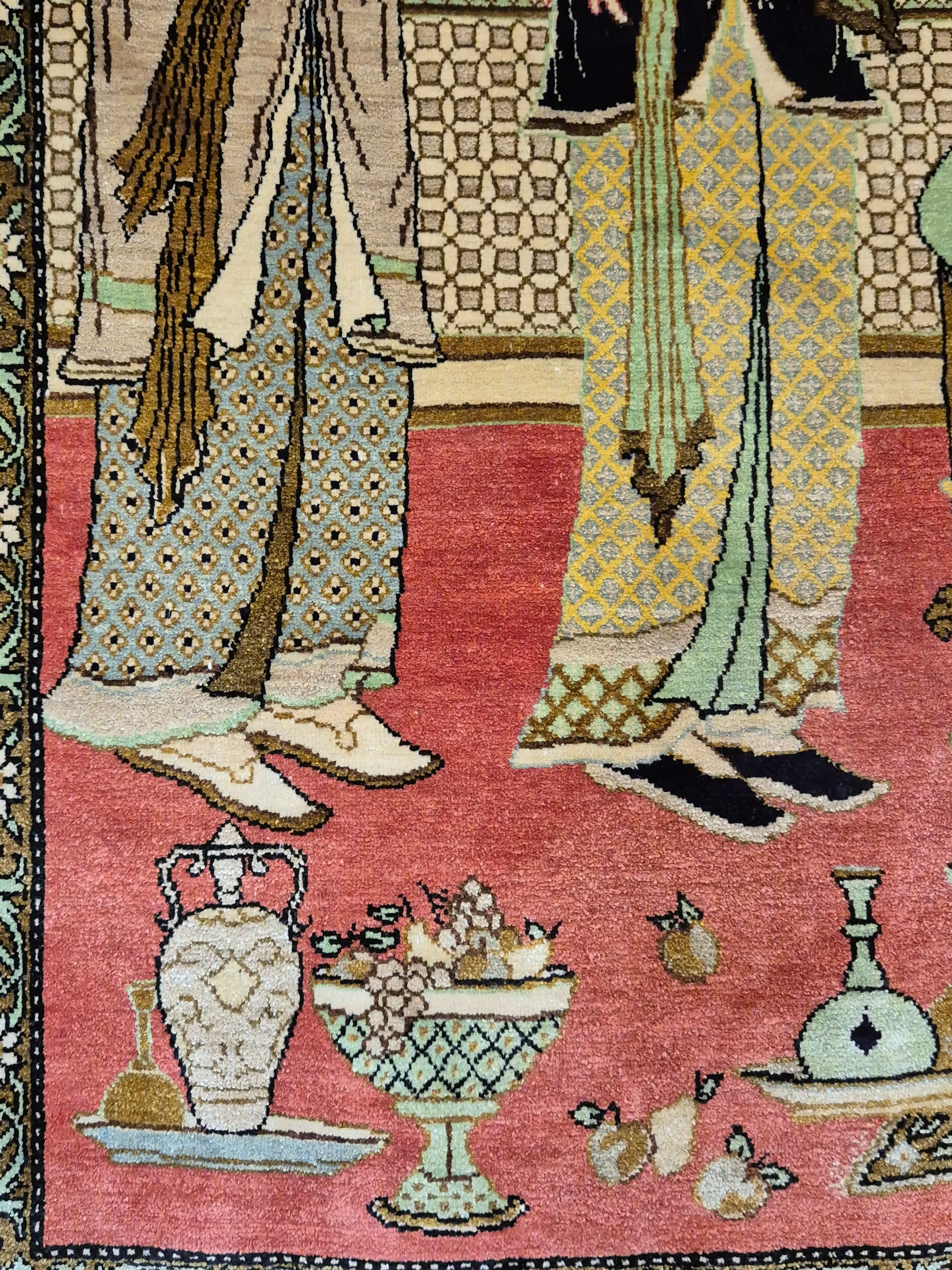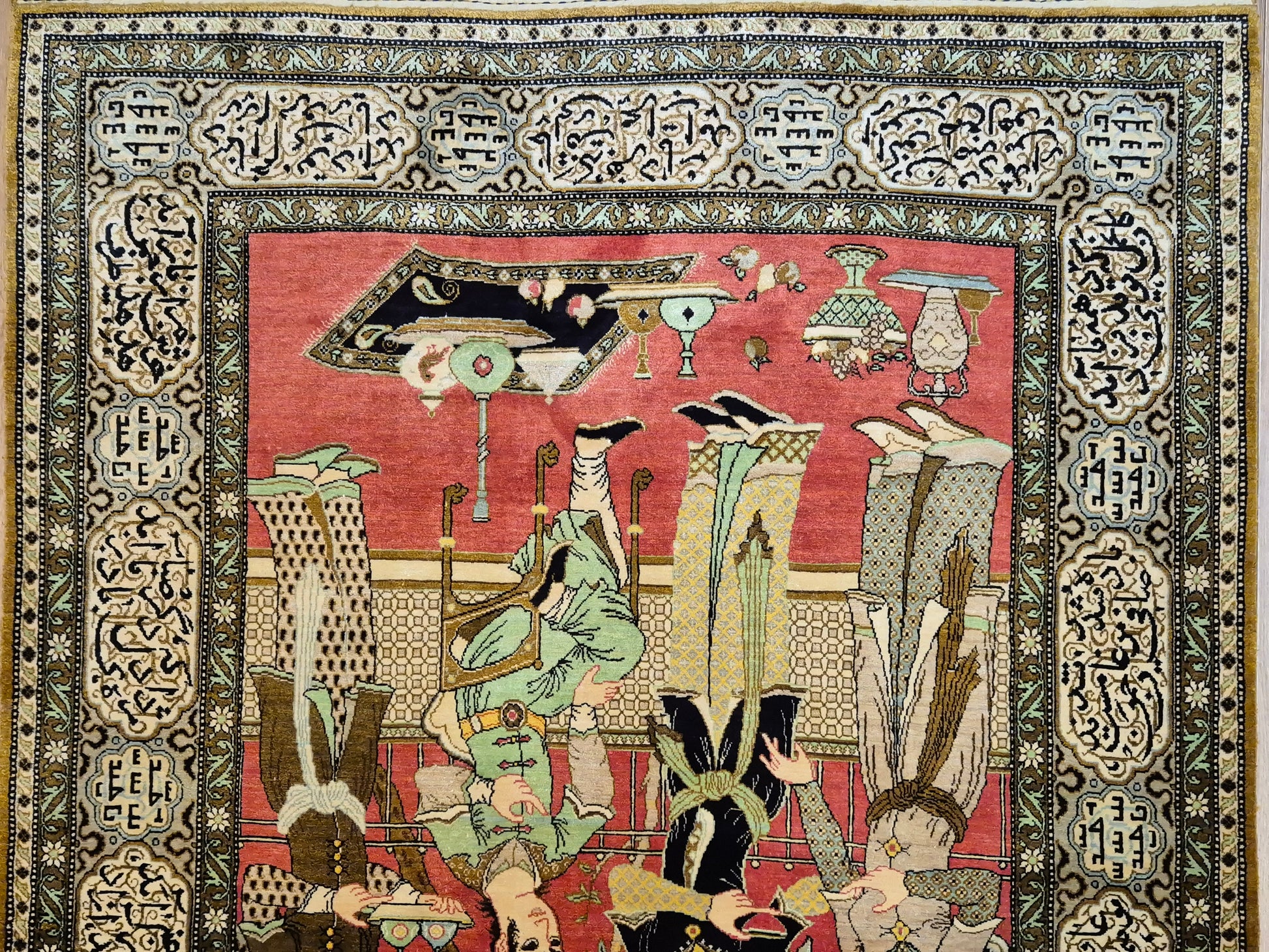 angeboten wird ein edler Ghom Teppich aus 100 % Seide auf Seide, handgeknüpft in feiner Ausführung. Das Motiv zeigt eine figürliche Szene mit vier Personen in kunstvoll gestalteter Hofdarstellung, ergänzt durch florale Details, Gefäße und einen roten Hintergrund mit blühenden Bäumen. Die aufwendig gearbeitete Bordüre ist mit kalligrafischen Schriftzügen und Ornamenten versehen, die diesem Stück eine besonders repräsentative Wirkung verleihen.
