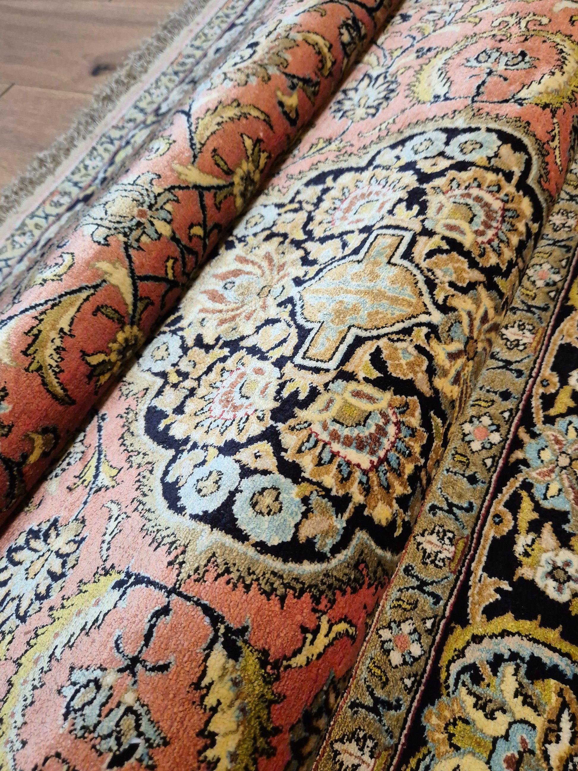 angeboten wird ein edler Ghom Teppich aus 100 % Seide auf Seide, handgeknüpft mit feiner Knotendichte. Im Zentrum befindet sich ein ornamentreiches Medaillon in Gold und Hellblau, eingebettet in ein terrakottafarbenes Fondfeld. Feine Blütenranken und geschwungene Arabesken durchziehen das gesamte Design. Die dunkel abgesetzte Hauptbordüre mit floralen Ornamenten bildet einen stilvollen Kontrast und rahmt die Komposition harmonisch ein.