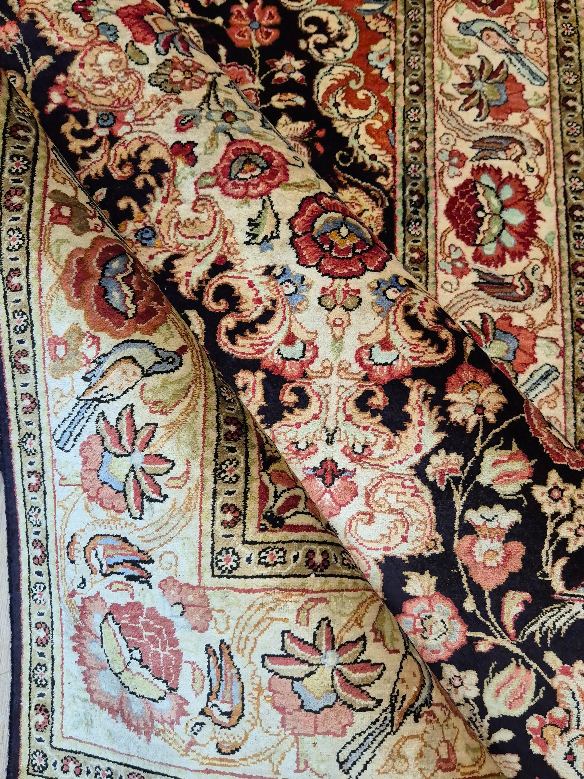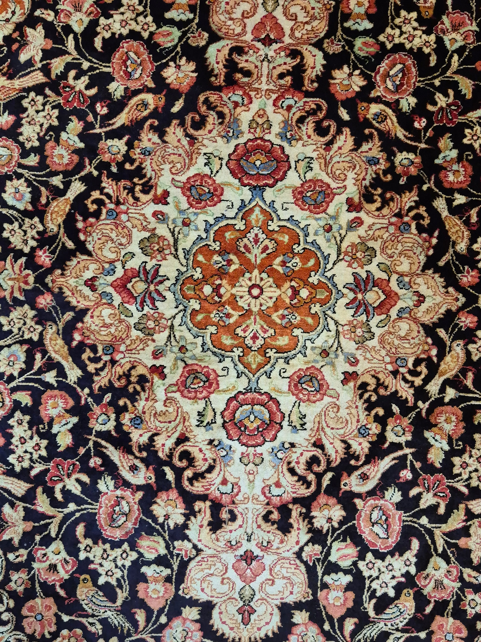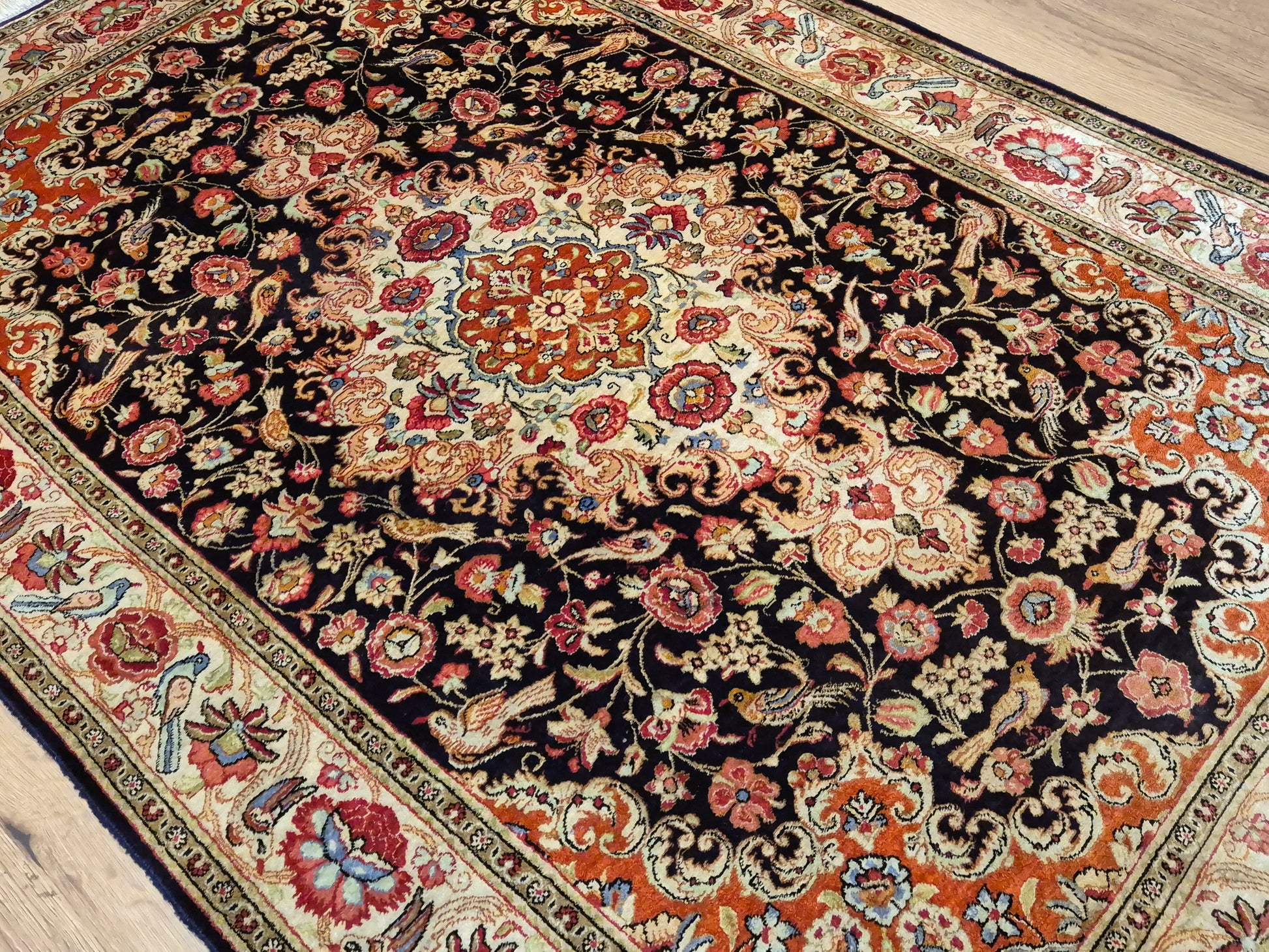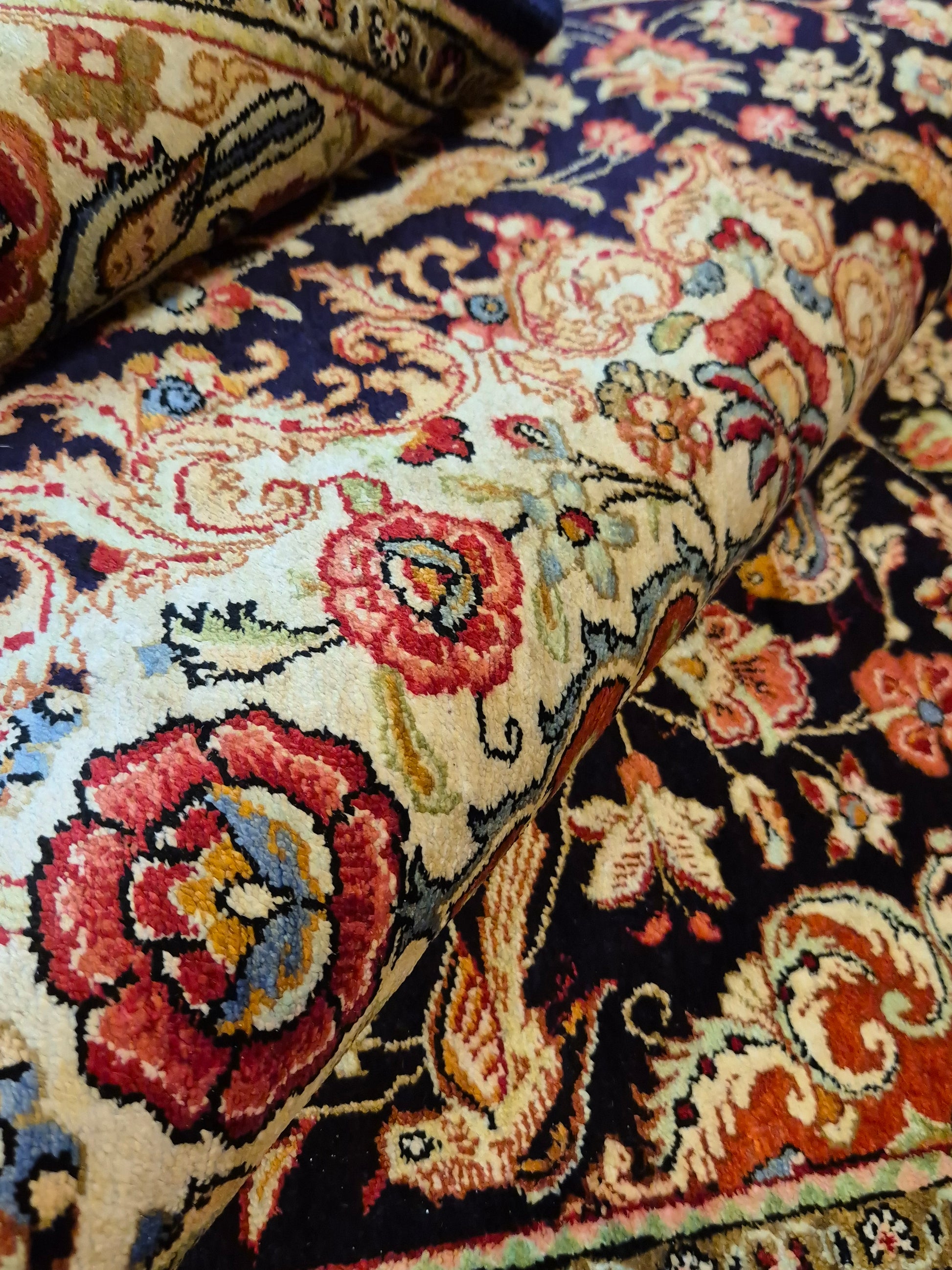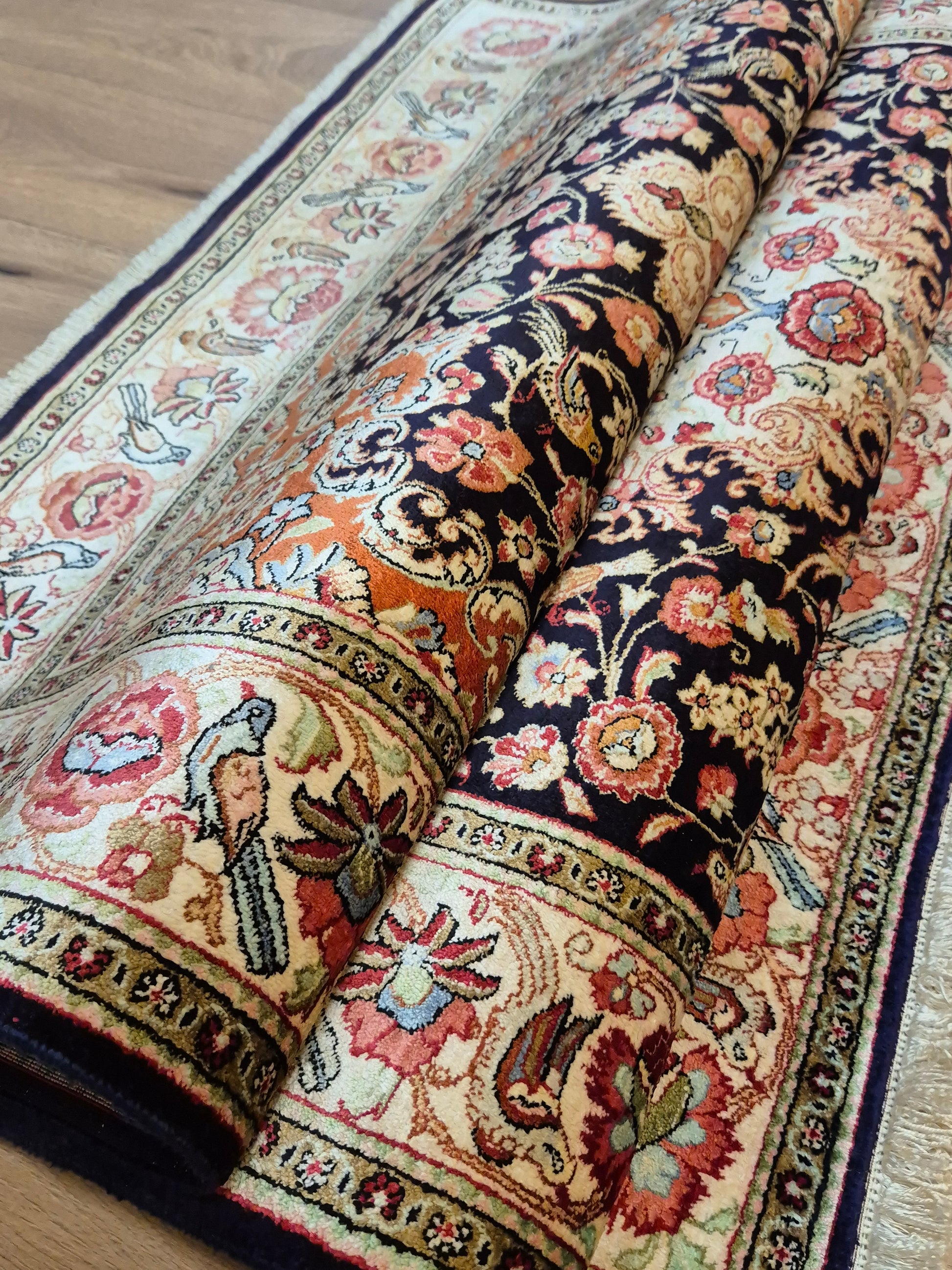 angeboten wird ein prachtvoller Ghom Teppich aus 100 % Seide auf Seide, handgeknüpft mit sehr feiner Knotung. Im Zentrum befindet sich ein kunstvoll gestaltetes Medaillon in Elfenbein und Rostrot, eingebettet in ein dunkelblaues Fondfeld, das von floralen Blütenranken, Vögeln und Ornamenten durchzogen ist. Die elegante Hauptbordüre in hellen Tönen ist reich mit Blumen- und Vogelmotiven dekoriert, wodurch dieser Teppich eine außergewöhnlich harmonische und repräsentative Wirkung erhält.