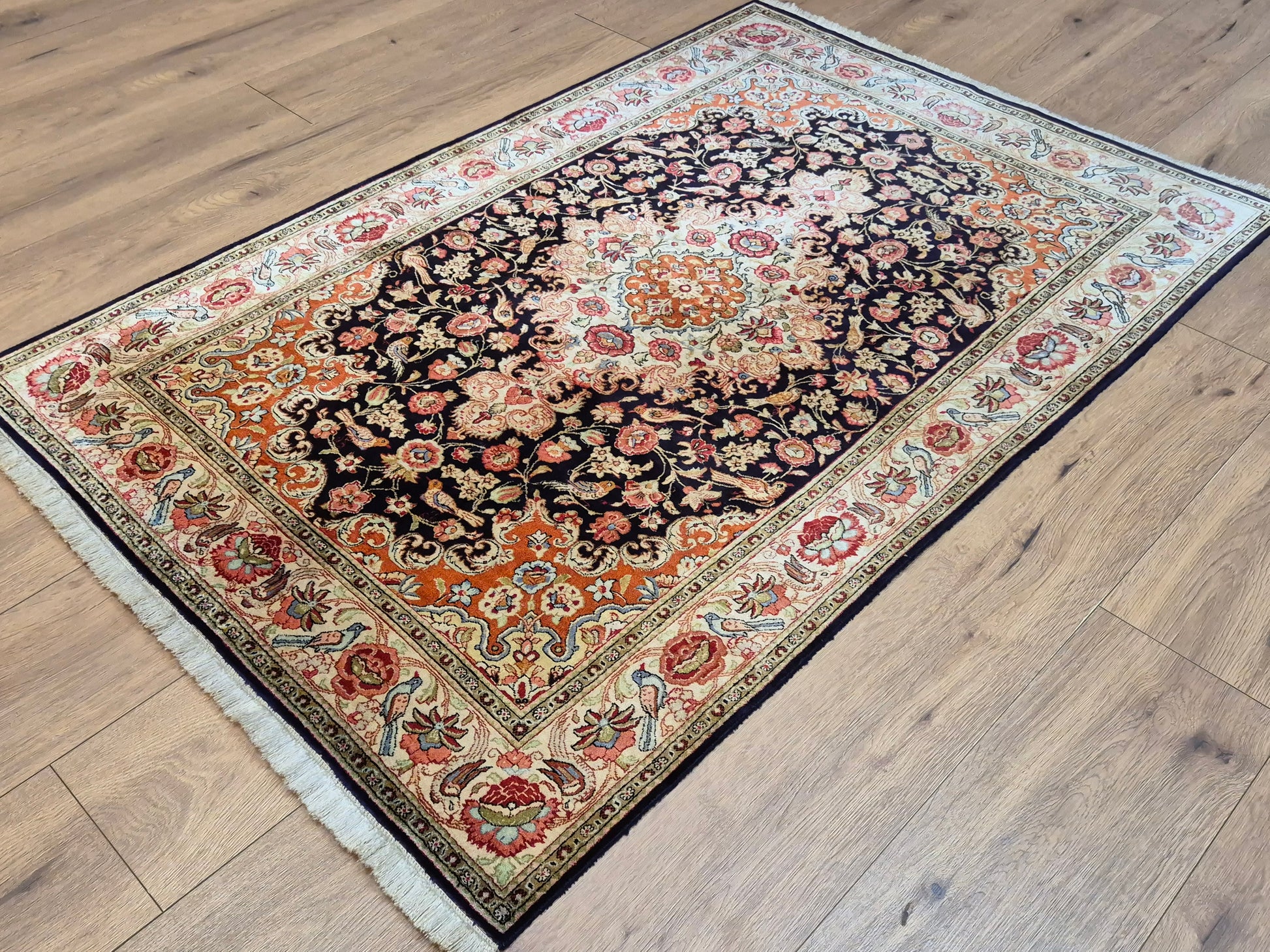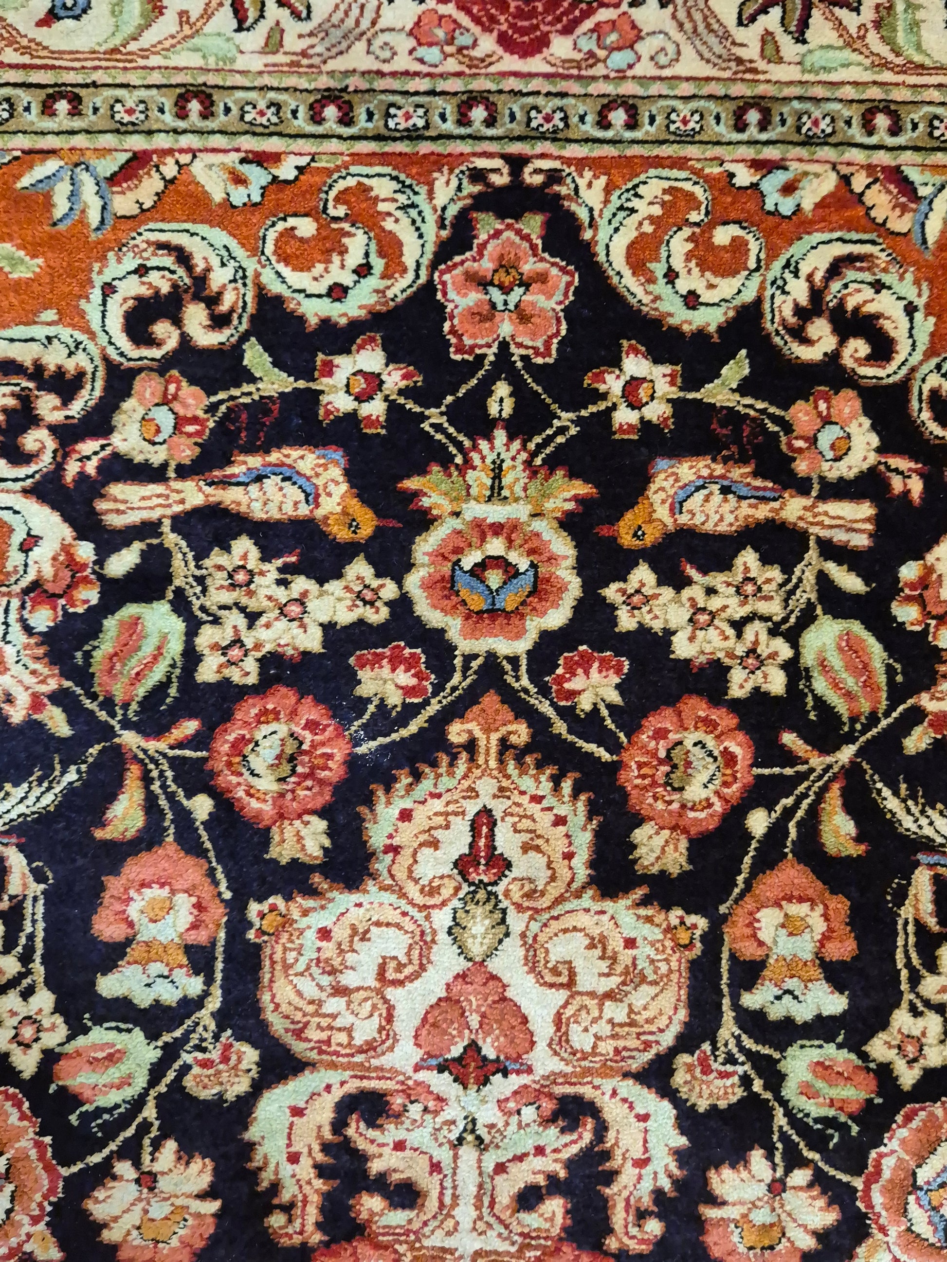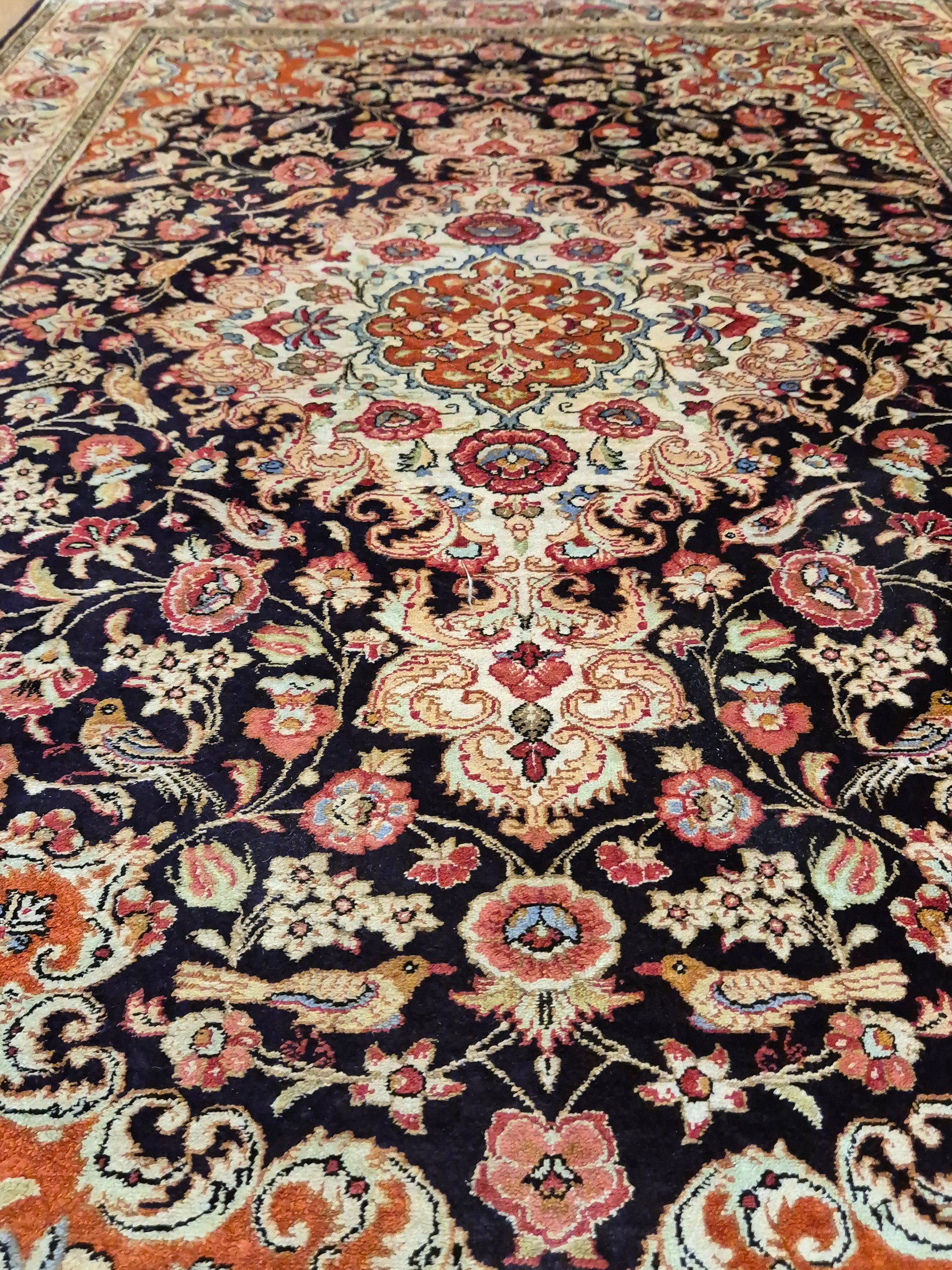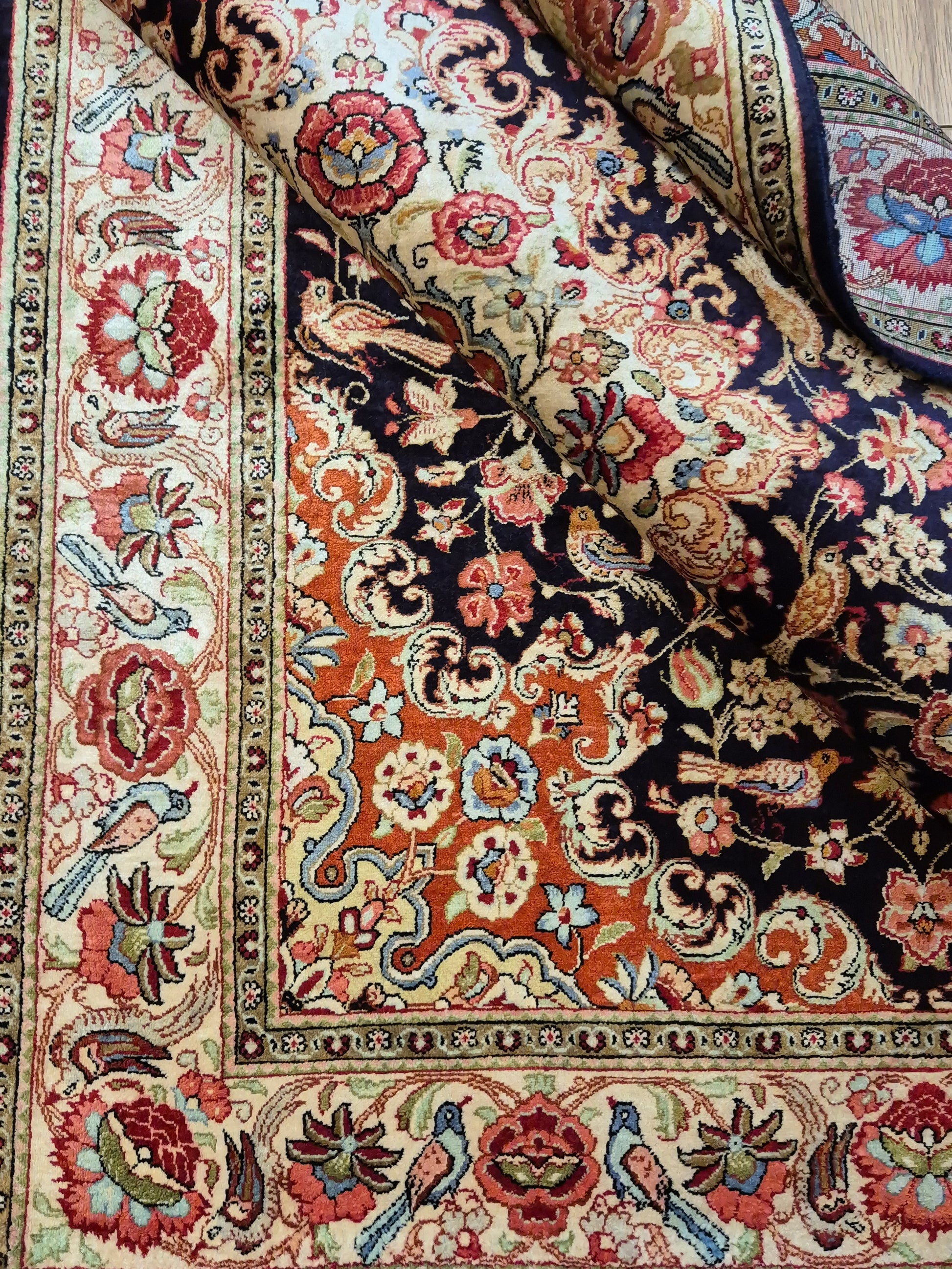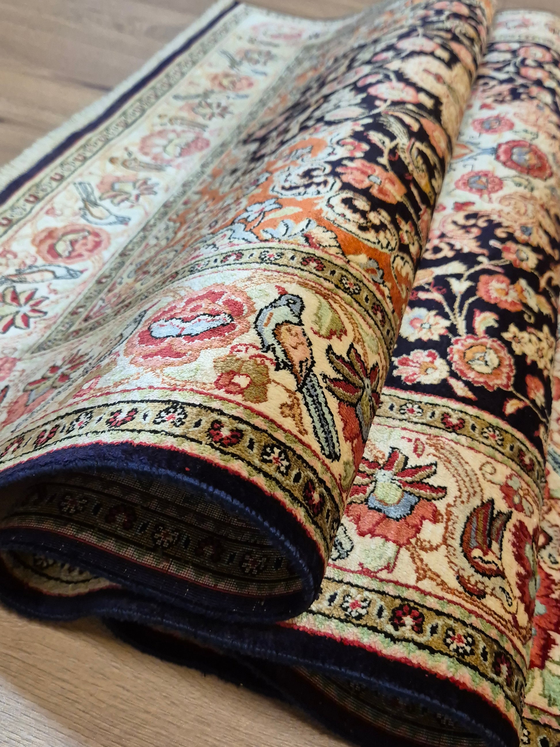 angeboten wird ein prachtvoller Ghom Teppich aus 100 % Seide auf Seide, handgeknüpft mit sehr feiner Knotung. Im Zentrum befindet sich ein kunstvoll gestaltetes Medaillon in Elfenbein und Rostrot, eingebettet in ein dunkelblaues Fondfeld, das von floralen Blütenranken, Vögeln und Ornamenten durchzogen ist. Die elegante Hauptbordüre in hellen Tönen ist reich mit Blumen- und Vogelmotiven dekoriert, wodurch dieser Teppich eine außergewöhnlich harmonische und repräsentative Wirkung erhält.