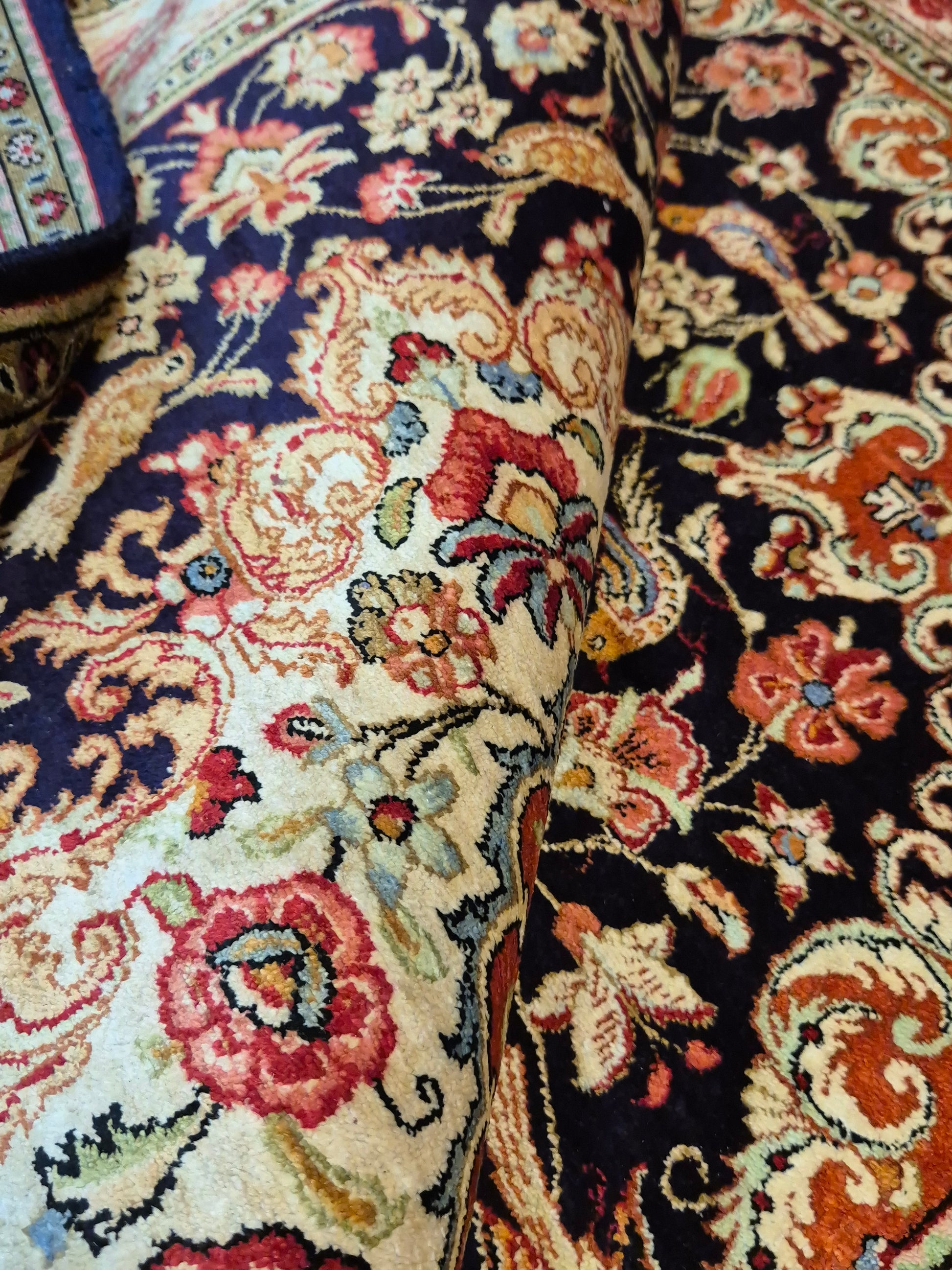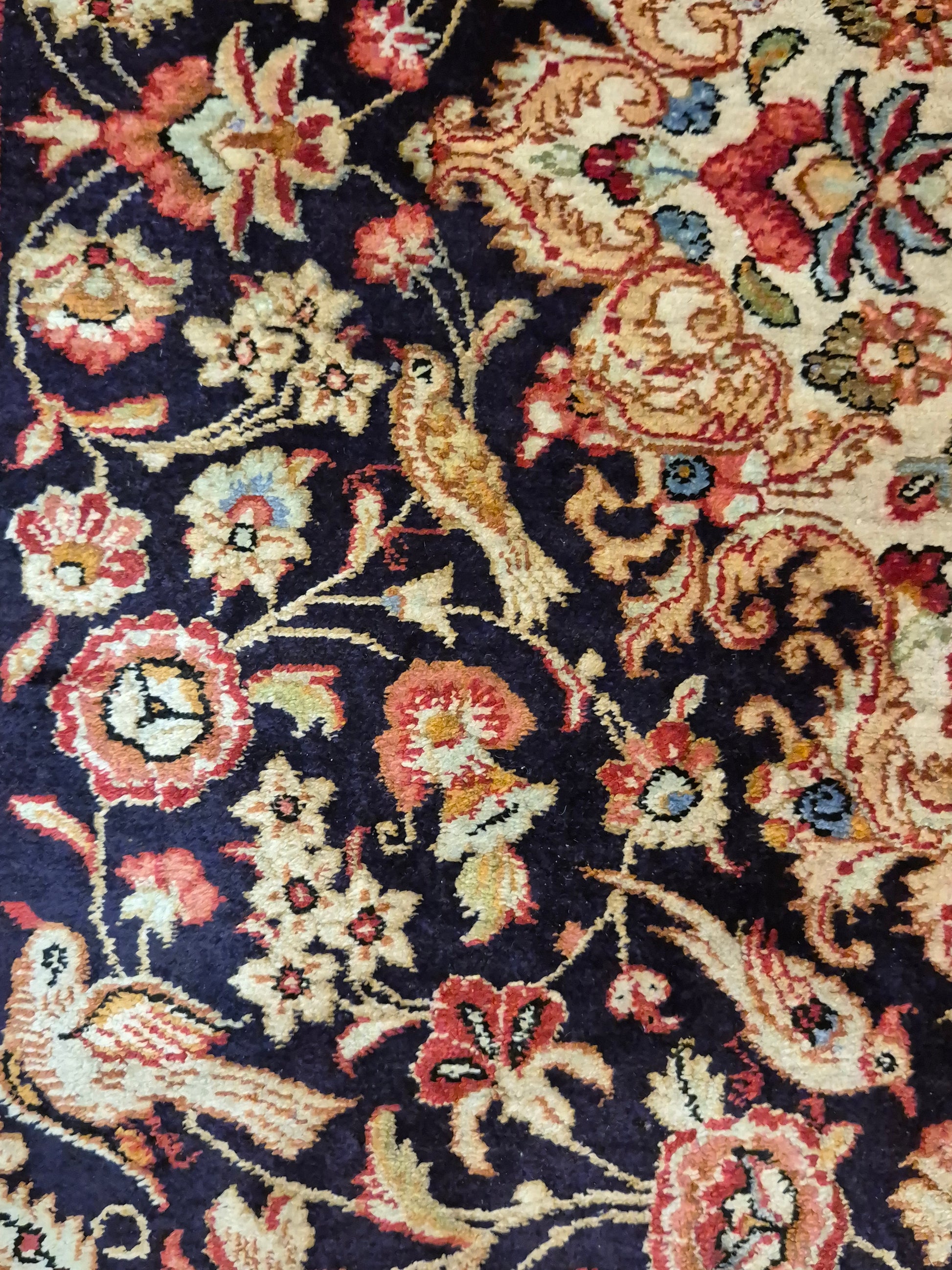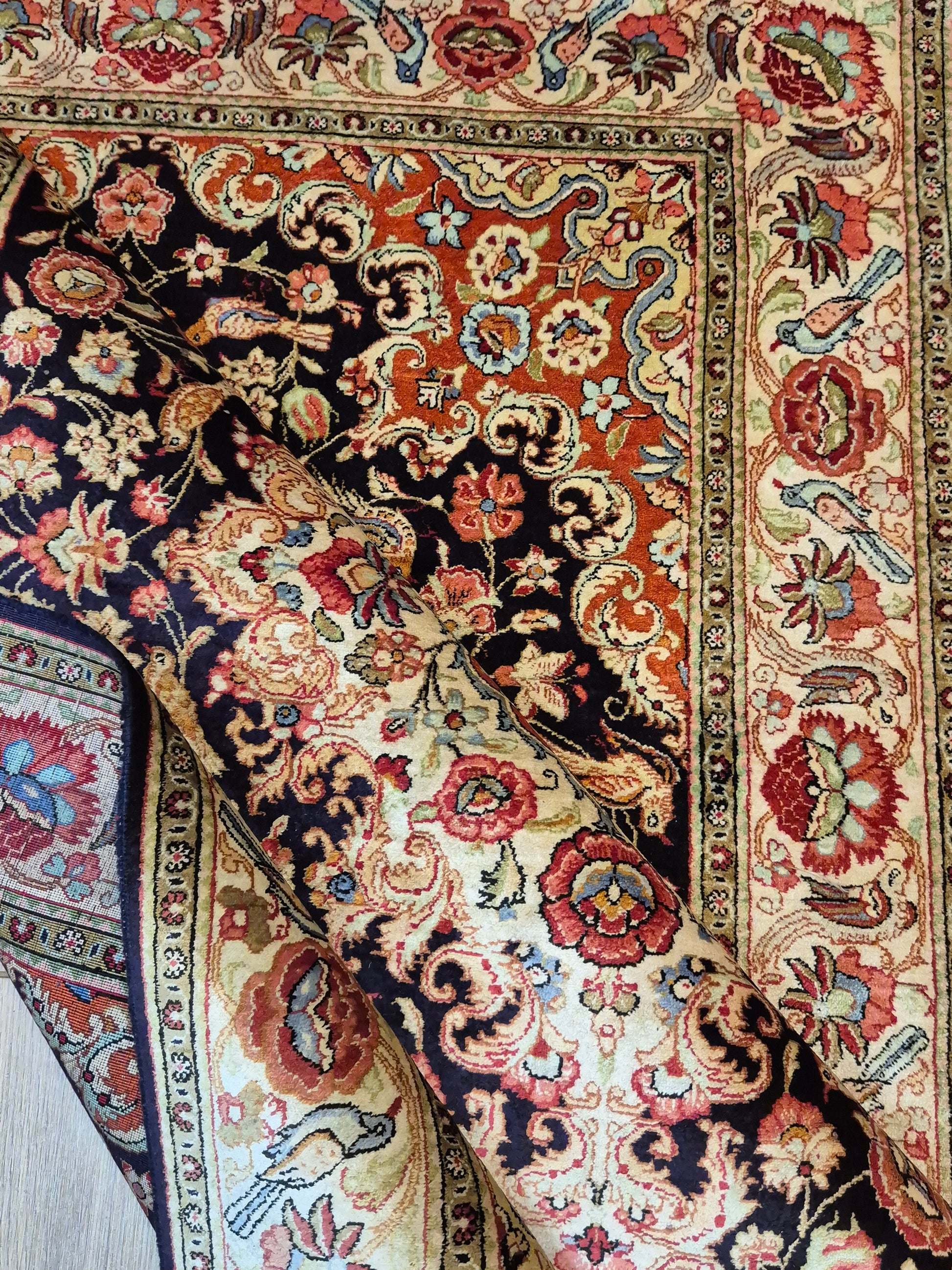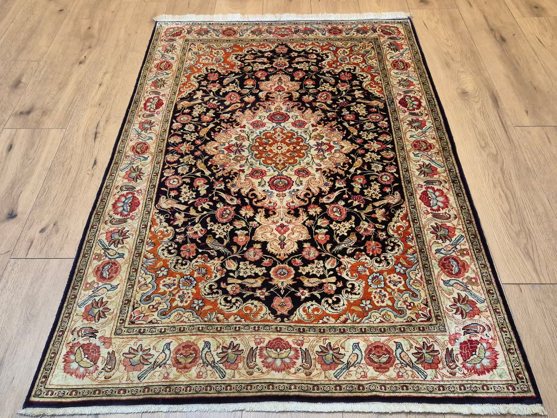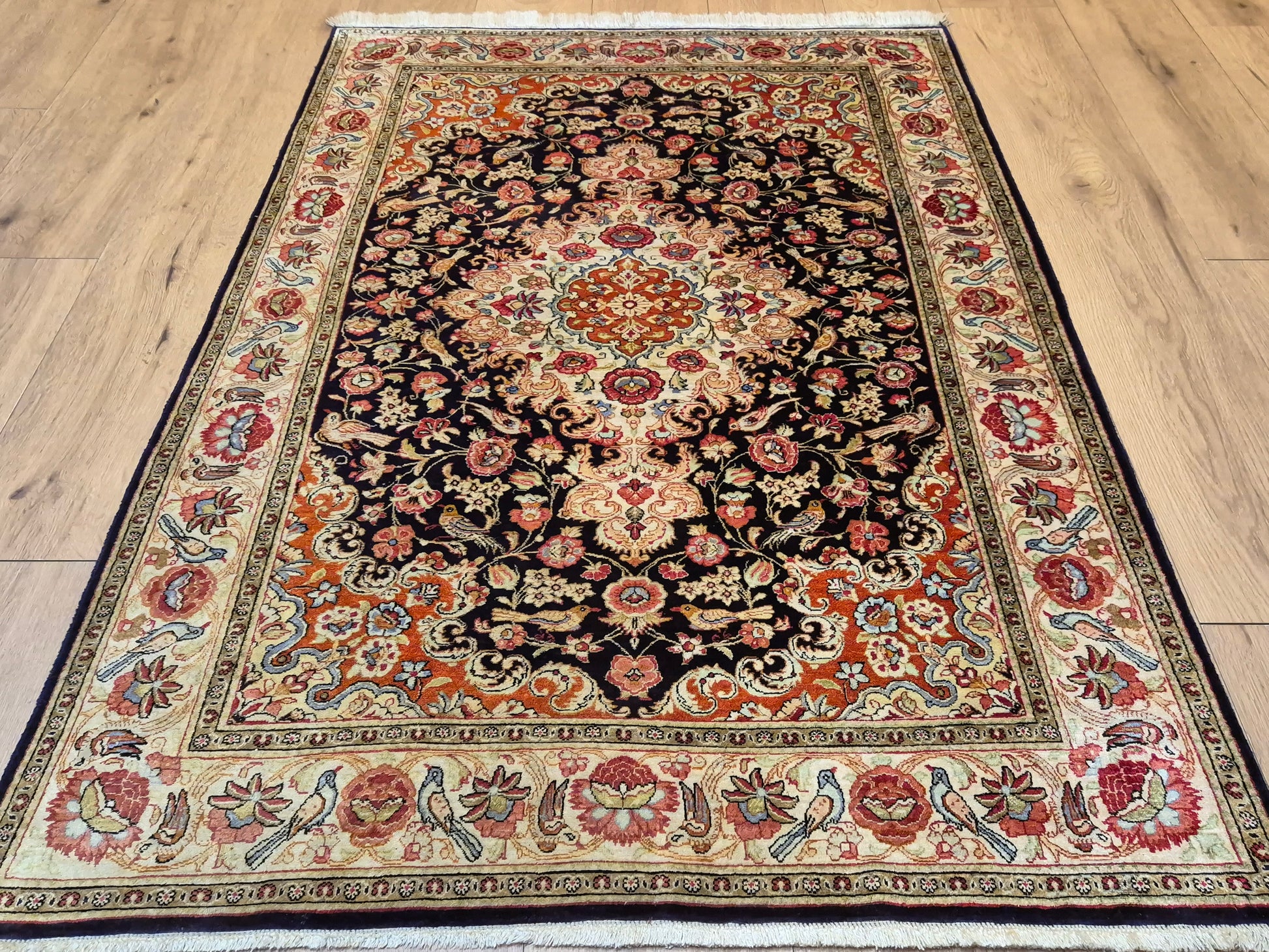 angeboten wird ein prachtvoller Ghom Teppich aus 100 % Seide auf Seide, handgeknüpft mit sehr feiner Knotung. Im Zentrum befindet sich ein kunstvoll gestaltetes Medaillon in Elfenbein und Rostrot, eingebettet in ein dunkelblaues Fondfeld, das von floralen Blütenranken, Vögeln und Ornamenten durchzogen ist. Die elegante Hauptbordüre in hellen Tönen ist reich mit Blumen- und Vogelmotiven dekoriert, wodurch dieser Teppich eine außergewöhnlich harmonische und repräsentative Wirkung erhält.