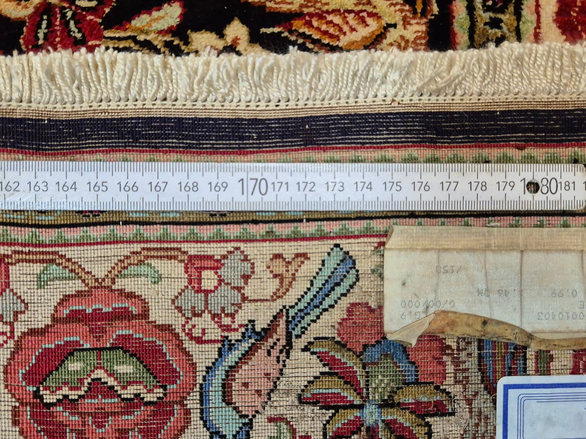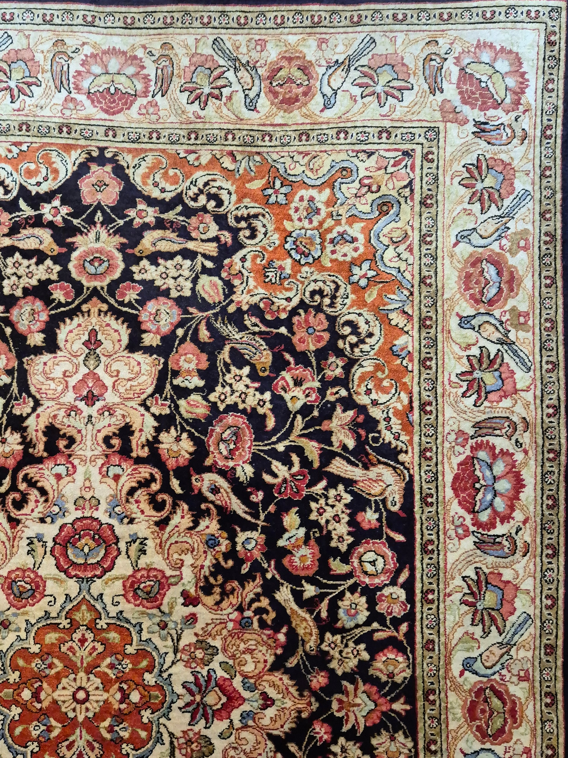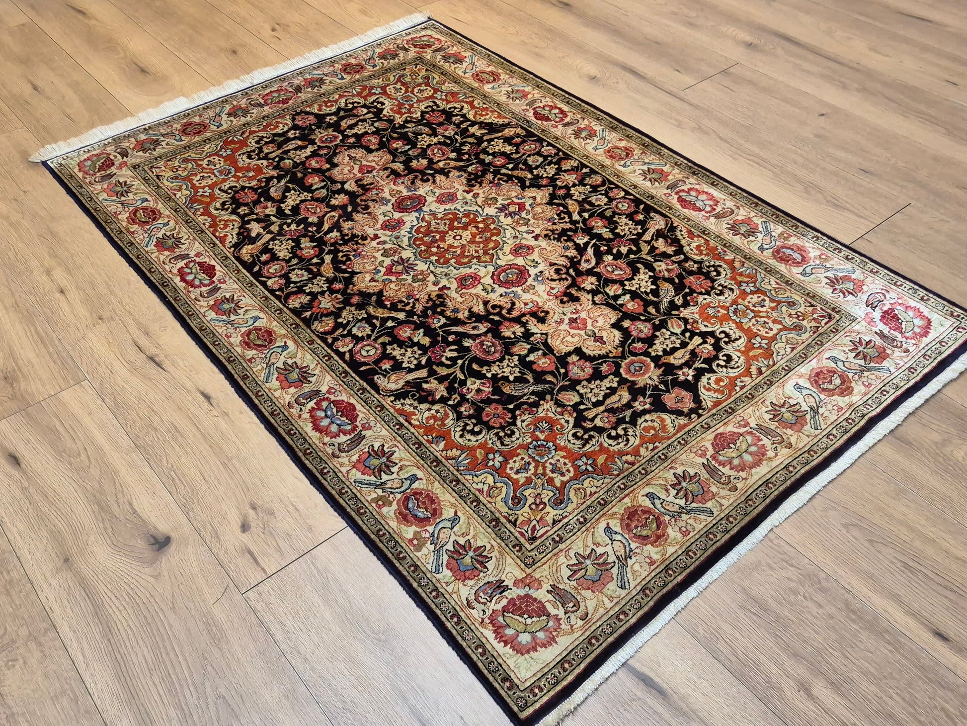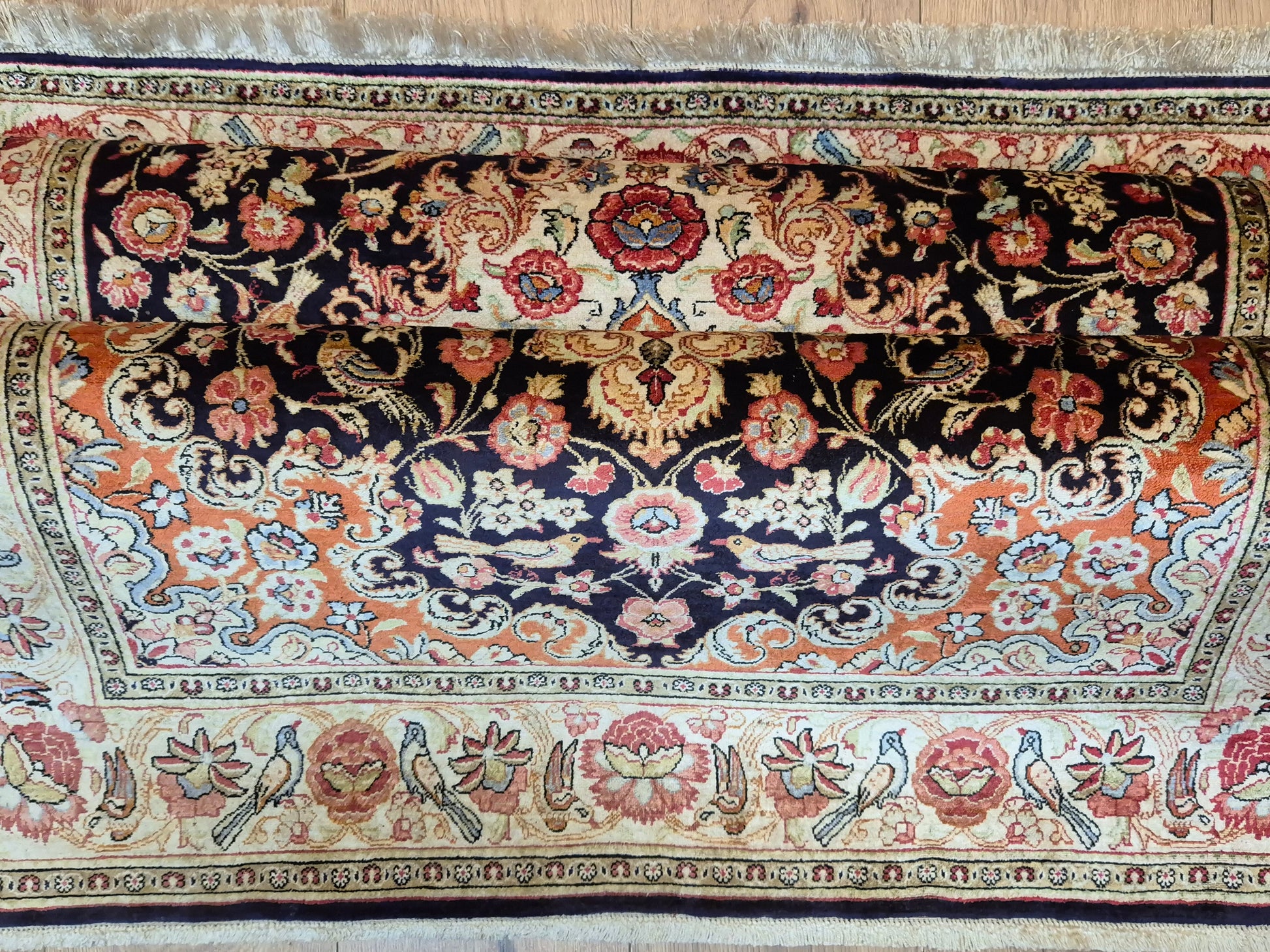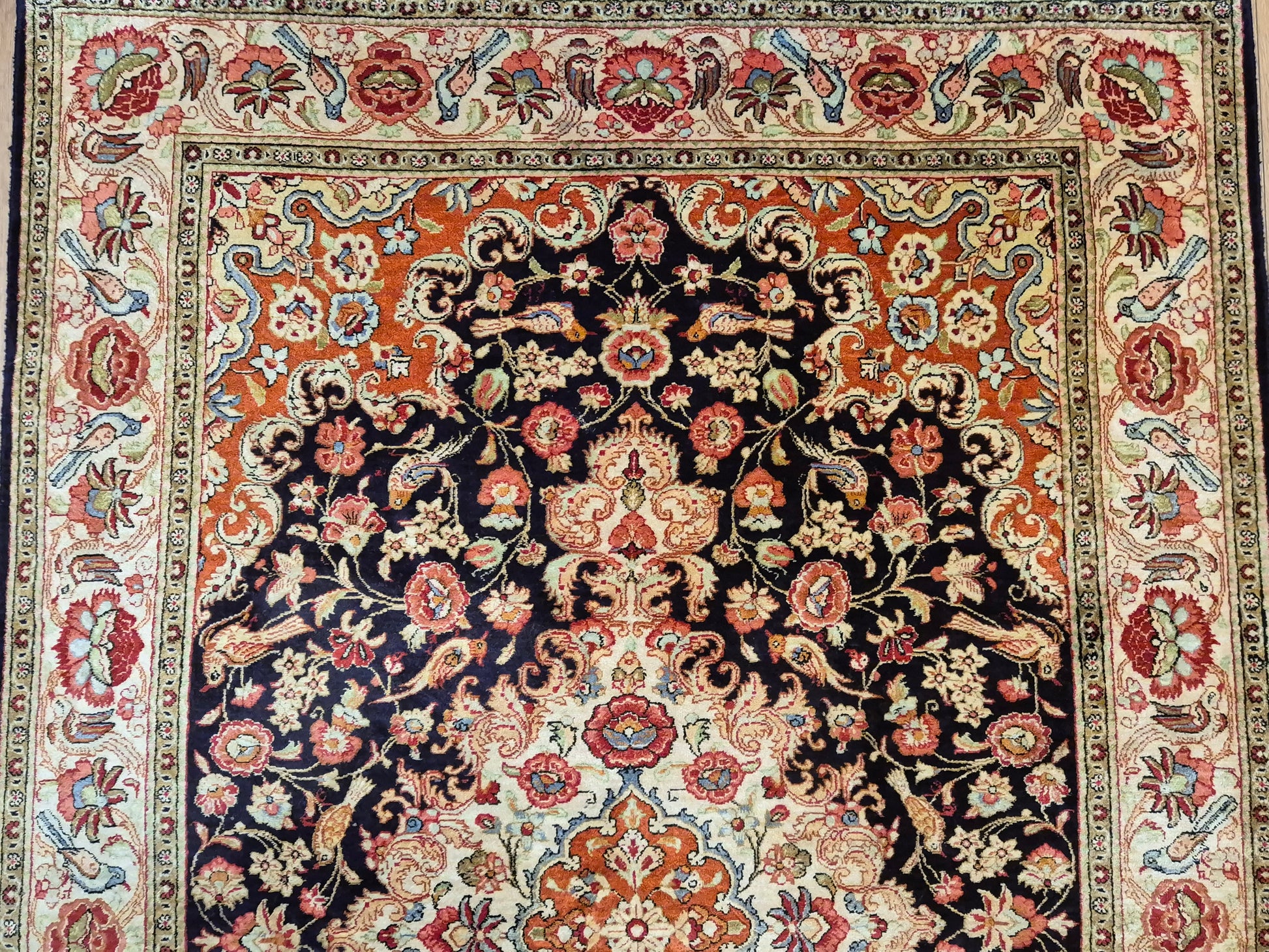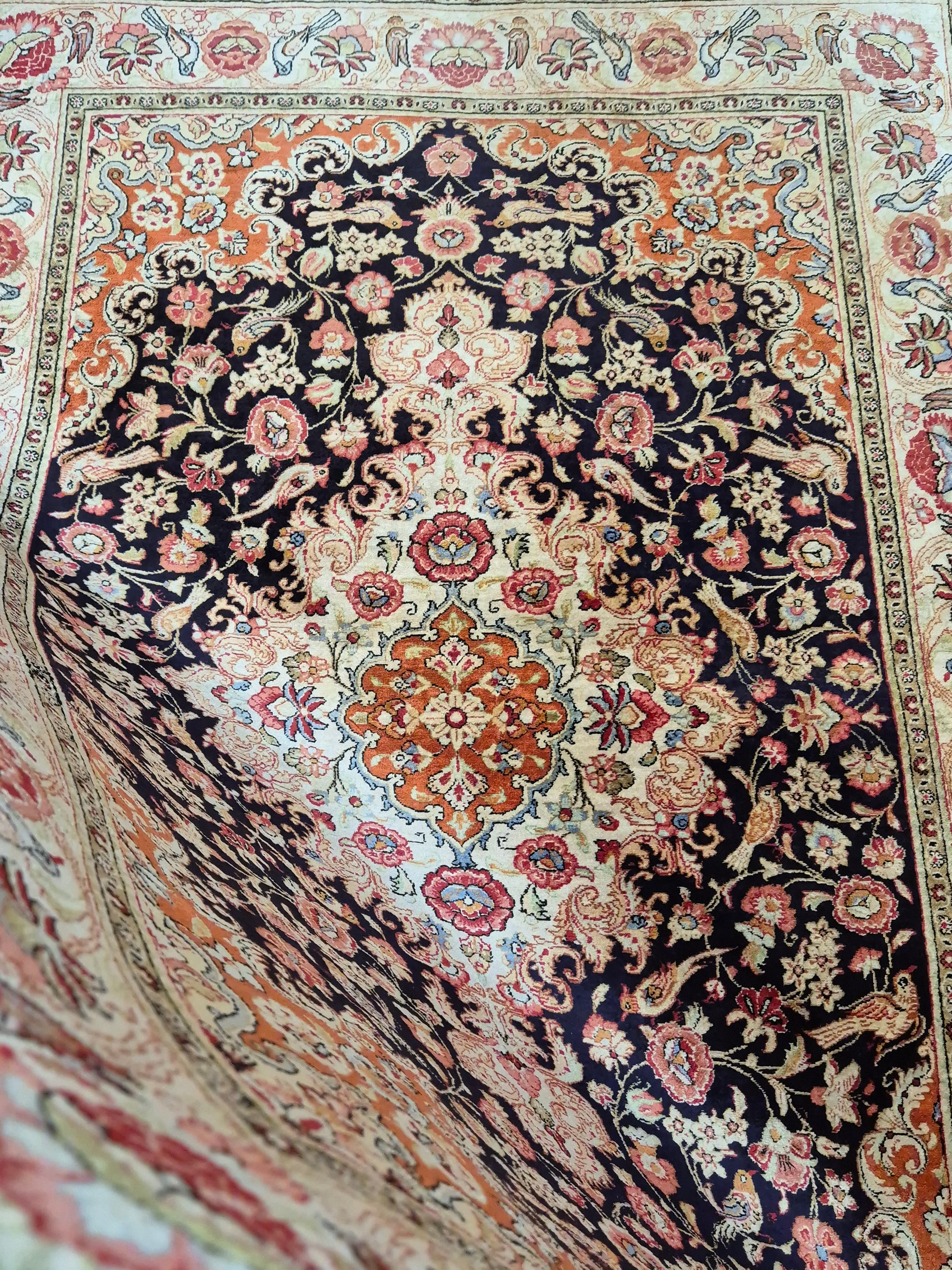 angeboten wird ein prachtvoller Ghom Teppich aus 100 % Seide auf Seide, handgeknüpft mit sehr feiner Knotung. Im Zentrum befindet sich ein kunstvoll gestaltetes Medaillon in Elfenbein und Rostrot, eingebettet in ein dunkelblaues Fondfeld, das von floralen Blütenranken, Vögeln und Ornamenten durchzogen ist. Die elegante Hauptbordüre in hellen Tönen ist reich mit Blumen- und Vogelmotiven dekoriert, wodurch dieser Teppich eine außergewöhnlich harmonische und repräsentative Wirkung erhält.