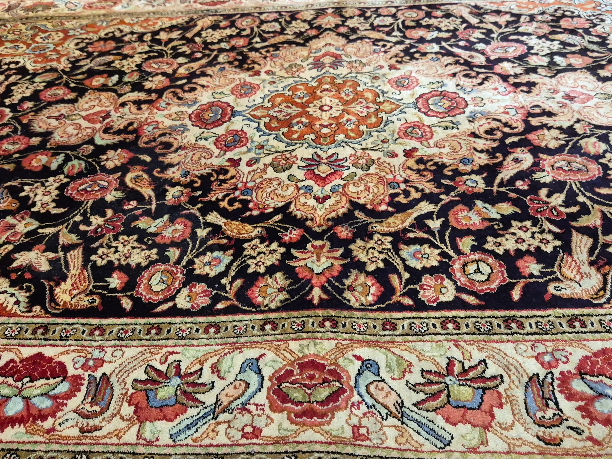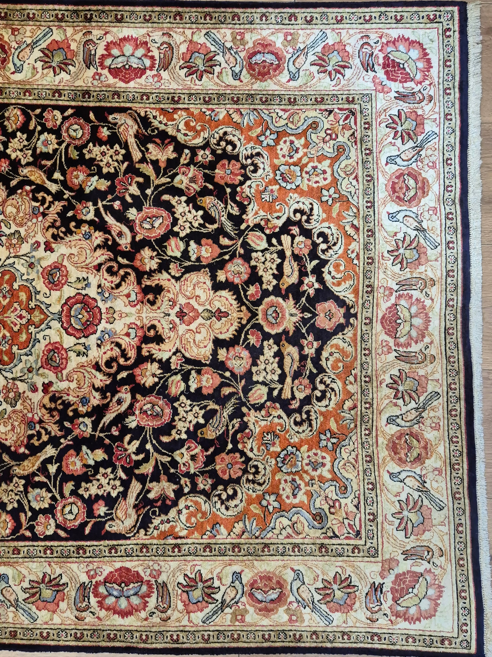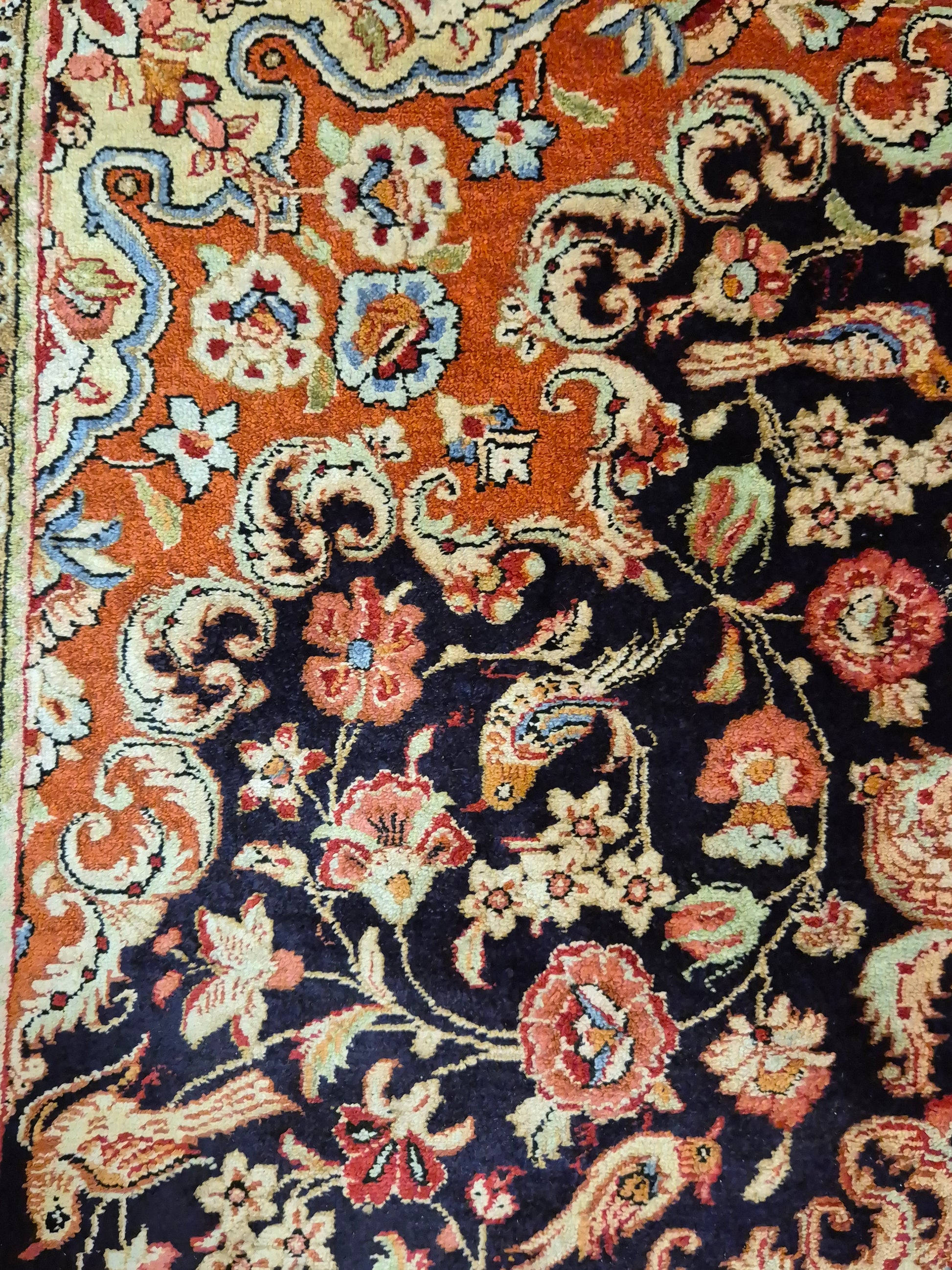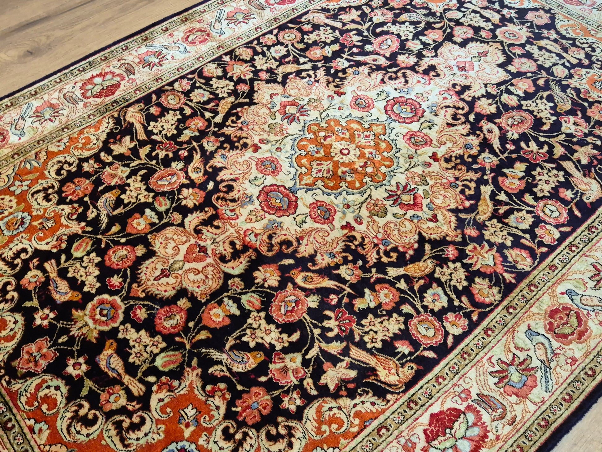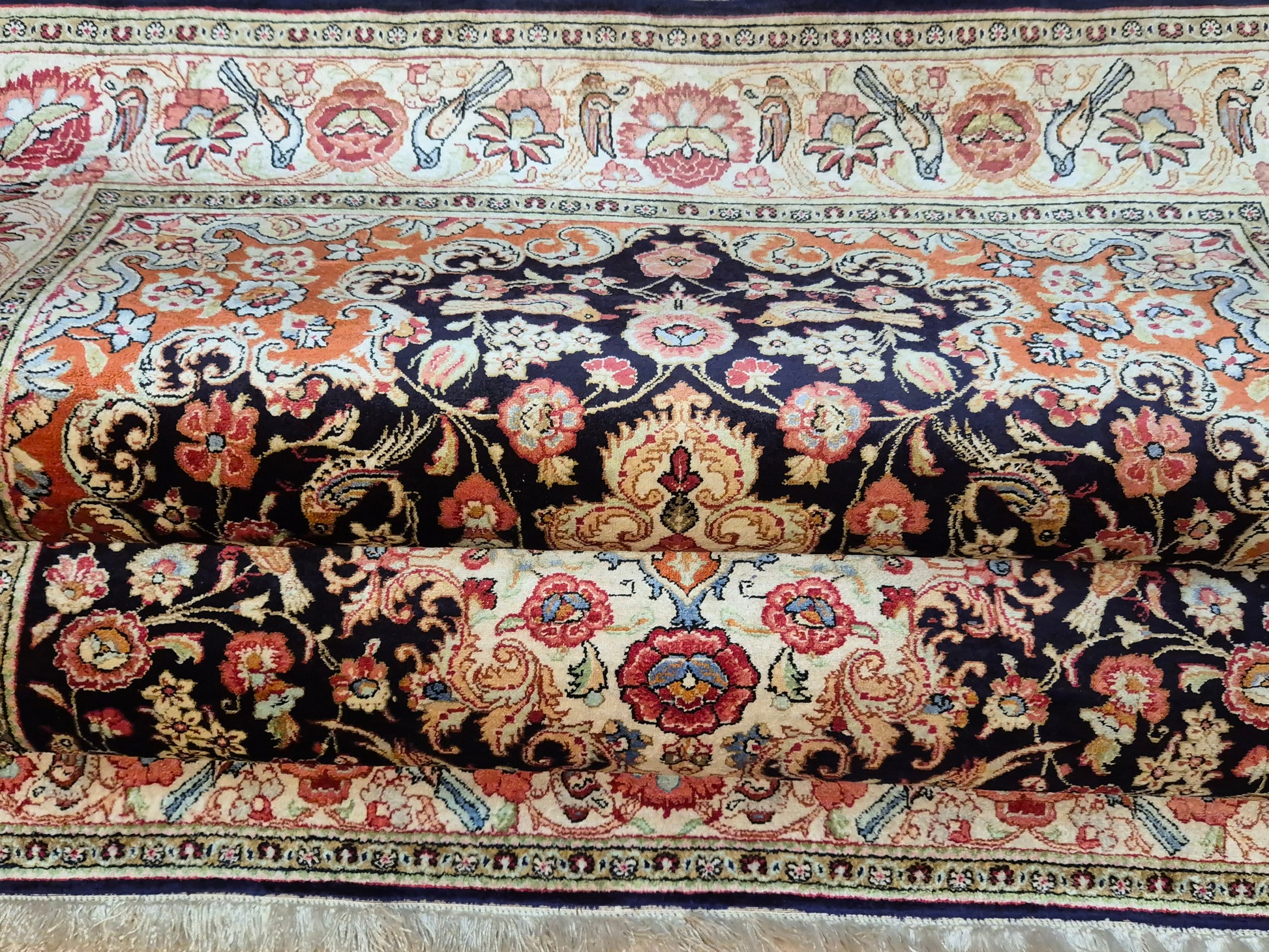 angeboten wird ein prachtvoller Ghom Teppich aus 100 % Seide auf Seide, handgeknüpft mit sehr feiner Knotung. Im Zentrum befindet sich ein kunstvoll gestaltetes Medaillon in Elfenbein und Rostrot, eingebettet in ein dunkelblaues Fondfeld, das von floralen Blütenranken, Vögeln und Ornamenten durchzogen ist. Die elegante Hauptbordüre in hellen Tönen ist reich mit Blumen- und Vogelmotiven dekoriert, wodurch dieser Teppich eine außergewöhnlich harmonische und repräsentative Wirkung erhält.