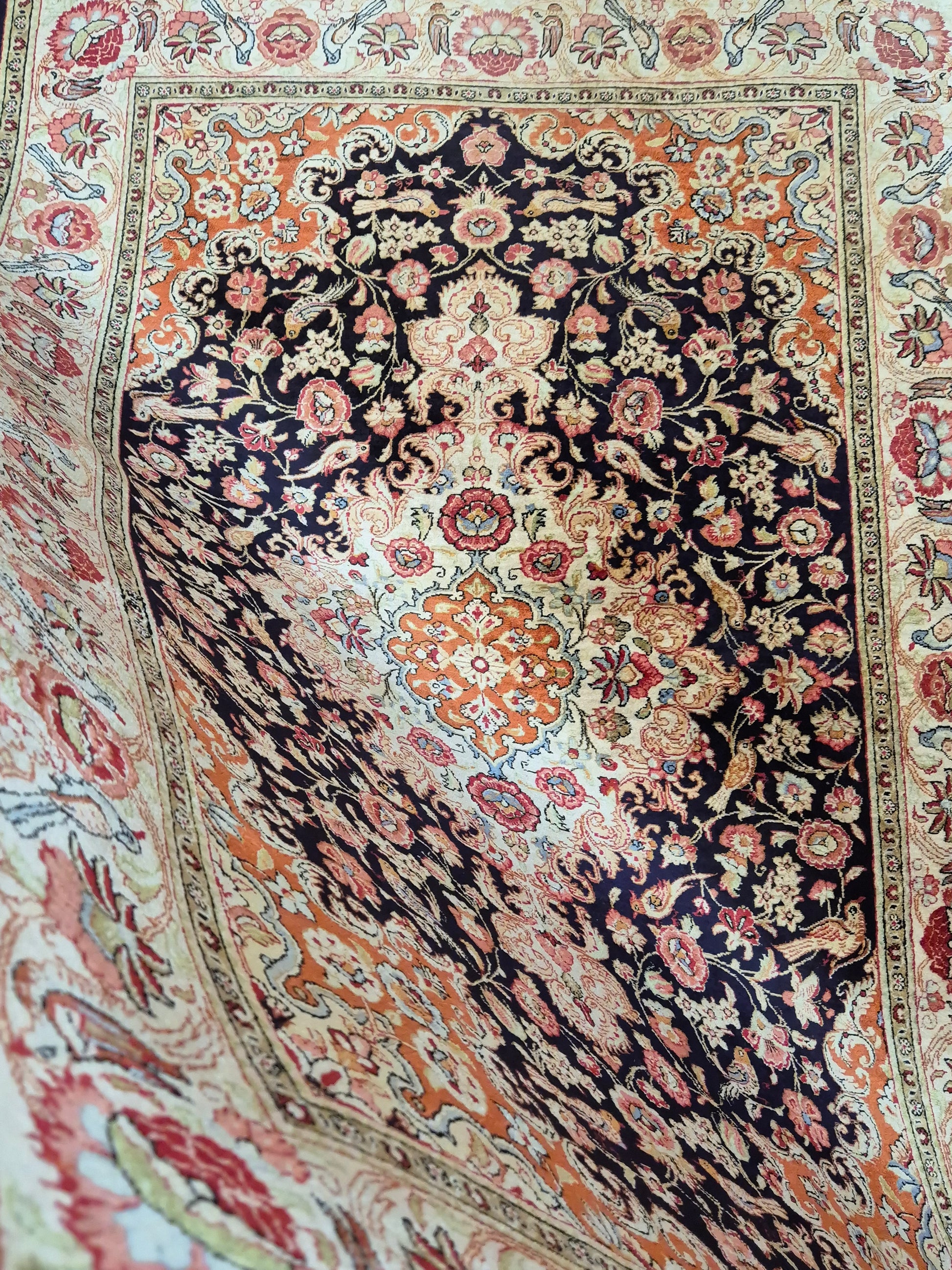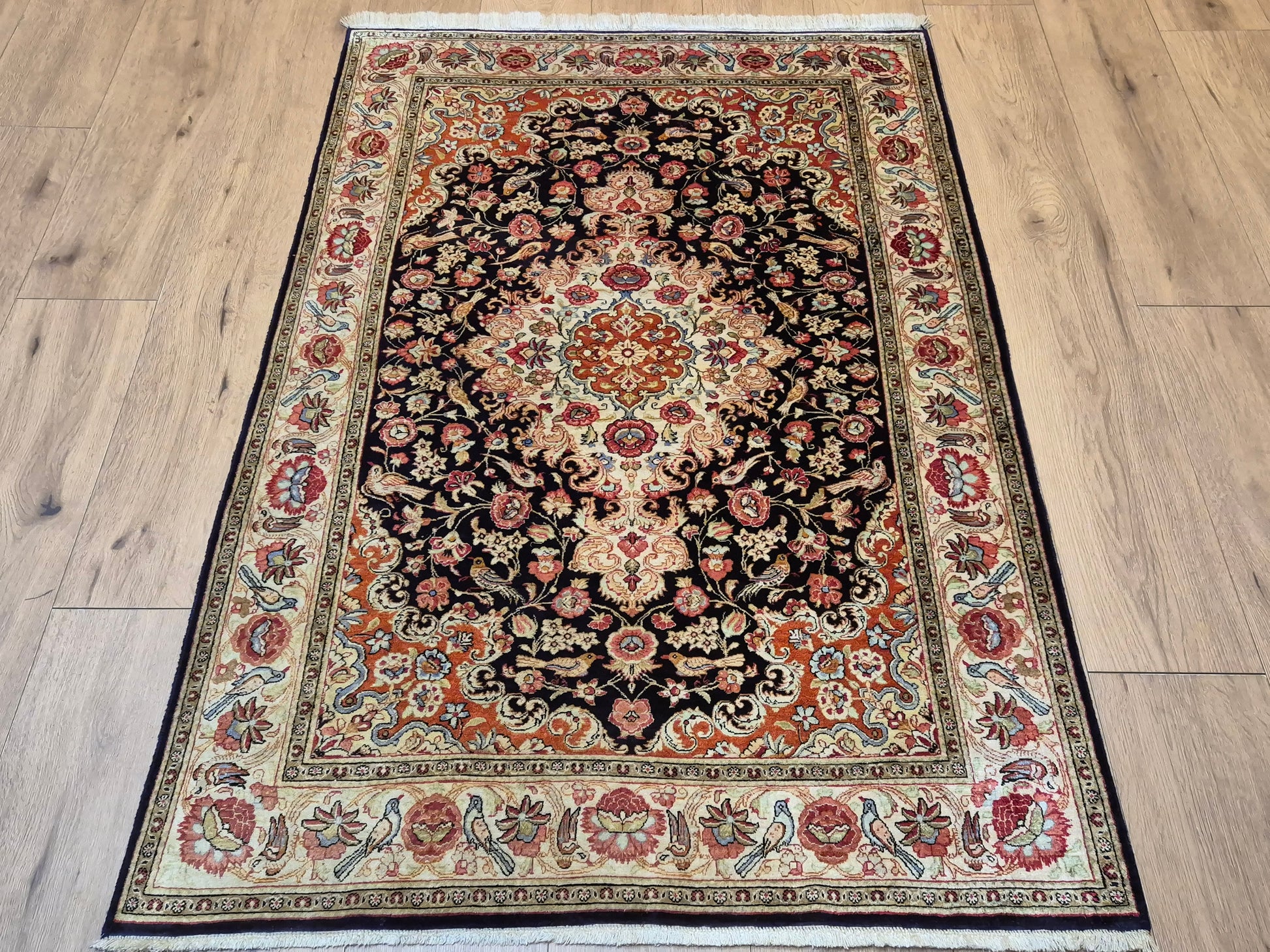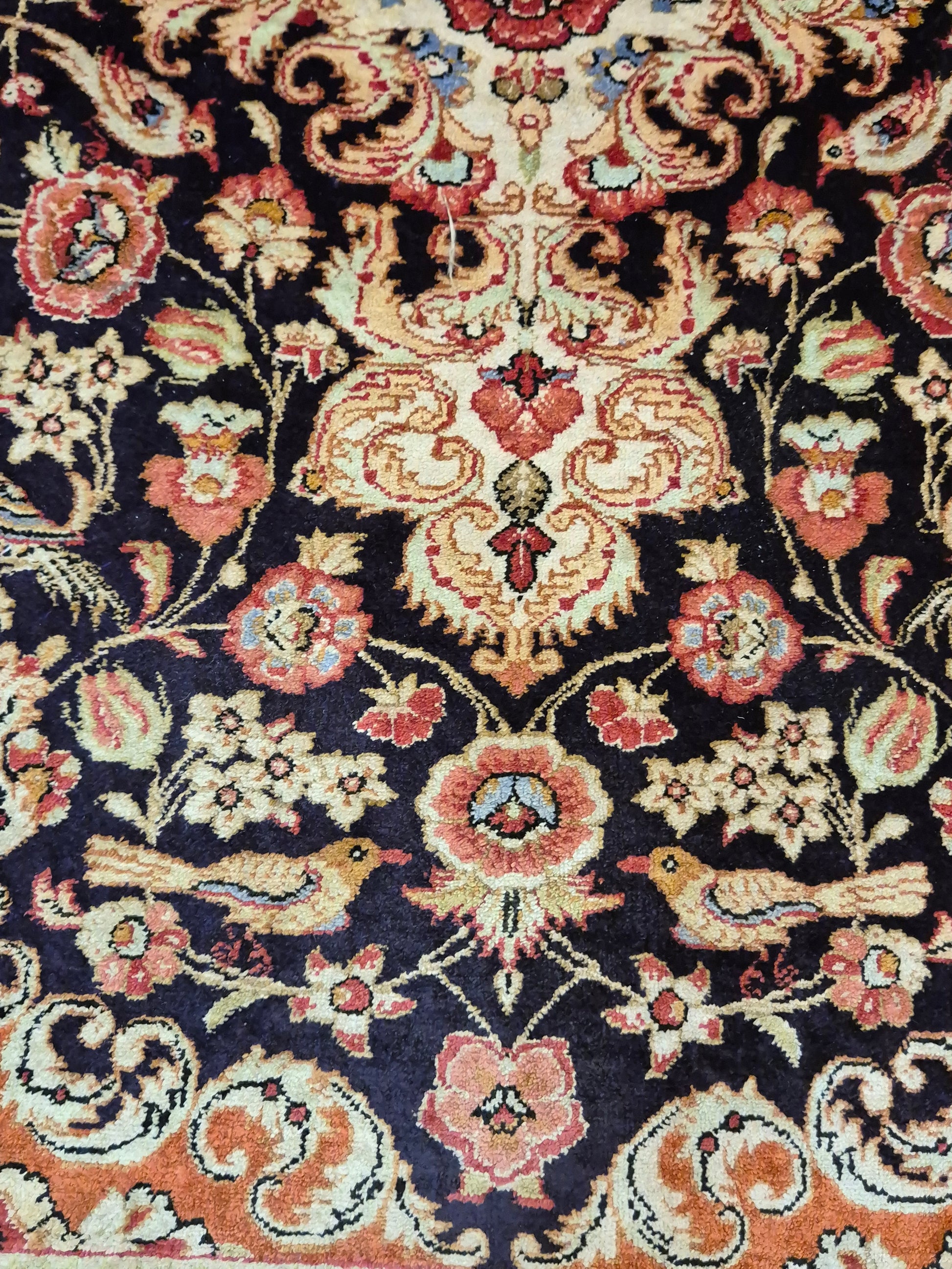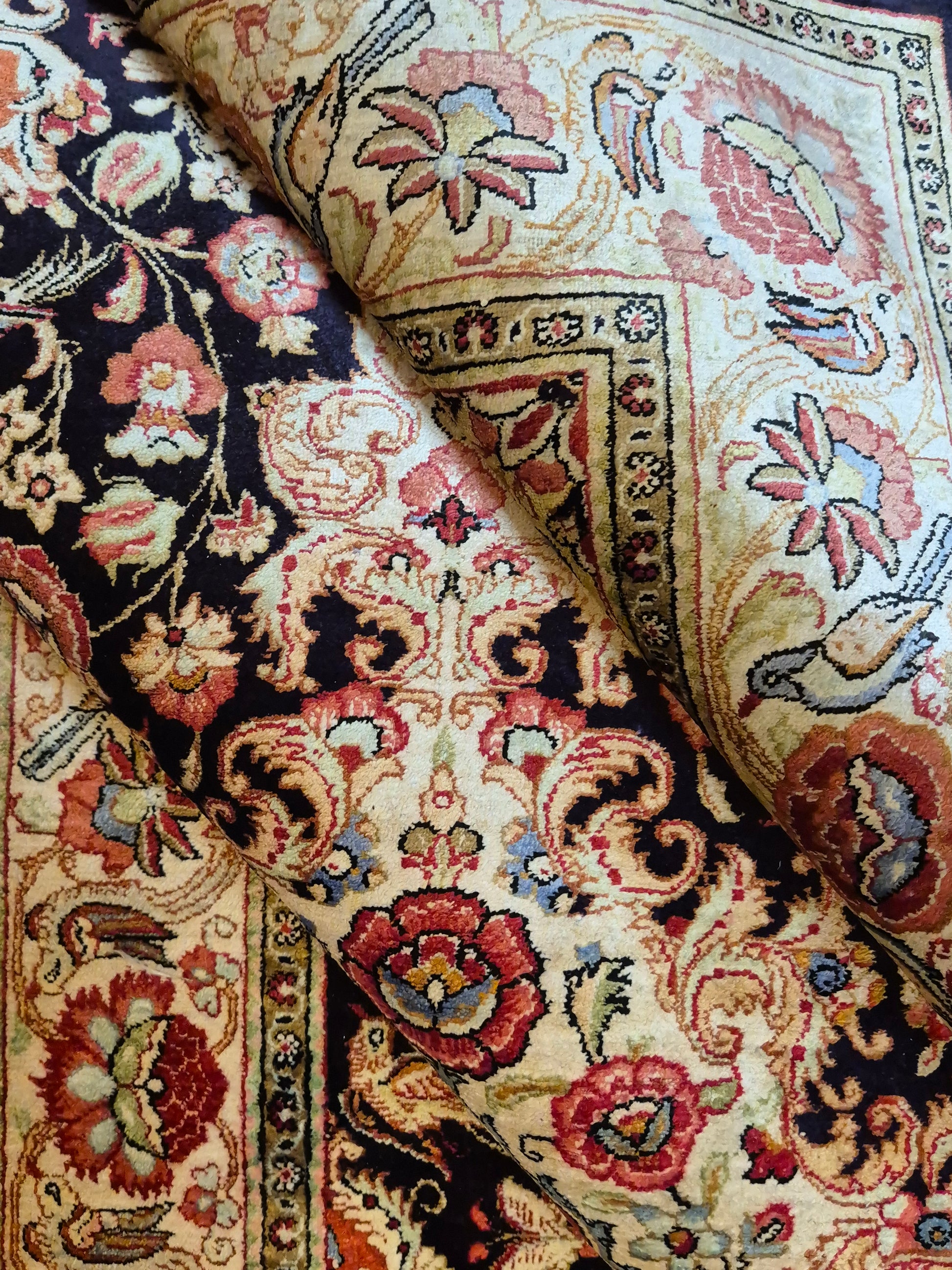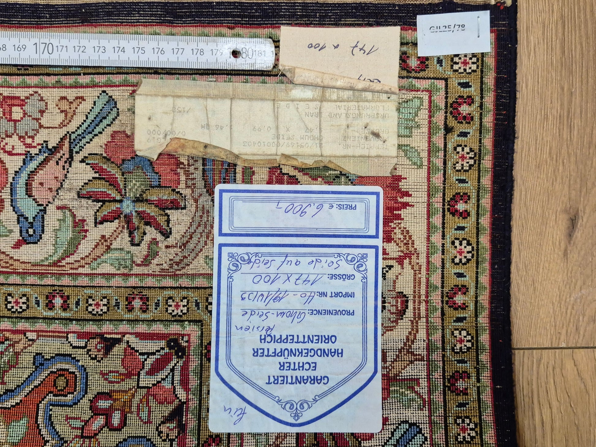 angeboten wird ein prachtvoller Ghom Teppich aus 100 % Seide auf Seide, handgeknüpft mit sehr feiner Knotung. Im Zentrum befindet sich ein kunstvoll gestaltetes Medaillon in Elfenbein und Rostrot, eingebettet in ein dunkelblaues Fondfeld, das von floralen Blütenranken, Vögeln und Ornamenten durchzogen ist. Die elegante Hauptbordüre in hellen Tönen ist reich mit Blumen- und Vogelmotiven dekoriert, wodurch dieser Teppich eine außergewöhnlich harmonische und repräsentative Wirkung erhält.