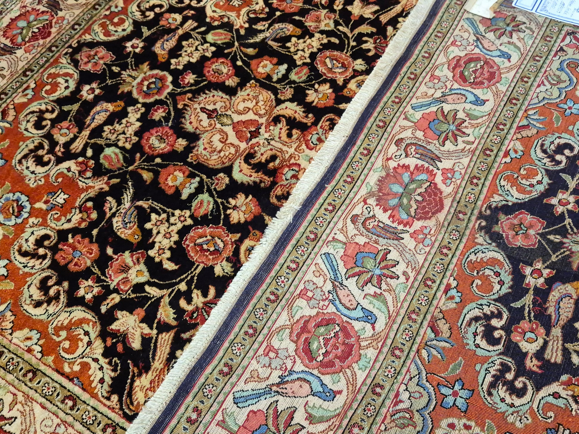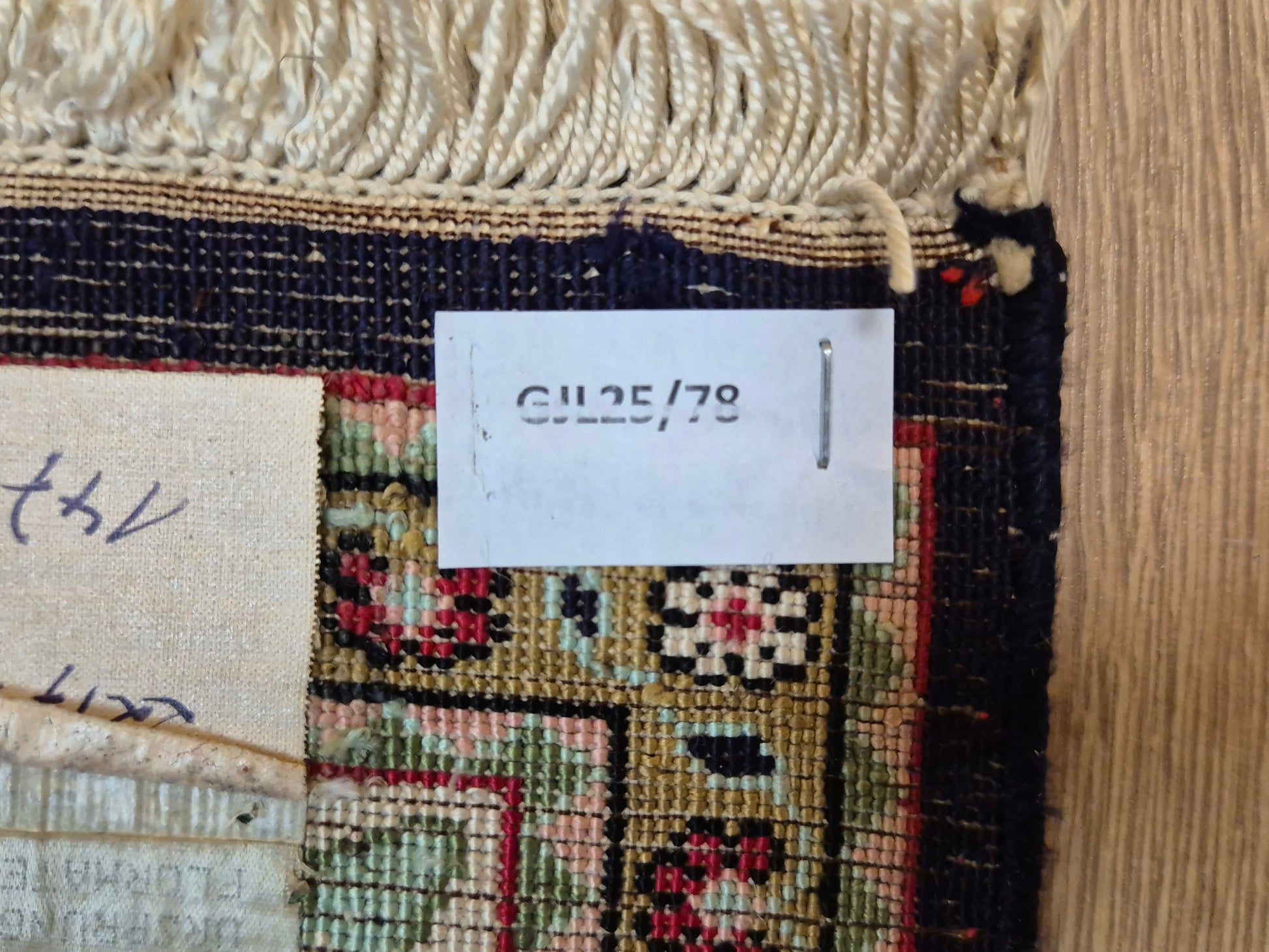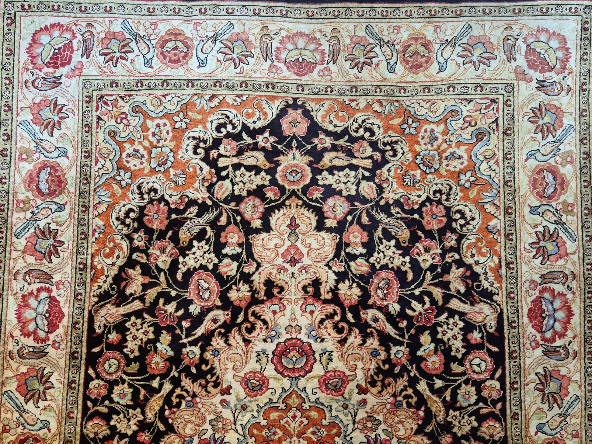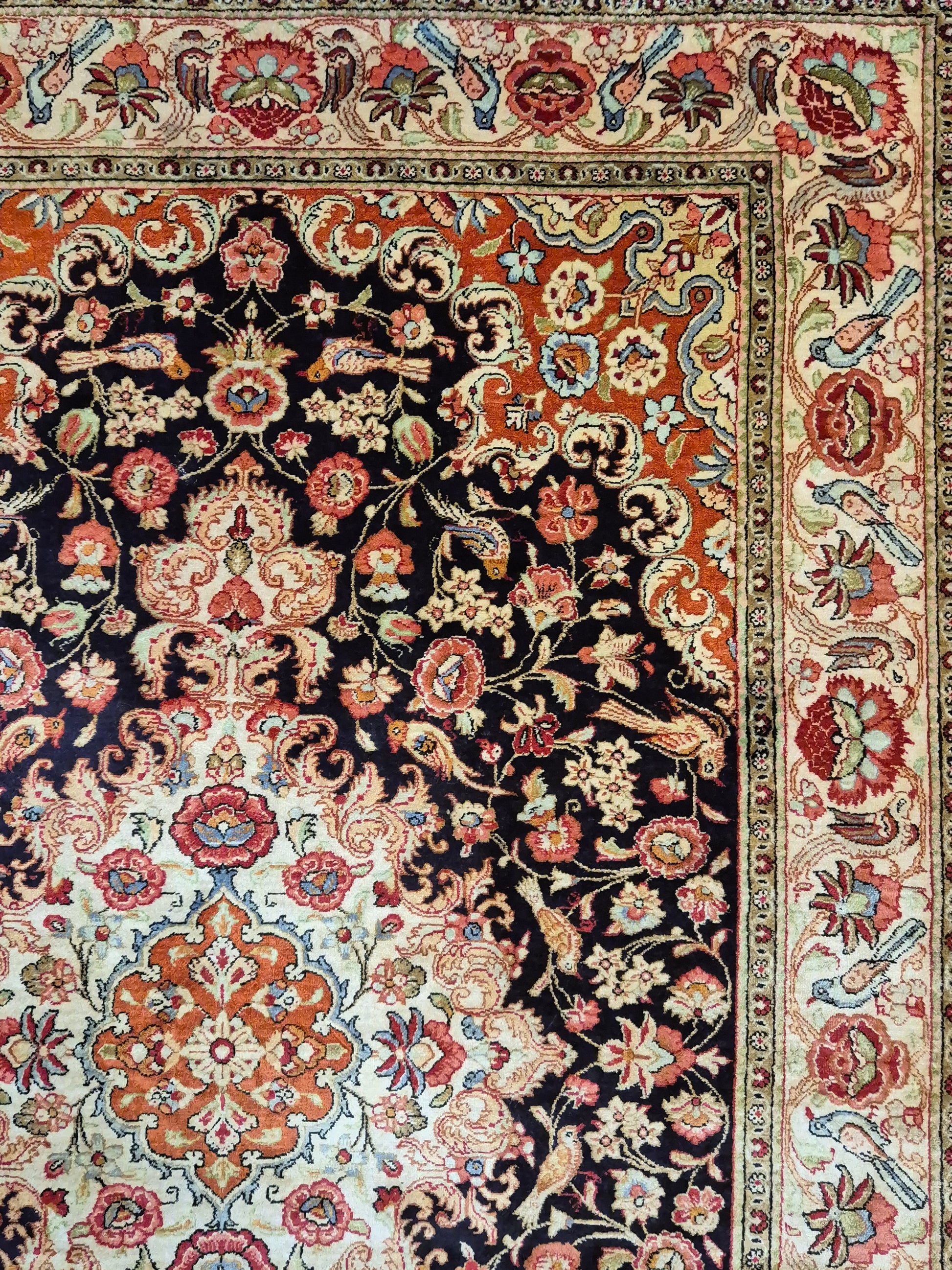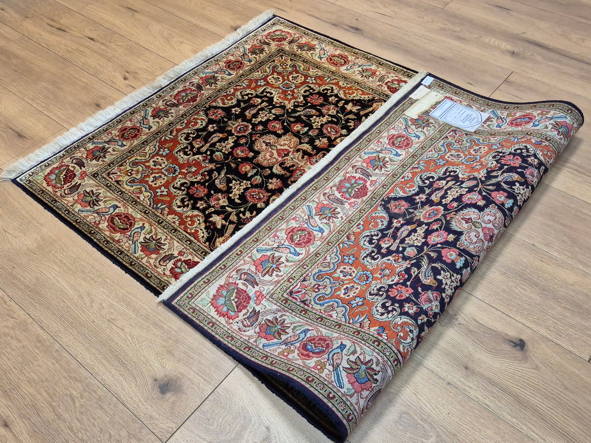 angeboten wird ein prachtvoller Ghom Teppich aus 100 % Seide auf Seide, handgeknüpft mit sehr feiner Knotung. Im Zentrum befindet sich ein kunstvoll gestaltetes Medaillon in Elfenbein und Rostrot, eingebettet in ein dunkelblaues Fondfeld, das von floralen Blütenranken, Vögeln und Ornamenten durchzogen ist. Die elegante Hauptbordüre in hellen Tönen ist reich mit Blumen- und Vogelmotiven dekoriert, wodurch dieser Teppich eine außergewöhnlich harmonische und repräsentative Wirkung erhält.