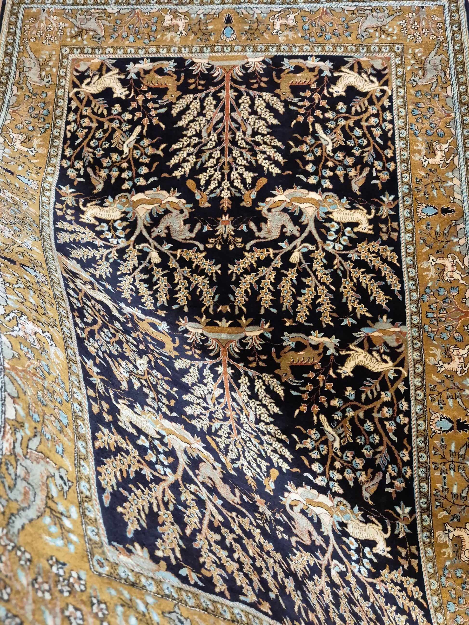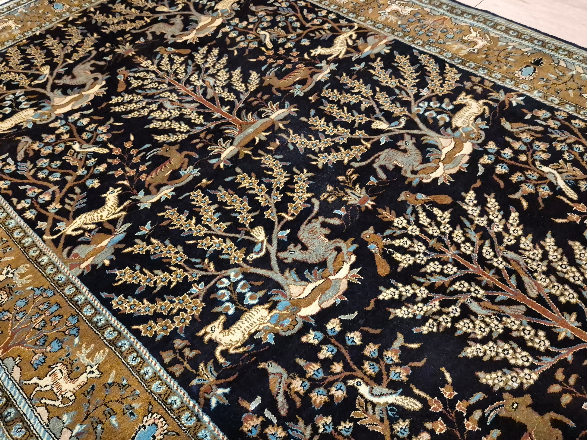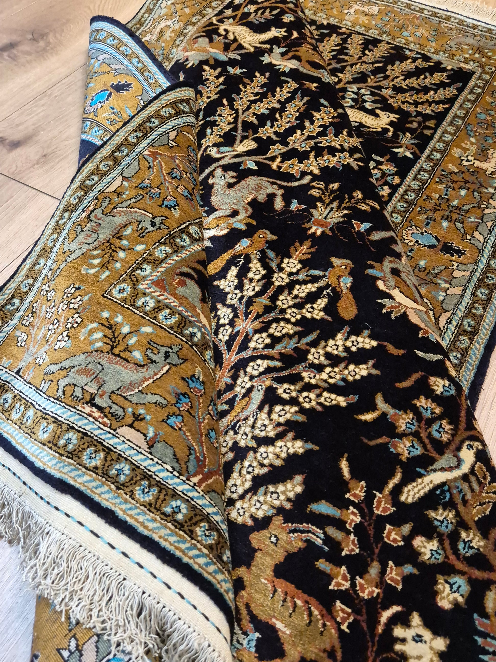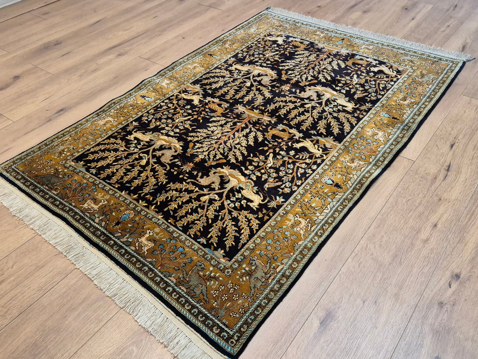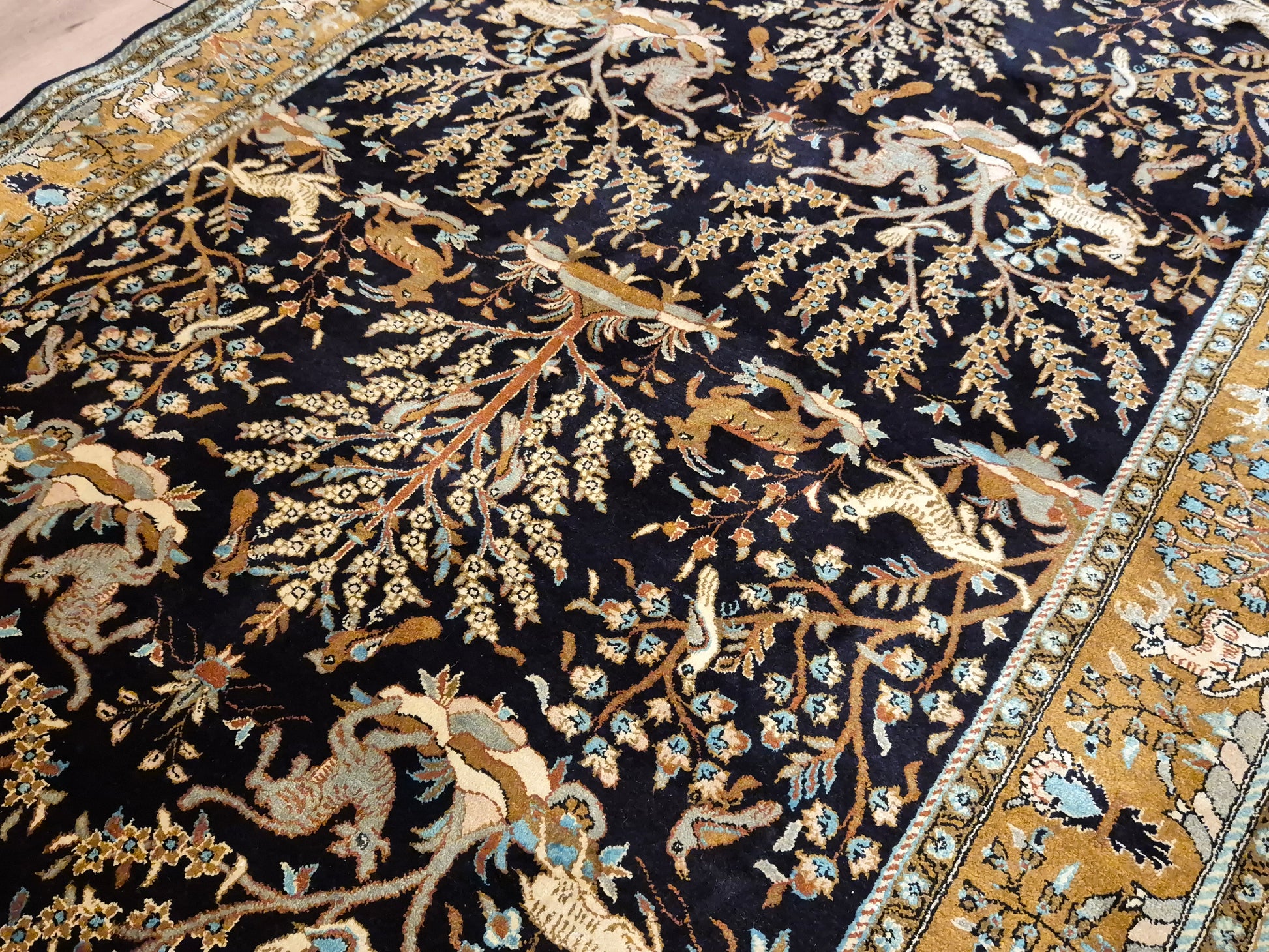 angeboten wird ein exklusiver Ghom Teppich aus 100 % Seide auf Seide, meisterhaft handgeknüpft mit hoher Knotendichte. Das eindrucksvolle Motiv zeigt eine Jagdszene mit Hirschen, Gazellen, mythischen Tieren und Vögeln, eingebettet in eine feingliedrige Baum- und Rankenlandschaft. Die detailreiche Bordüre in Gold- und Türkistönen ist mit floralen Mustern und Tierdarstellungen versehen, wodurch das kunstvolle Gesamtbild eindrucksvoll abgerundet wird.