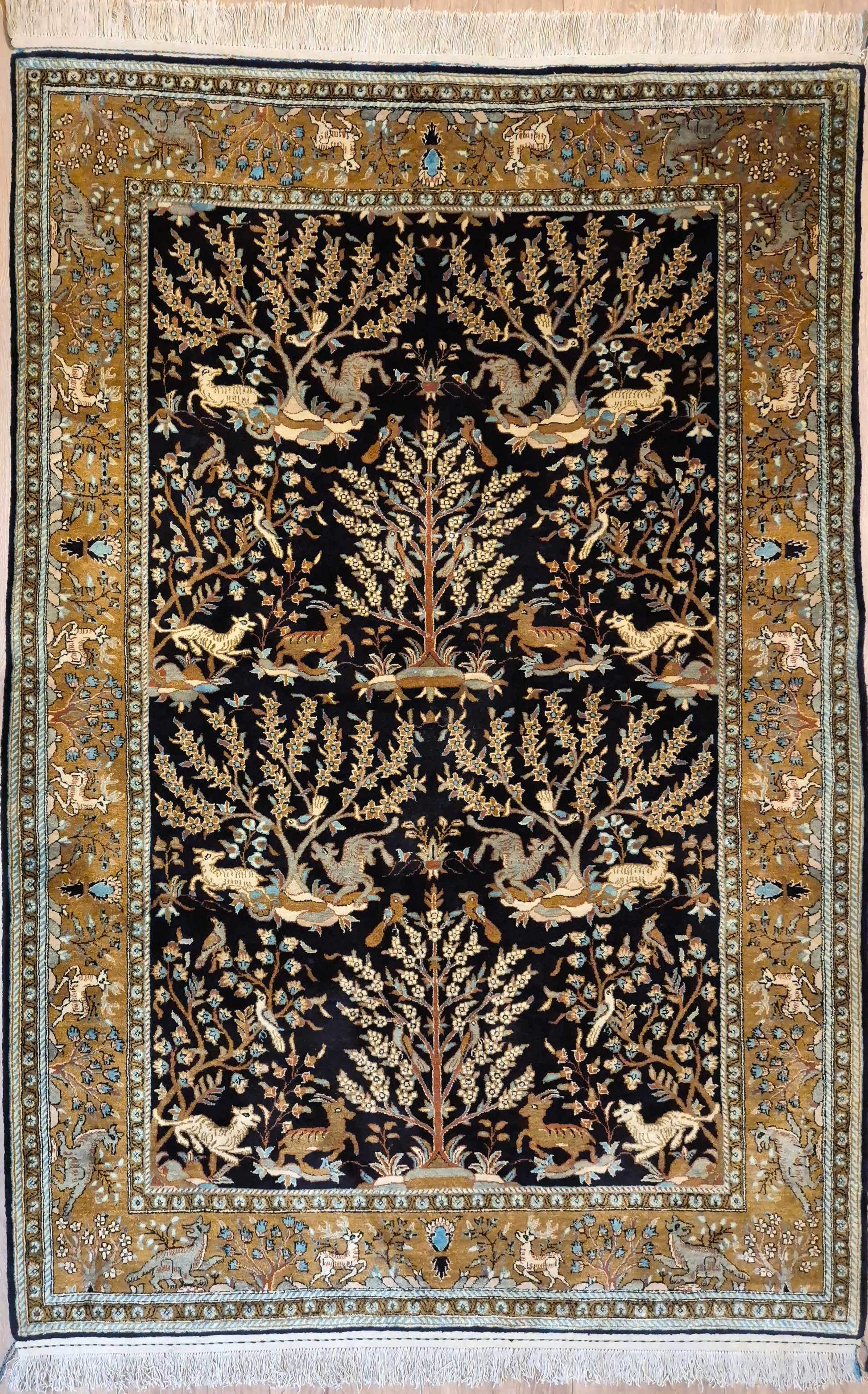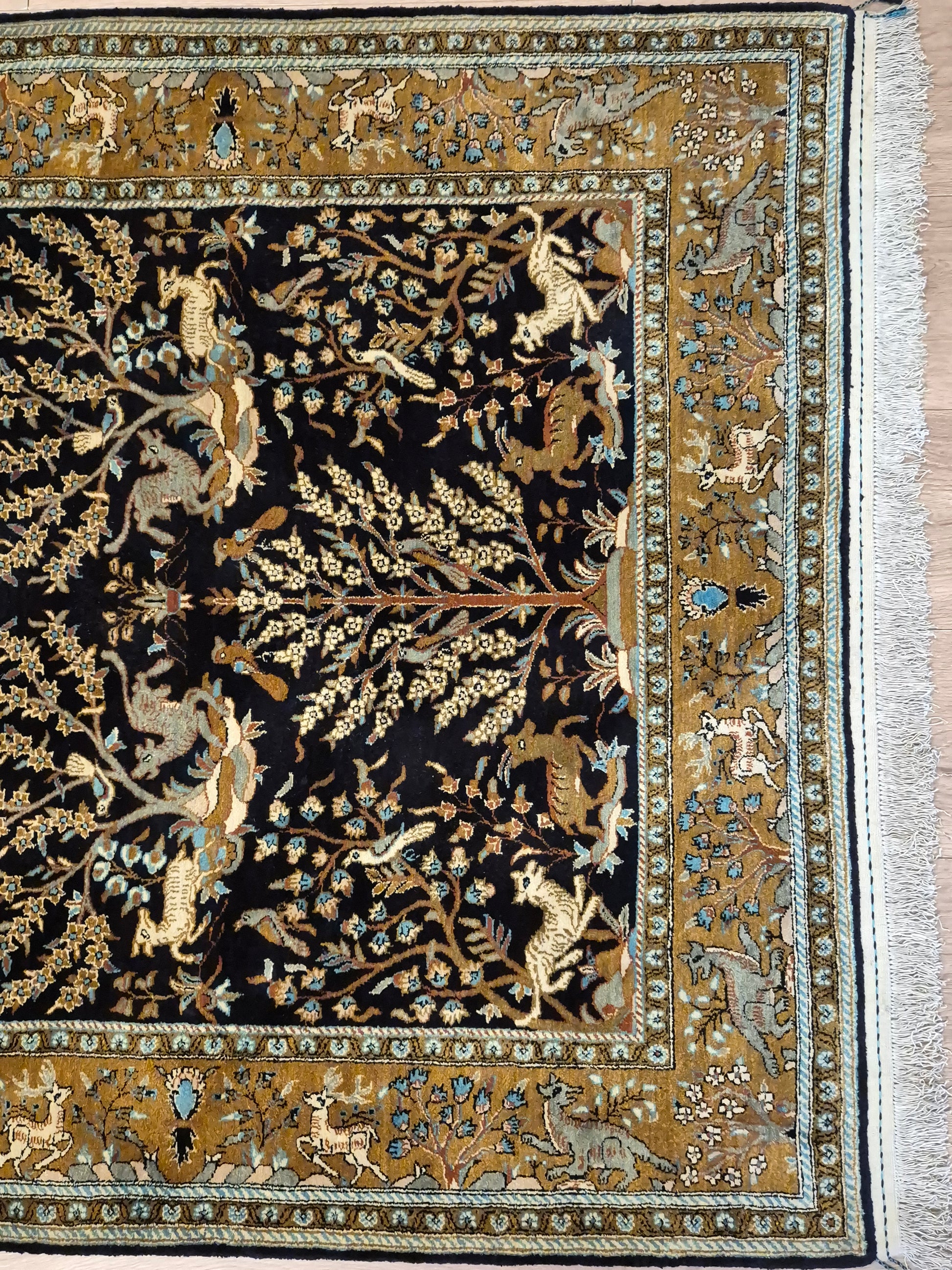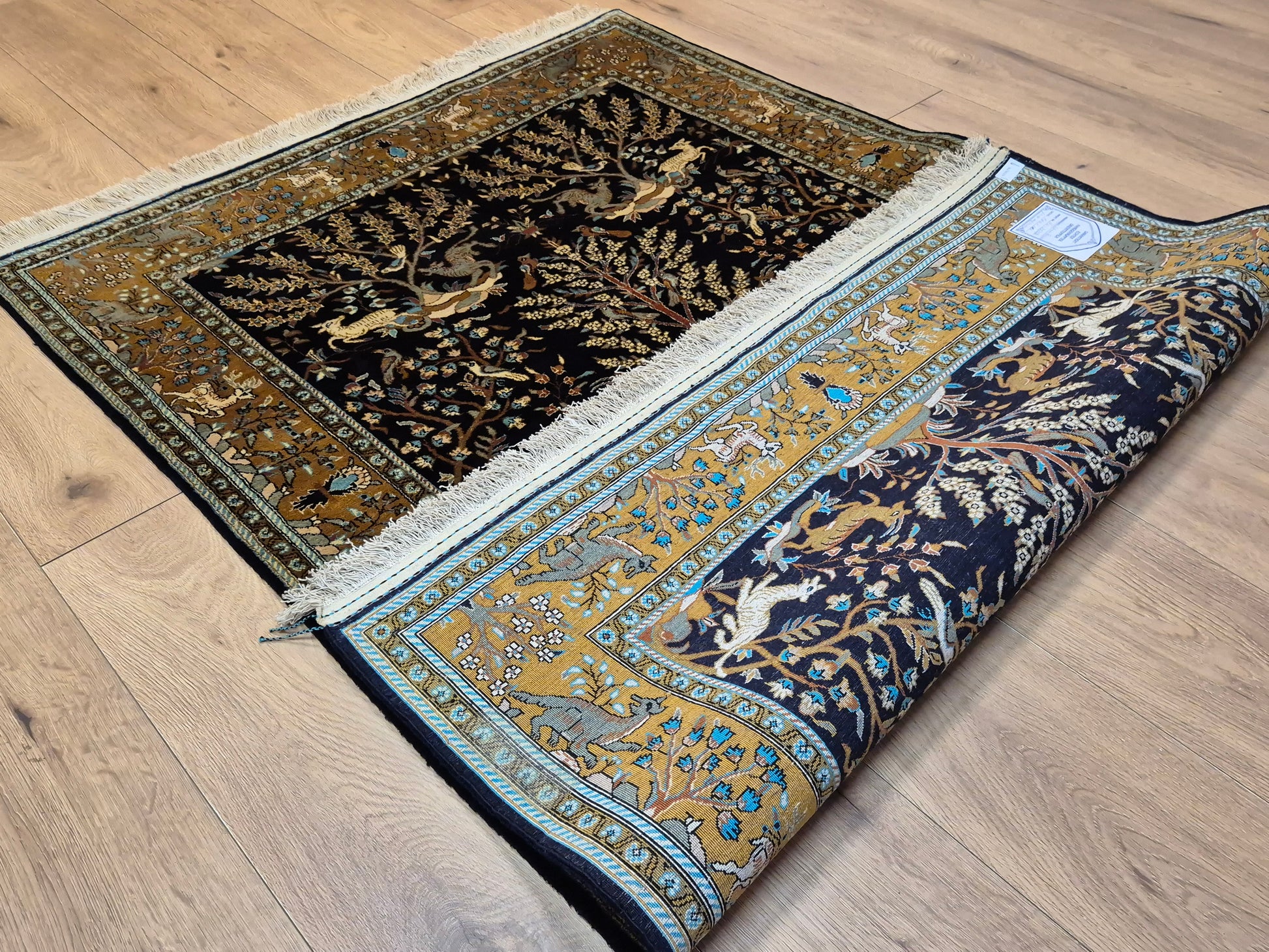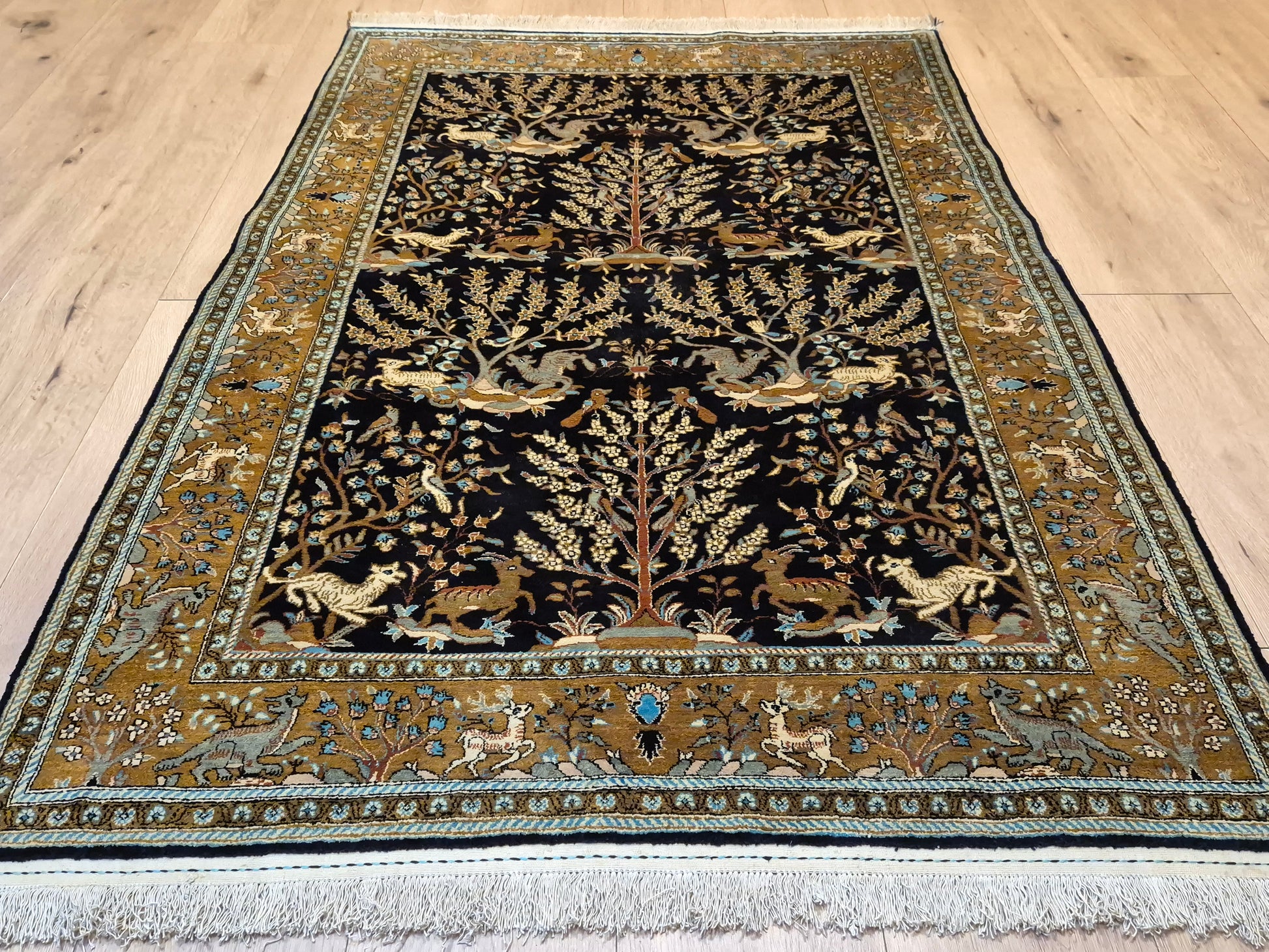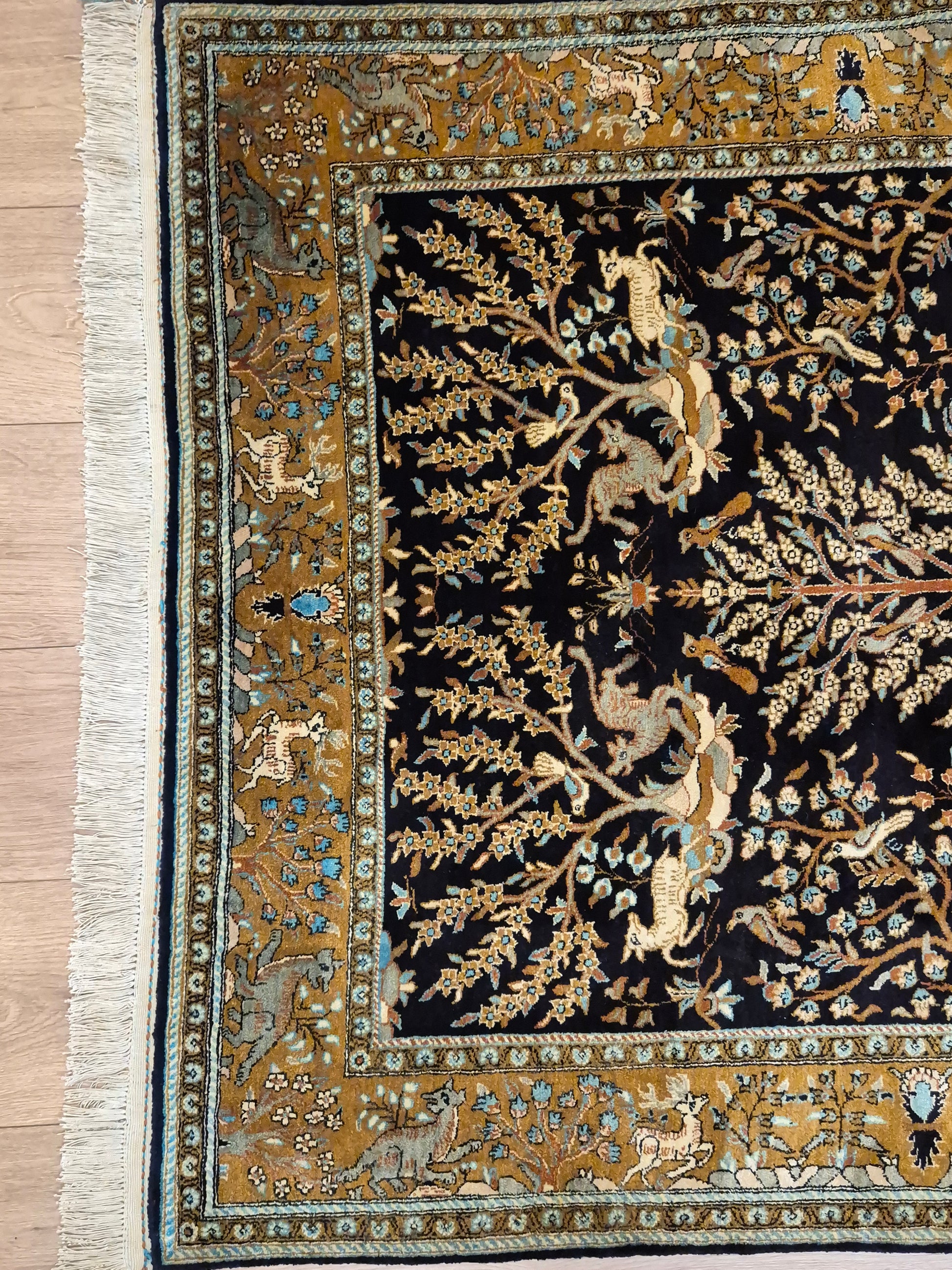 angeboten wird ein exklusiver Ghom Teppich aus 100 % Seide auf Seide, meisterhaft handgeknüpft mit hoher Knotendichte. Das eindrucksvolle Motiv zeigt eine Jagdszene mit Hirschen, Gazellen, mythischen Tieren und Vögeln, eingebettet in eine feingliedrige Baum- und Rankenlandschaft. Die detailreiche Bordüre in Gold- und Türkistönen ist mit floralen Mustern und Tierdarstellungen versehen, wodurch das kunstvolle Gesamtbild eindrucksvoll abgerundet wird.