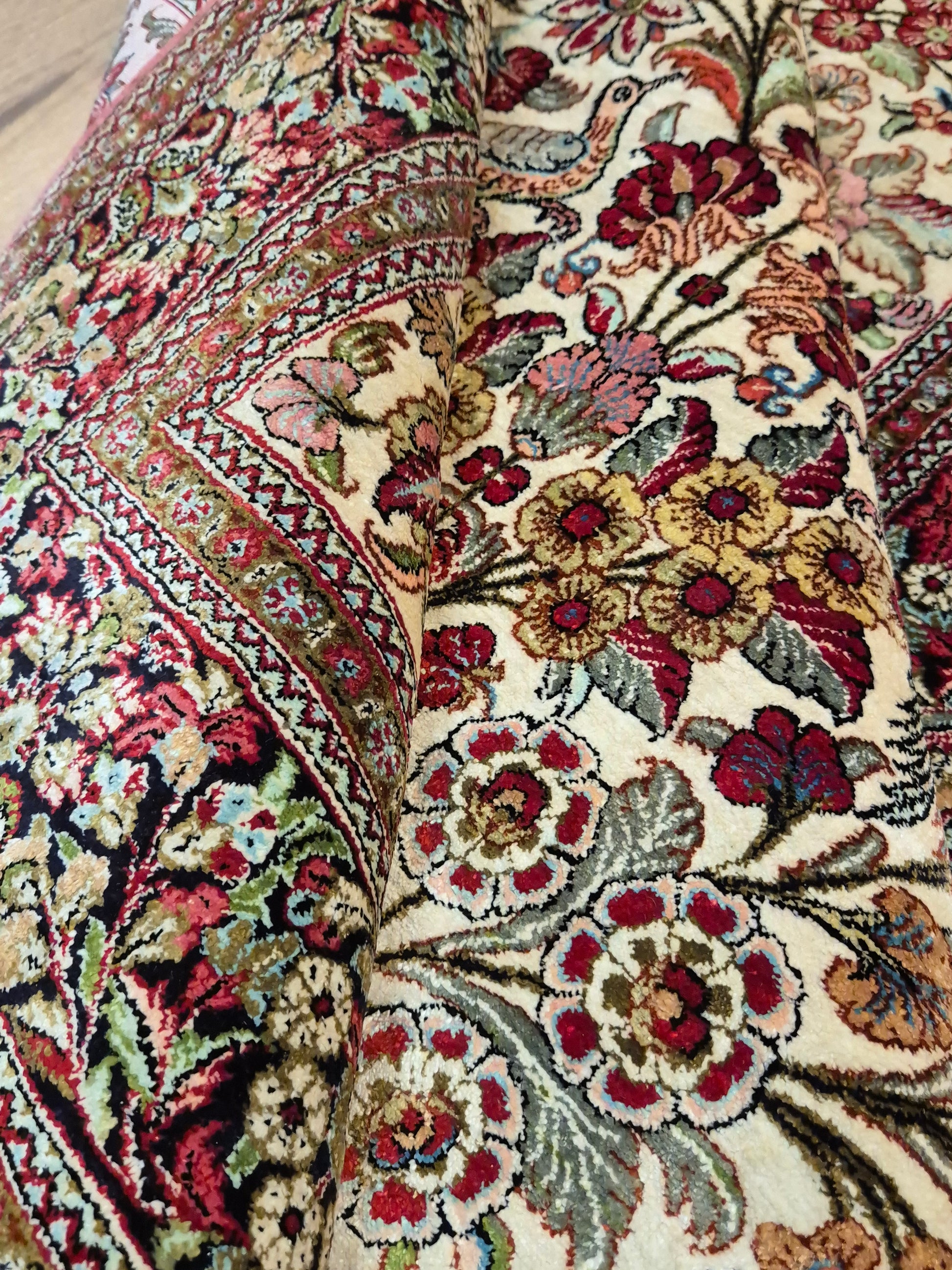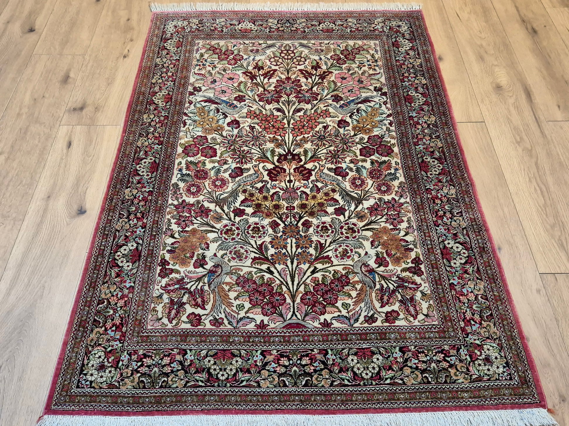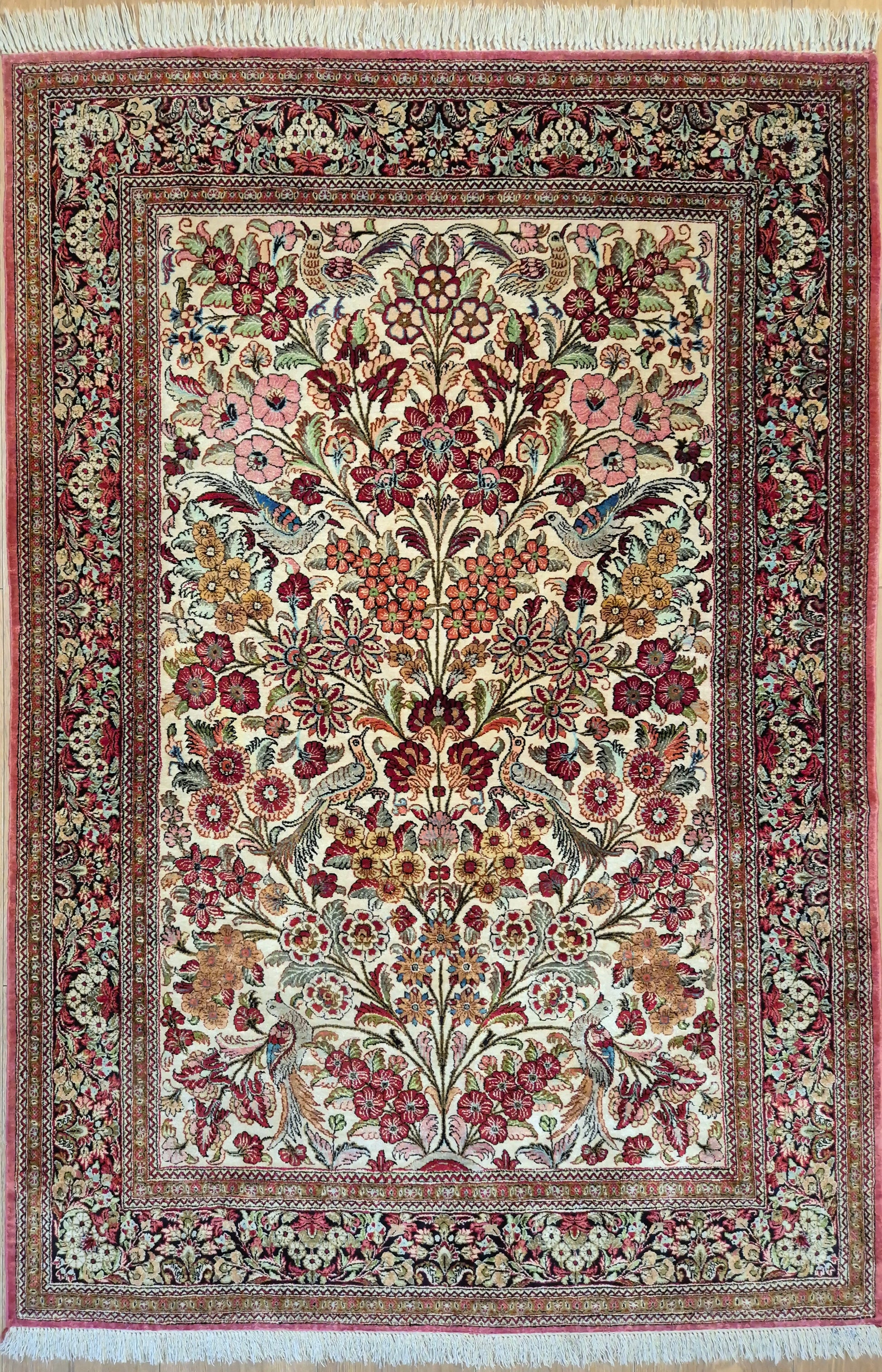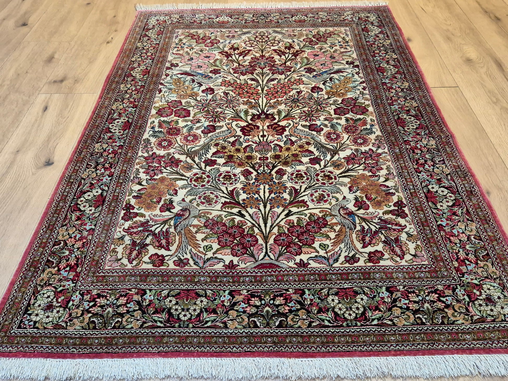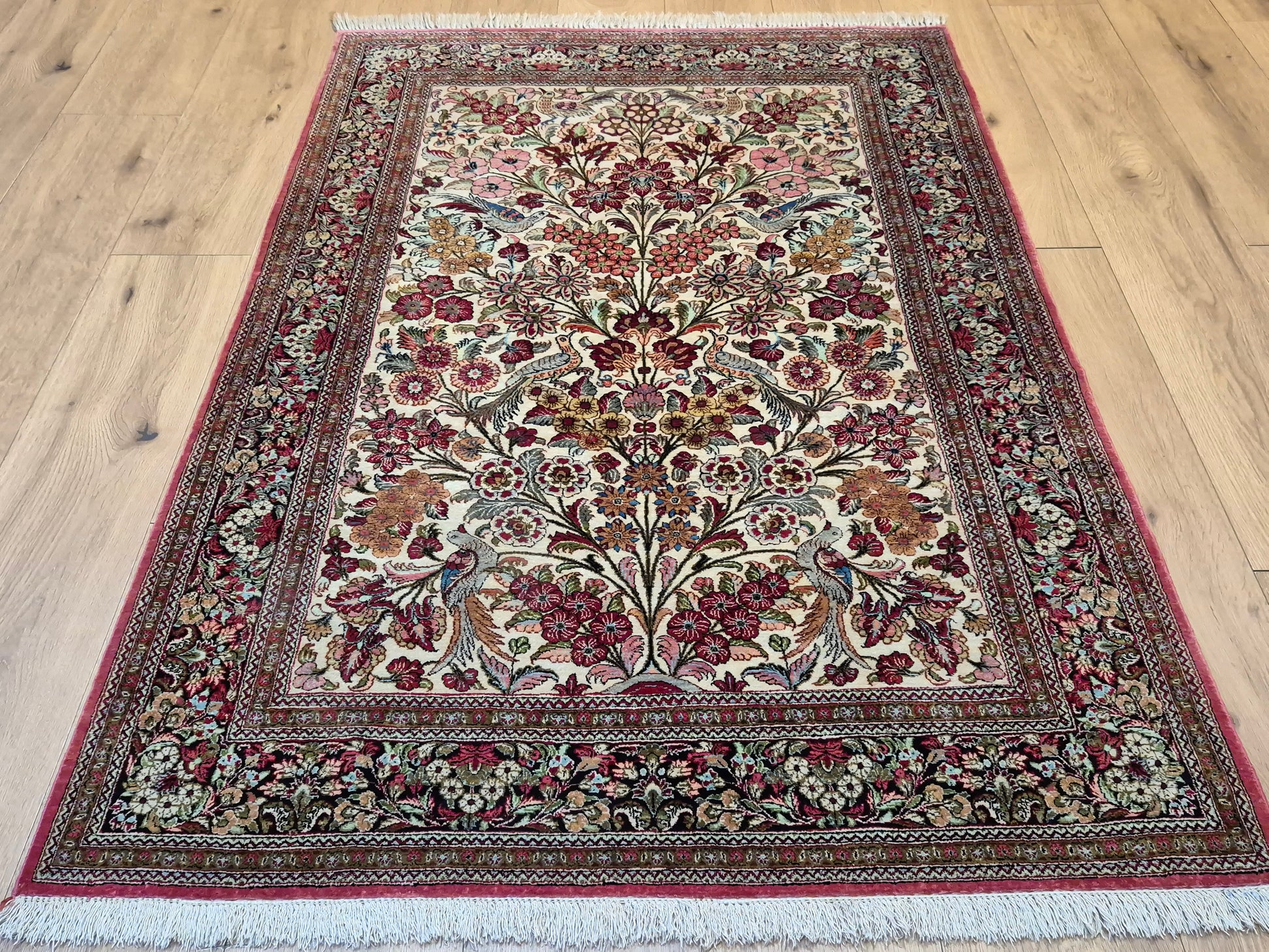 angeboten wird ein edler Ghom Teppich aus 100 % Seide auf Seide, handgeknüpft in feiner Ausführung. Das Motiv zeigt den klassischen Lebensbaum, reich geschmückt mit Blüten in kräftigen Farben sowie kunstvoll eingefügten Vögeln. Der helle Fond bringt die detailreichen floralen Motive eindrucksvoll zur Geltung, während die mehrfache Bordüre in warmen Rottönen mit floralen Ornamenten das Bild harmonisch einfasst.
