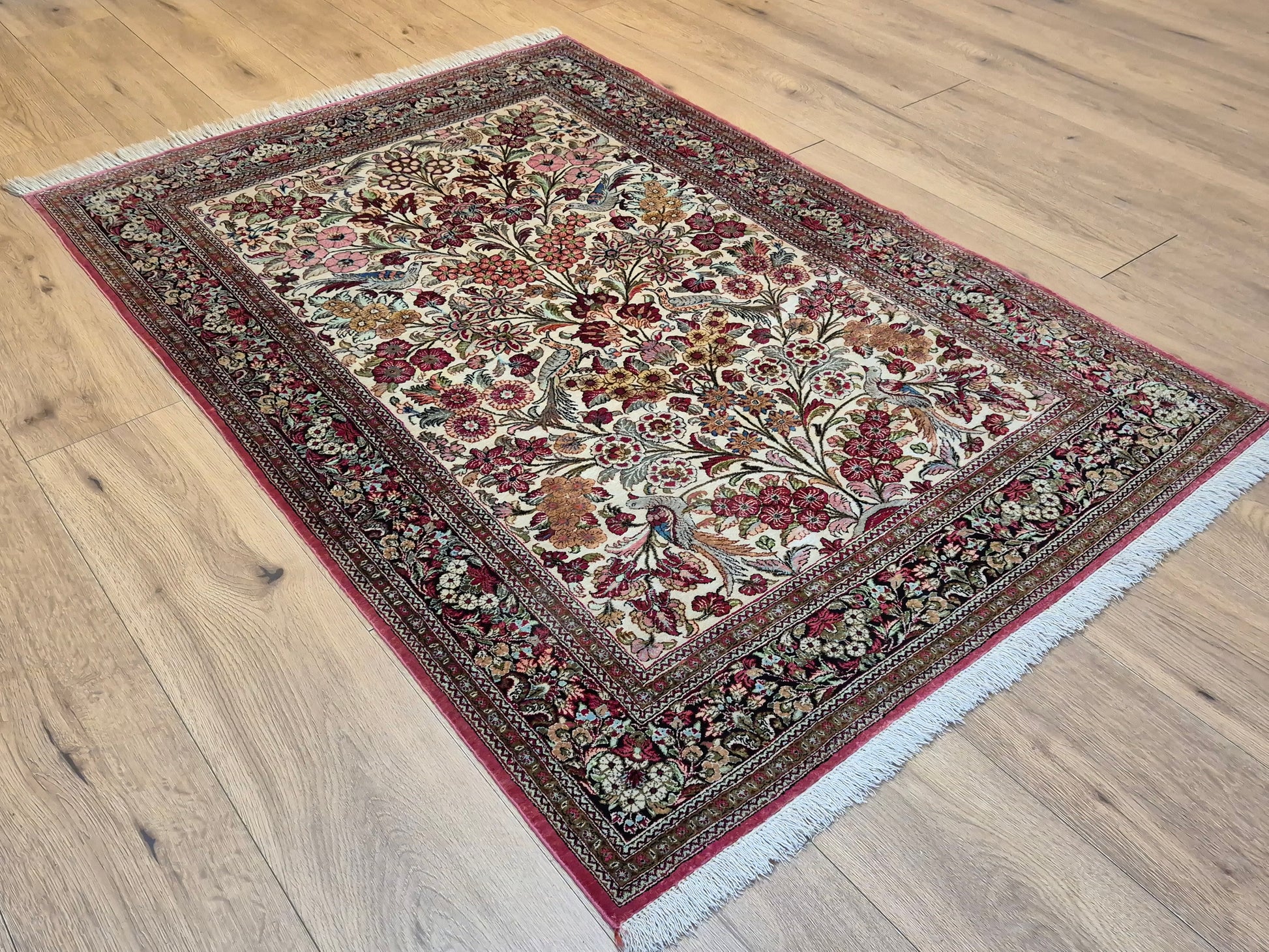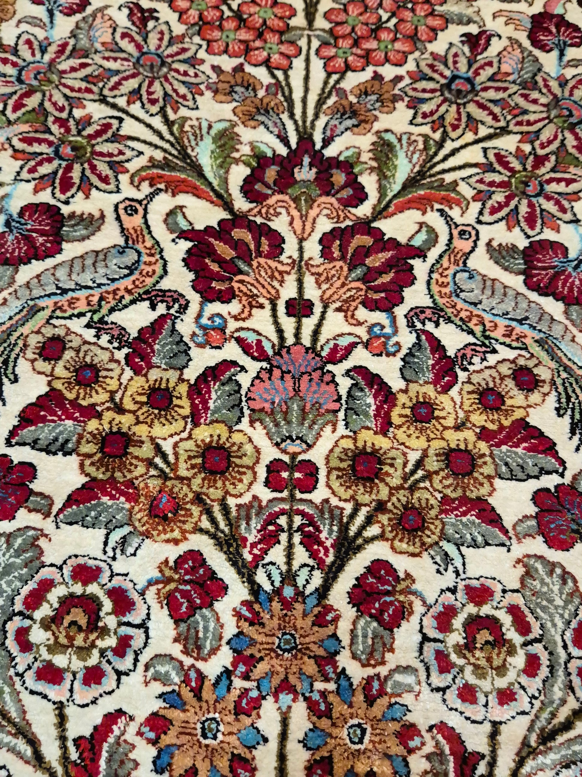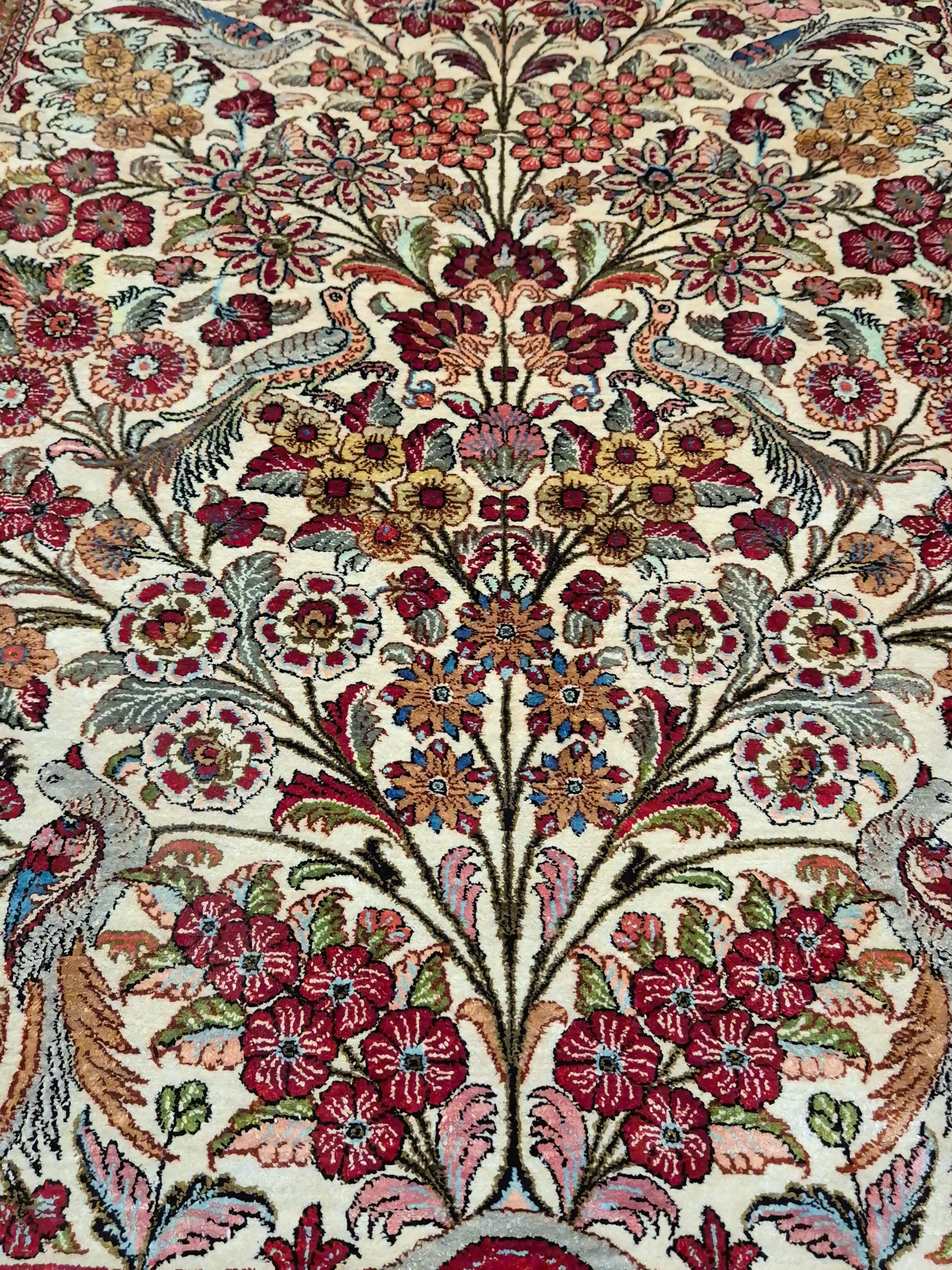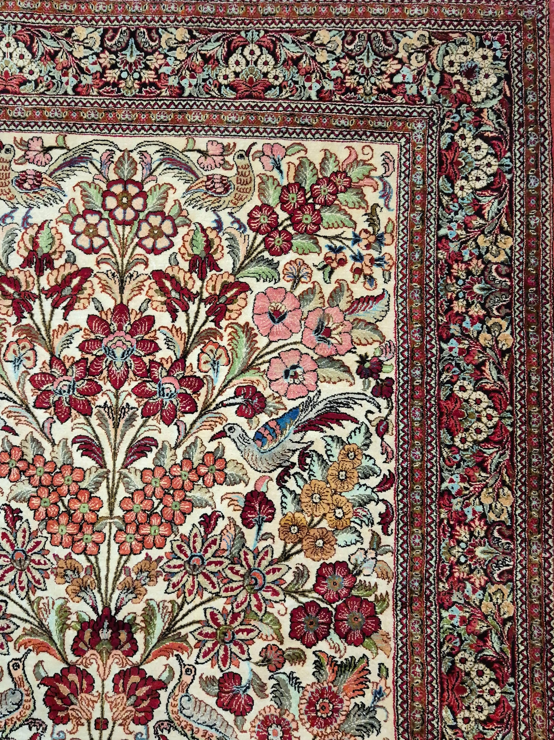 angeboten wird ein edler Ghom Teppich aus 100 % Seide auf Seide, handgeknüpft in feiner Ausführung. Das Motiv zeigt den klassischen Lebensbaum, reich geschmückt mit Blüten in kräftigen Farben sowie kunstvoll eingefügten Vögeln. Der helle Fond bringt die detailreichen floralen Motive eindrucksvoll zur Geltung, während die mehrfache Bordüre in warmen Rottönen mit floralen Ornamenten das Bild harmonisch einfasst.