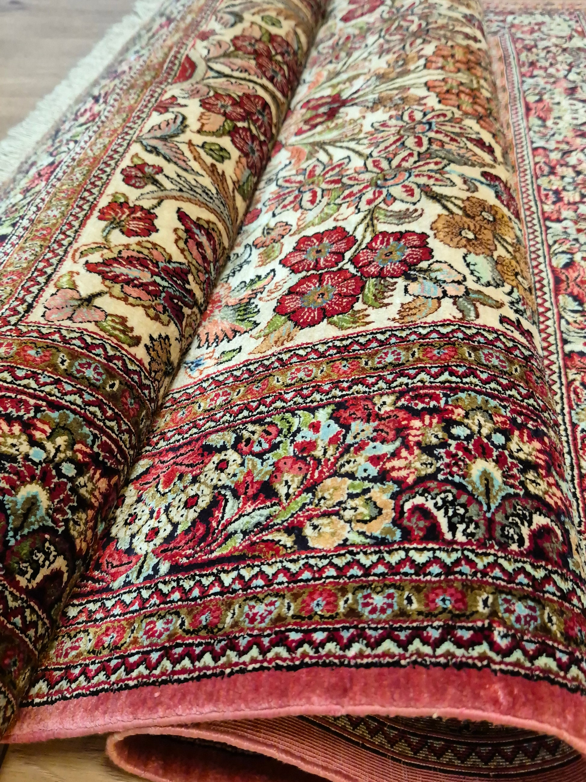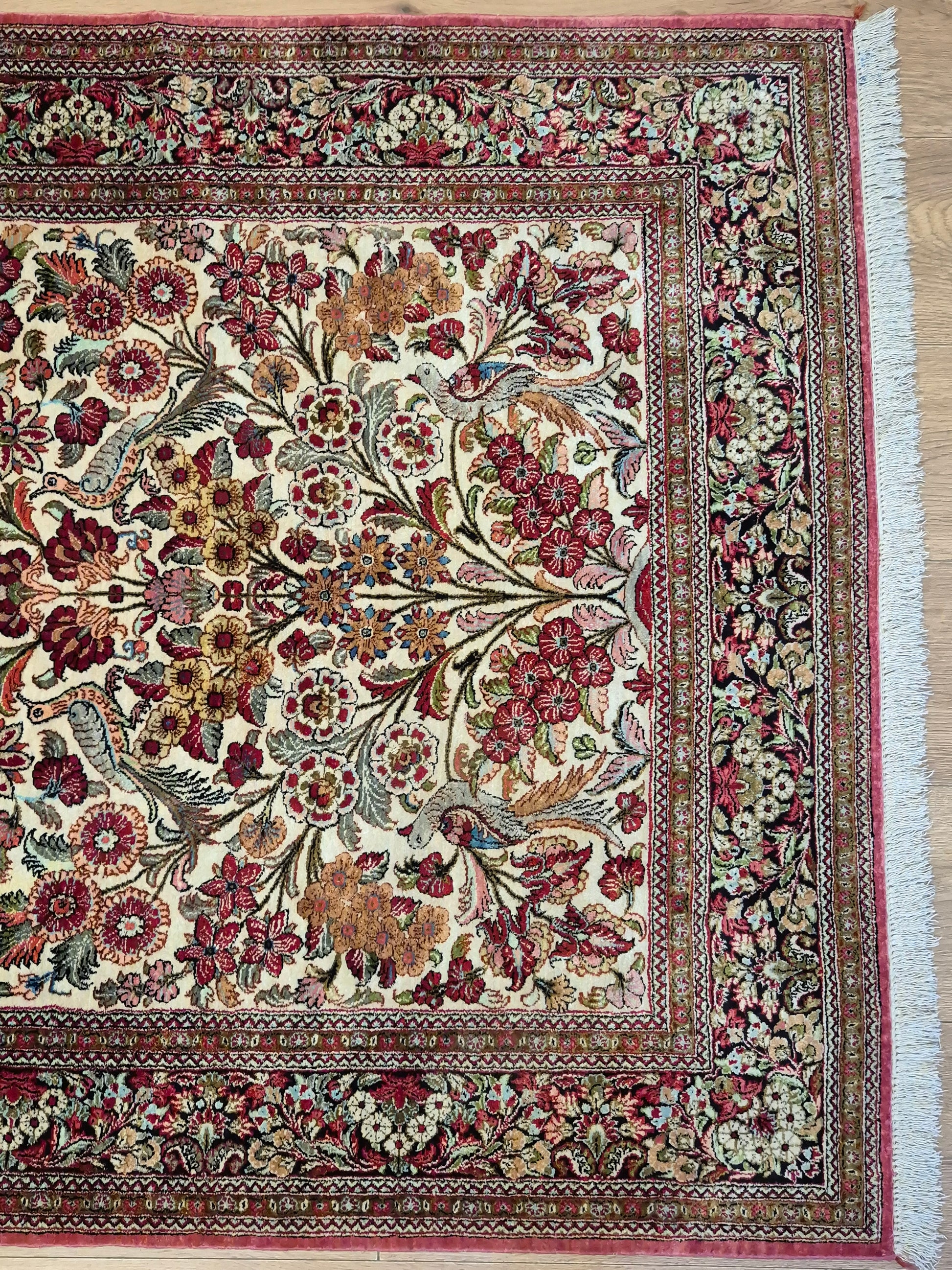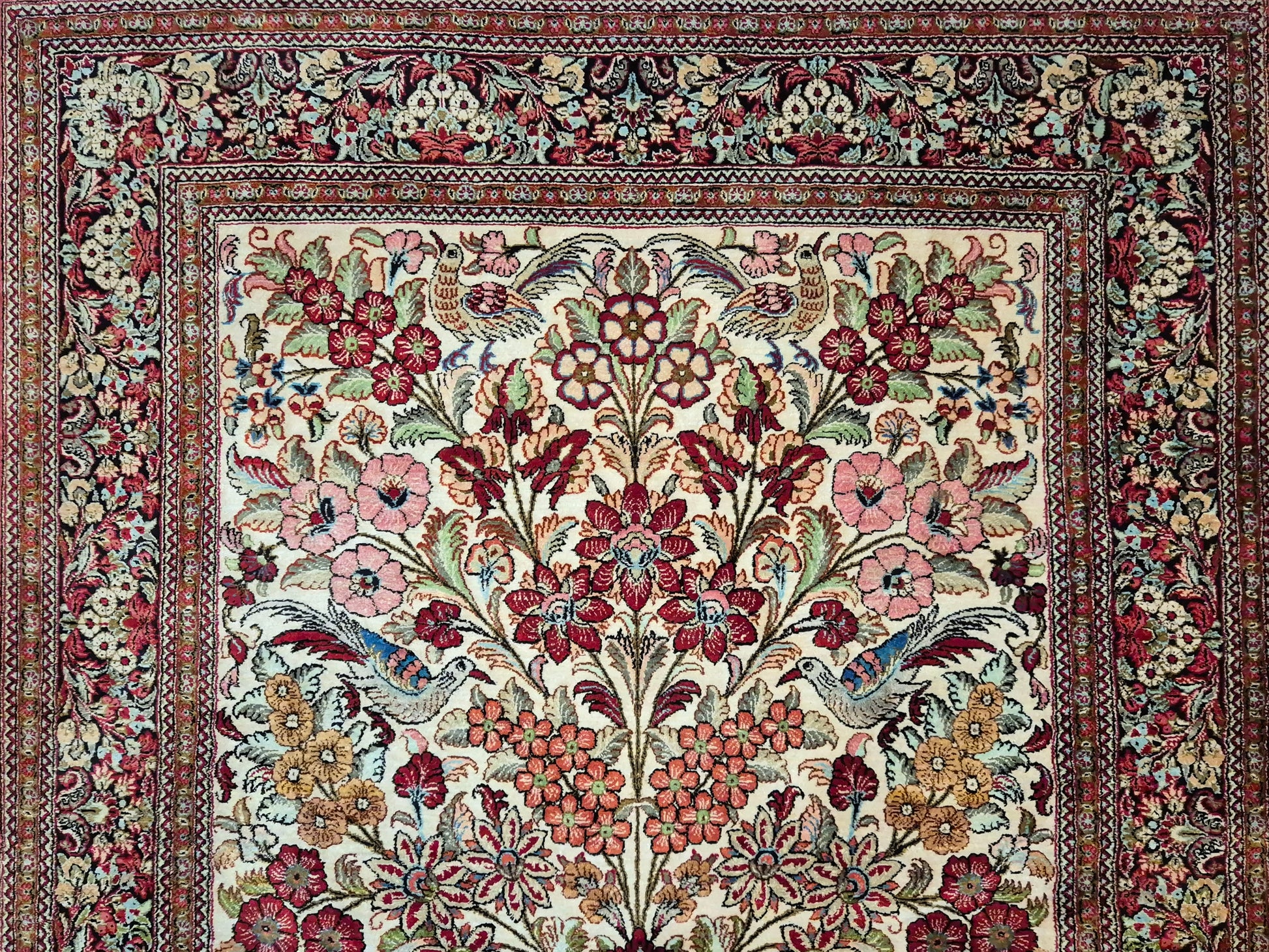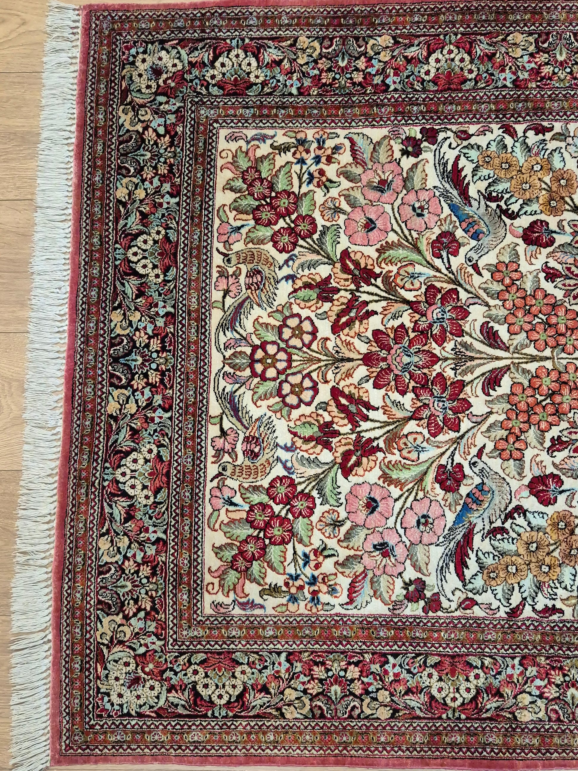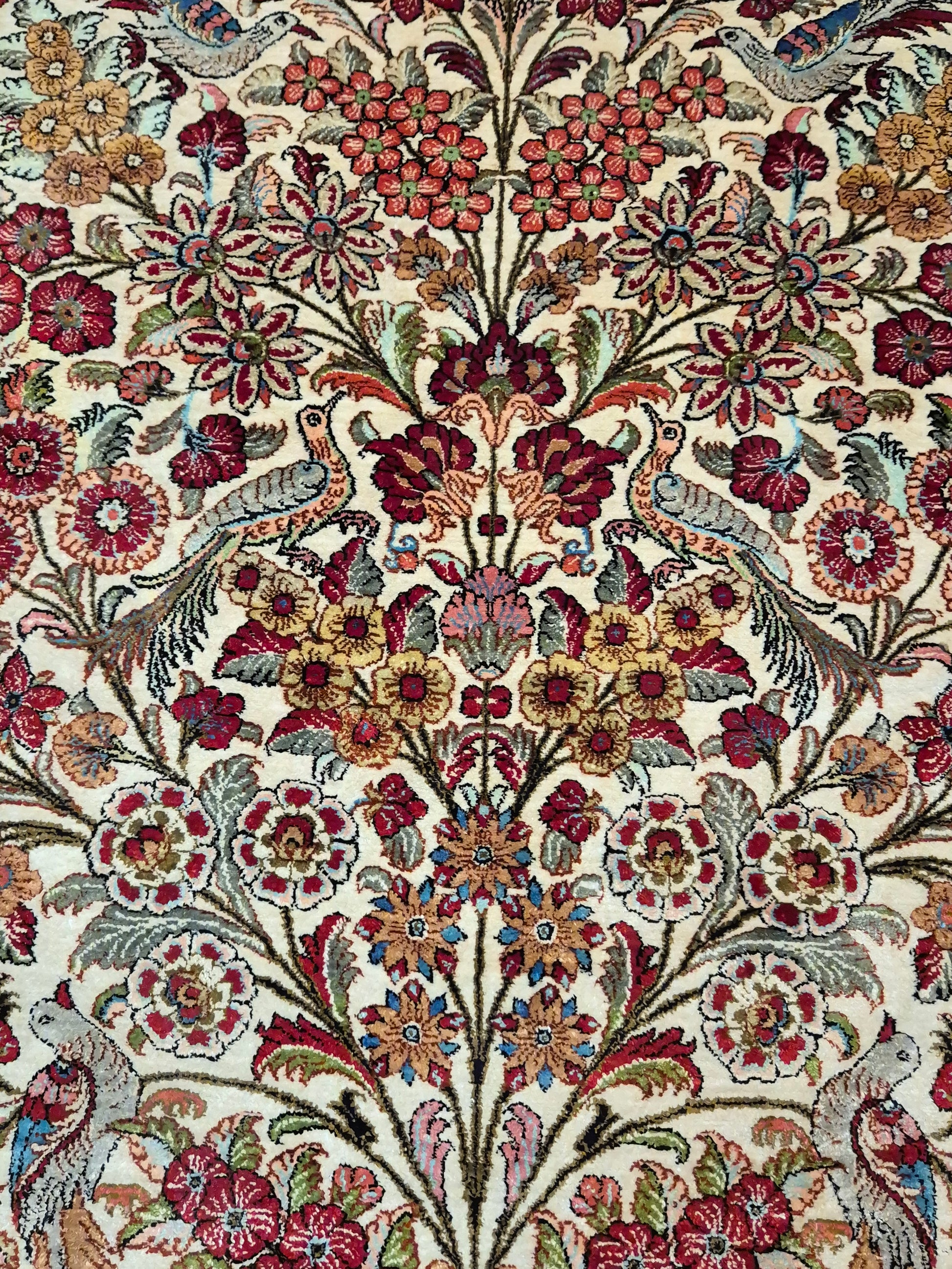 angeboten wird ein edler Ghom Teppich aus 100 % Seide auf Seide, handgeknüpft in feiner Ausführung. Das Motiv zeigt den klassischen Lebensbaum, reich geschmückt mit Blüten in kräftigen Farben sowie kunstvoll eingefügten Vögeln. Der helle Fond bringt die detailreichen floralen Motive eindrucksvoll zur Geltung, während die mehrfache Bordüre in warmen Rottönen mit floralen Ornamenten das Bild harmonisch einfasst.