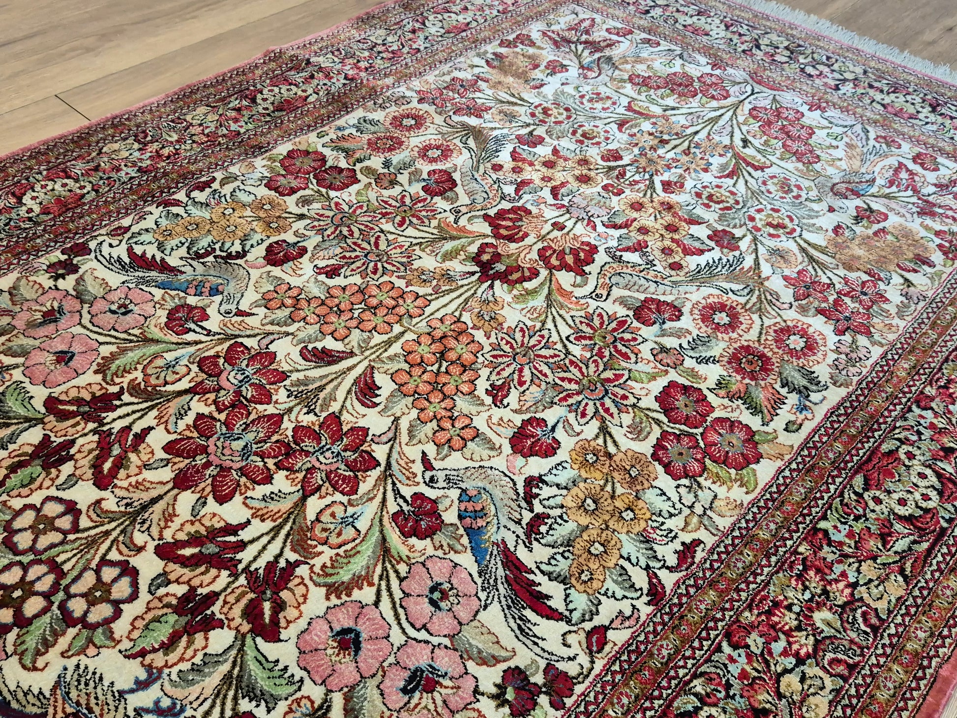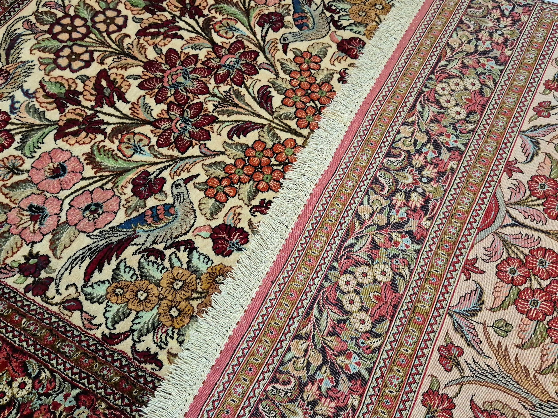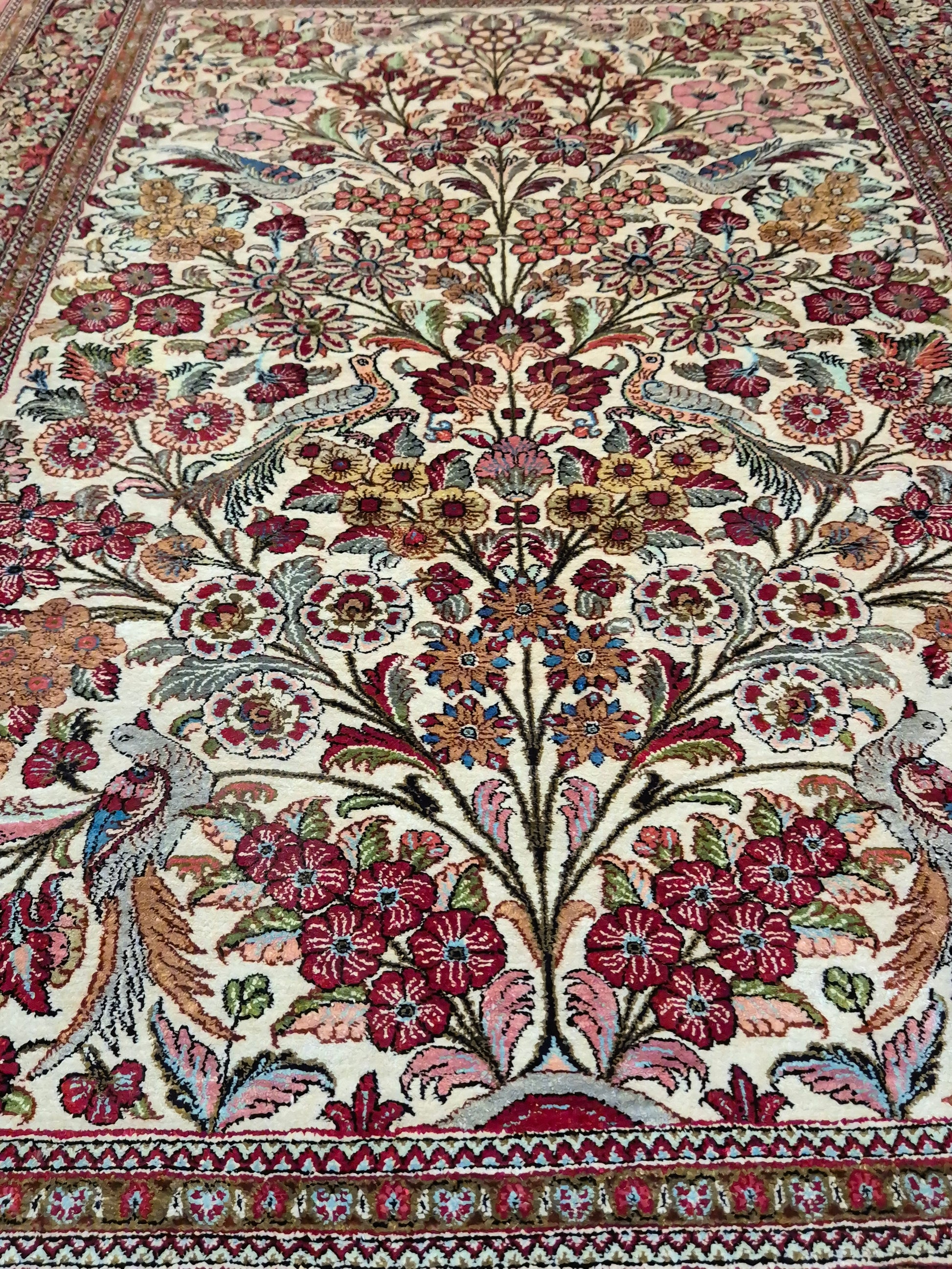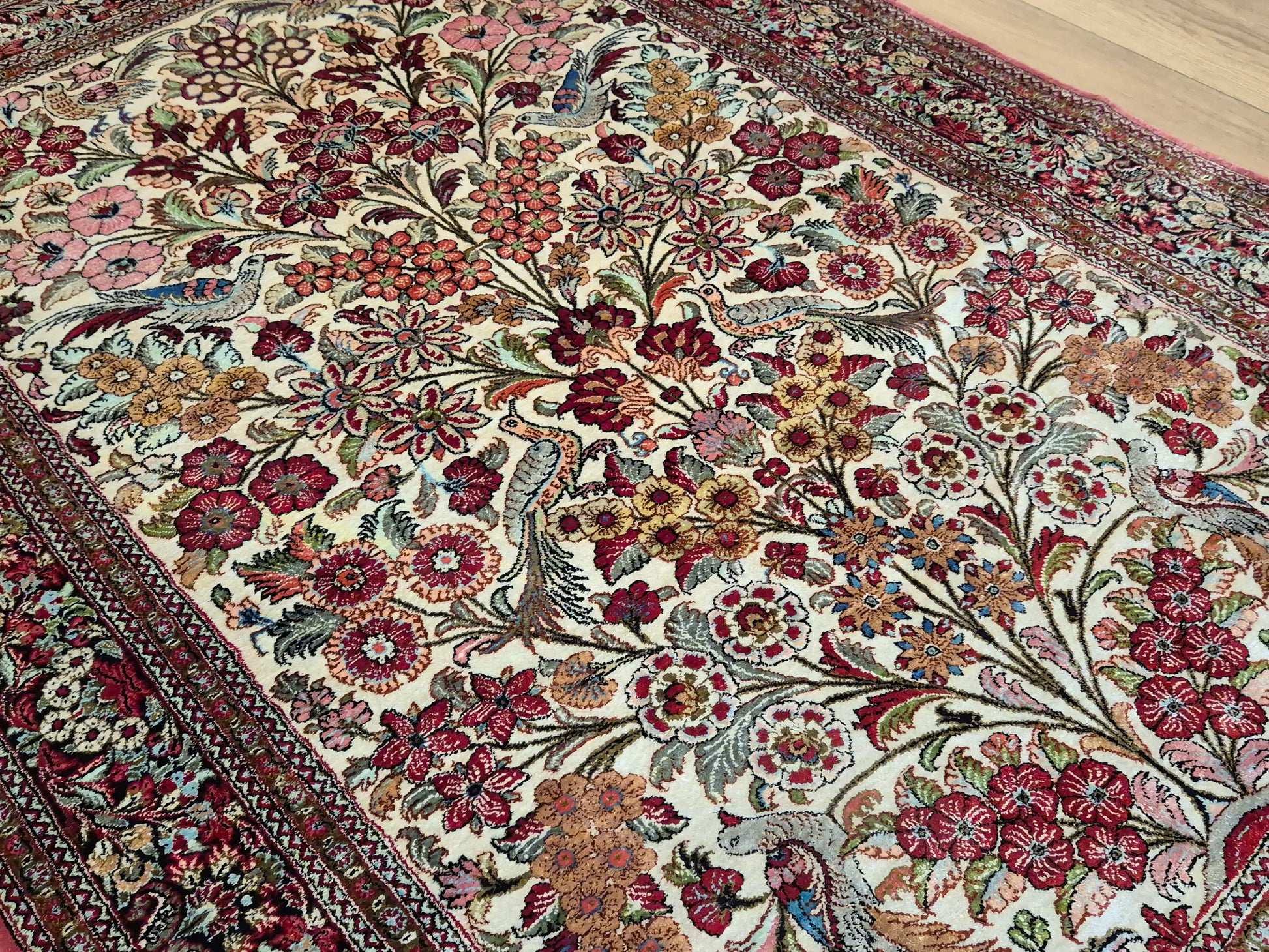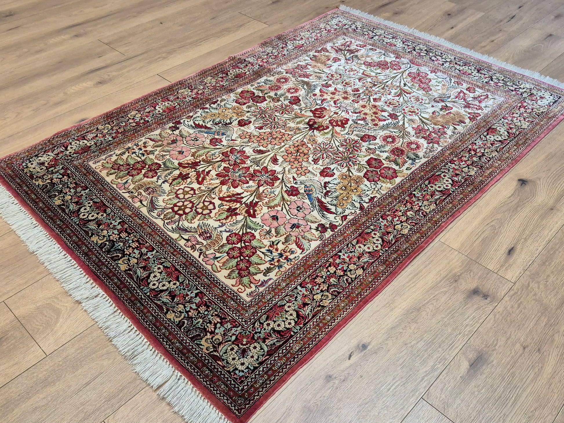 angeboten wird ein edler Ghom Teppich aus 100 % Seide auf Seide, handgeknüpft in feiner Ausführung. Das Motiv zeigt den klassischen Lebensbaum, reich geschmückt mit Blüten in kräftigen Farben sowie kunstvoll eingefügten Vögeln. Der helle Fond bringt die detailreichen floralen Motive eindrucksvoll zur Geltung, während die mehrfache Bordüre in warmen Rottönen mit floralen Ornamenten das Bild harmonisch einfasst.