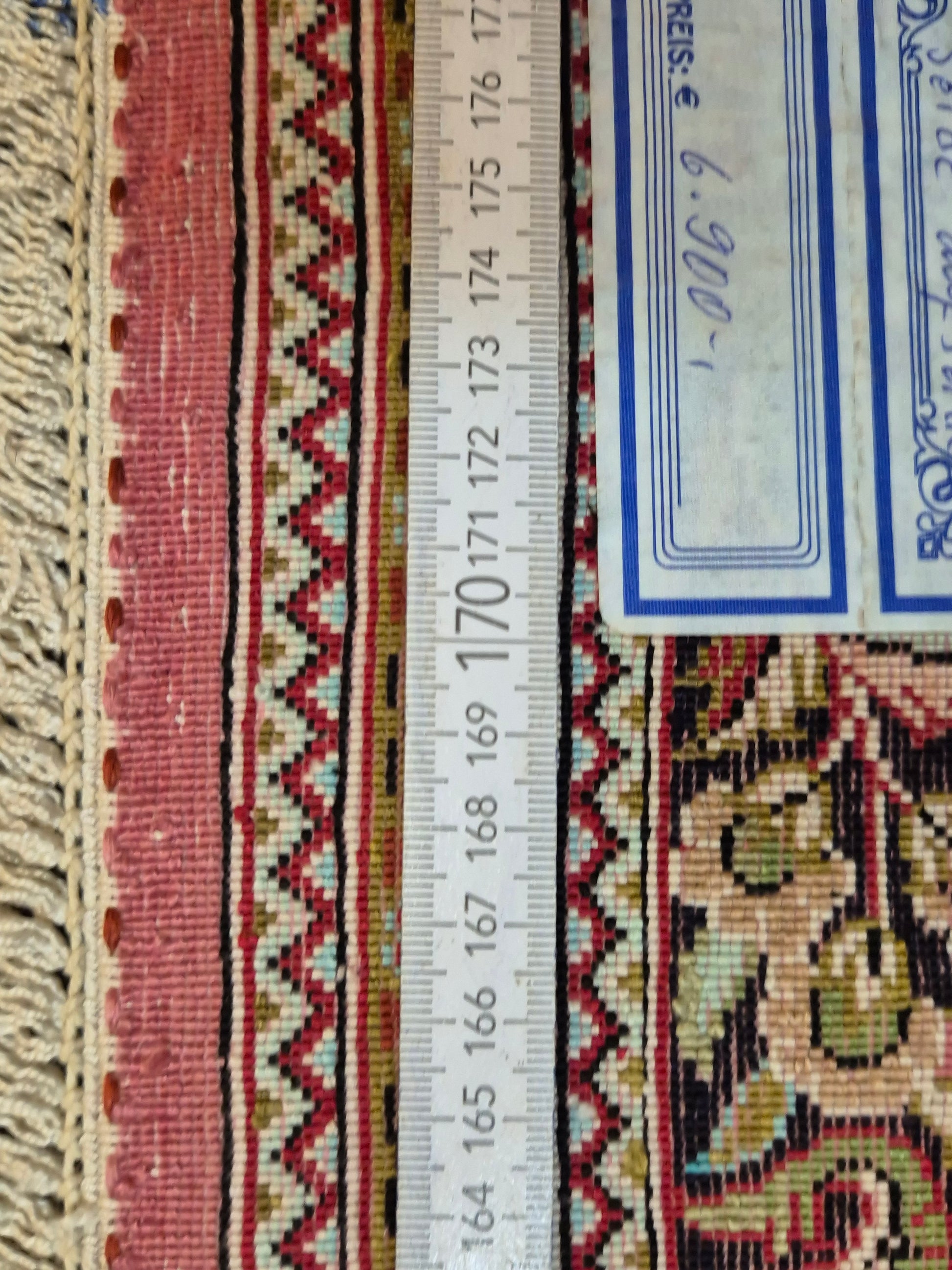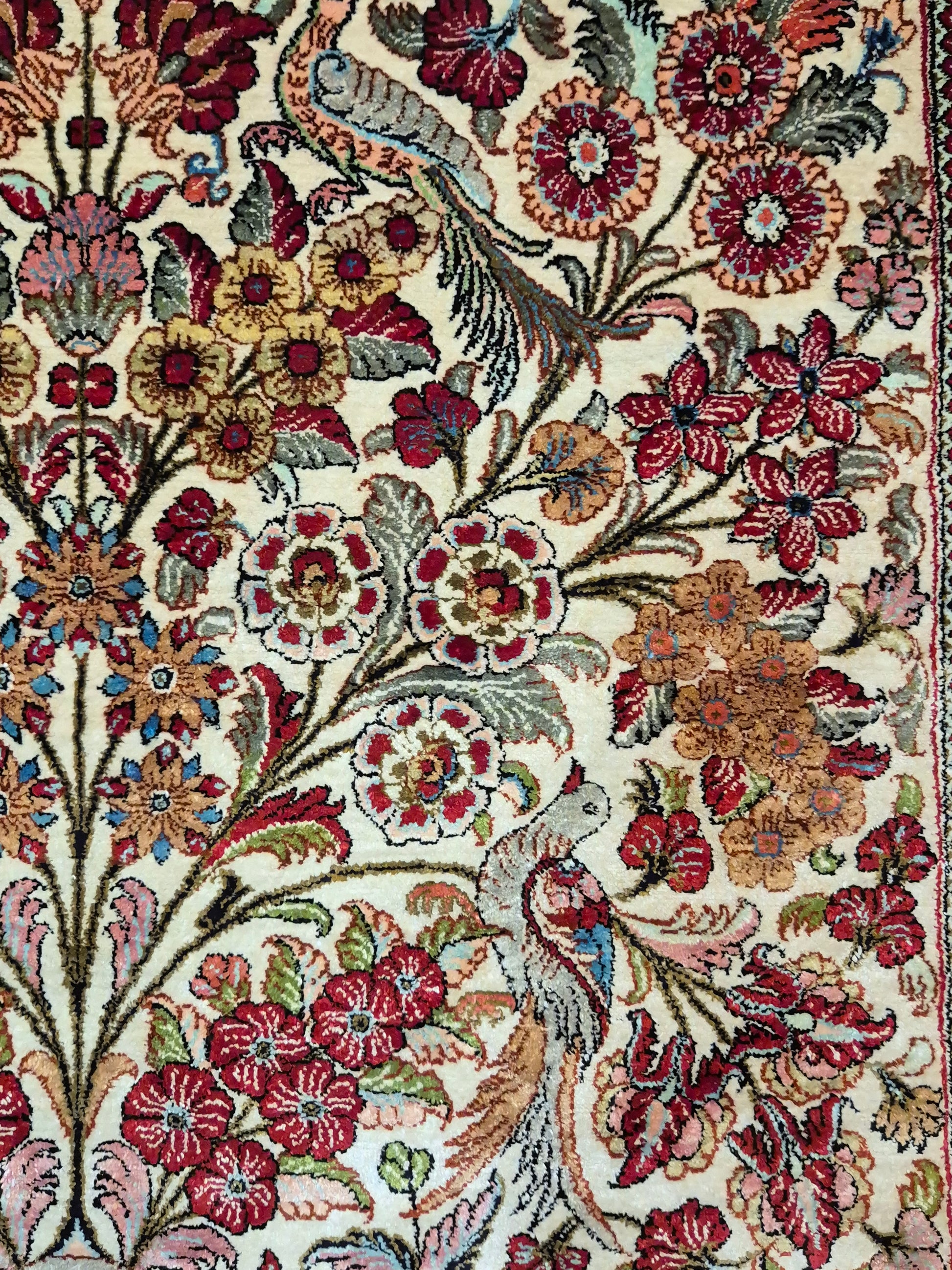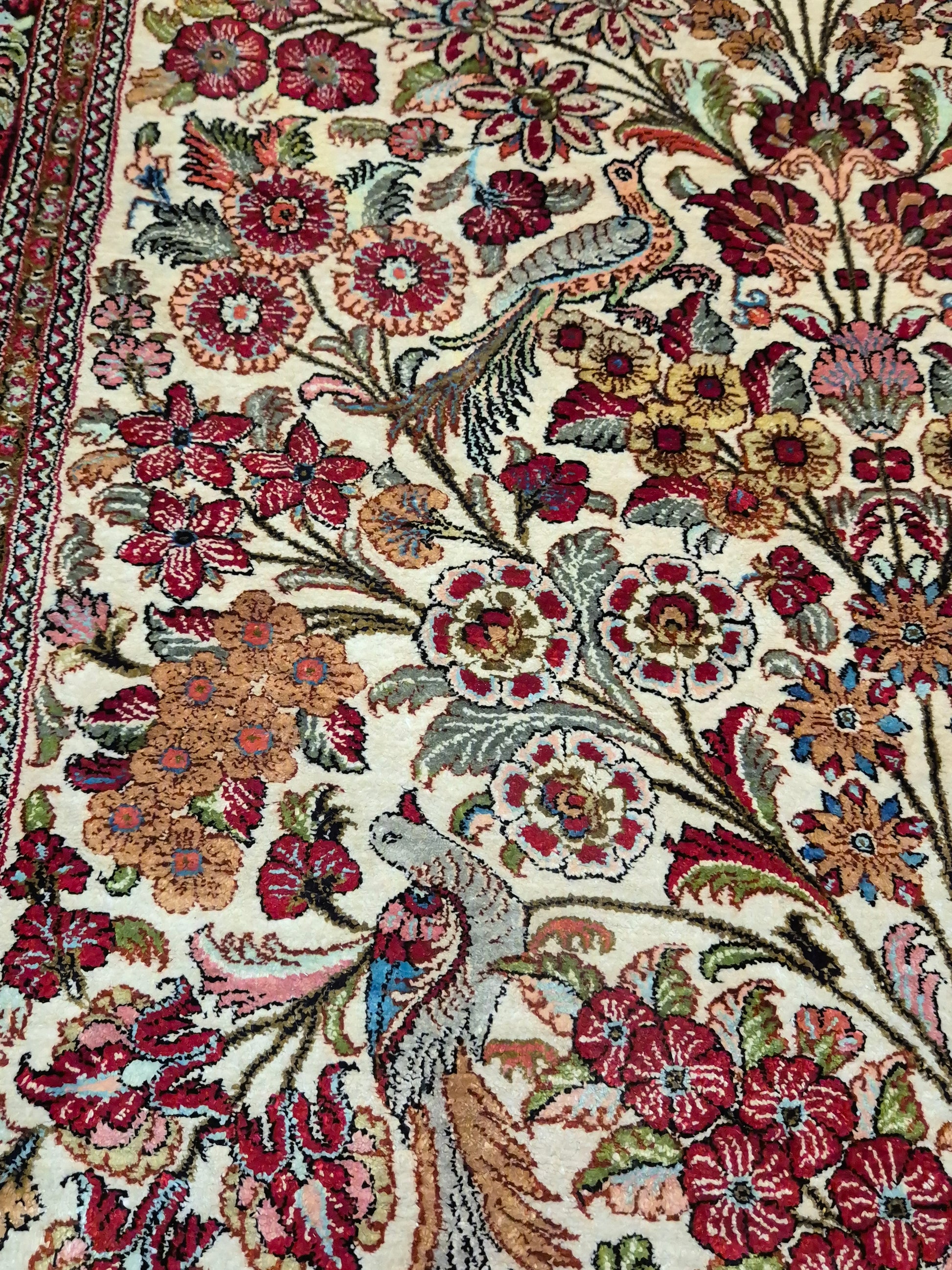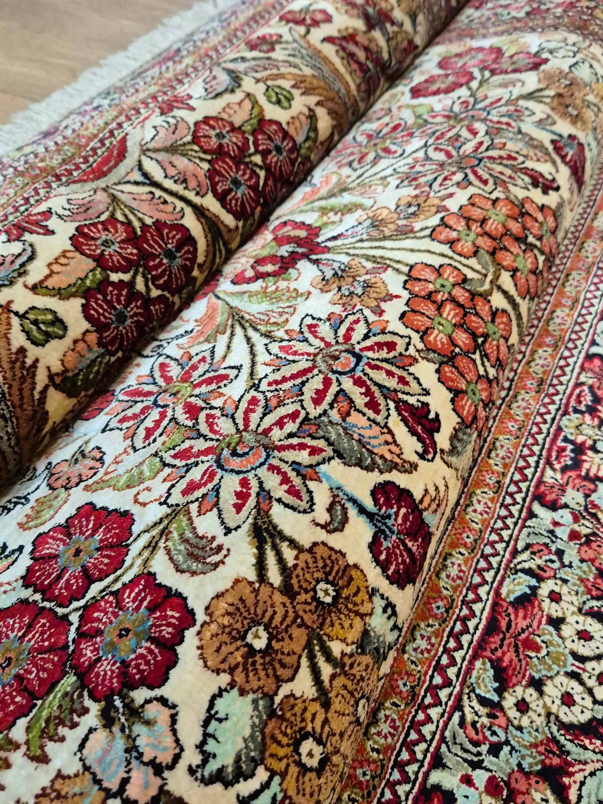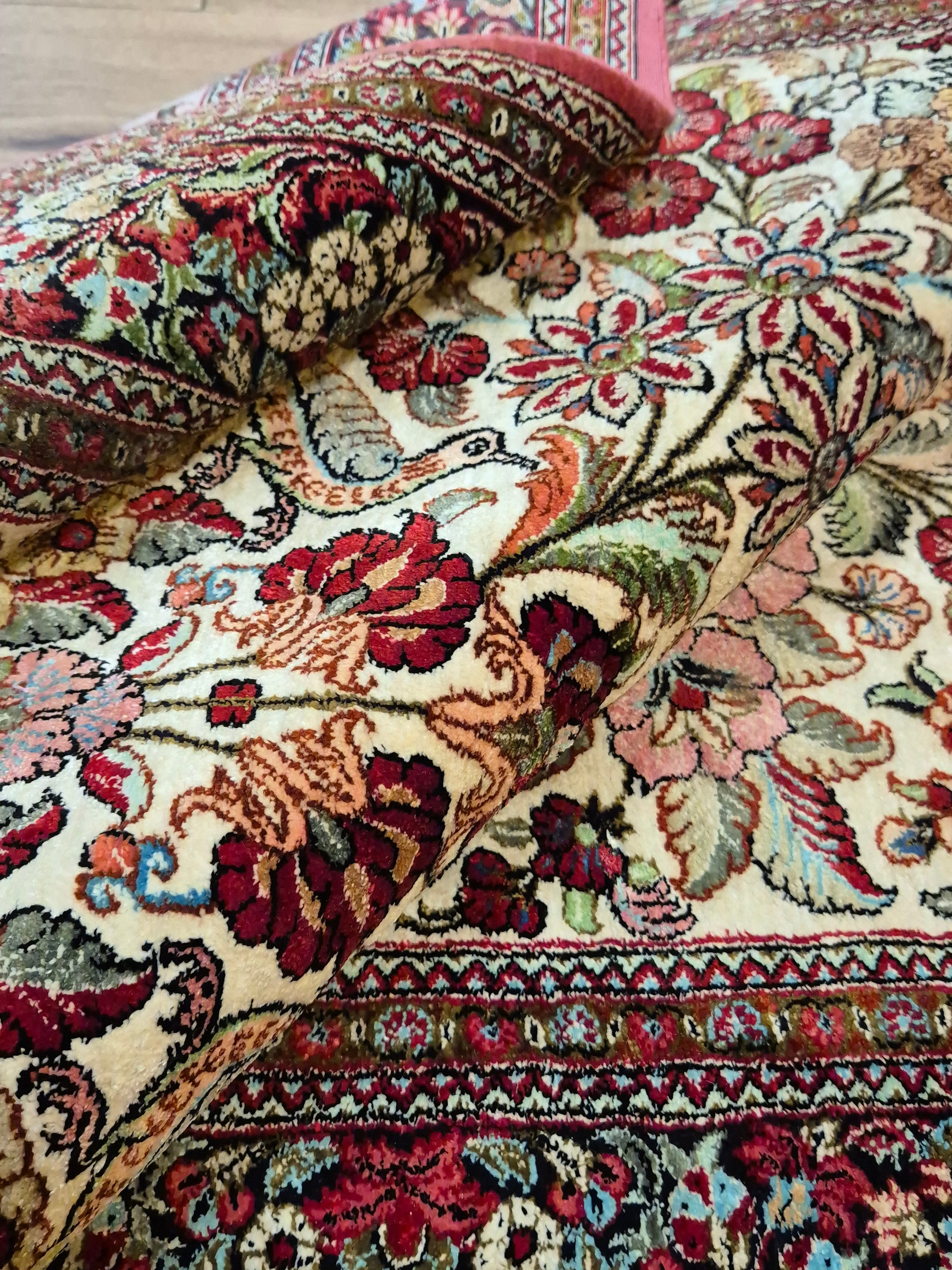 angeboten wird ein edler Ghom Teppich aus 100 % Seide auf Seide, handgeknüpft in feiner Ausführung. Das Motiv zeigt den klassischen Lebensbaum, reich geschmückt mit Blüten in kräftigen Farben sowie kunstvoll eingefügten Vögeln. Der helle Fond bringt die detailreichen floralen Motive eindrucksvoll zur Geltung, während die mehrfache Bordüre in warmen Rottönen mit floralen Ornamenten das Bild harmonisch einfasst.